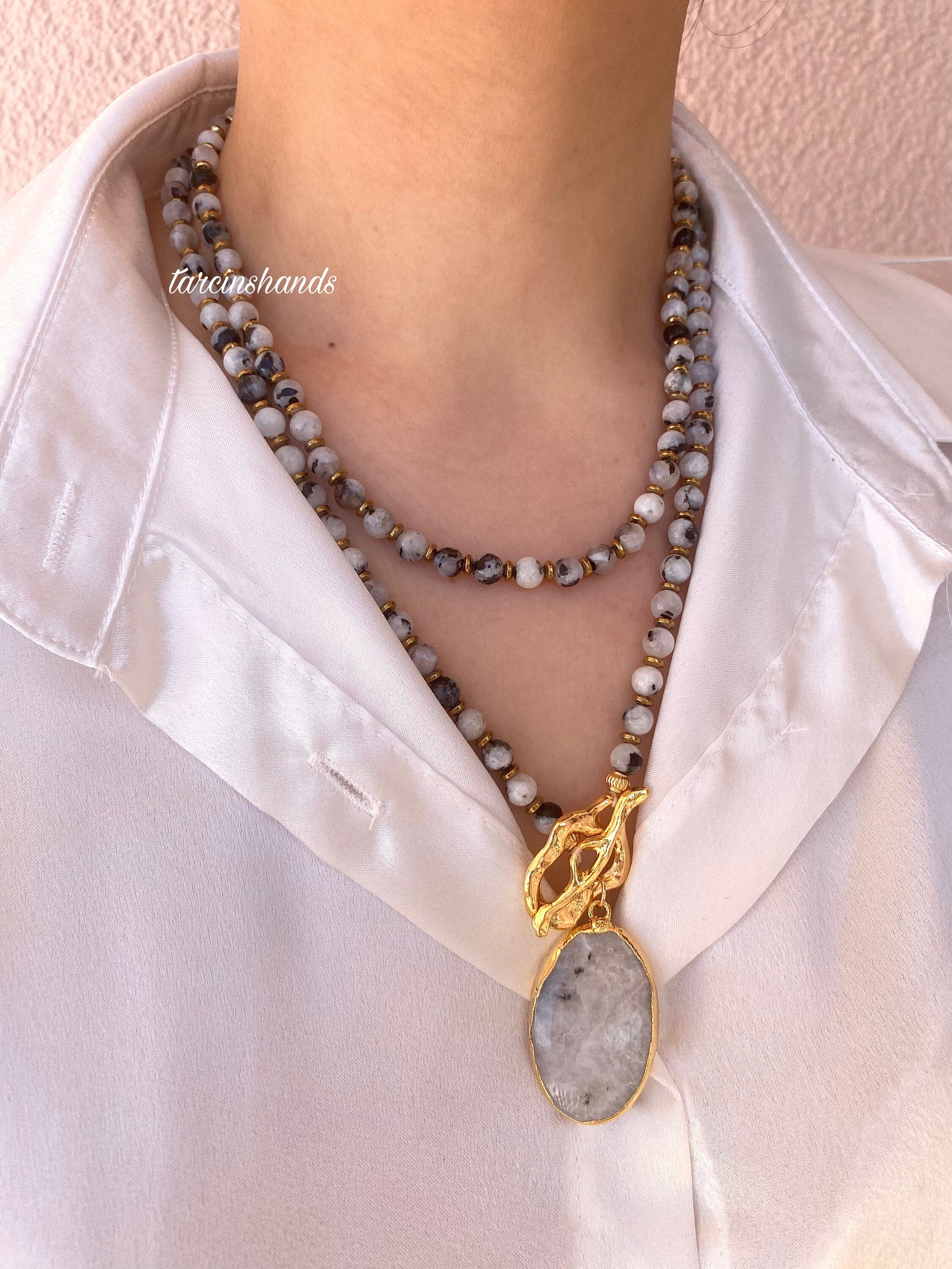 ✨ Statement Jewelry: Make a graceful statement with this beaded moonstone necklace. The combination of its long, multistrand design and the soft glow of moonstone ensures it stands out as a true work of art.