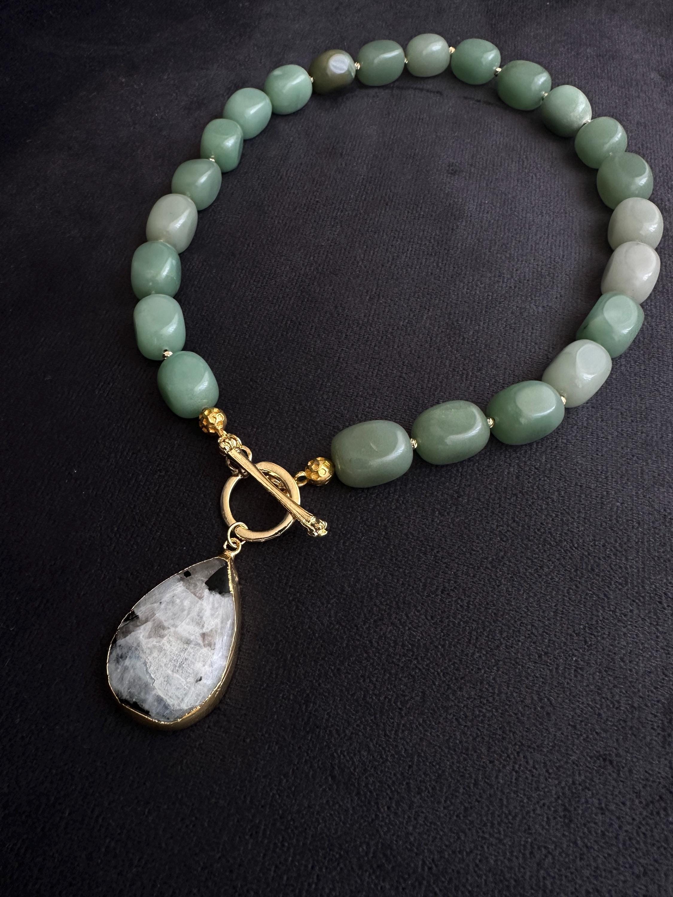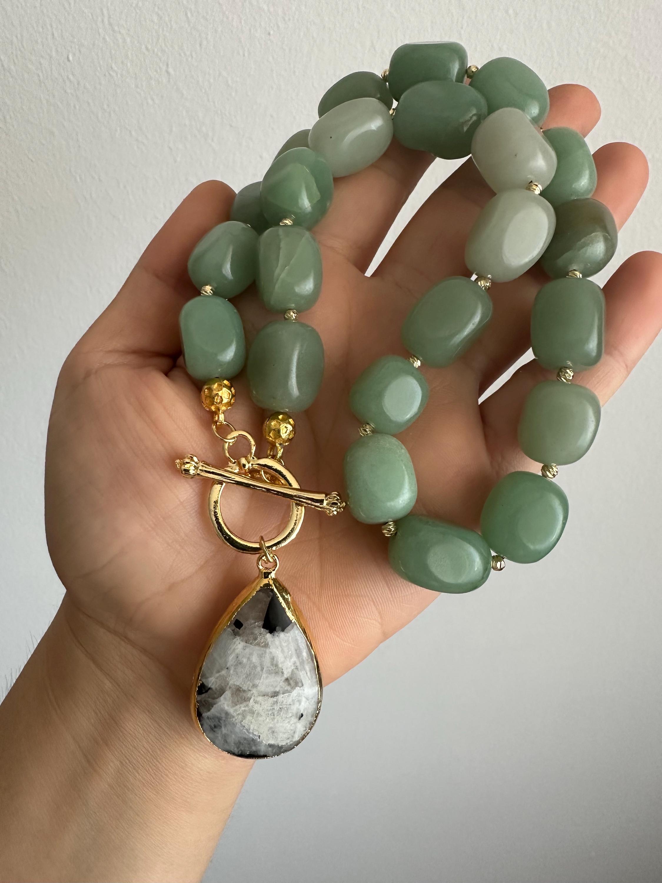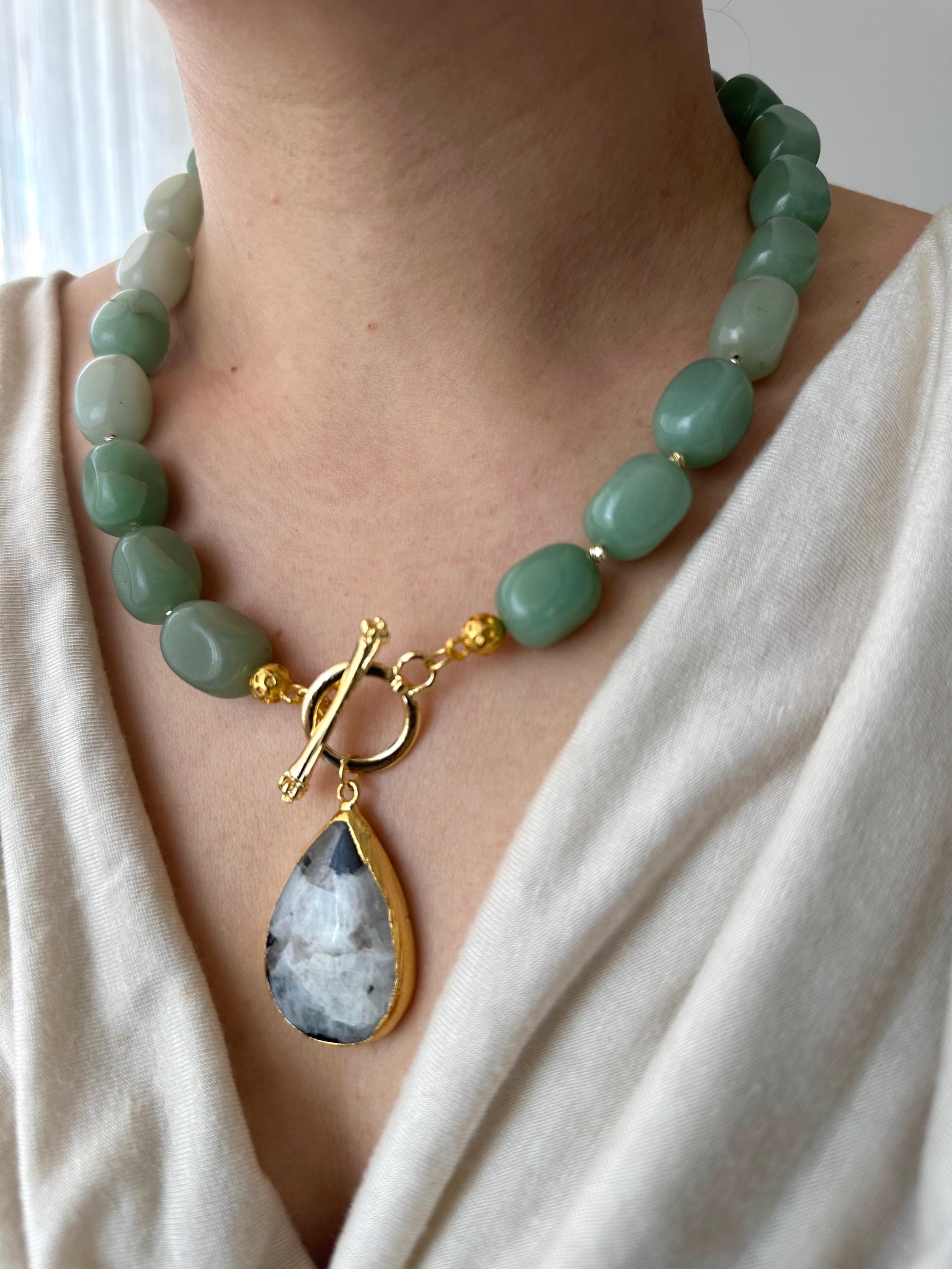 This chunky aventurine necklace is a striking and earthy piece designed for lovers of natural textures and bold bohemian style. Featuring large green aventurine stones, a luminous moonstone pendant, and a stylish gold-plated T-bar clasp, this necklace brings together elegance and grounded energy in one unique design.