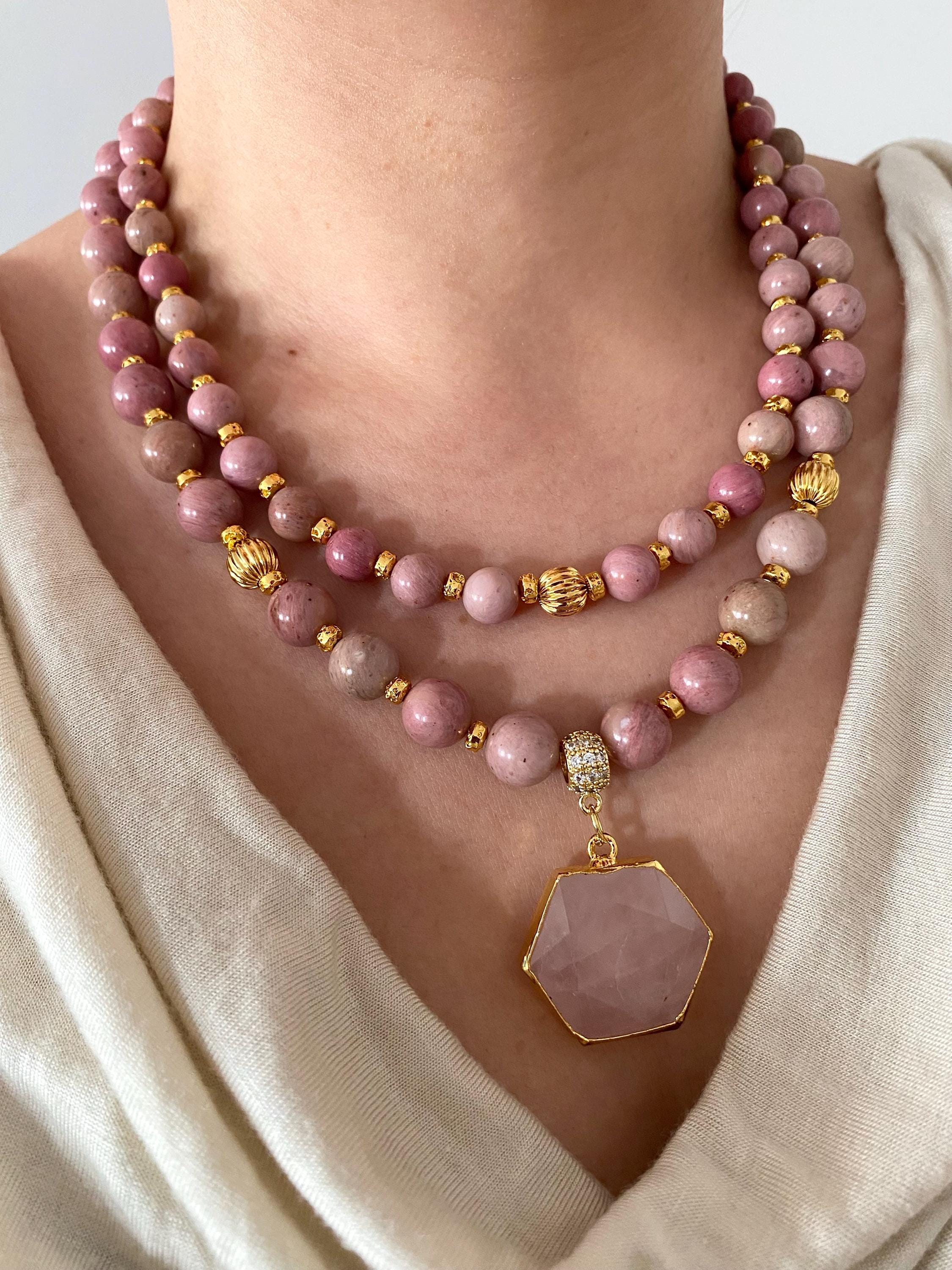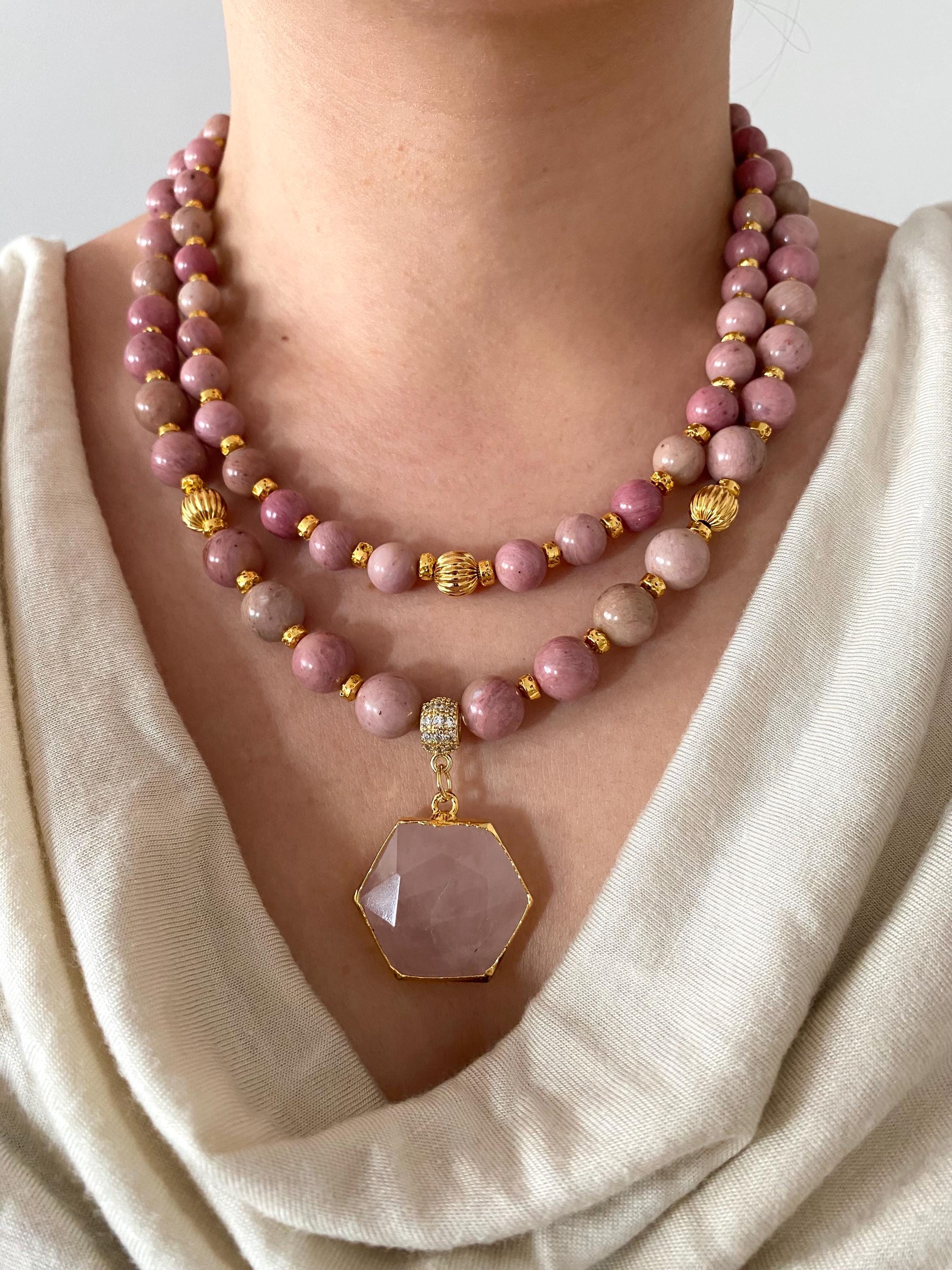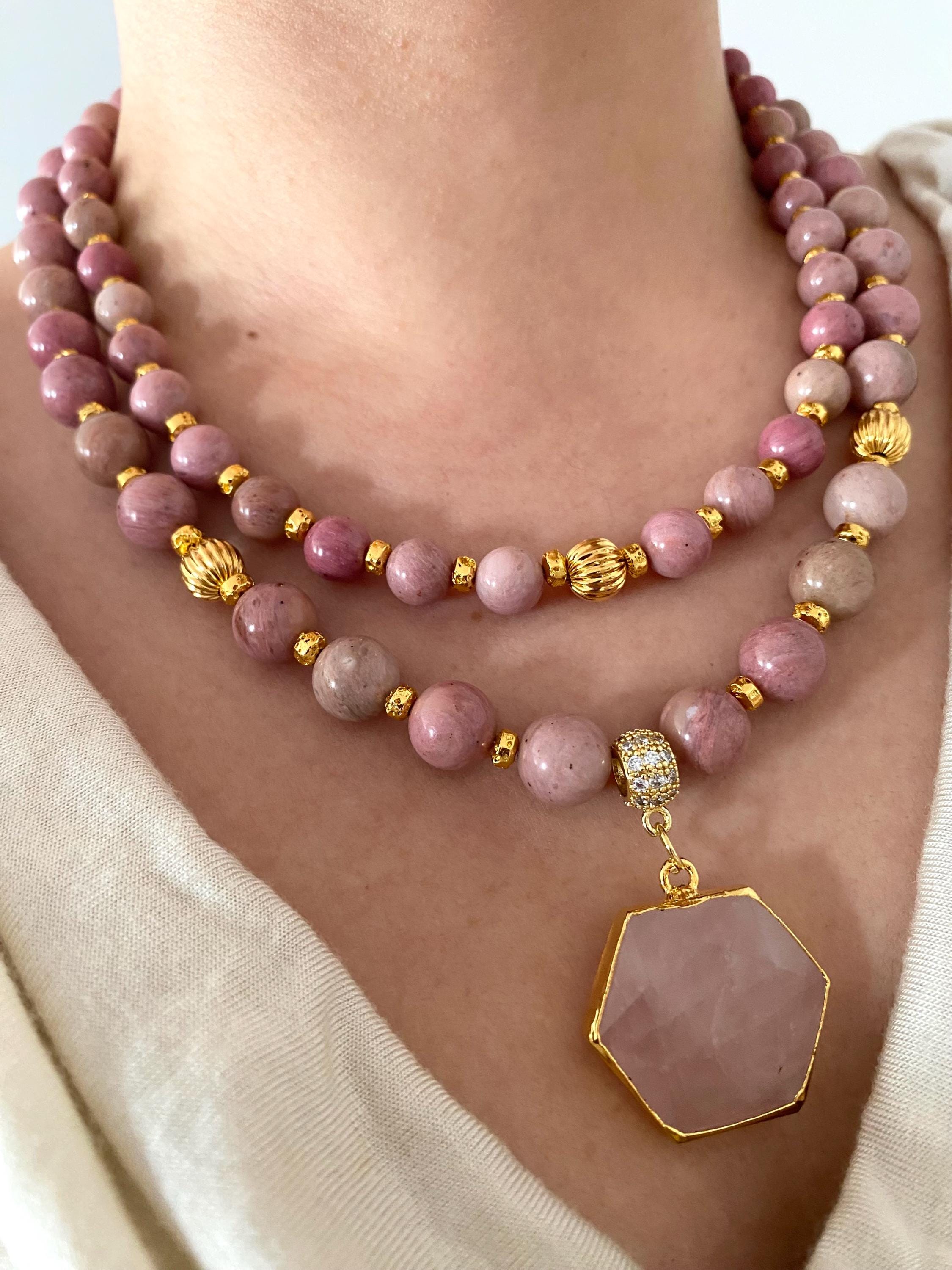 • Rich pink-toned rhodonite stones are the centerpiece of this design, offering warmth and grounding energy.