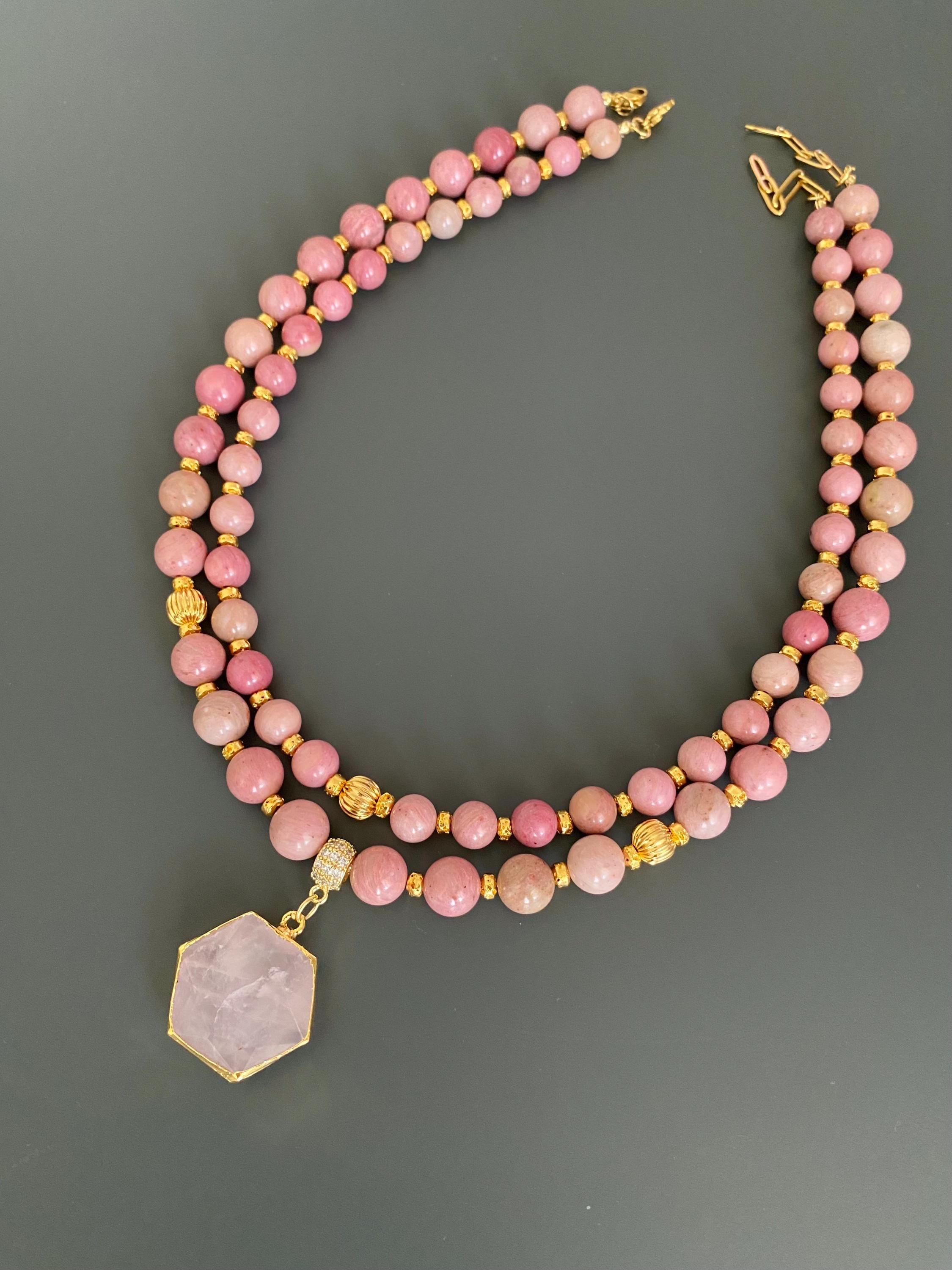 This beautifully handcrafted multistrand necklace combines the soft femininity of natural pink stones with bold, earthy textures—perfect for those who love meaningful, stylish accessories.
