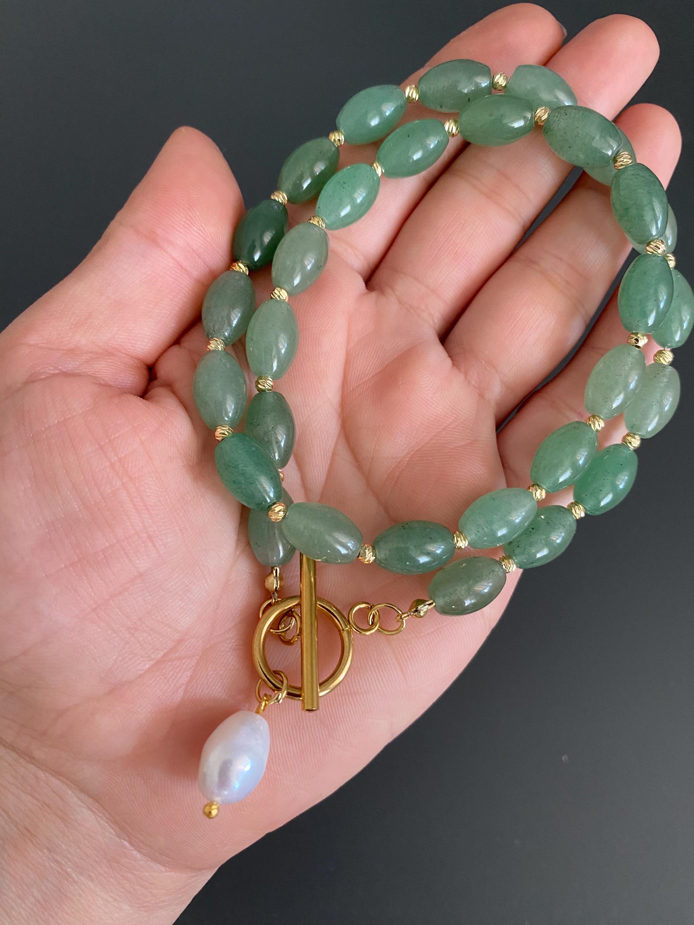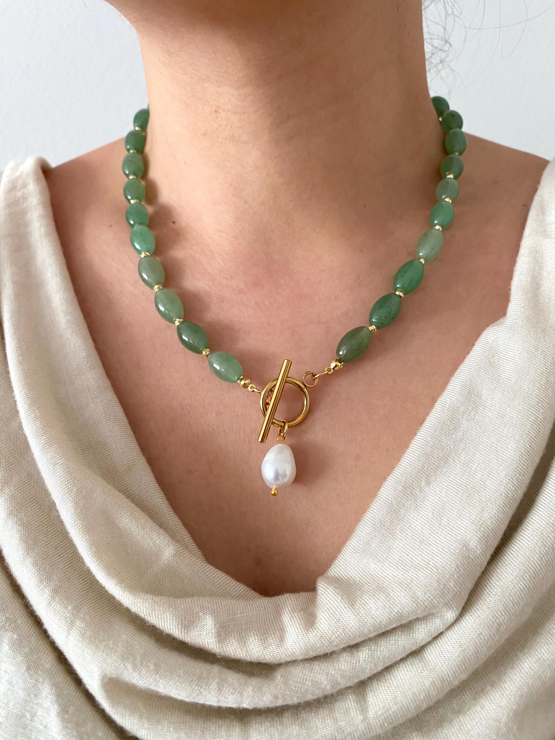 Gold-Plated Necklace with Aventurine and Freshwater Pearl Toggle – Bohemian Natural Stone Jewelry