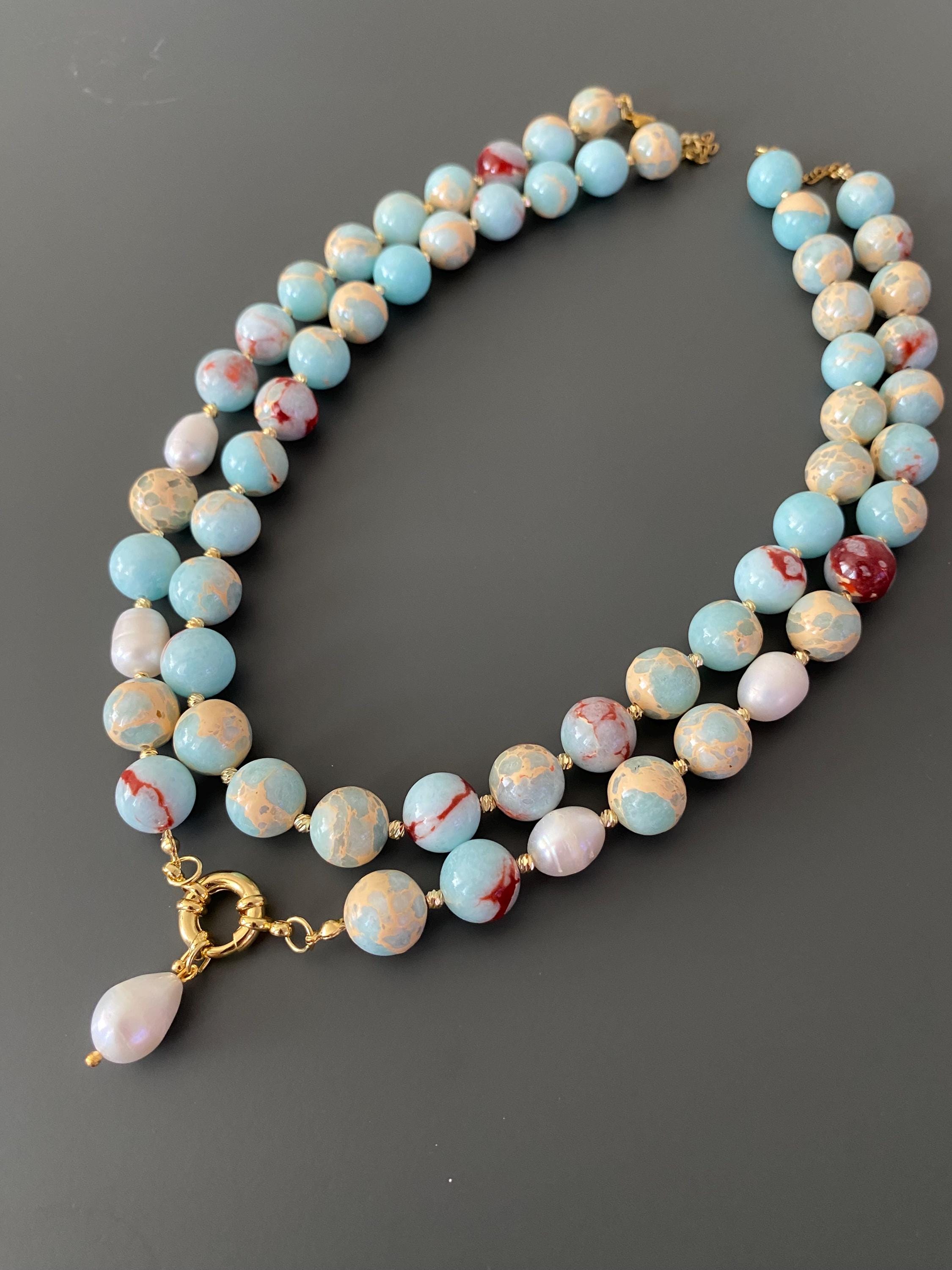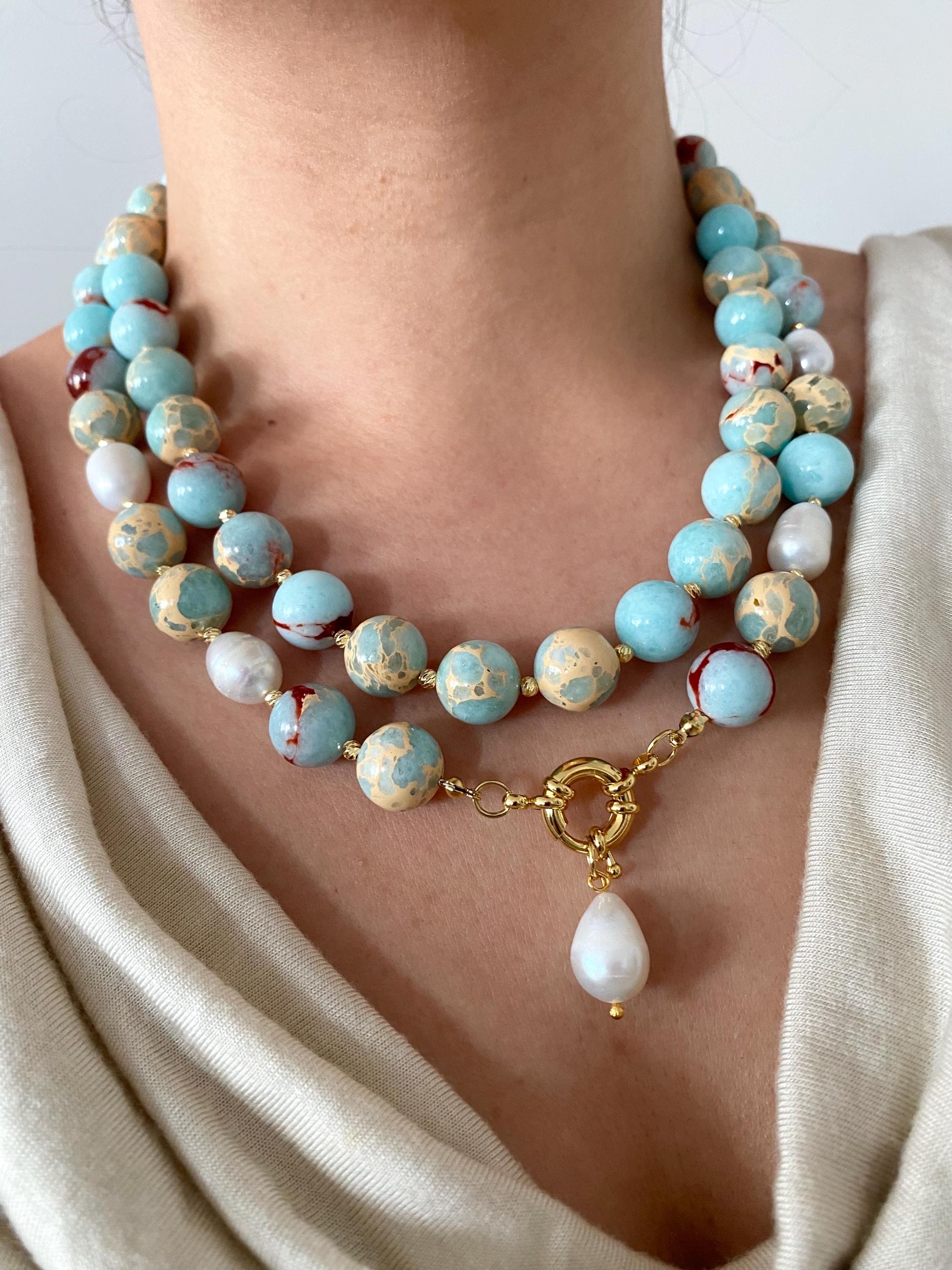 Gold-Plated Multistrand Necklace with Turquoise-Patterned Variscite, Freshwater Pearls – Bohemian Layered Statement Jewelry