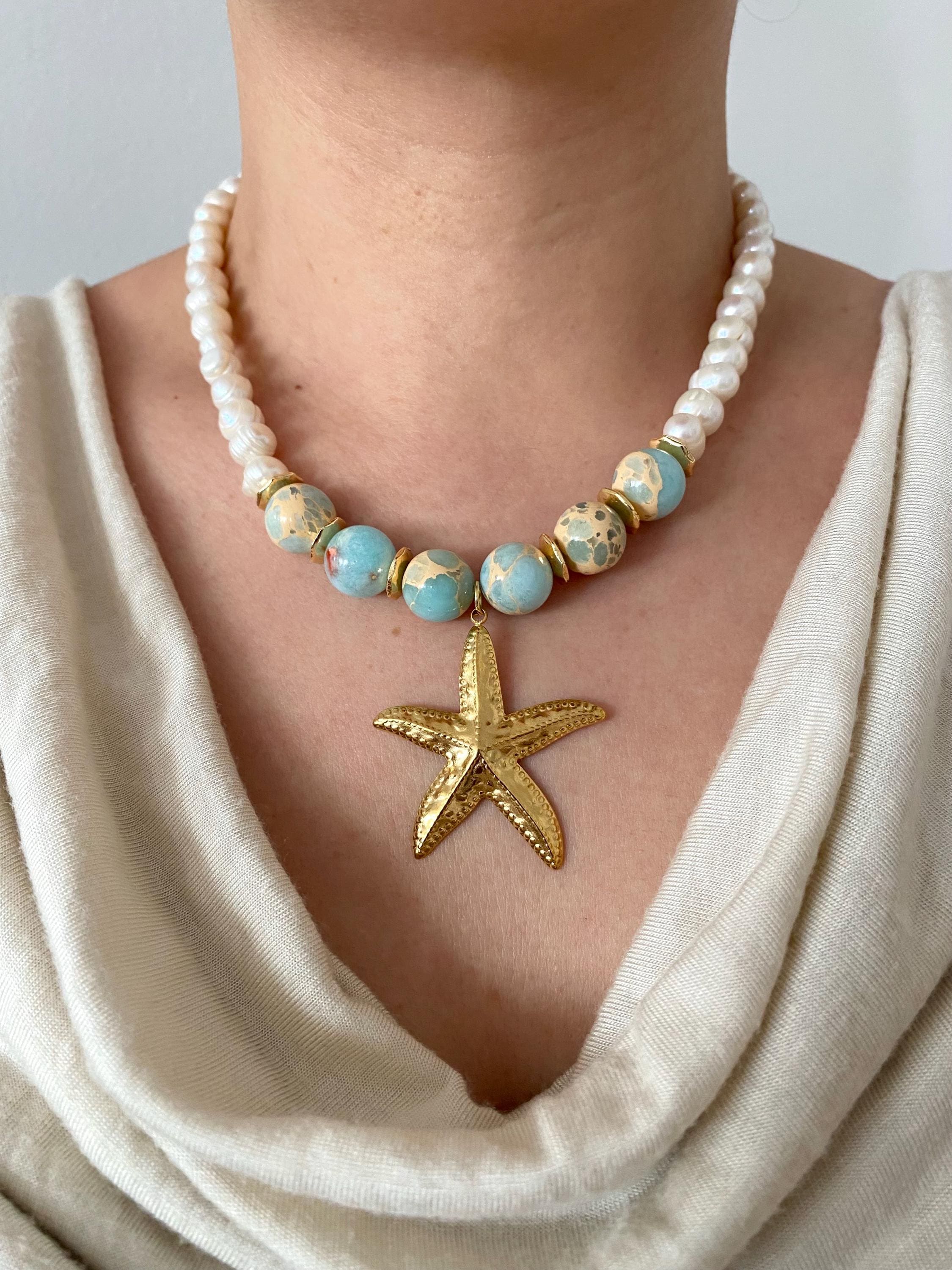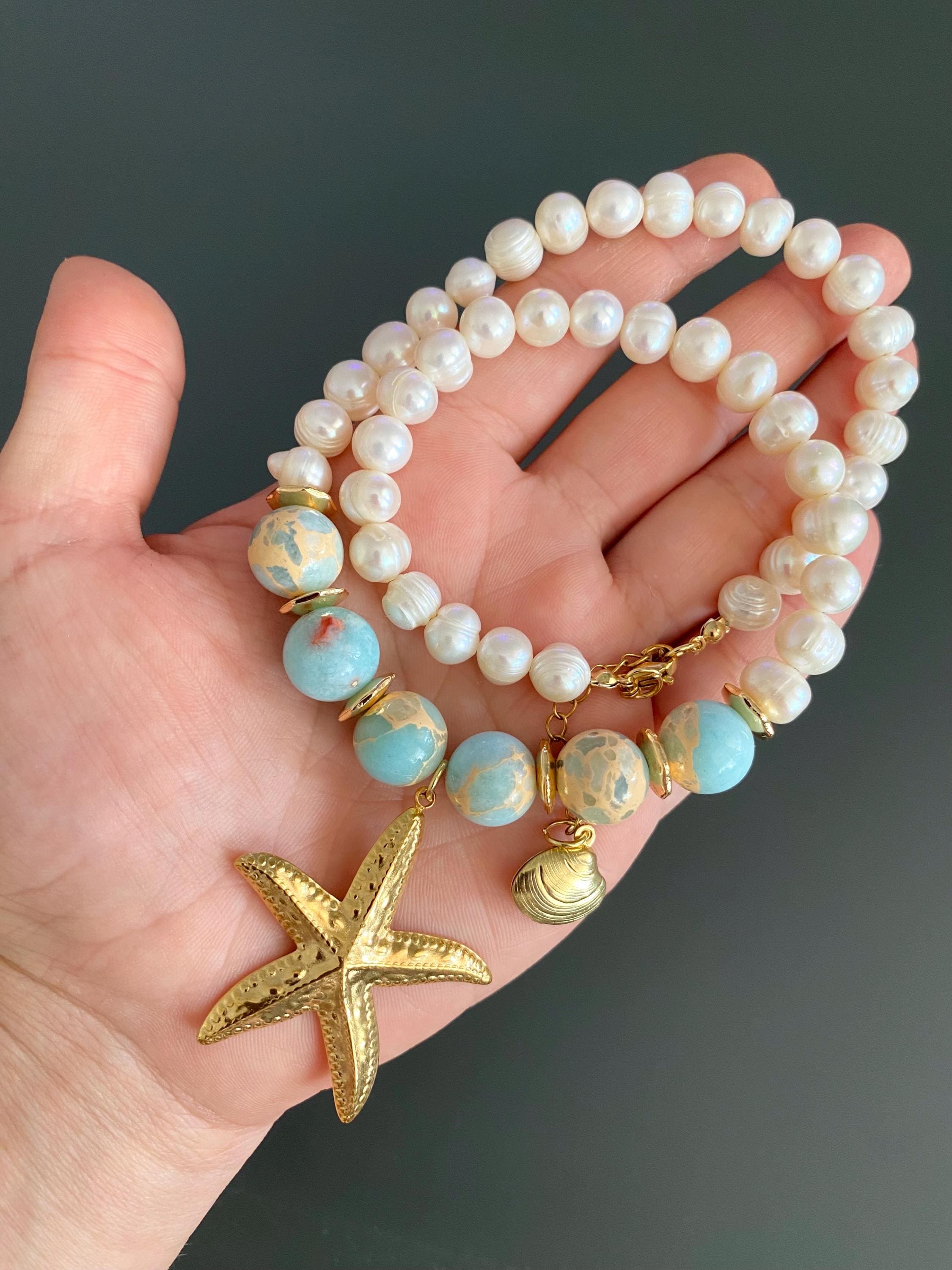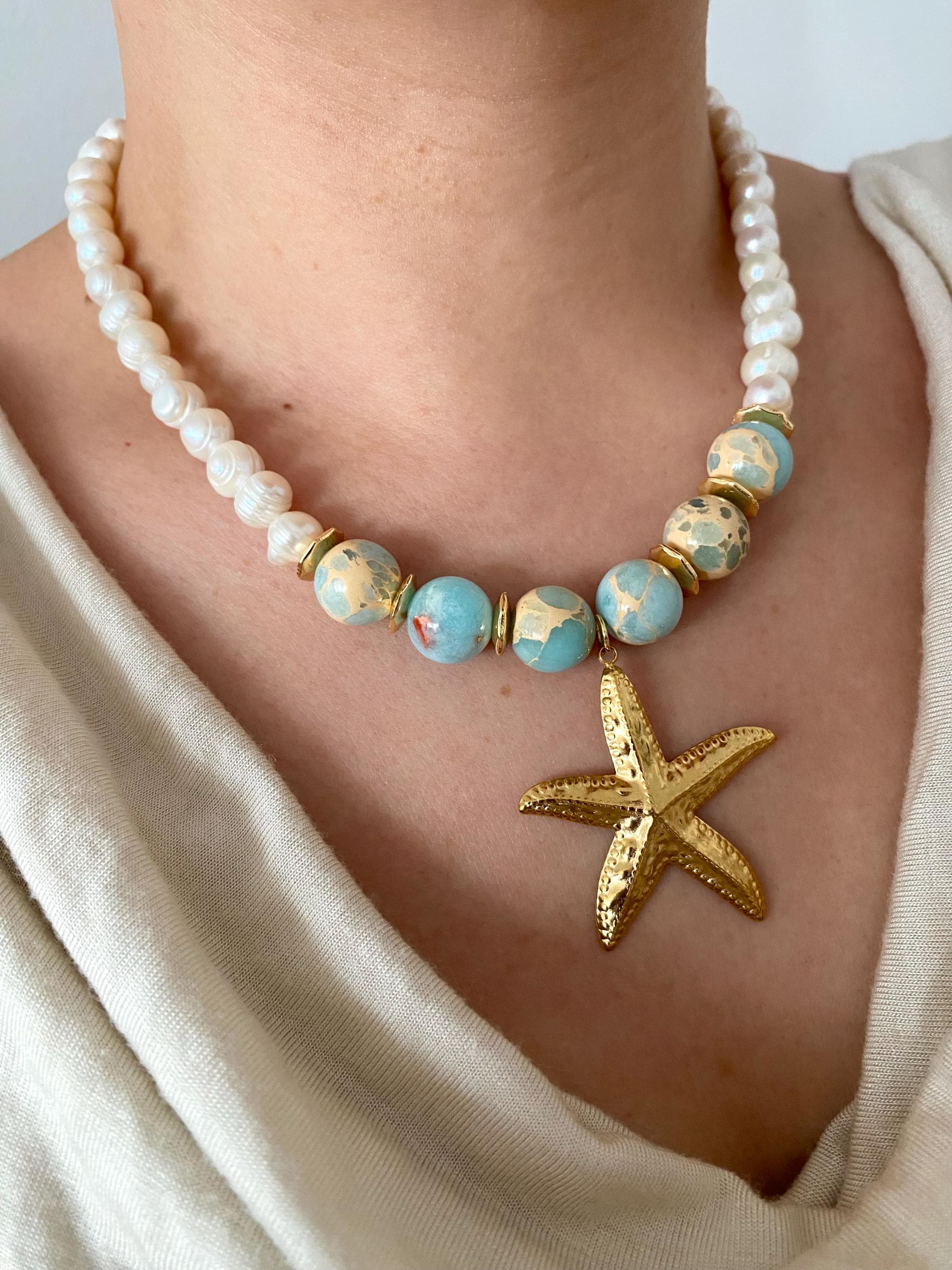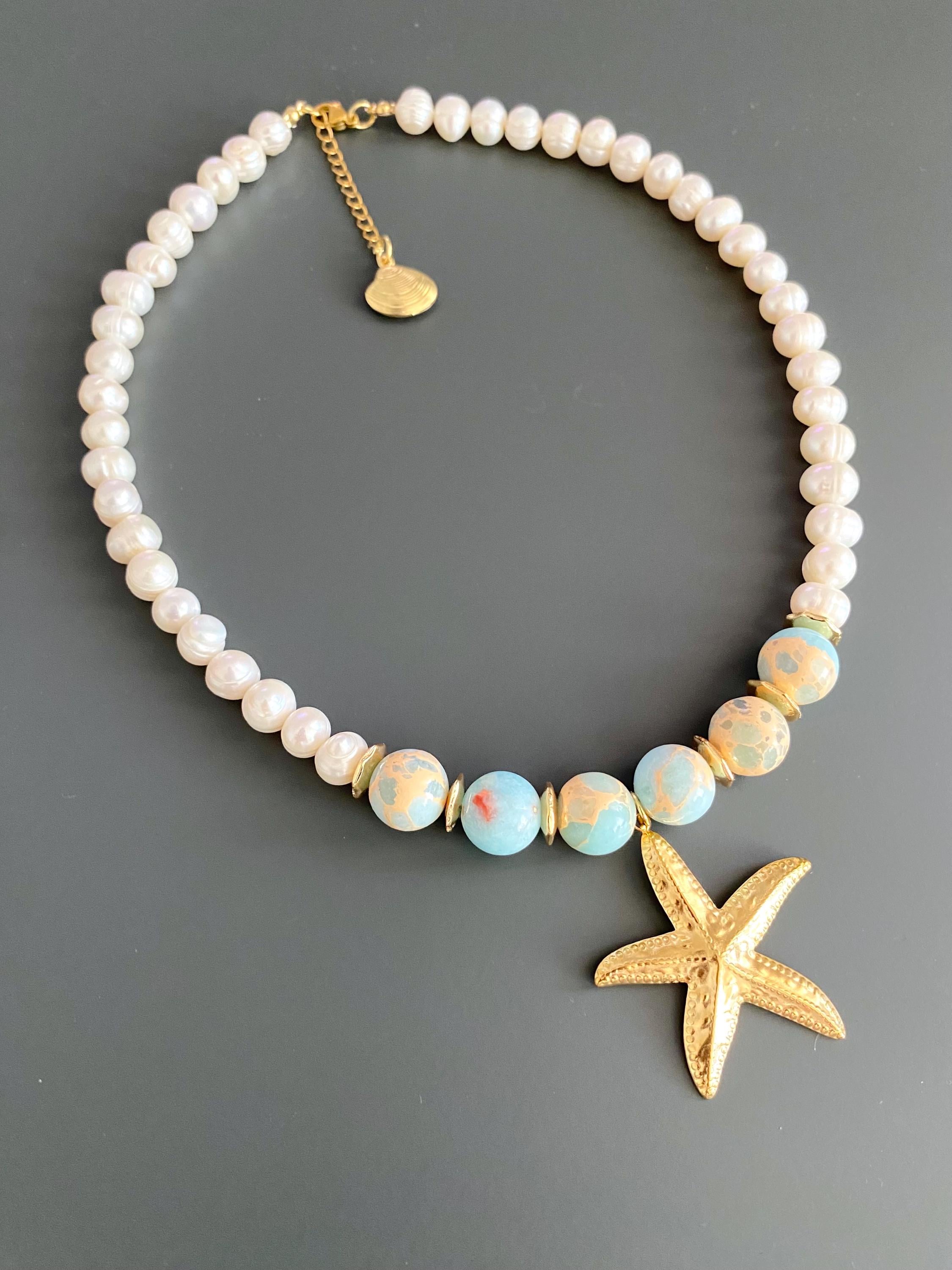 Gold-Plated Necklace with Variscite & Freshwater Pearls – Boho Summer Jewelry with Starfish Charm