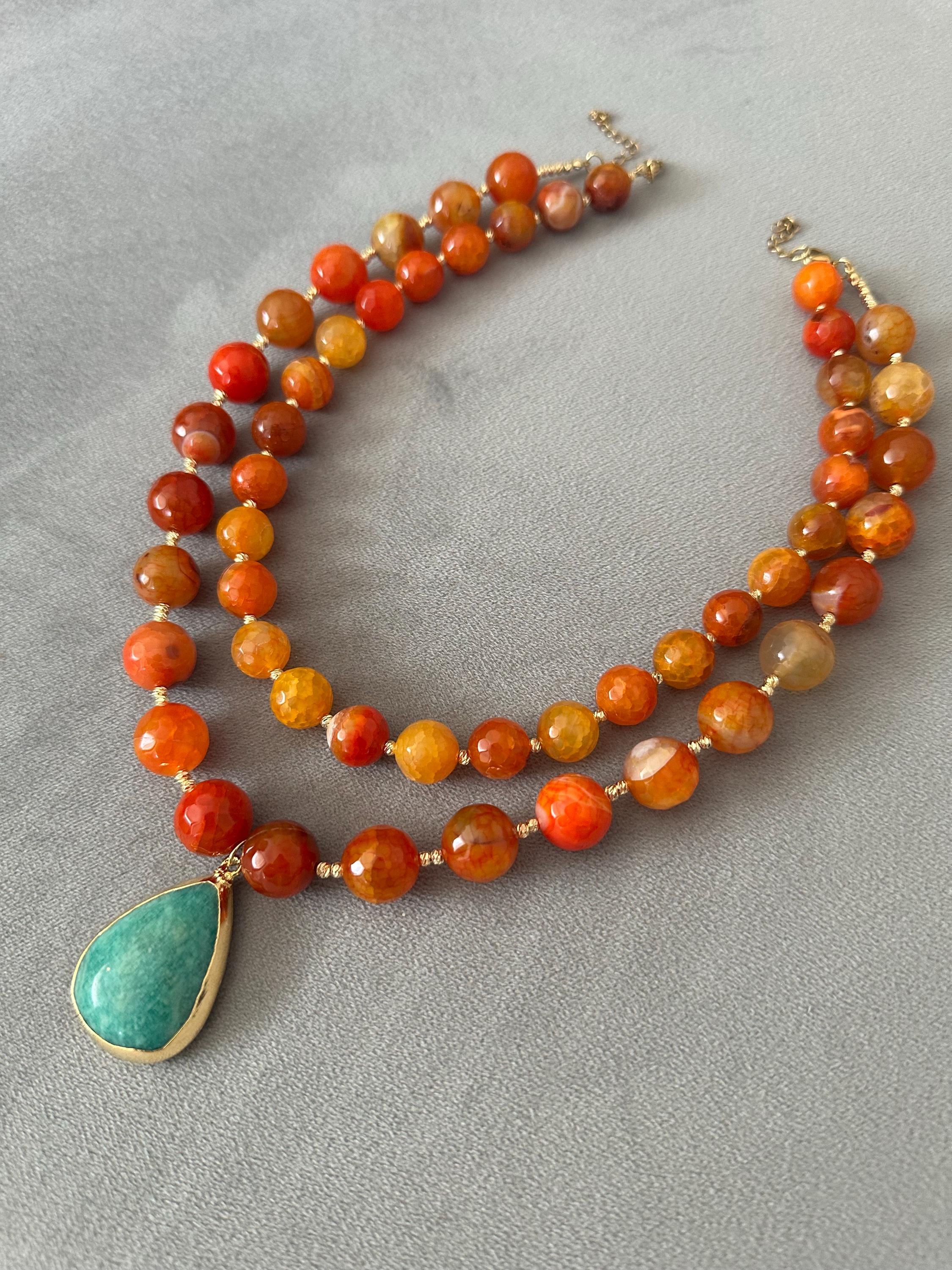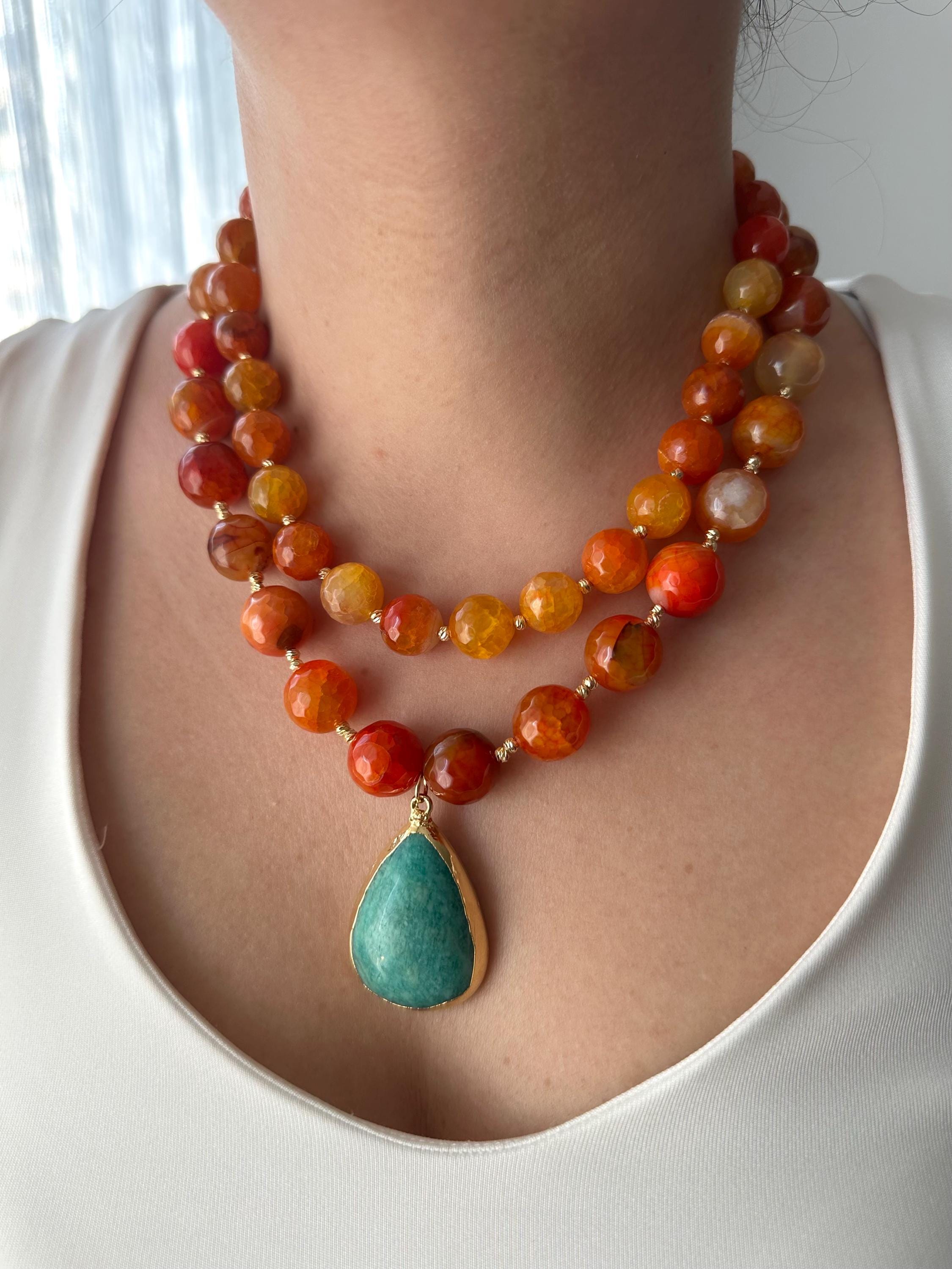 Gold-Plated Chunky Bohemian Necklace with Orange Agate and Amazonite Charm – Two-Piece Layered Statement Jewelry