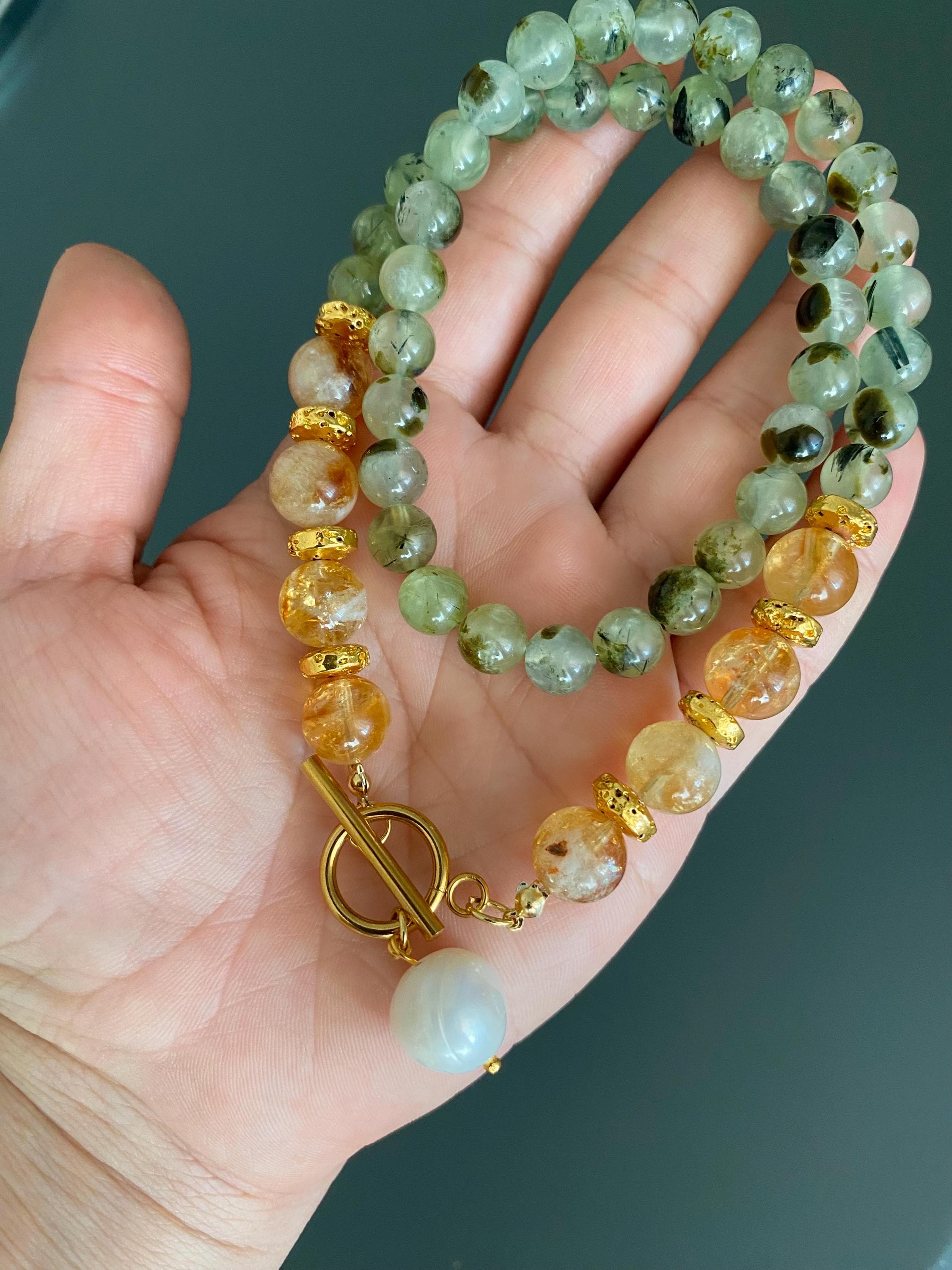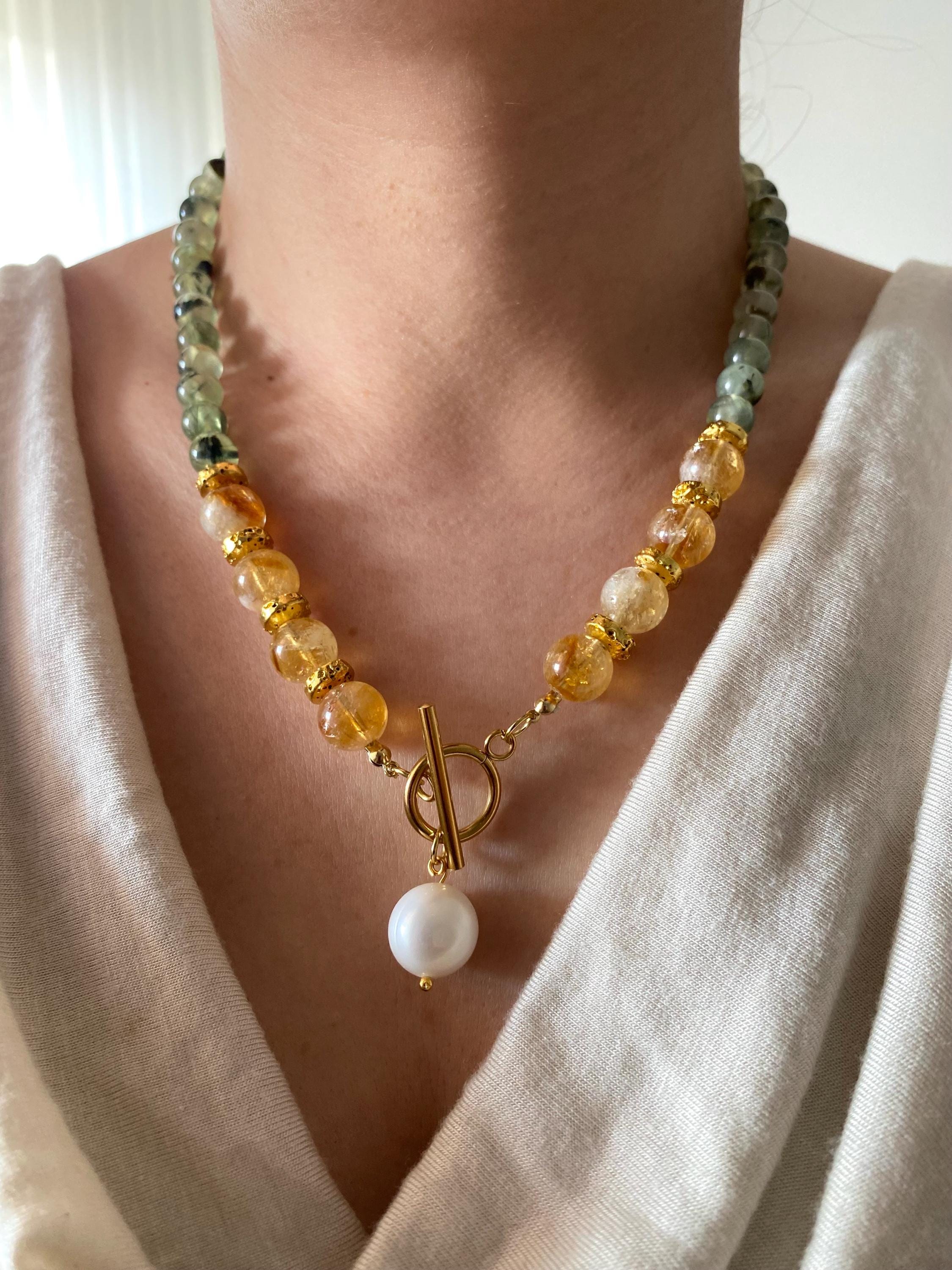 Gold-Plated Bohemian Necklace with Citrine, Prehnite, Freshwater Pearl Pendant & Gold-Plated Lava Beads – Handmade Statement Jewelry