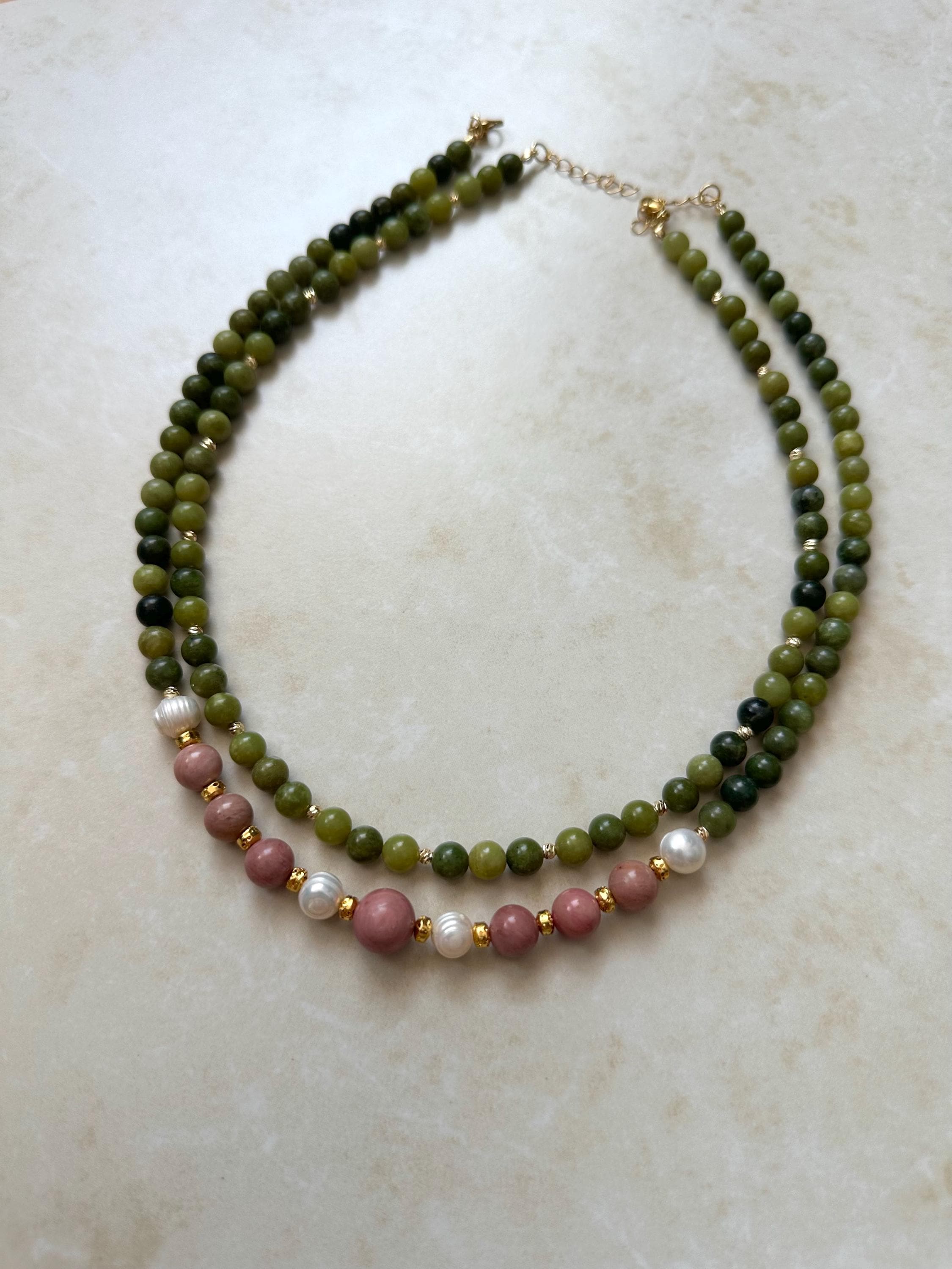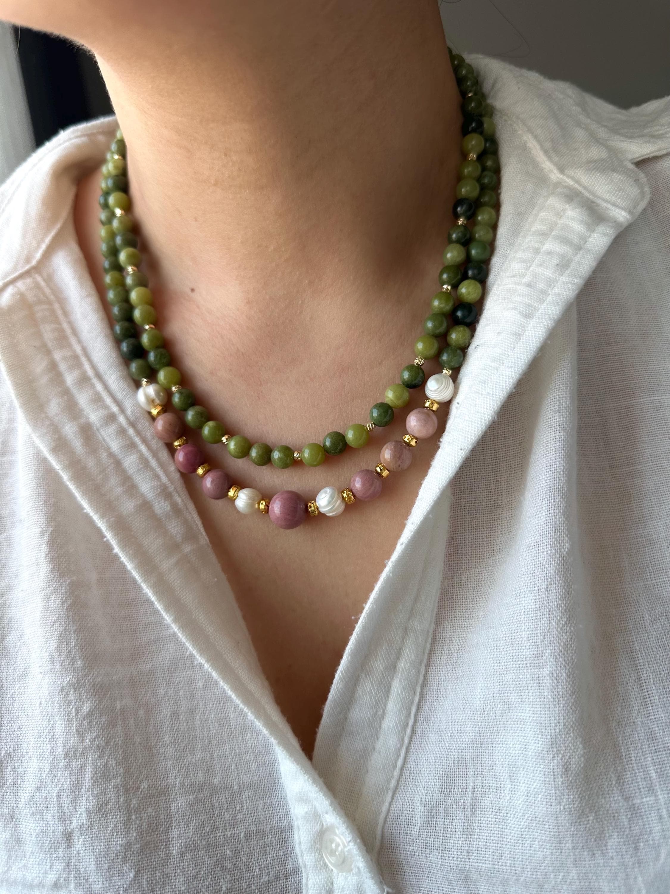 Gold-Plated Multistrand Necklace with Jade, Pink Rhodonite & Freshwater Pearls – Elegant Boho Statement Jewelry