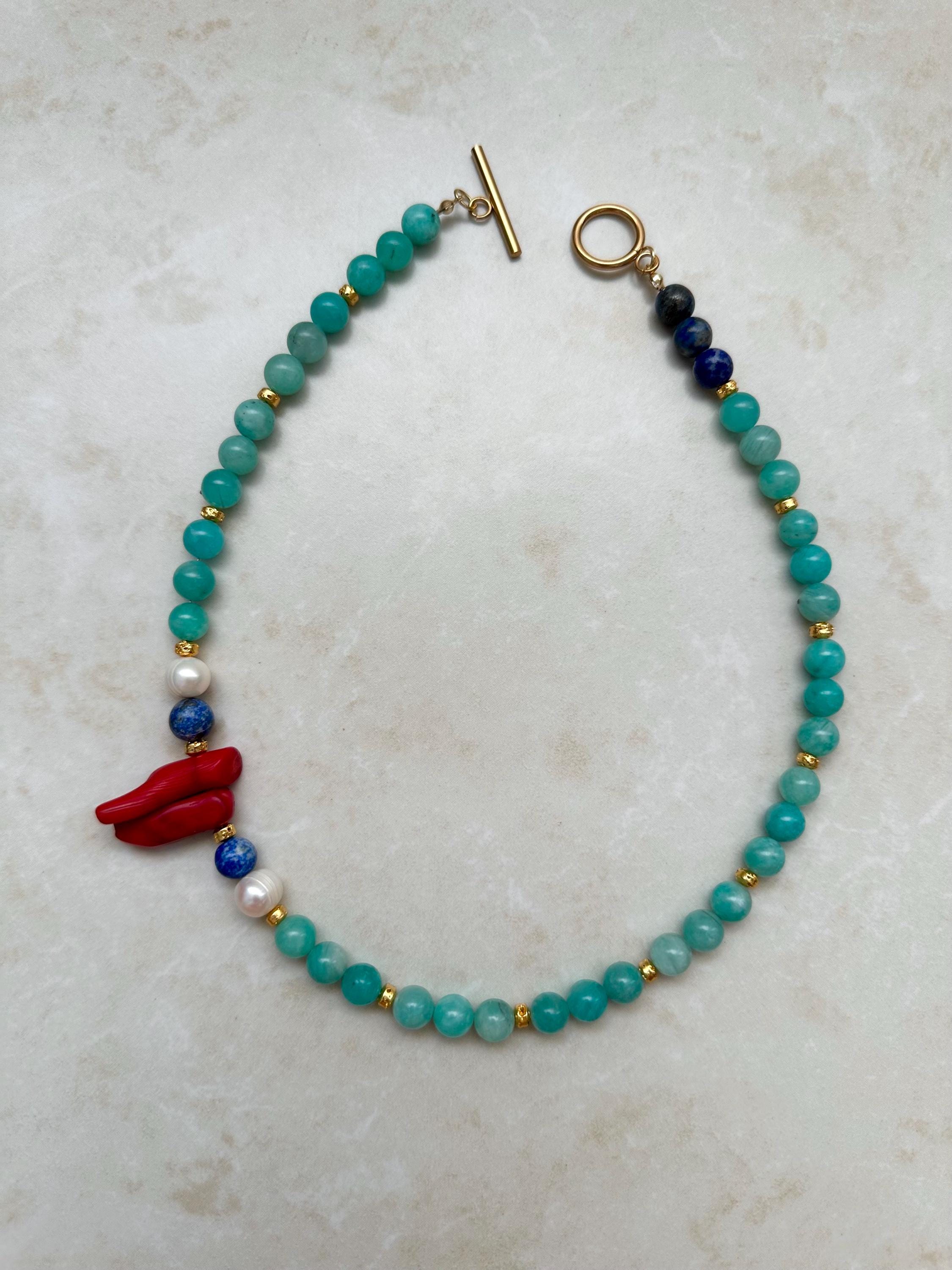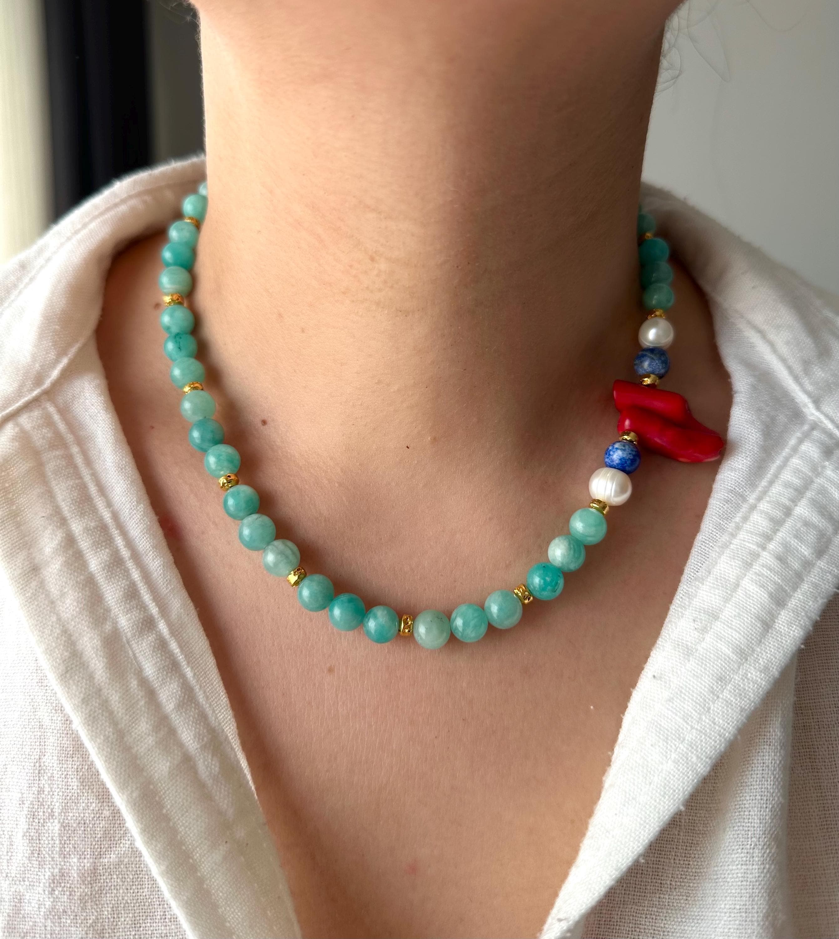 Gold-Plated Amazonite Necklace with Coral, Freshwater Pearls, Lapis Lazuli & Lava Bead Details – Bohemian Statement Jewelry