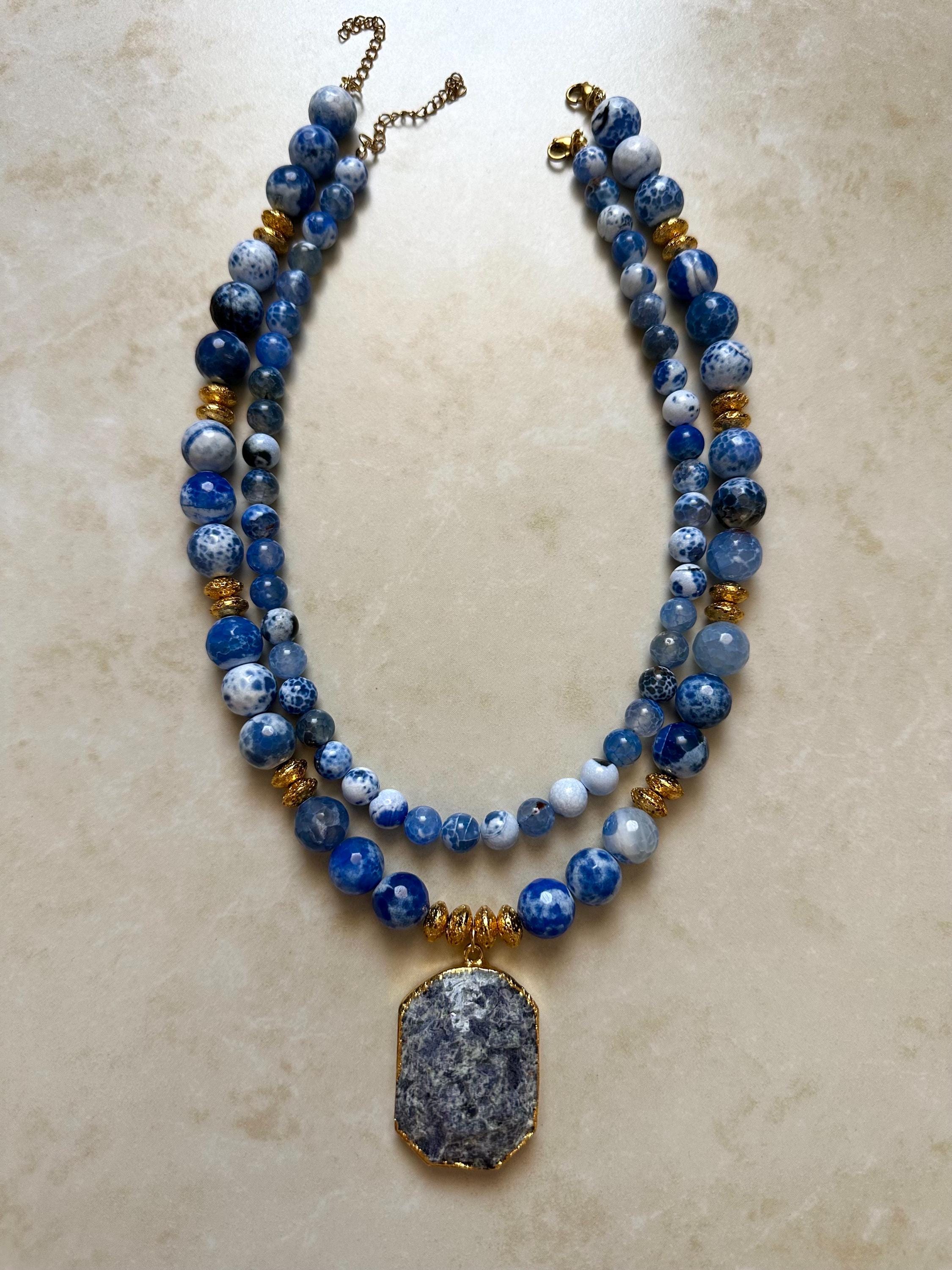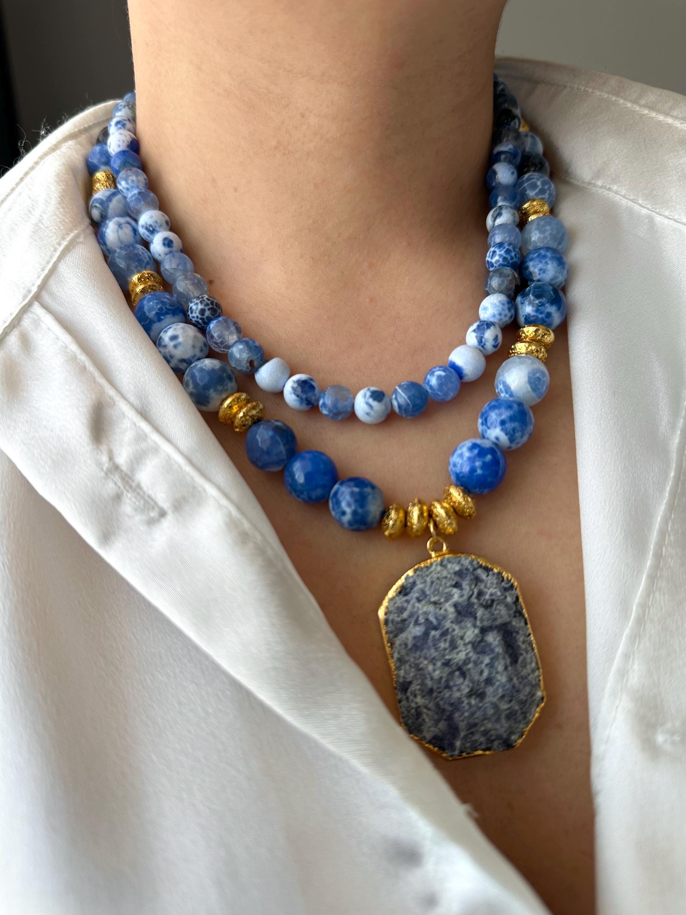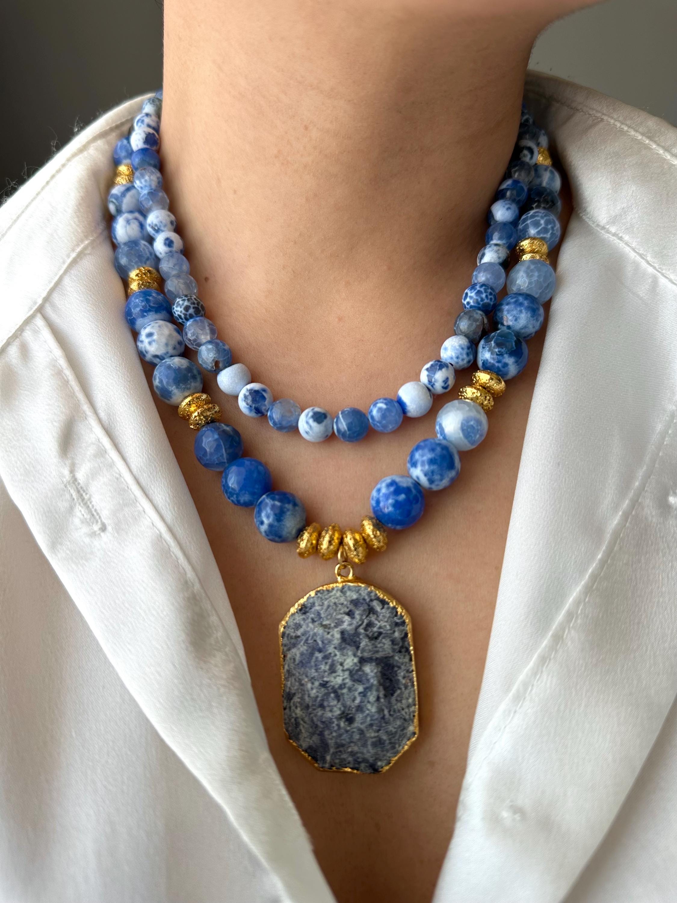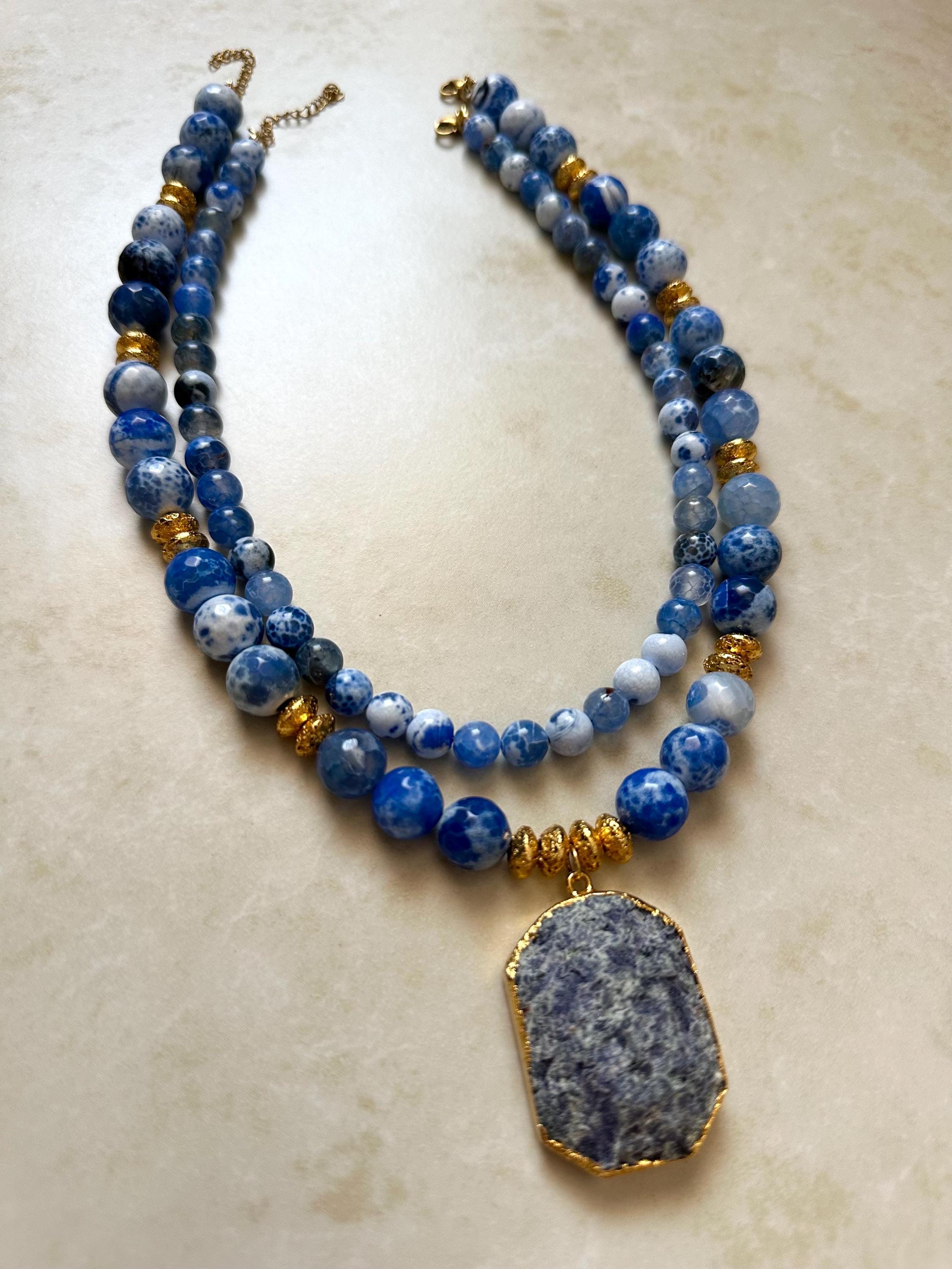 This handcrafted necklace brings together natural beauty and bold design, featuring rich blue hues, organic textures, and luxurious gold accents.