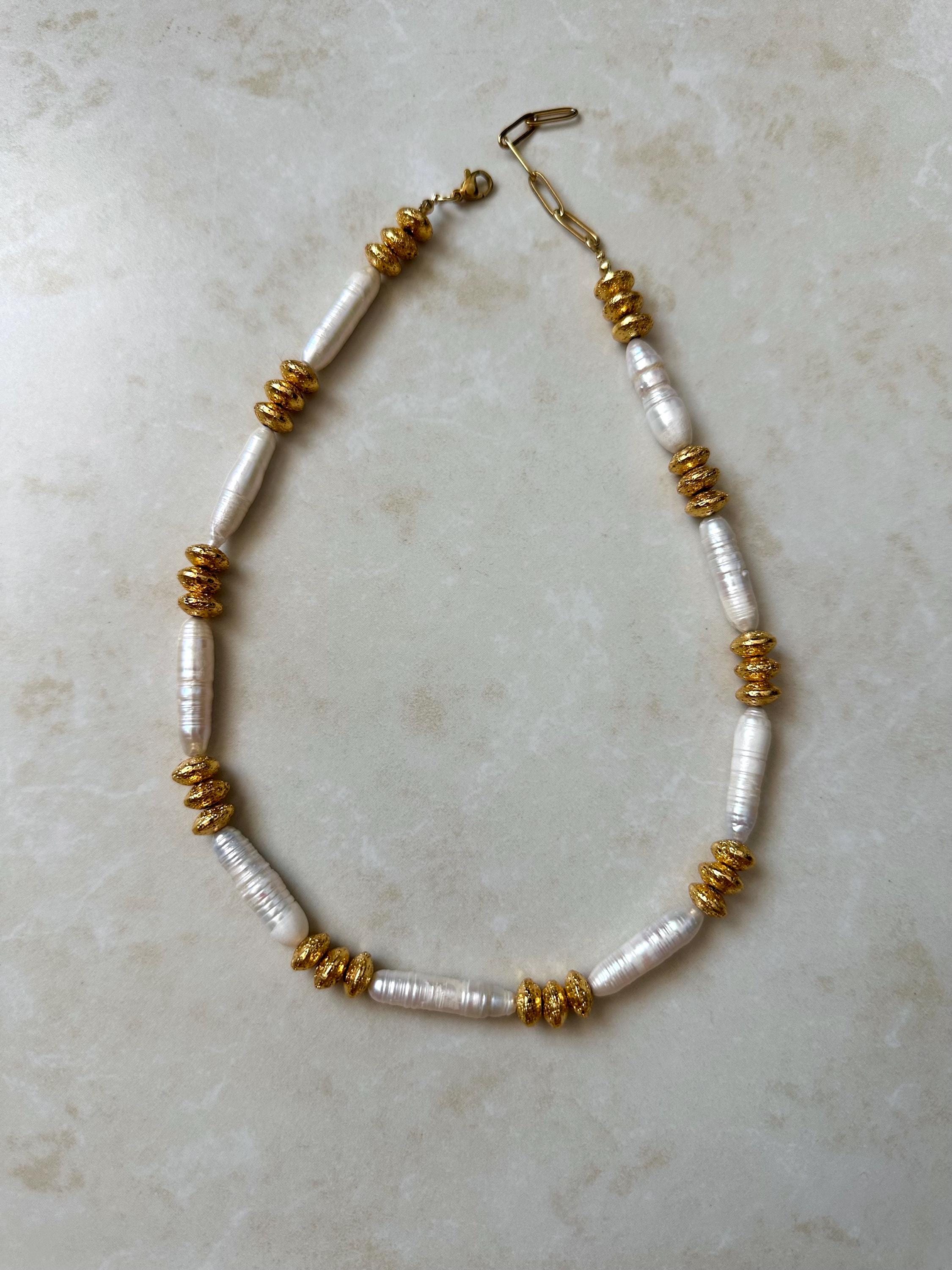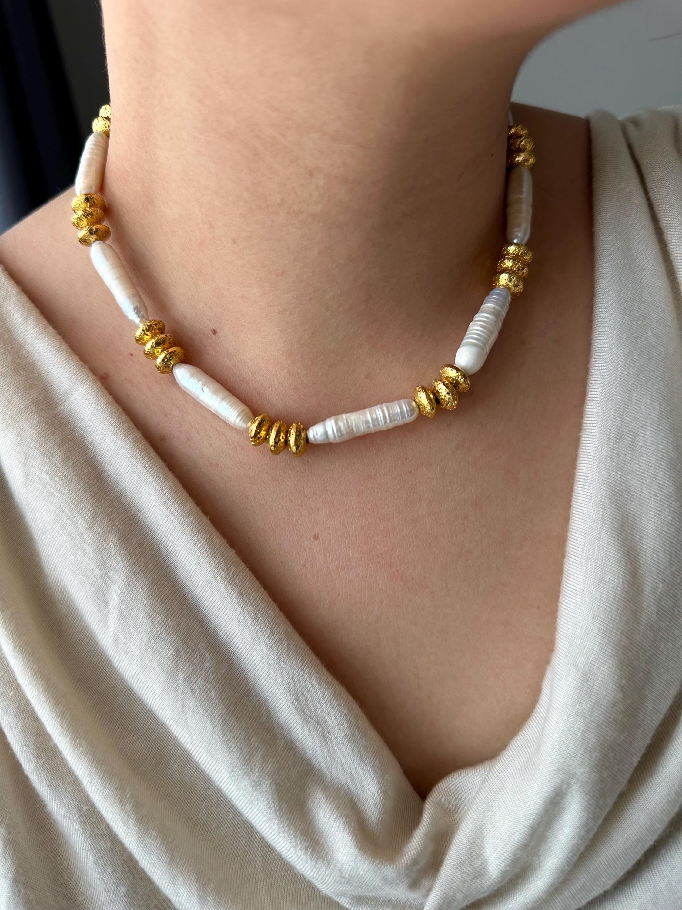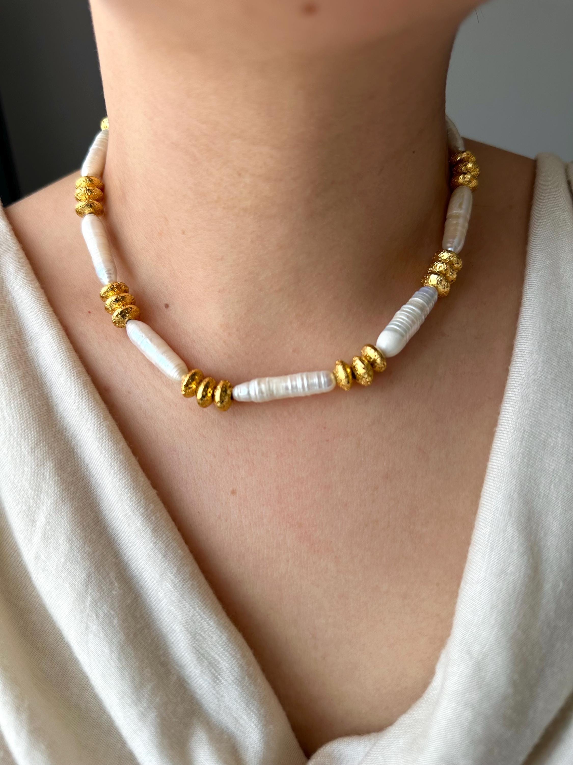 A refined and earthy piece designed for effortless elegance, this handcrafted necklace blends the natural glow of pearls with subtle golden textures.