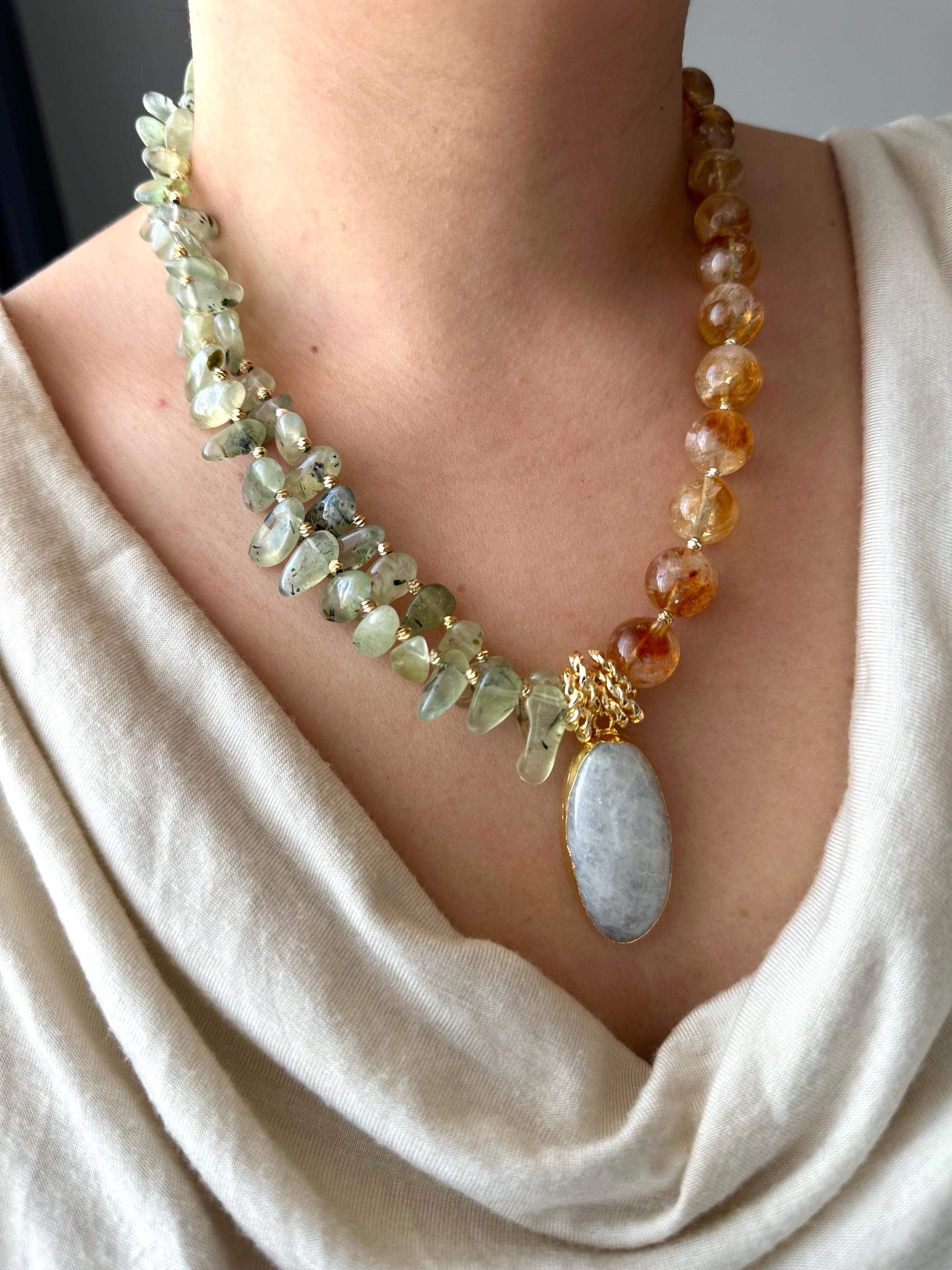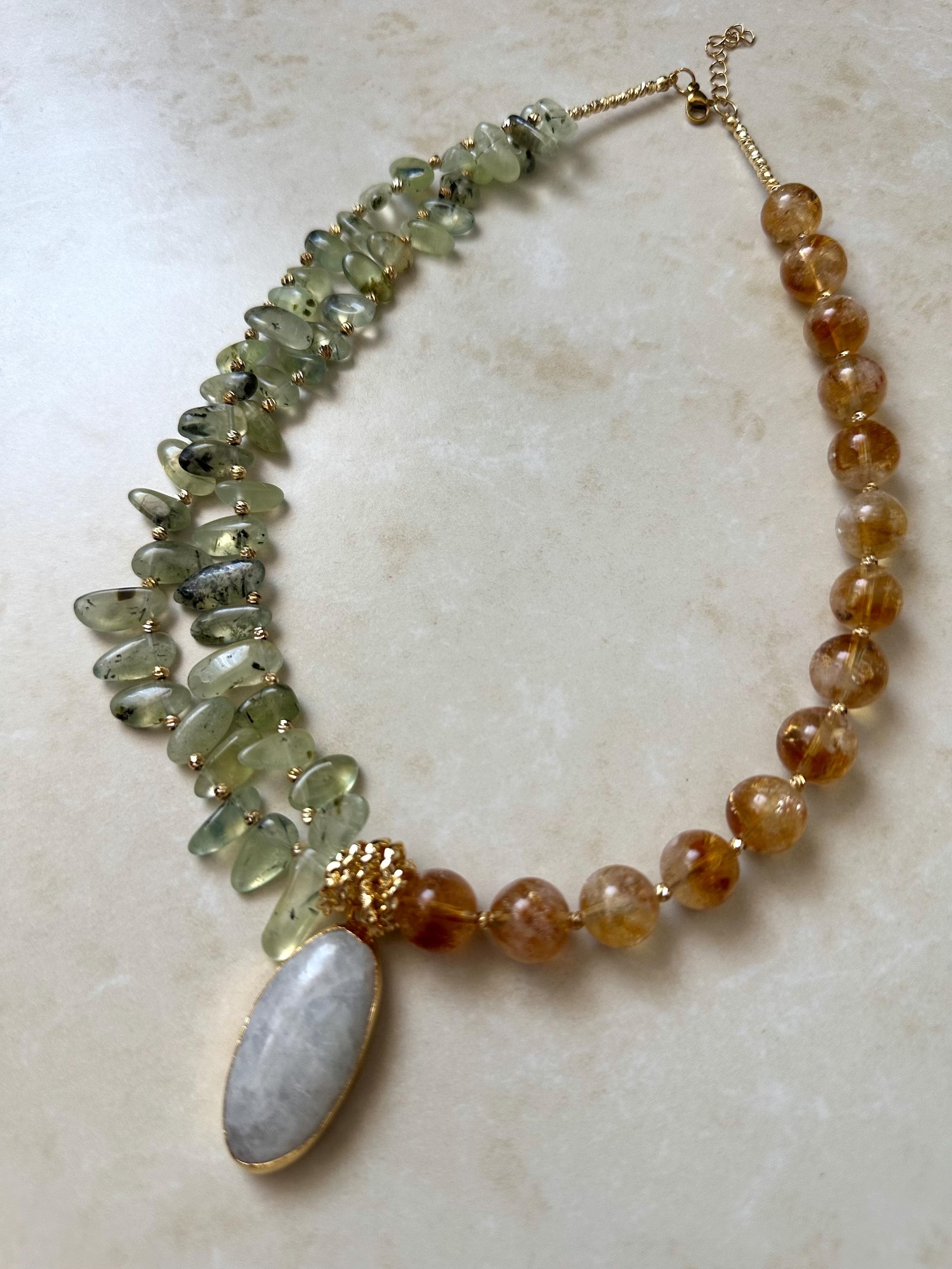 This striking asymmetrical necklace features a unique layout: two strands of soft green prehnite on one side, and a single strand of warm golden citrine on the other. At the center hangs a glowing moonstone drop that completes the piece with elegance and spiritual symbolism. Bold, artistic, and deeply bohemian.