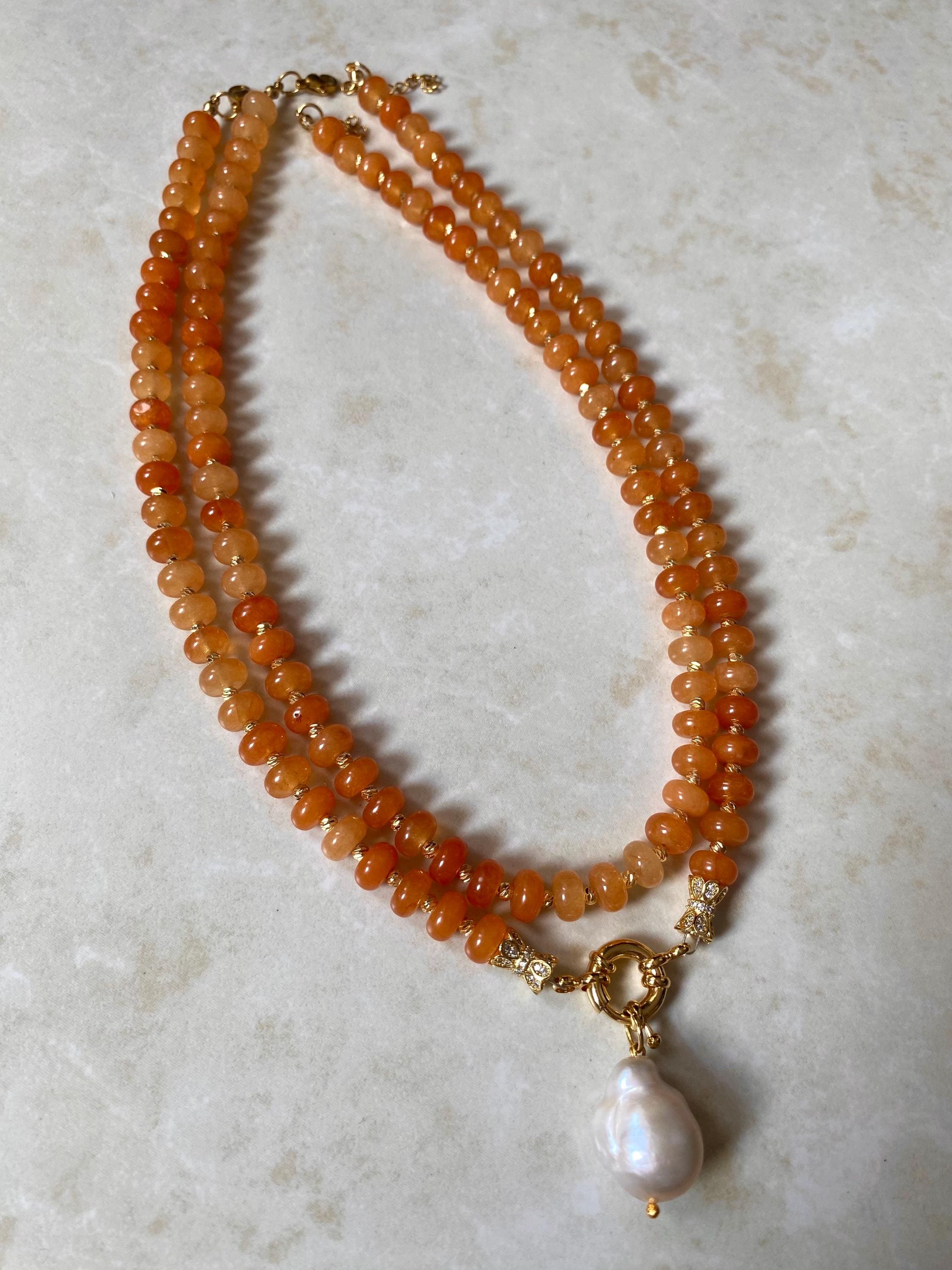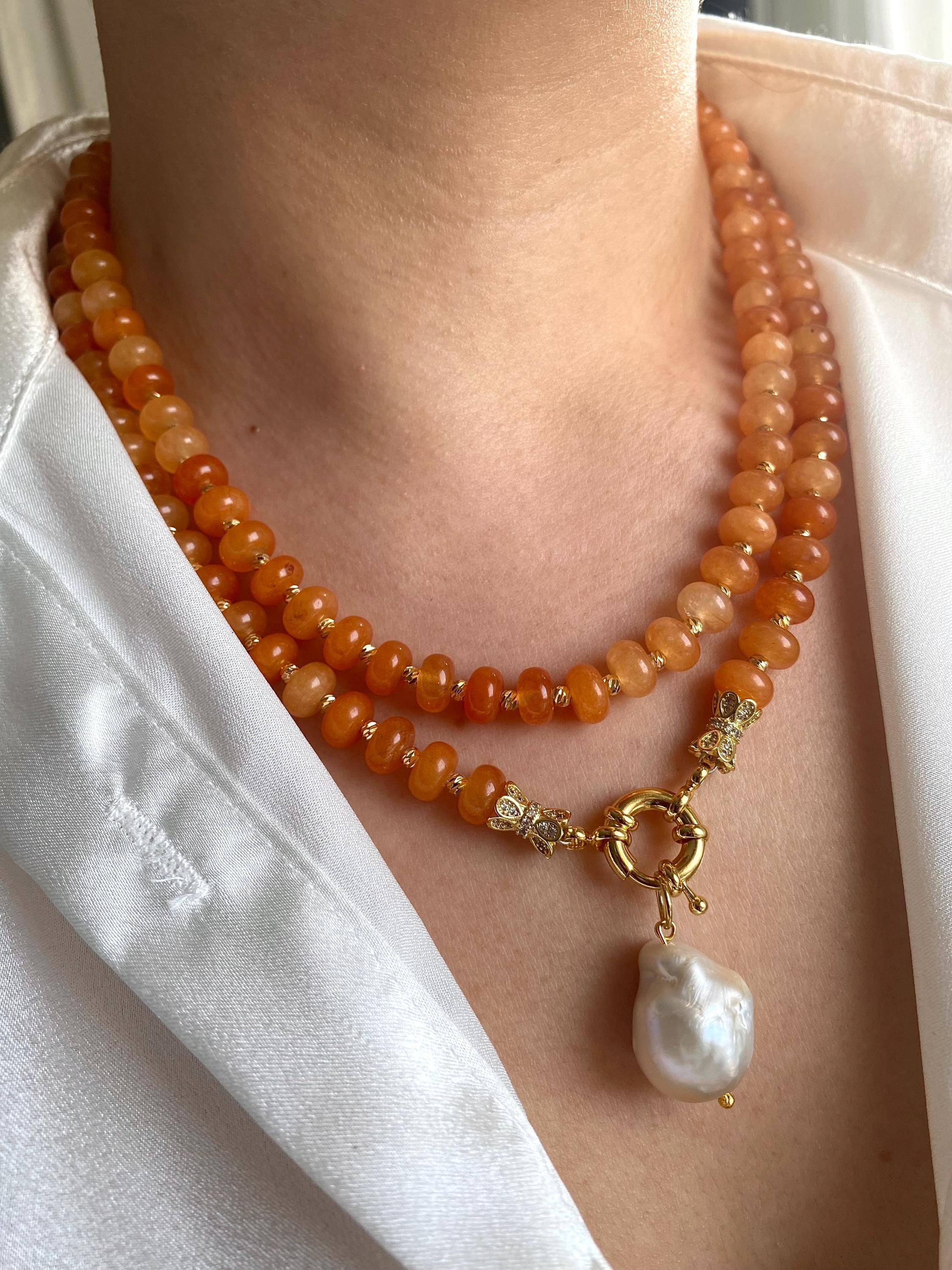 This necklace is a celebration of bold, earthy beauty—perfect for lovers of natural gemstones, bohemian fashion, and artsy, handmade jewelry. The vibrant orange hues evoke warmth, energy, and sunlight, making it an ideal summer accessory or a pop of color for any season. The chunky design and organic textures bring a natural yet luxurious aesthetic to your outfit.