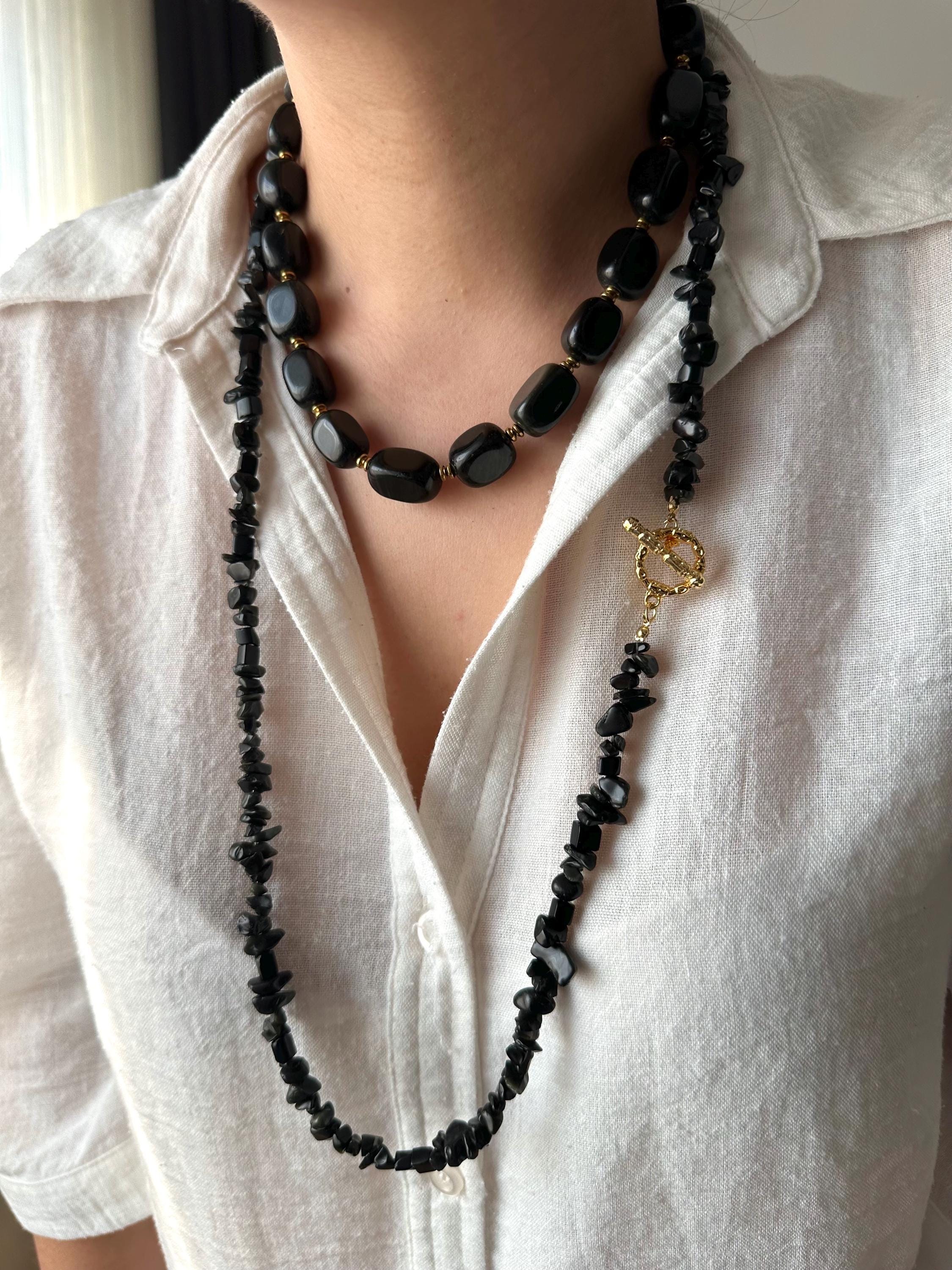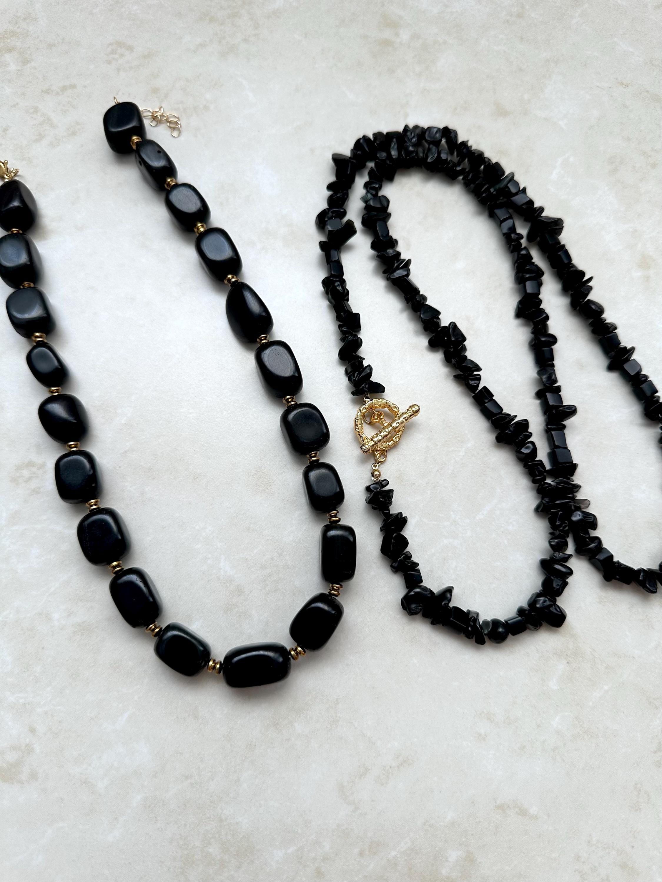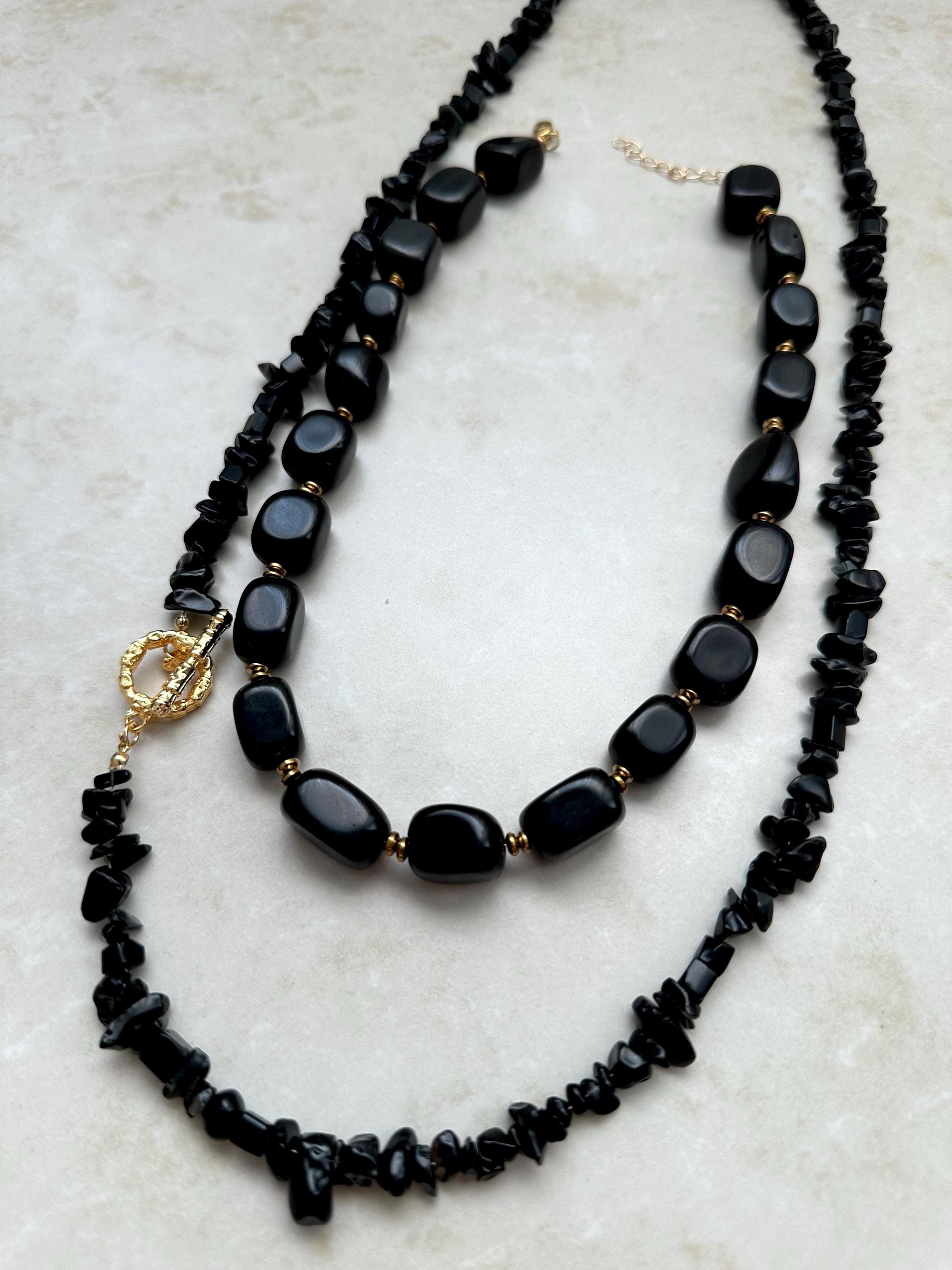 Let your jewelry speak with intention. This double-strand statement necklace brings together the protective energy of obsidian and the grounding strength of hematite — designed for those who carry quiet power.