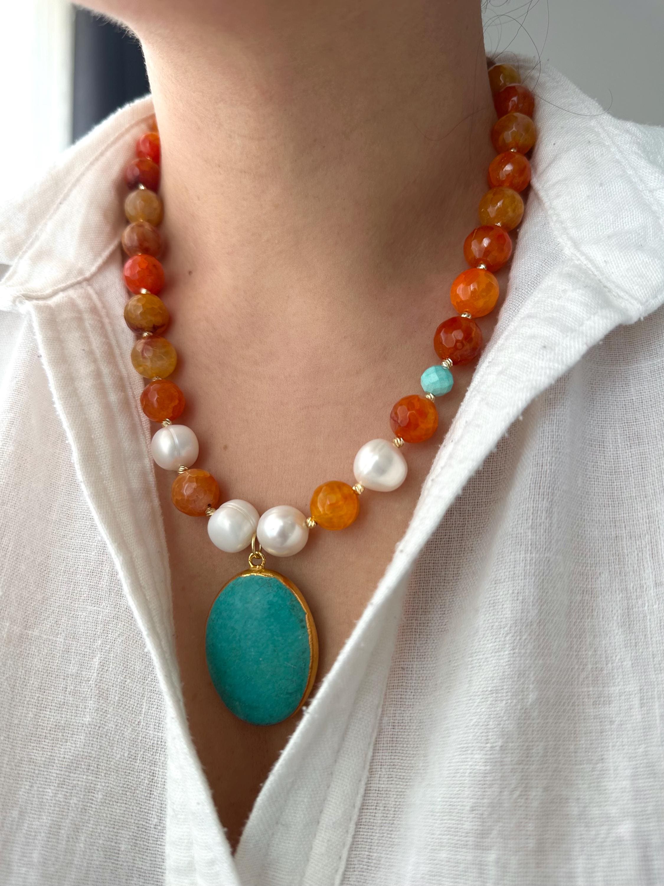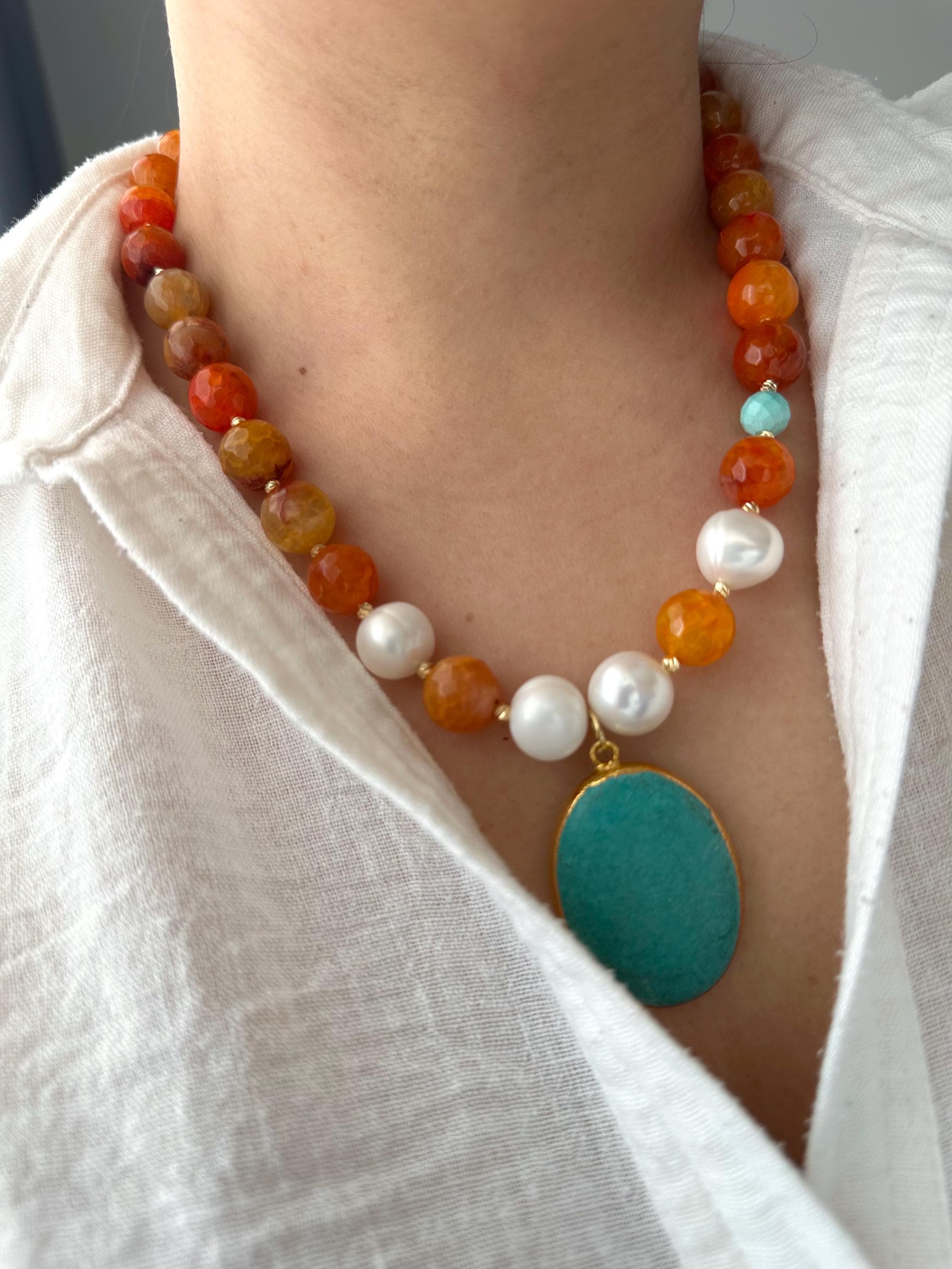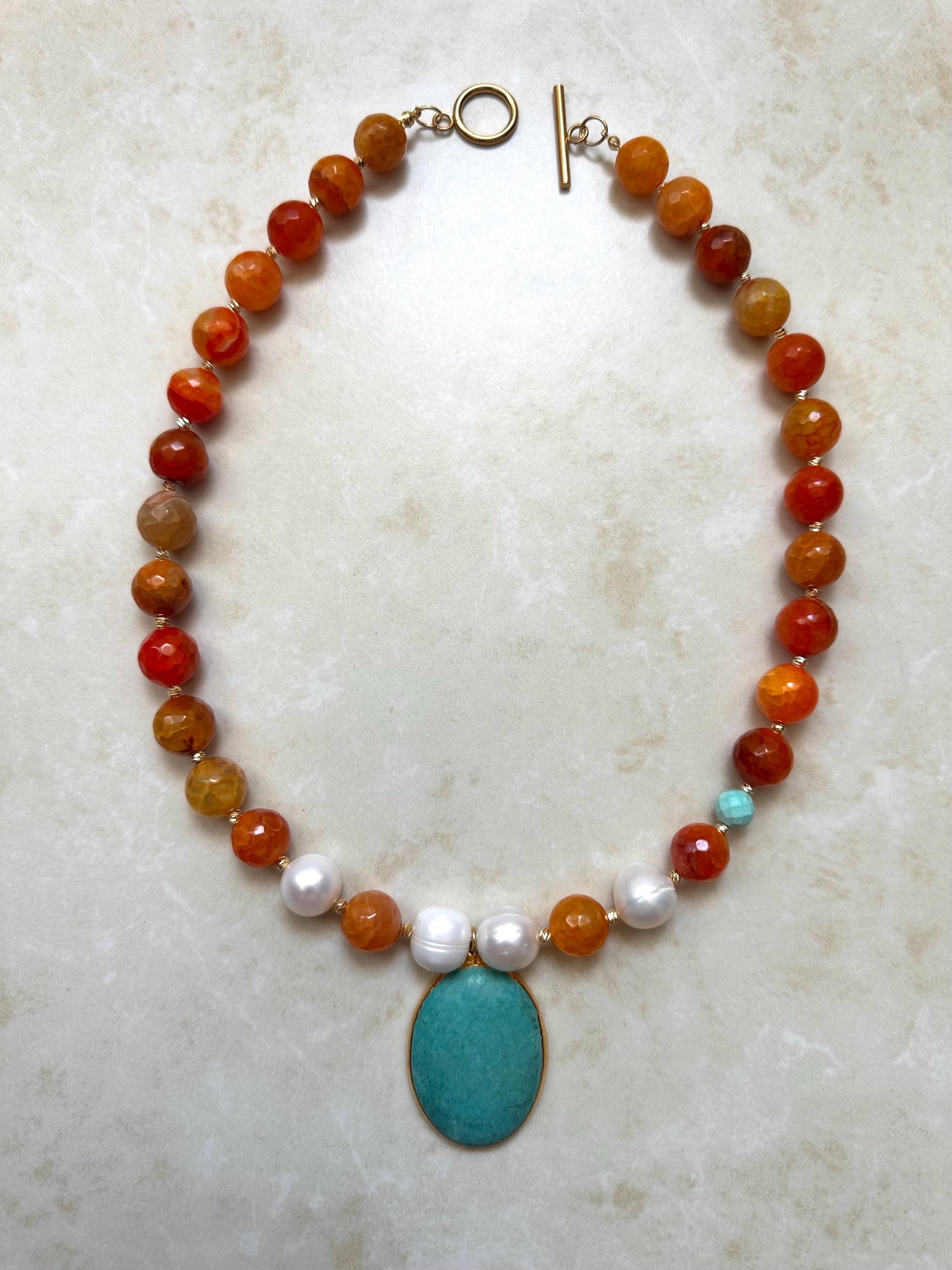 🧡 Turquoise, Orange Agate & Pearl Statement Necklace
