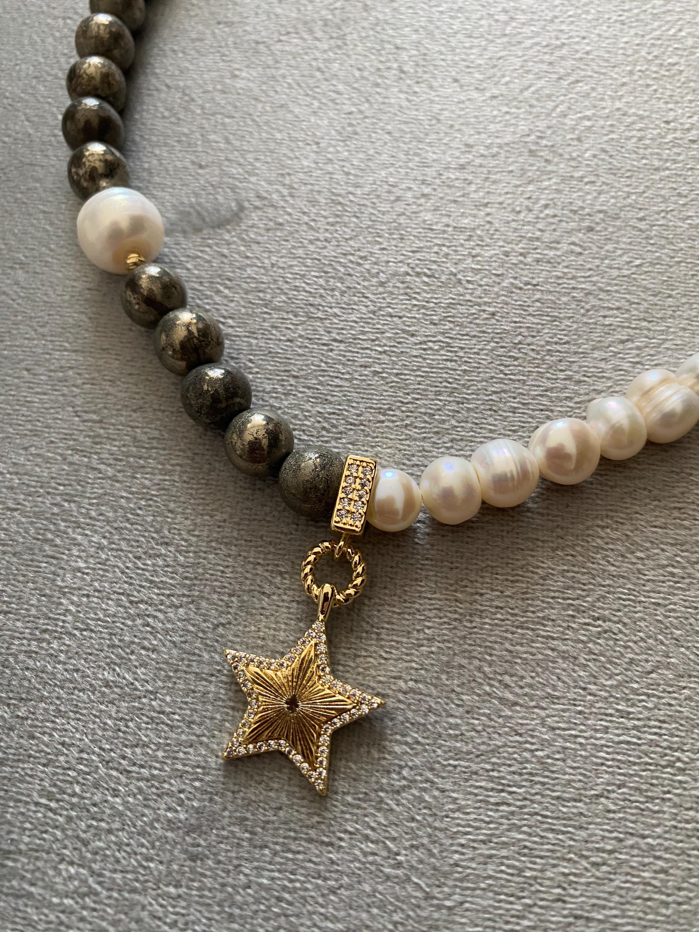 This pyrite and freshwater pearl star pendant necklace blends earthy sparkle and luminous elegance — a stunning accessory and thoughtful gift.