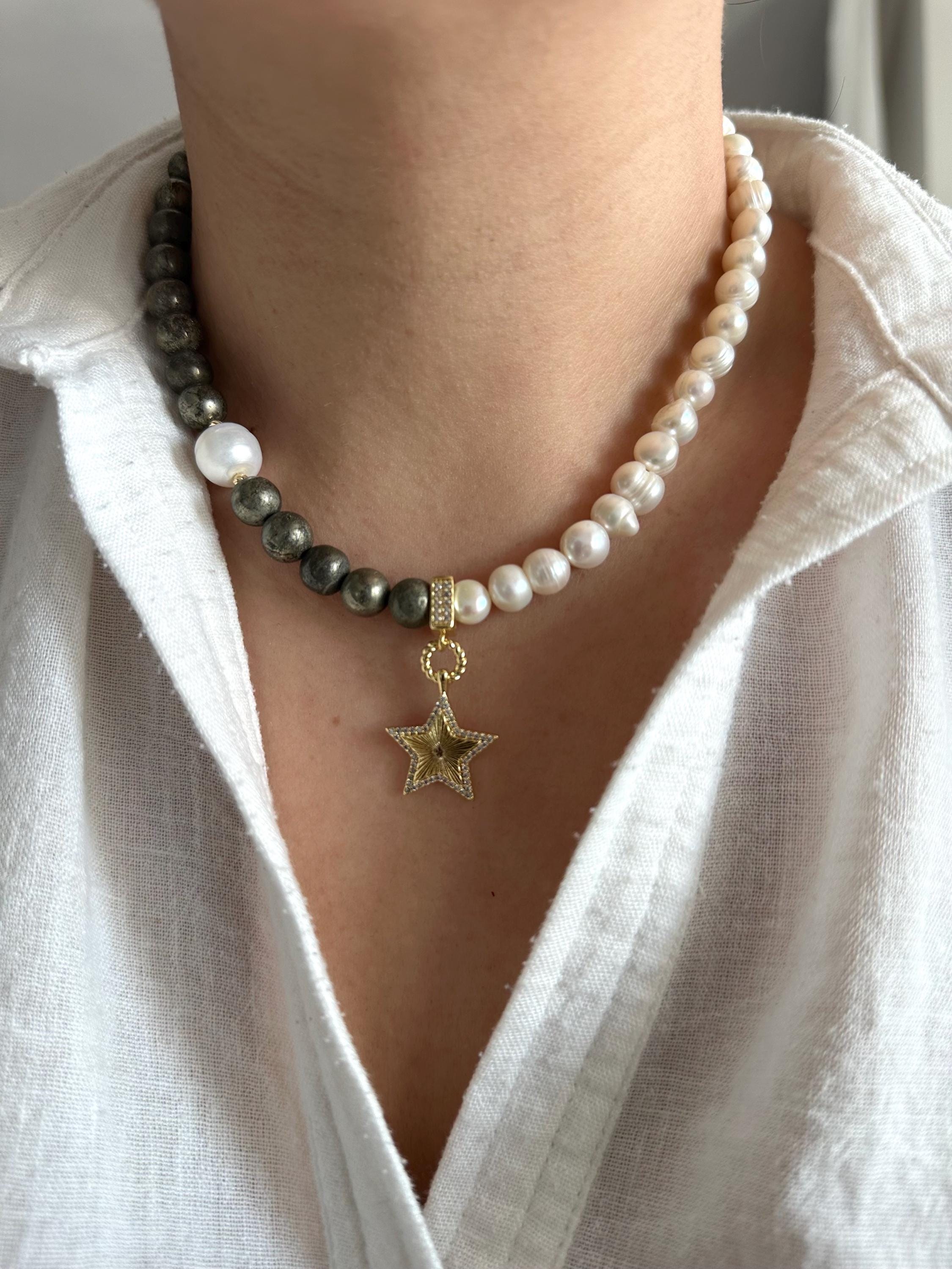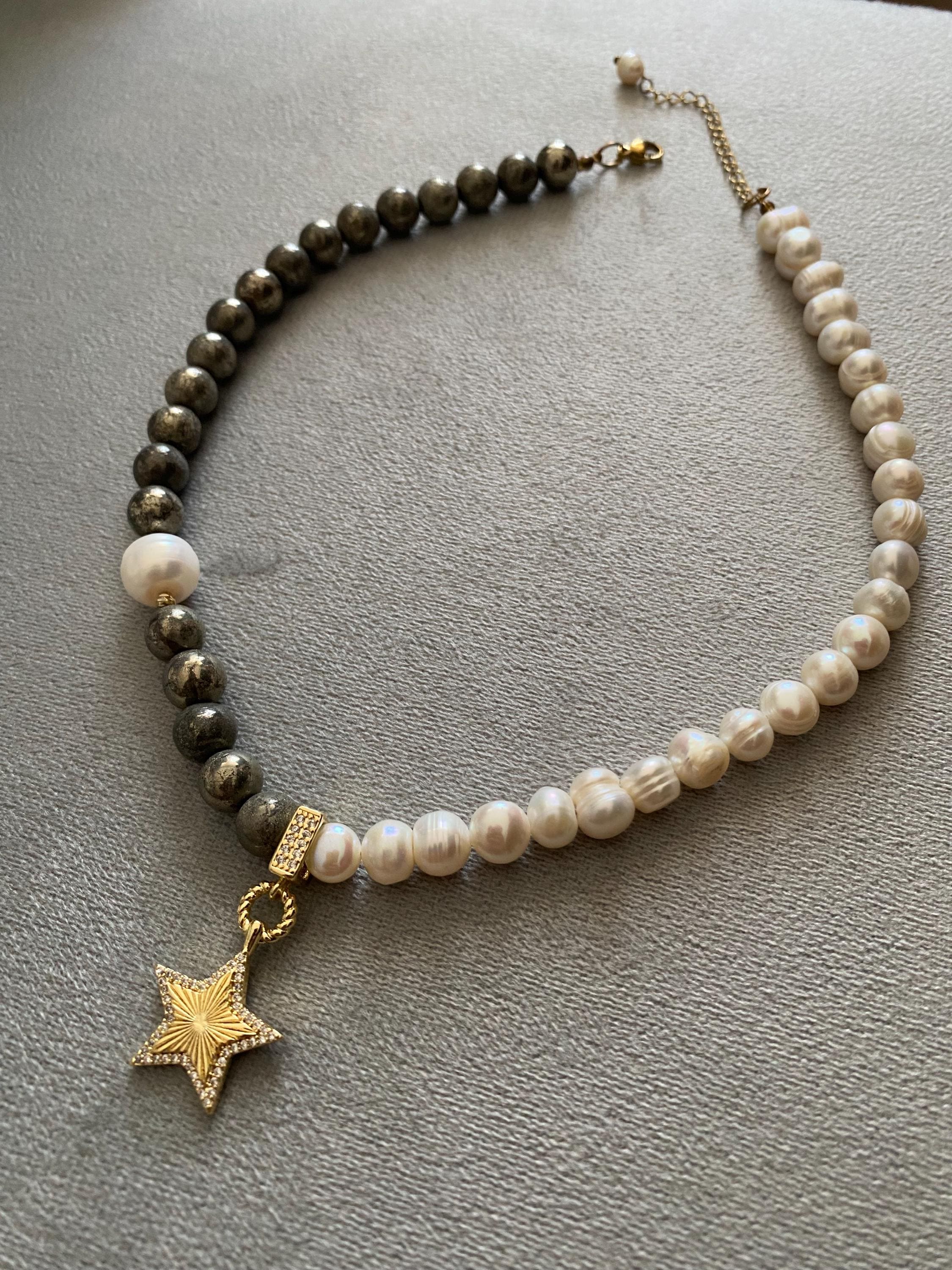 This short gold-plated necklace brings together the bold shimmer of natural pyrite and the soft glow of freshwater pearls. A small gold star charm in the center adds a subtle, elegant detail.