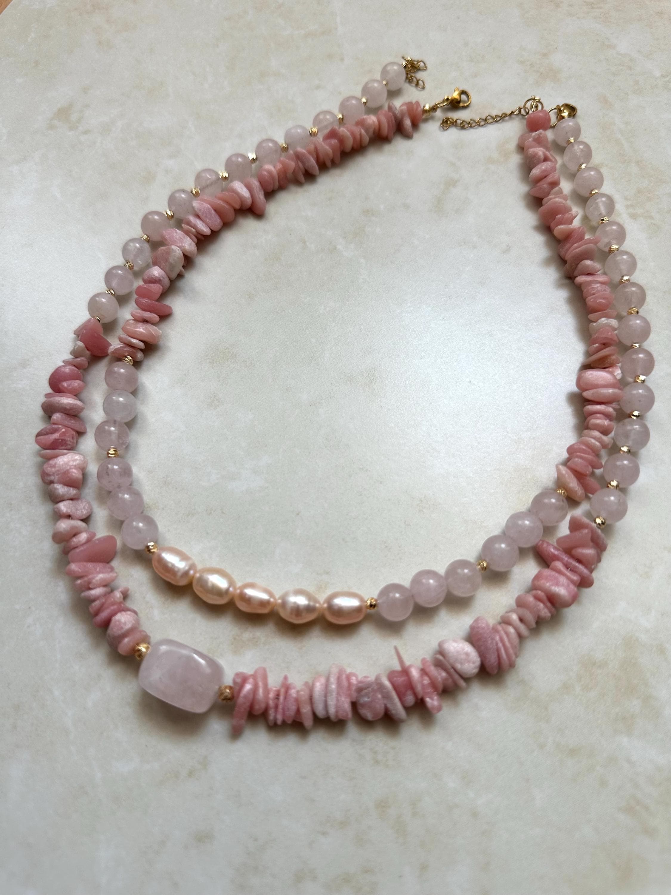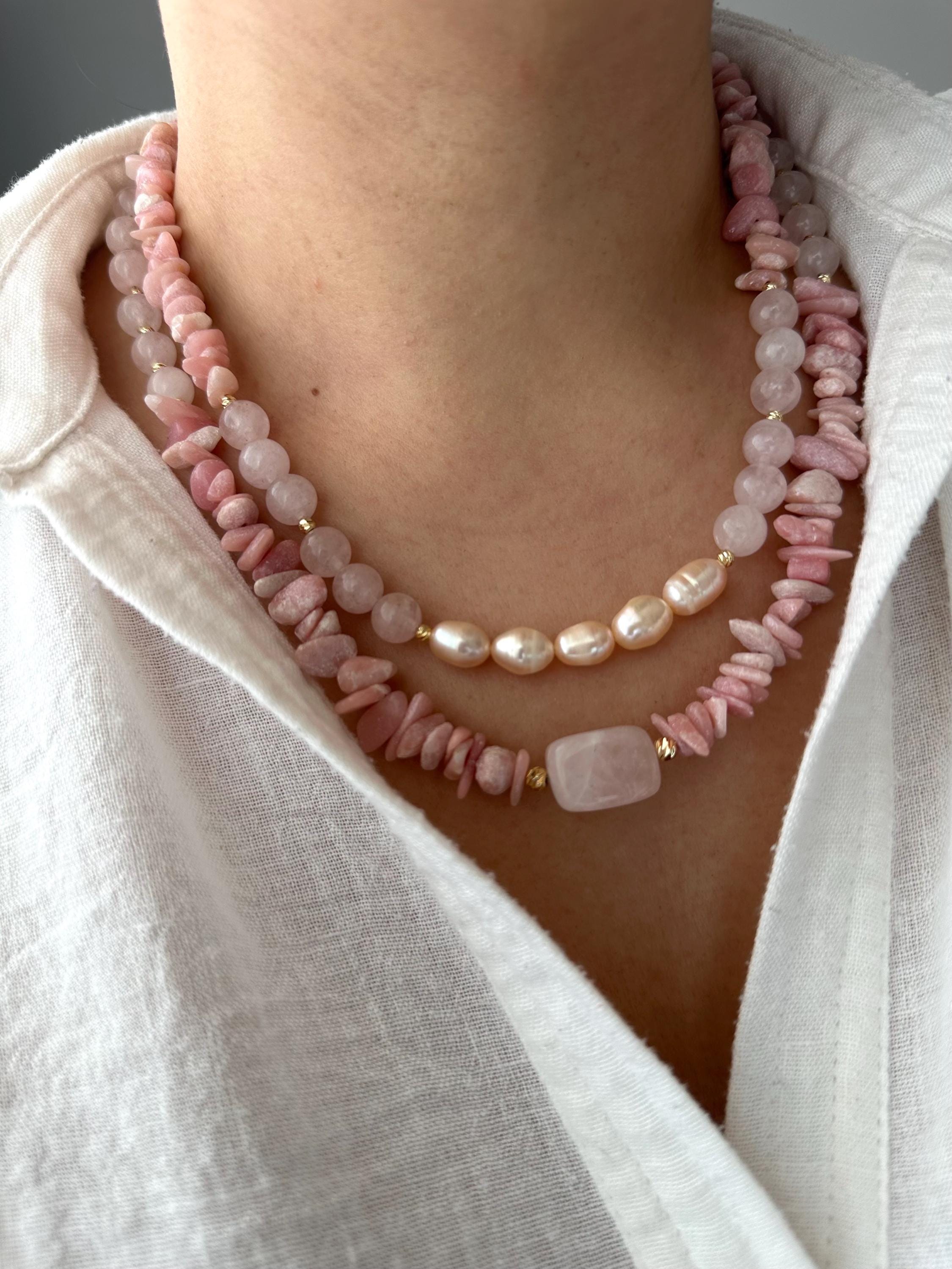 🌸 Pink Opal, Rose Quartz & Pink Pearl Multistrand Necklace