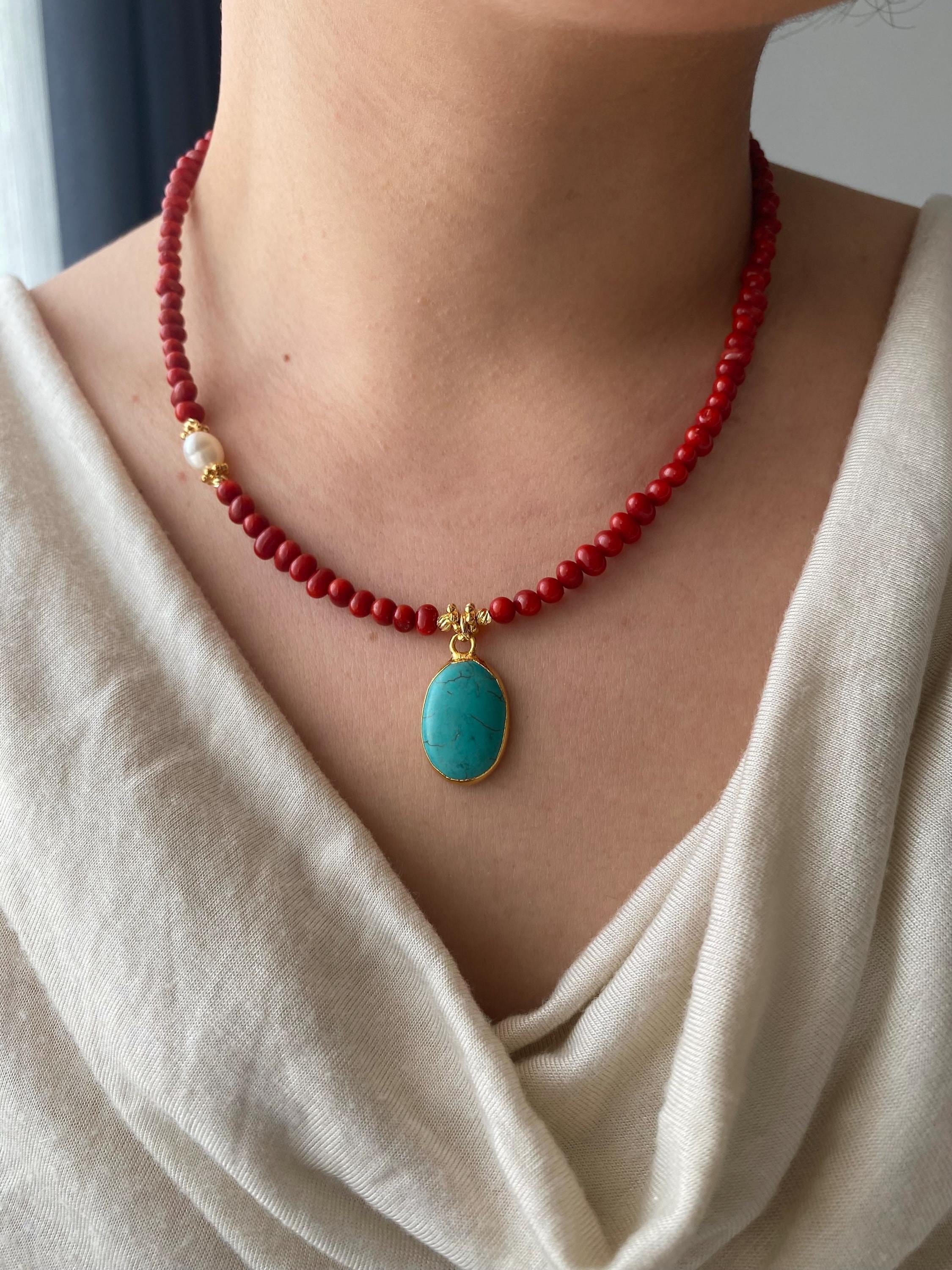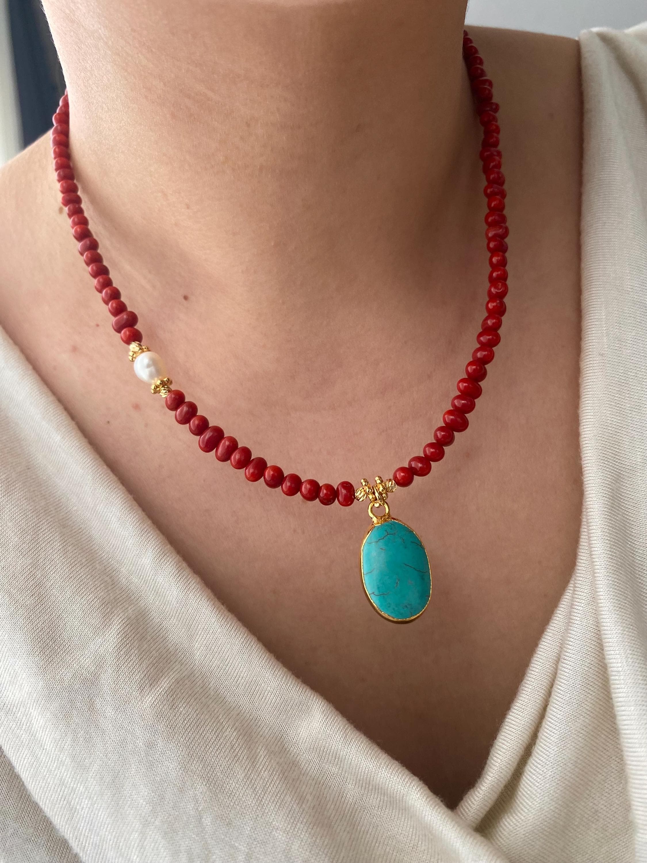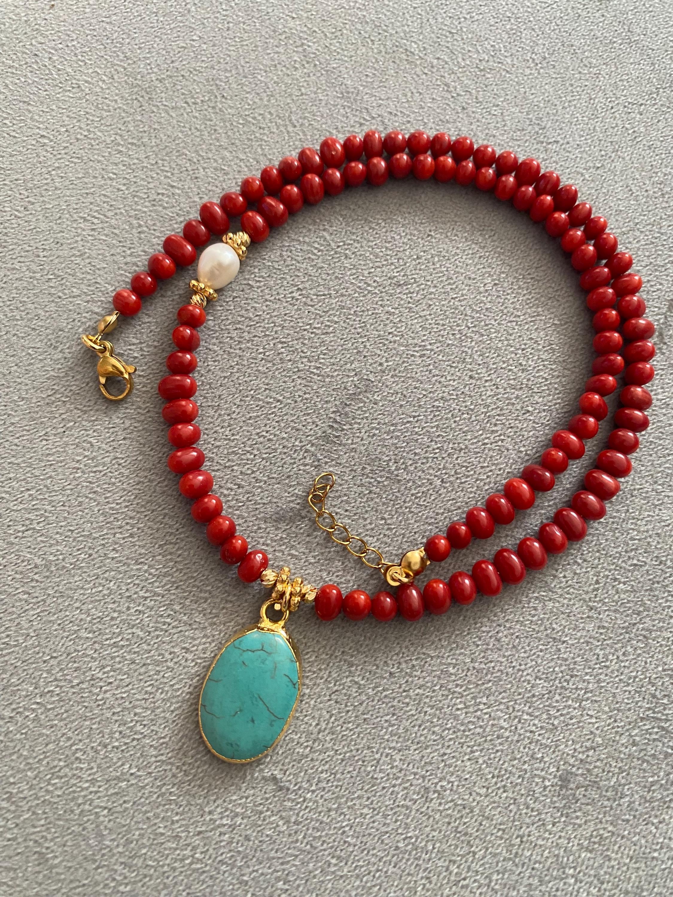 This handmade gold-plated necklace brings a touch of effortless elegance with vibrant red coral beads, a single freshwater pearl on the side, and a subtle turquoise stone as the finishing accent. A perfect choice for those who love minimal yet soulful boho style.
