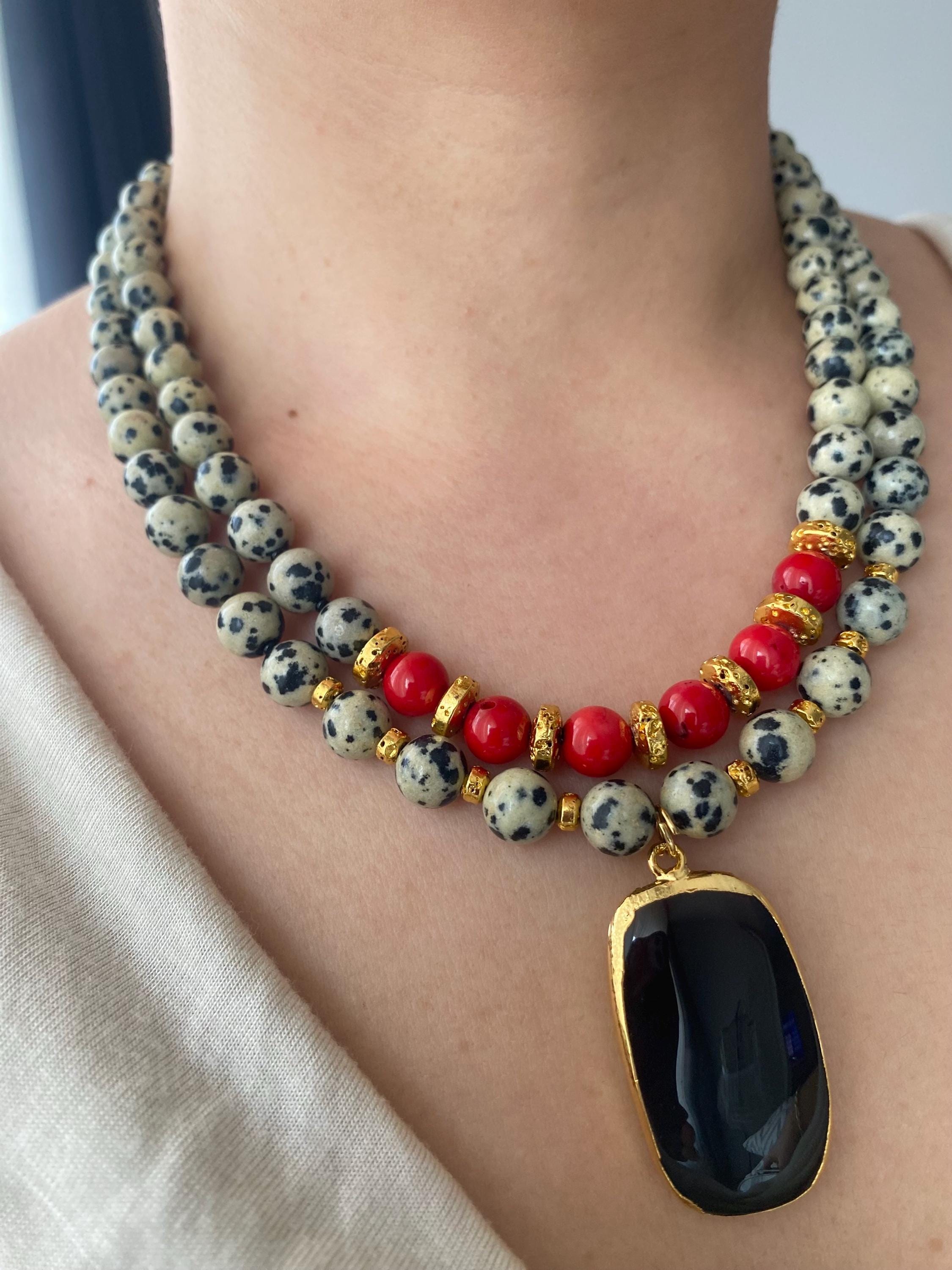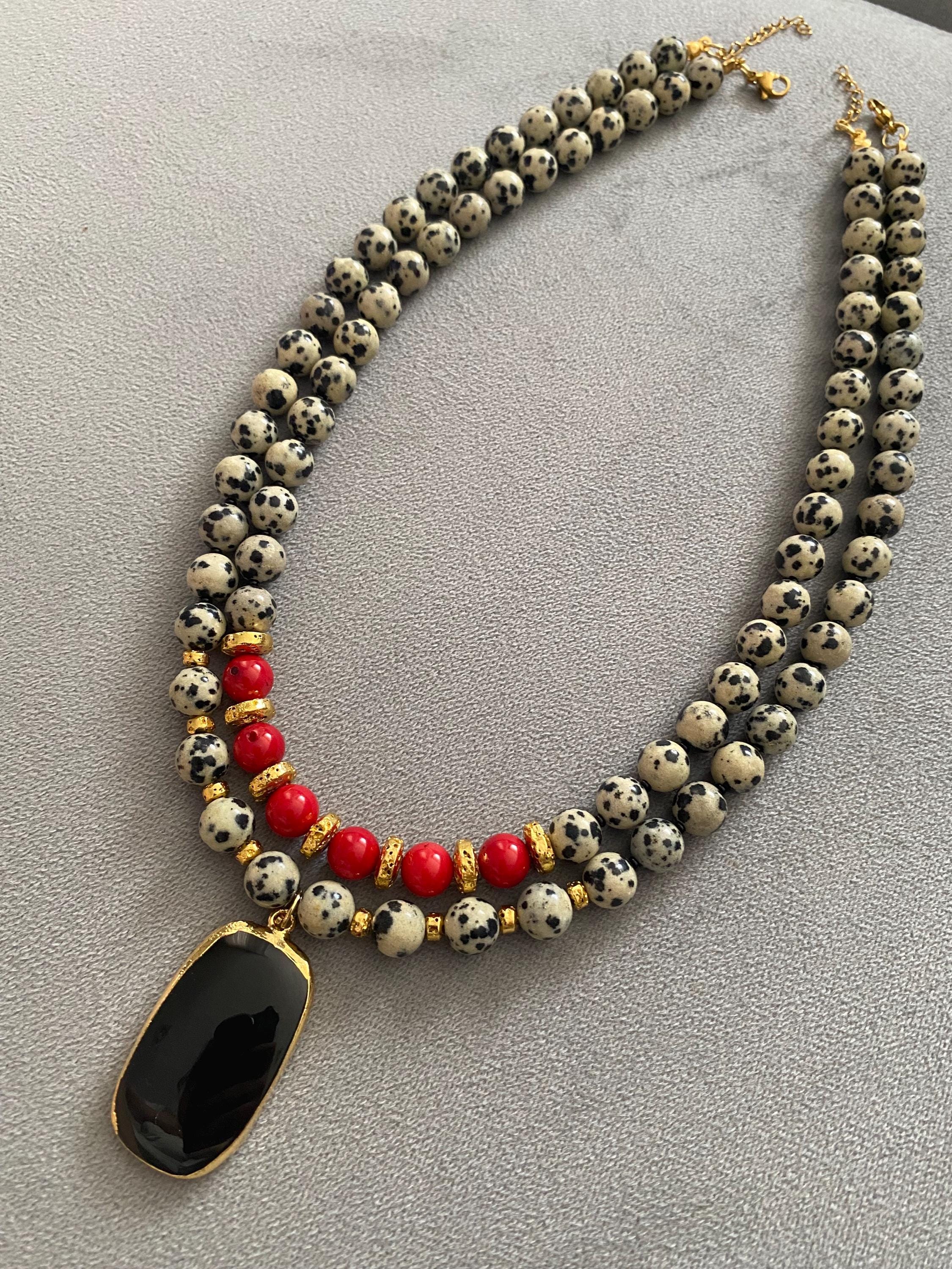 ❤️ Dalmatian Jasper & Red Coral Multistrand Necklace with Obsidian Pendant