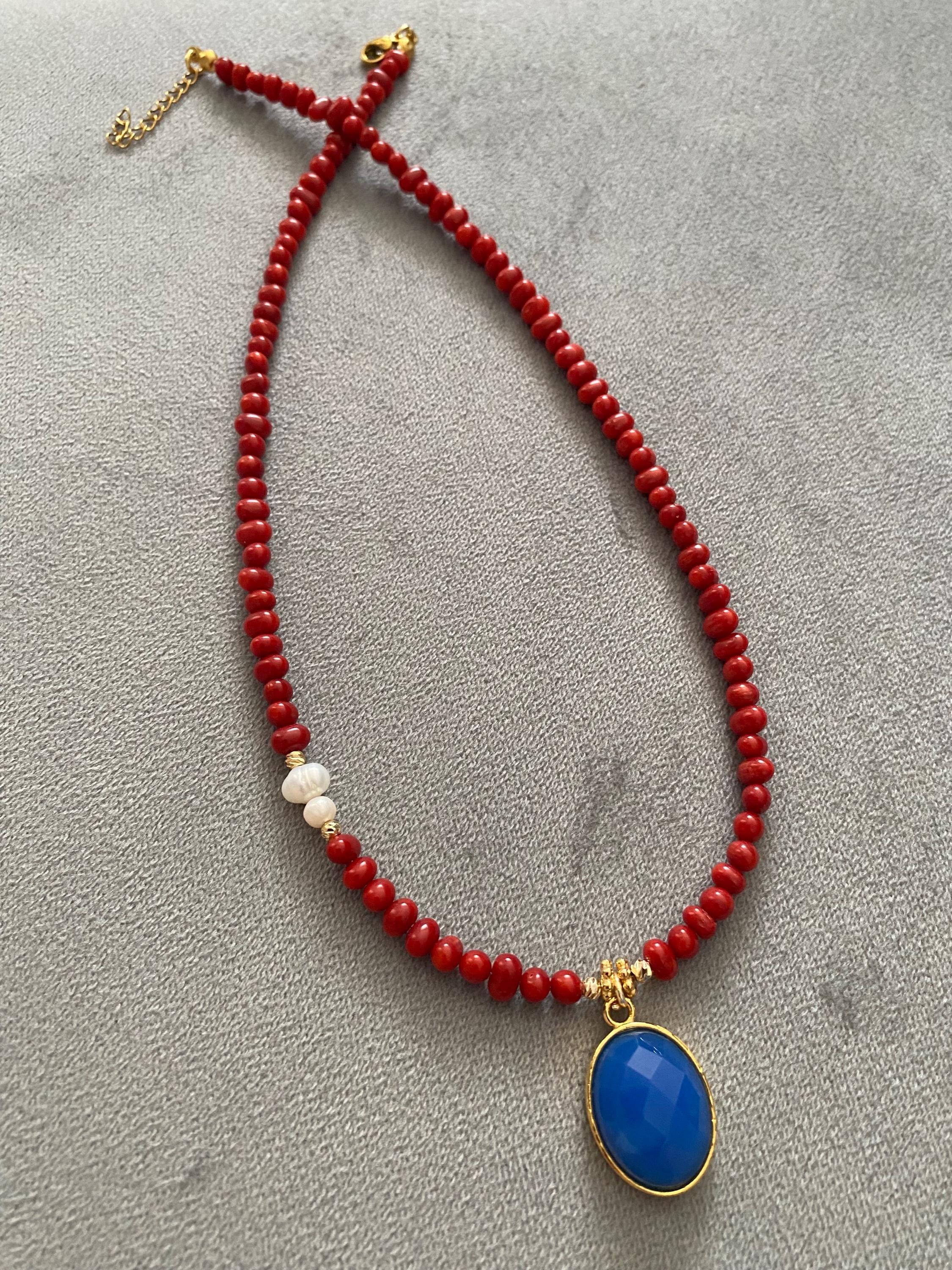 Red Coral & Blue Chalcedony Minimalist Necklace