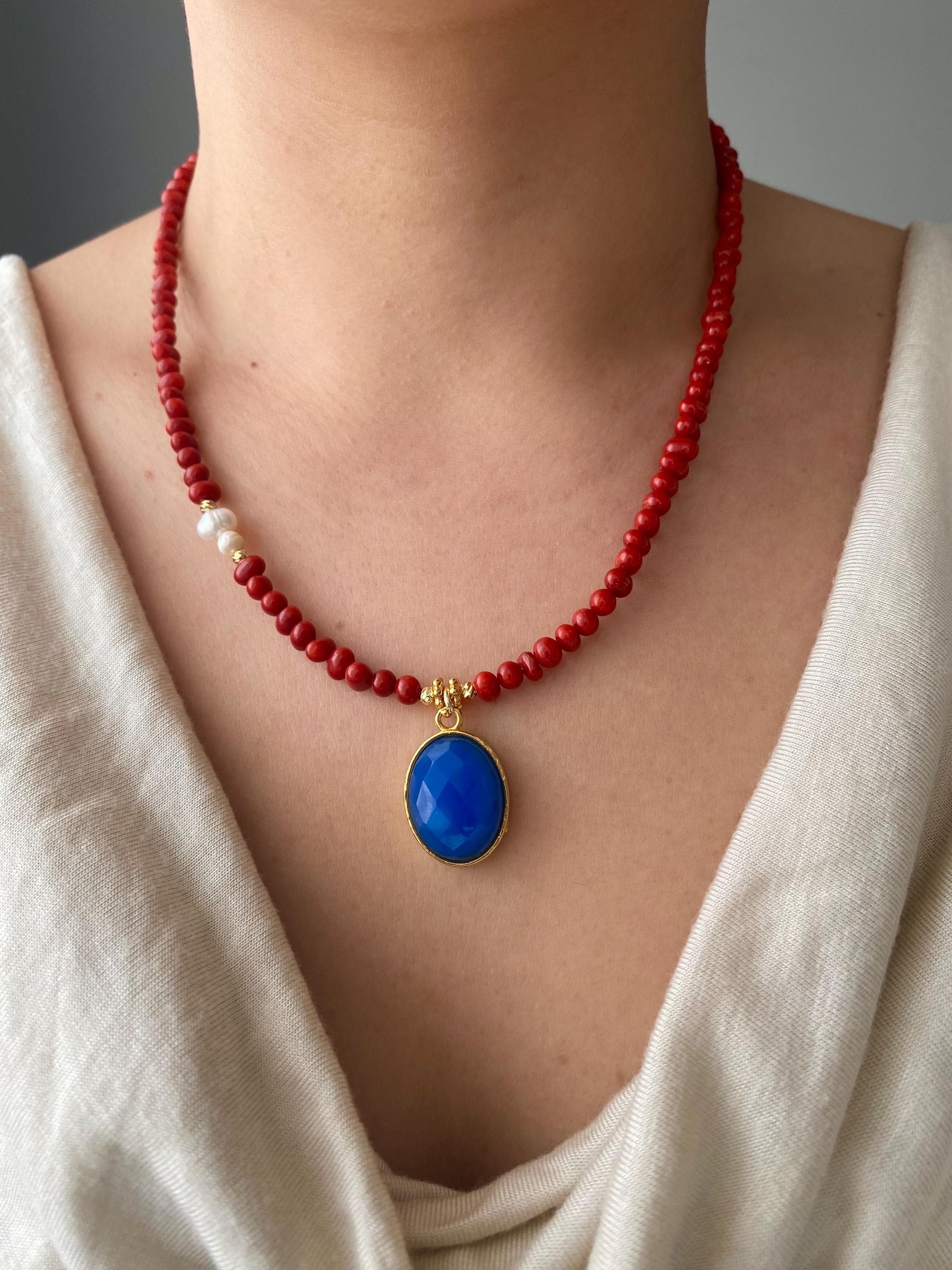 A harmonious blend of bold and soft — this minimalist gold-plated necklace features vibrant red coral, a soothing blue chalcedony pendant, and the subtle shimmer of freshwater pearls. Perfect for effortless everyday elegance with a touch of boho soul.