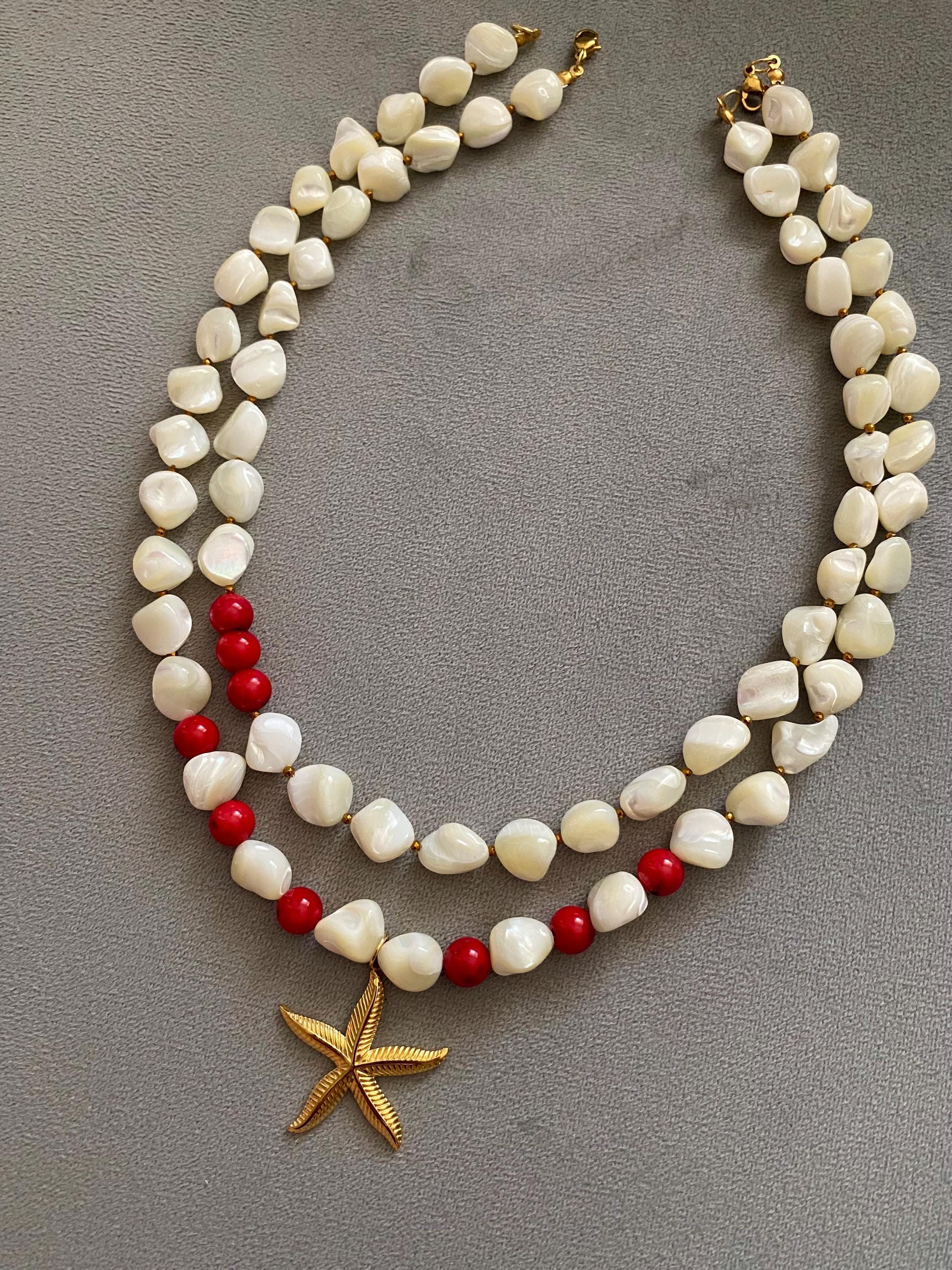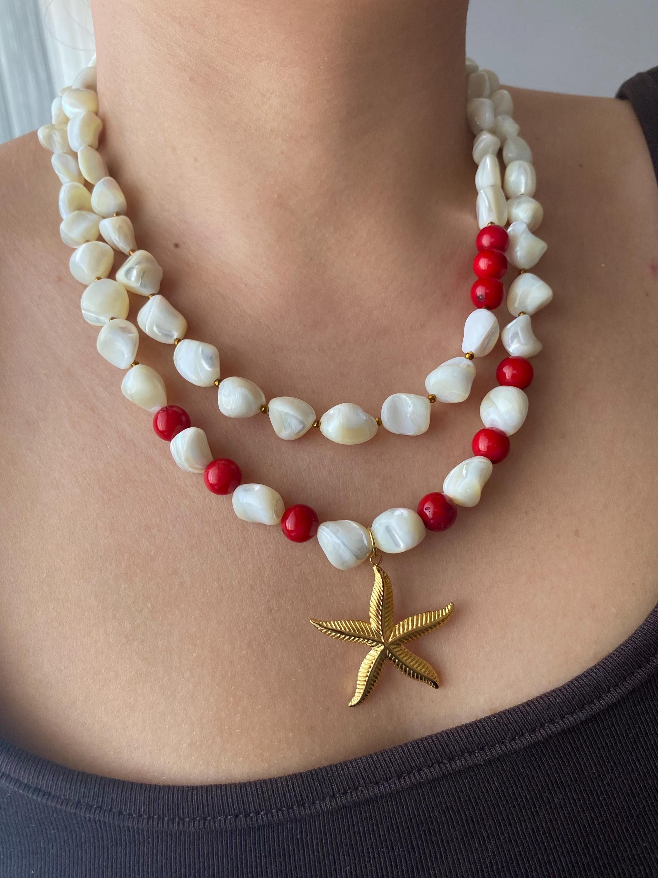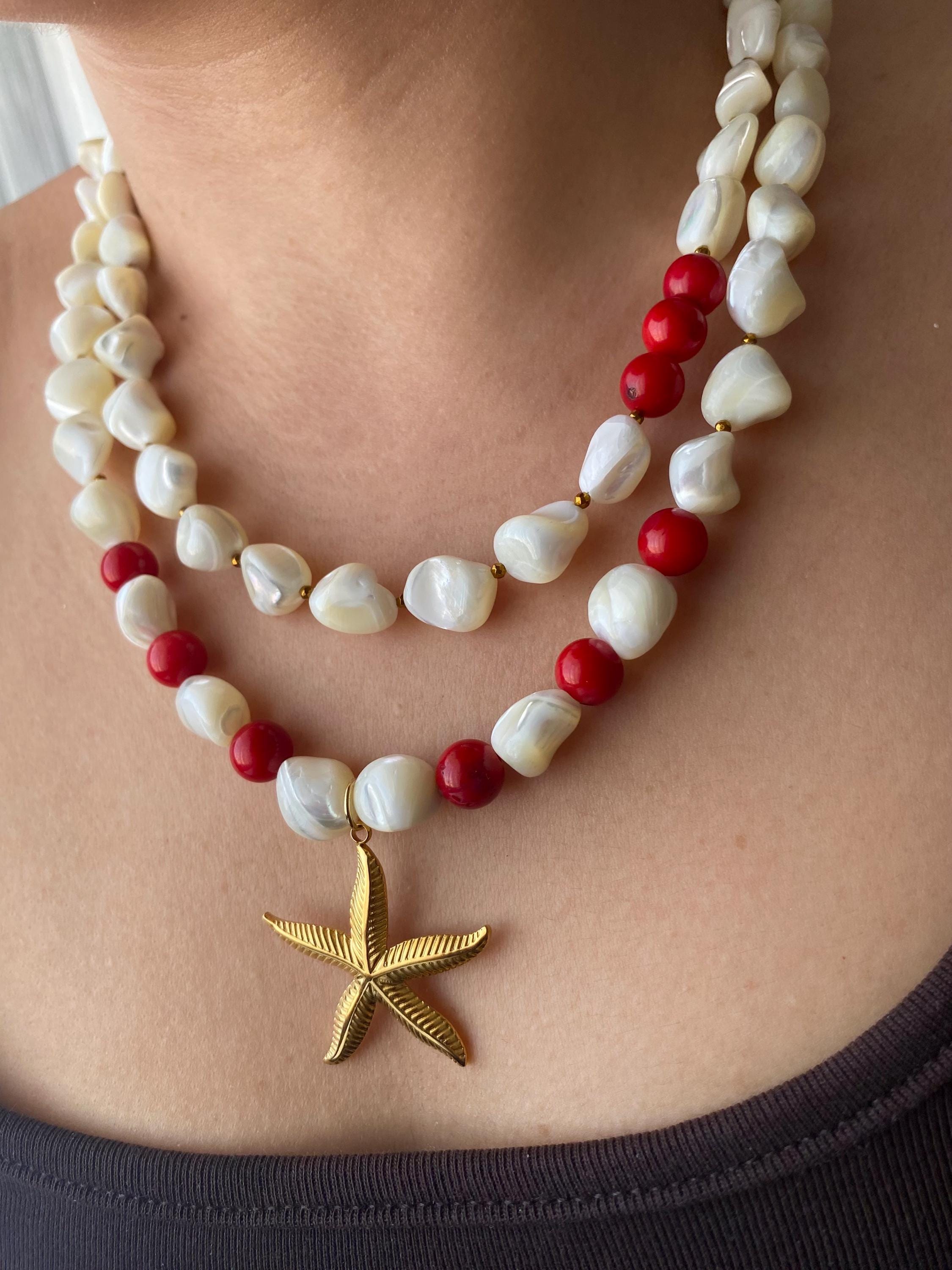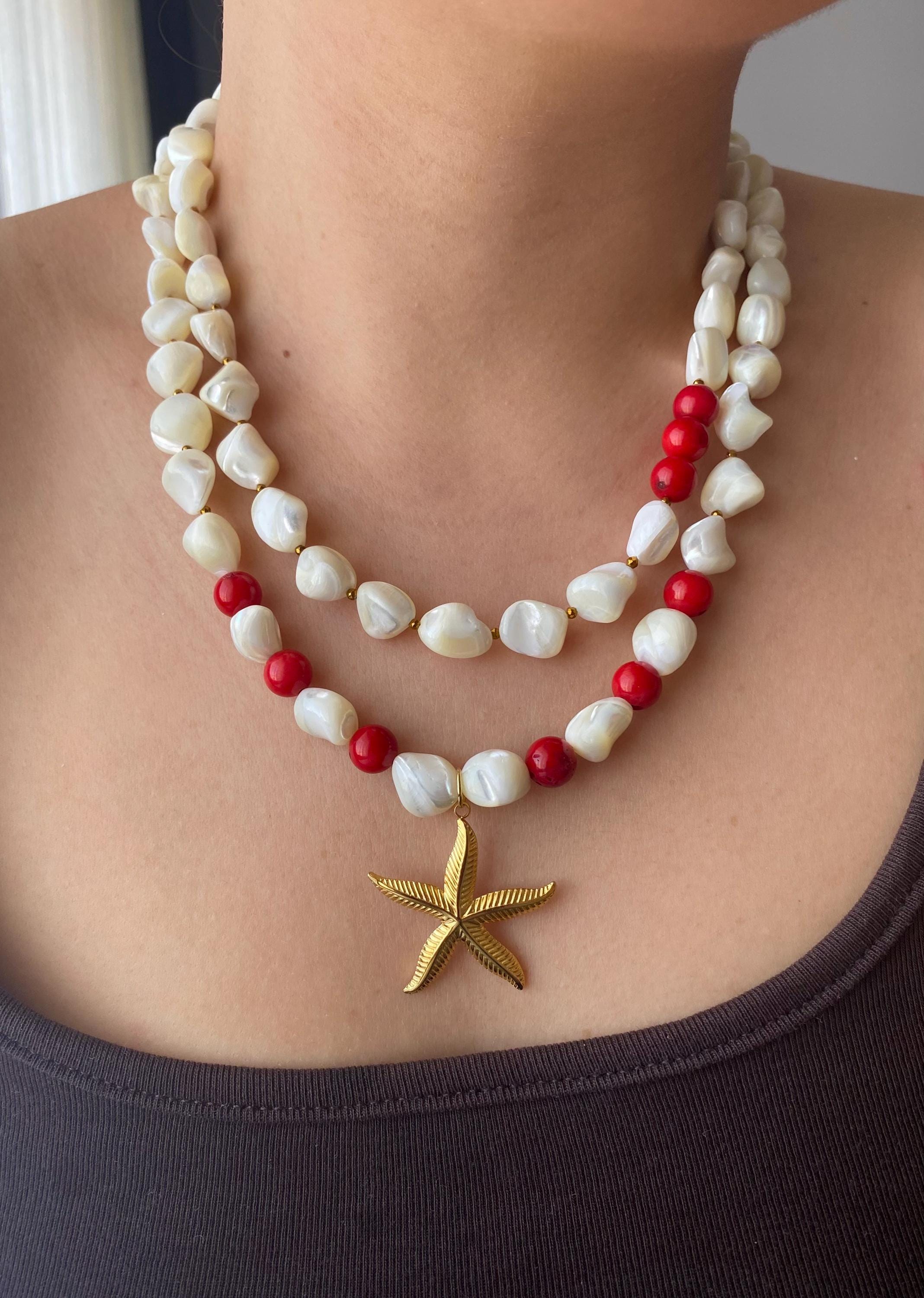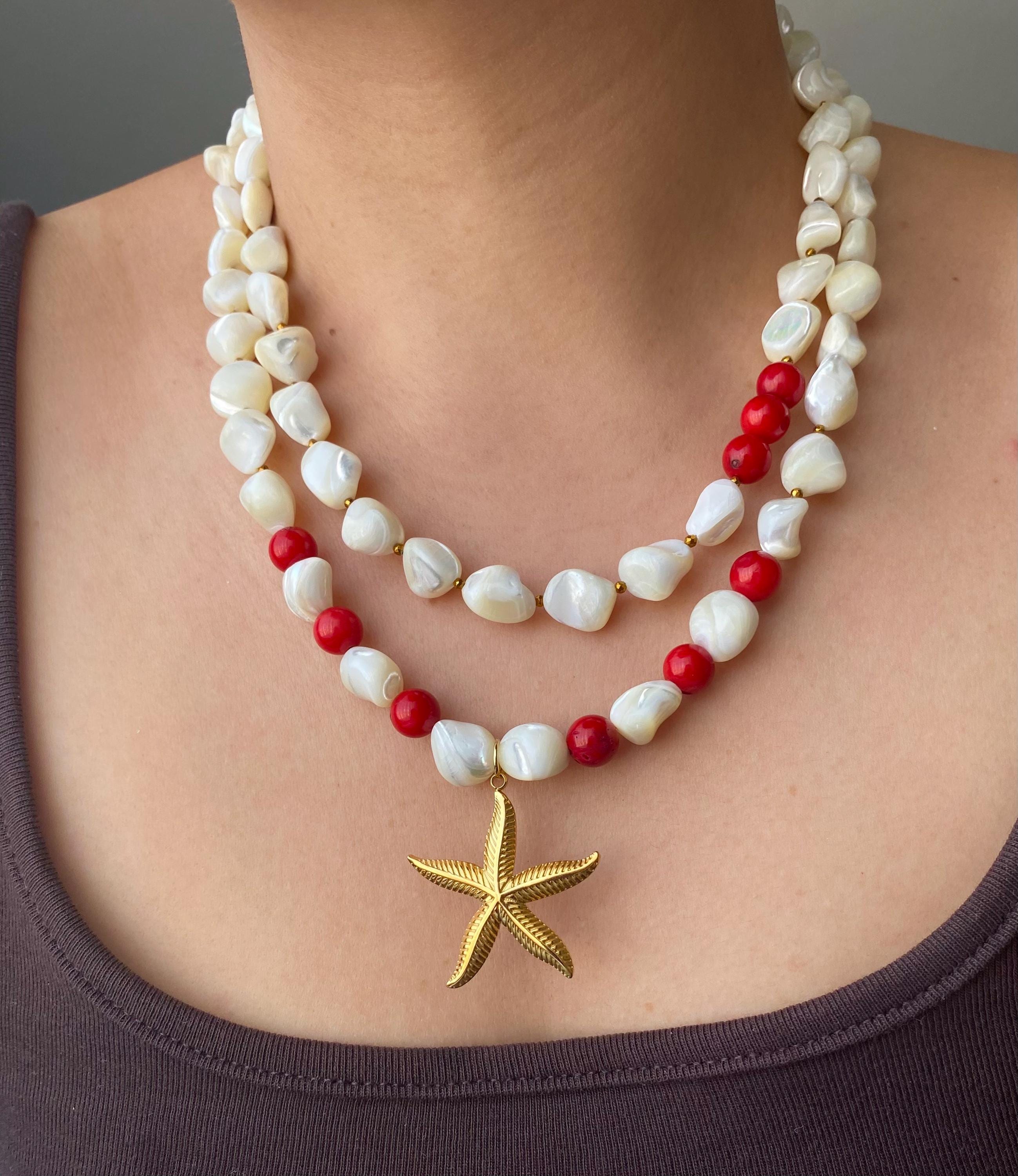 Vibrant red meets the soft elegance of natural mother of pearl in this striking gold-plated multistrand necklace. Featuring warm-toned red coral beads and irregular-cut mother of pearl in beige and cream hues, this design is finished with a charming starfish pendant for a touch of seaside inspiration.
