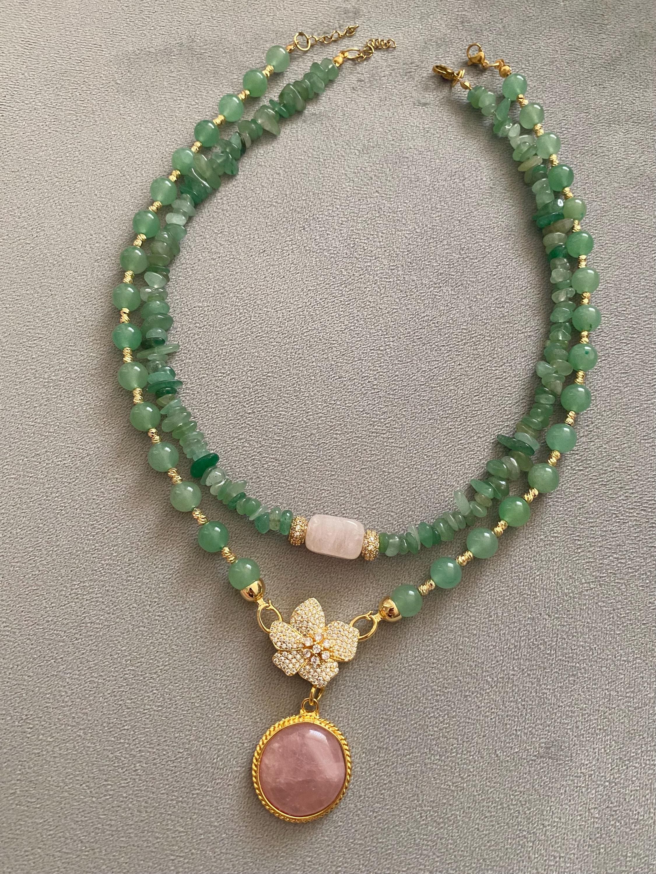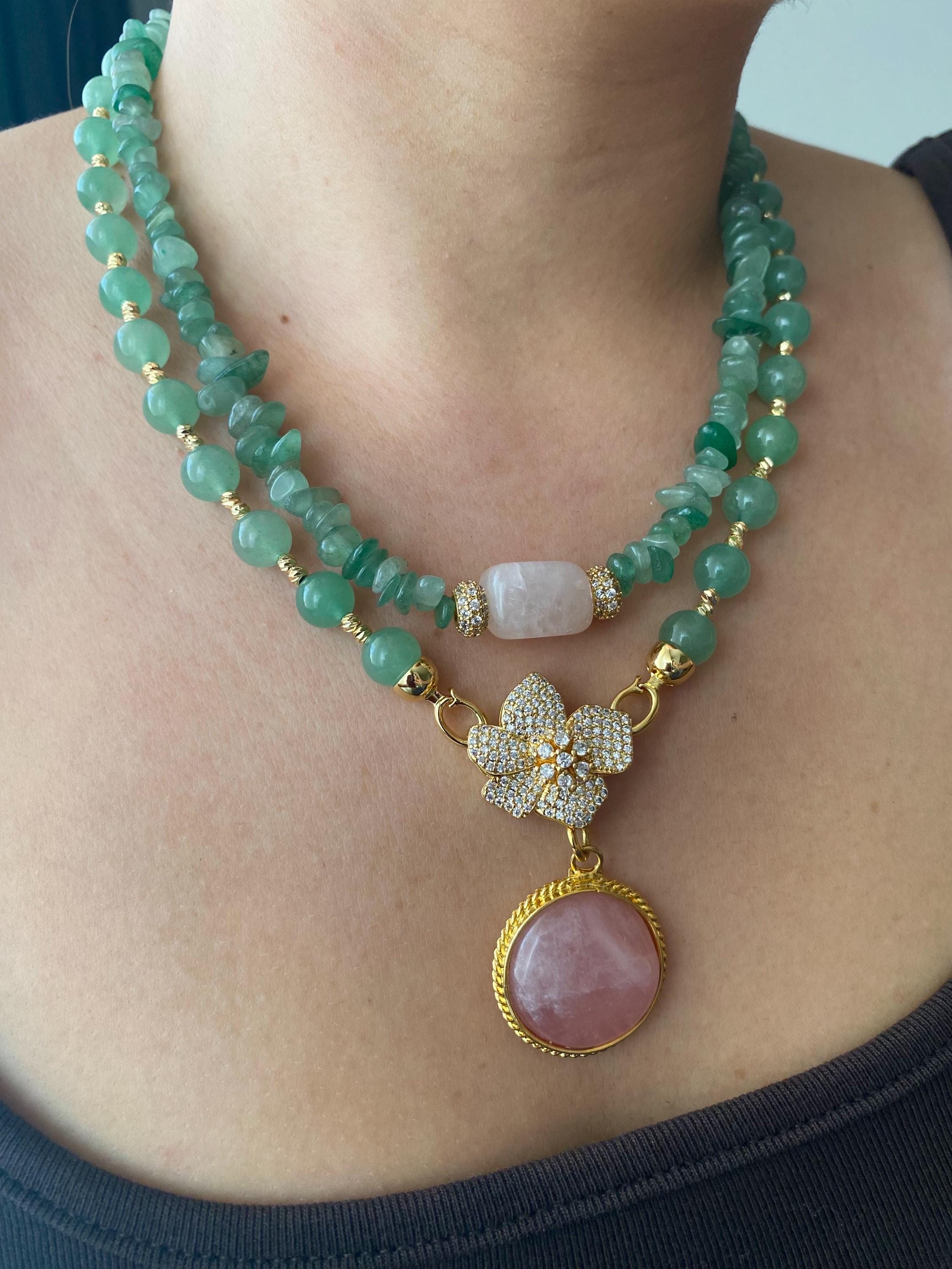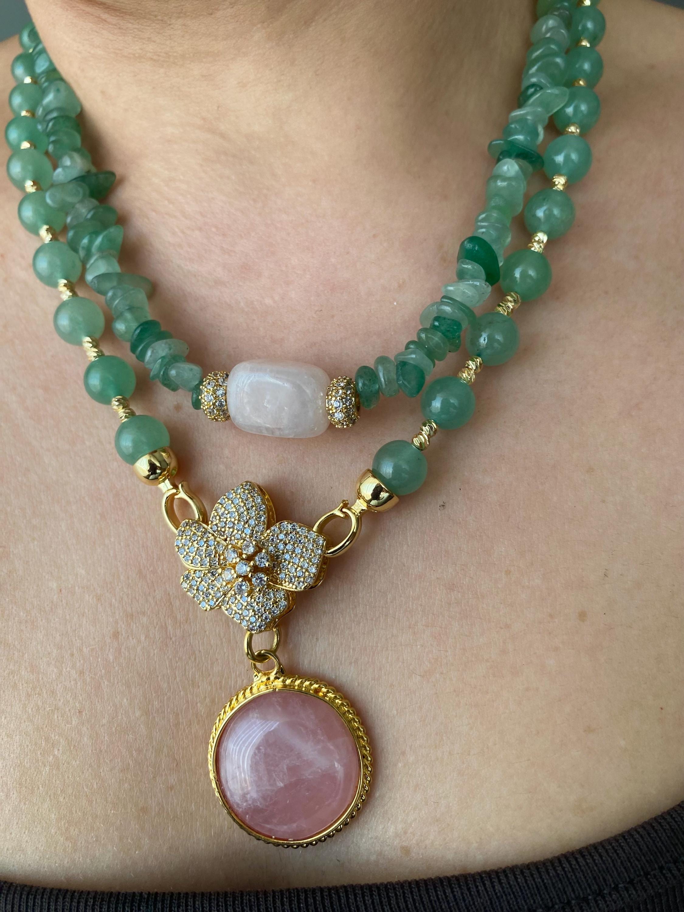aventurine necklace, rose quartz necklace, bohemian statement jewelry, layering necklace set, gemstone multistrand necklace, floral pendant necklace, gold plated necklace, romantic boho jewelry, green and pink jewelry, nature inspired necklace