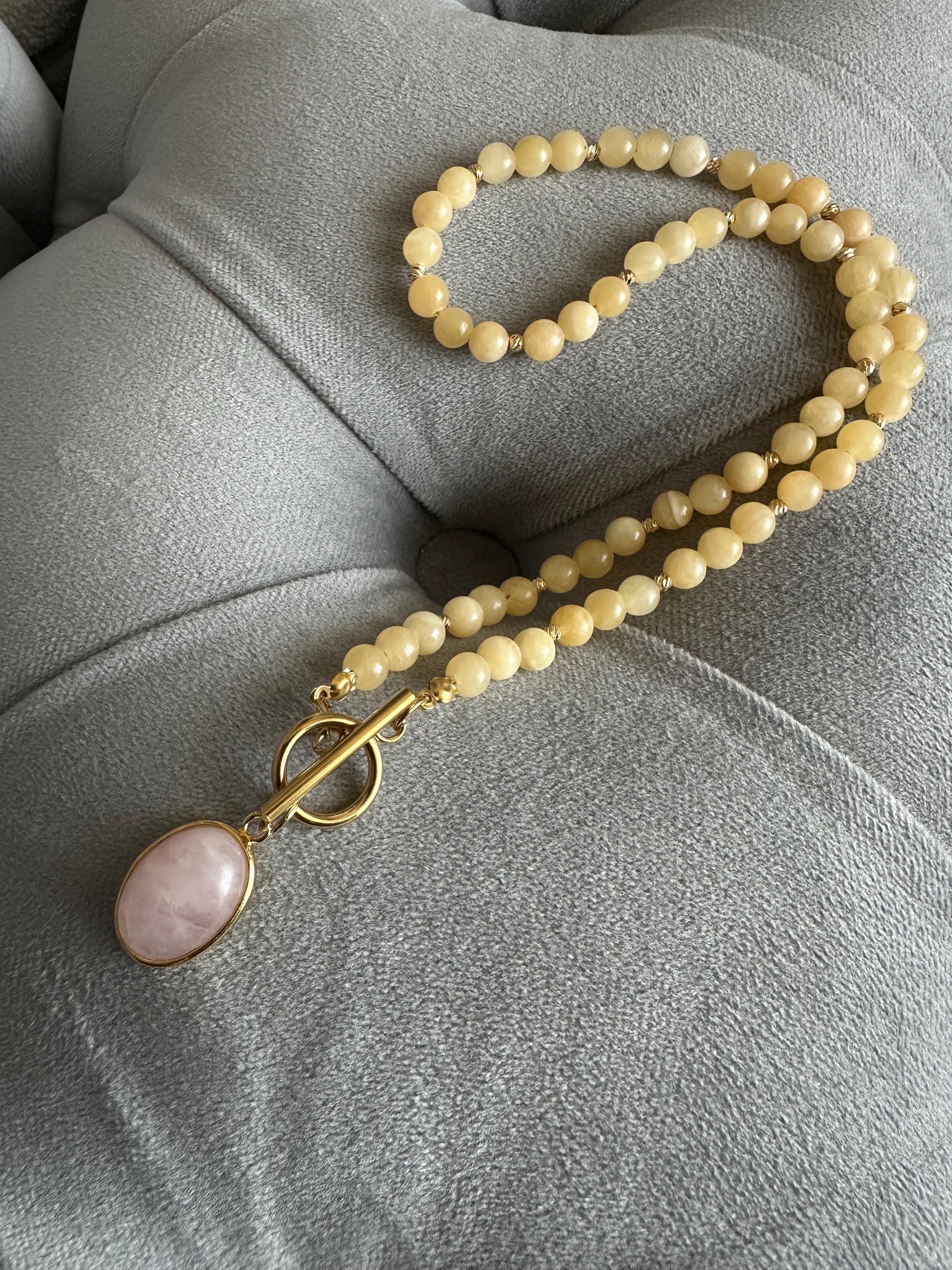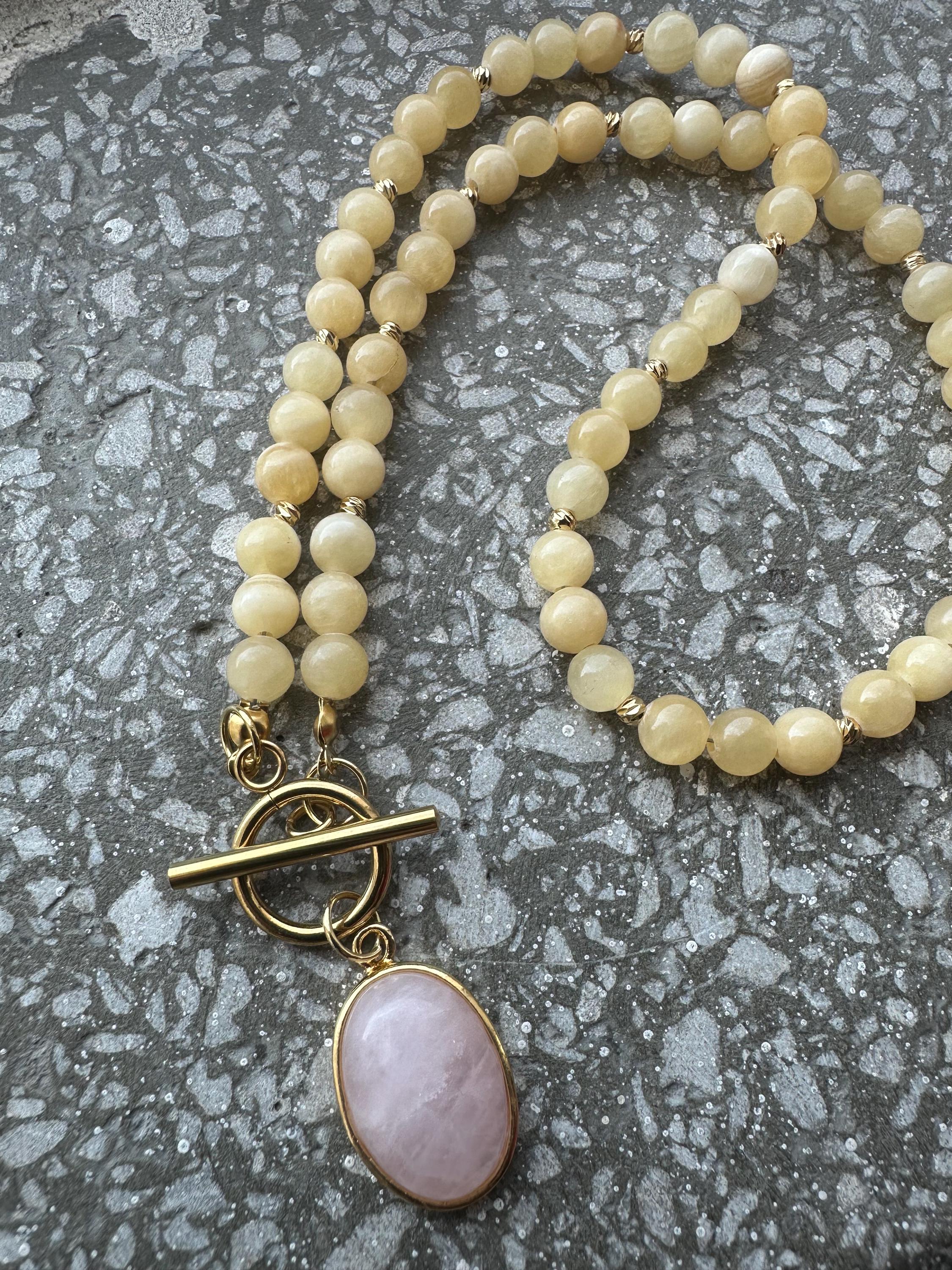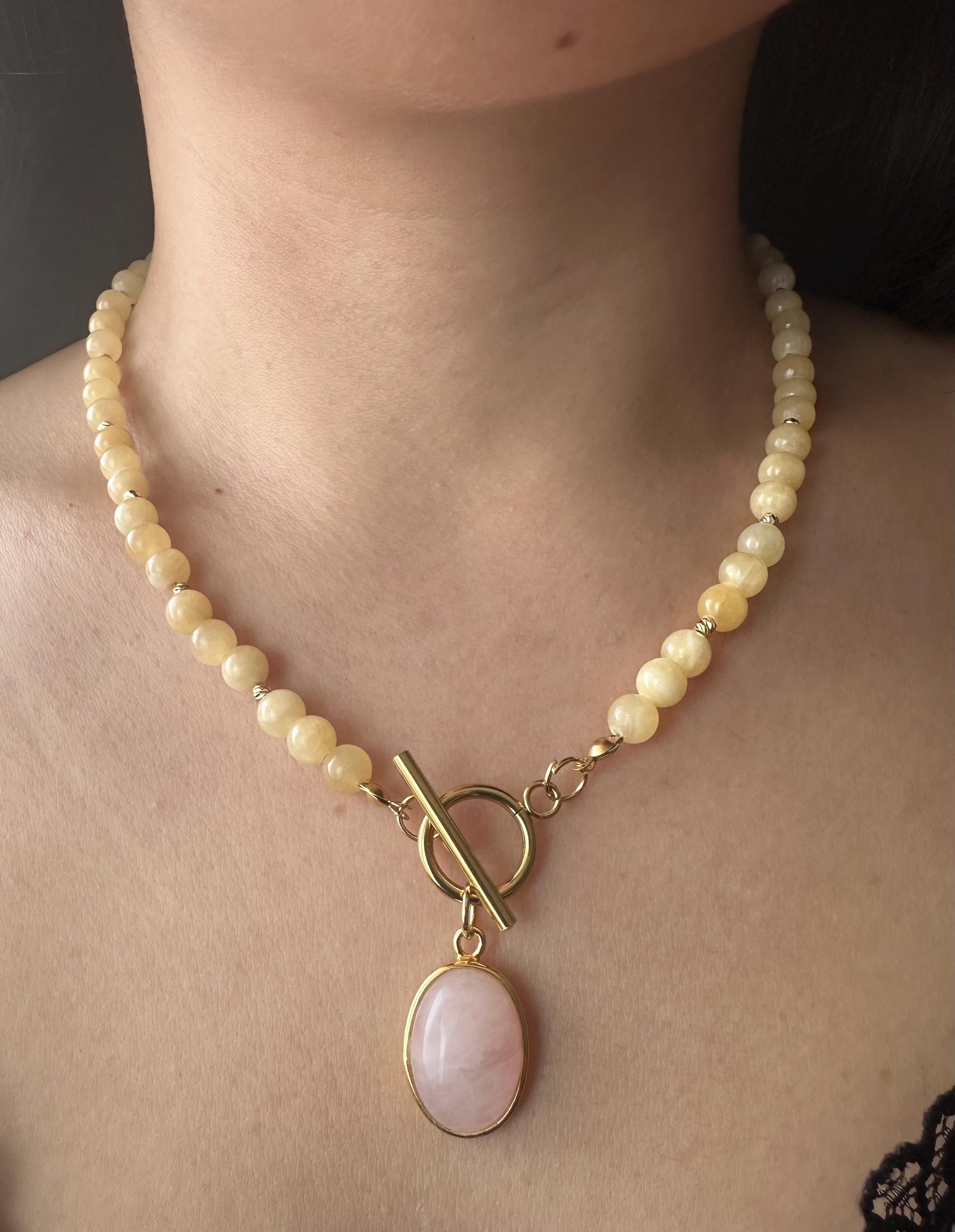 Bring a touch of sunshine to your style with this gold-plated minimalist necklace featuring smooth yellow calcite stones. At the center, a chic toggle clasp holds a delicate pink quartz pendant, adding a soft feminine contrast to the warm yellow tones.