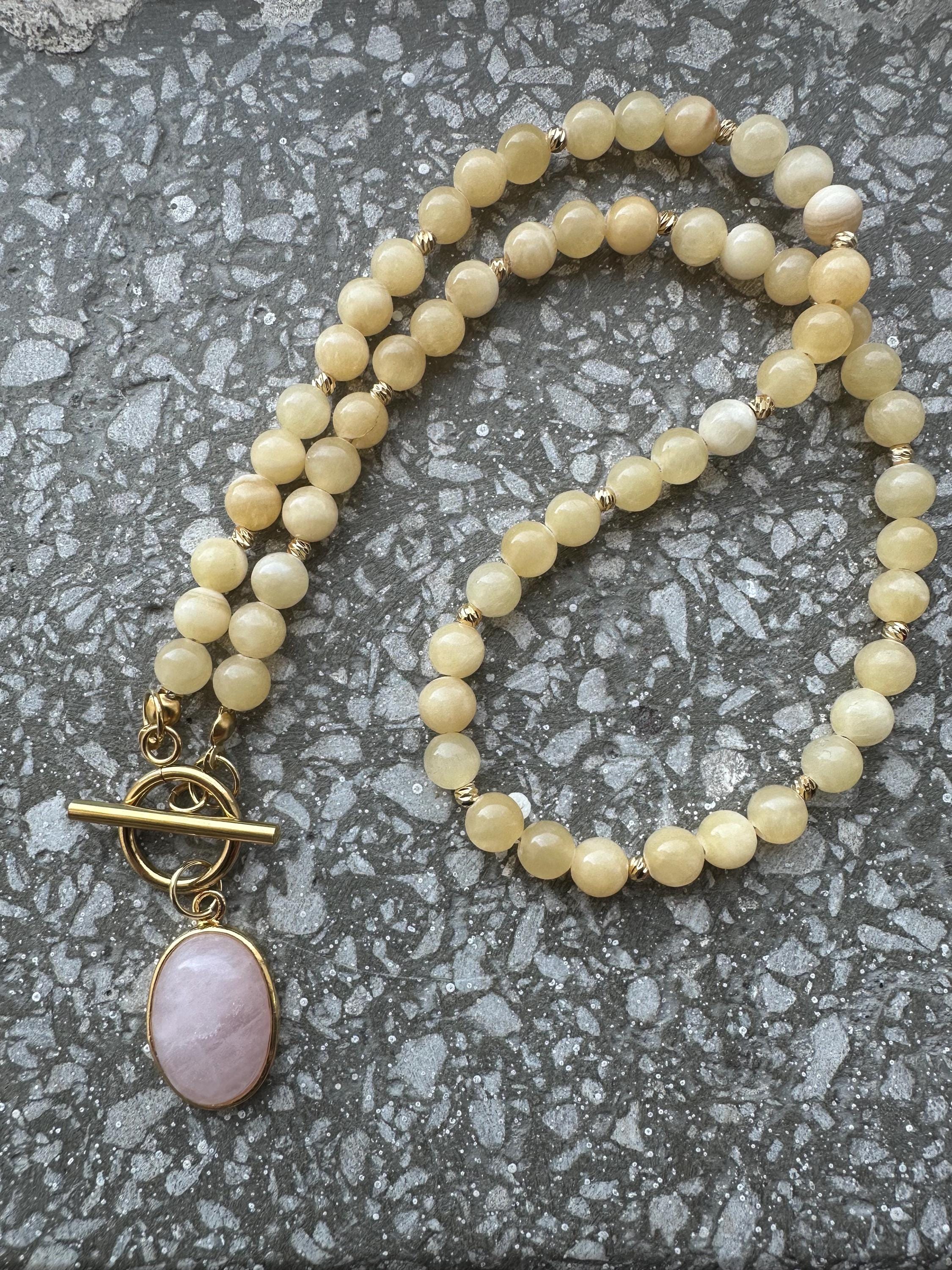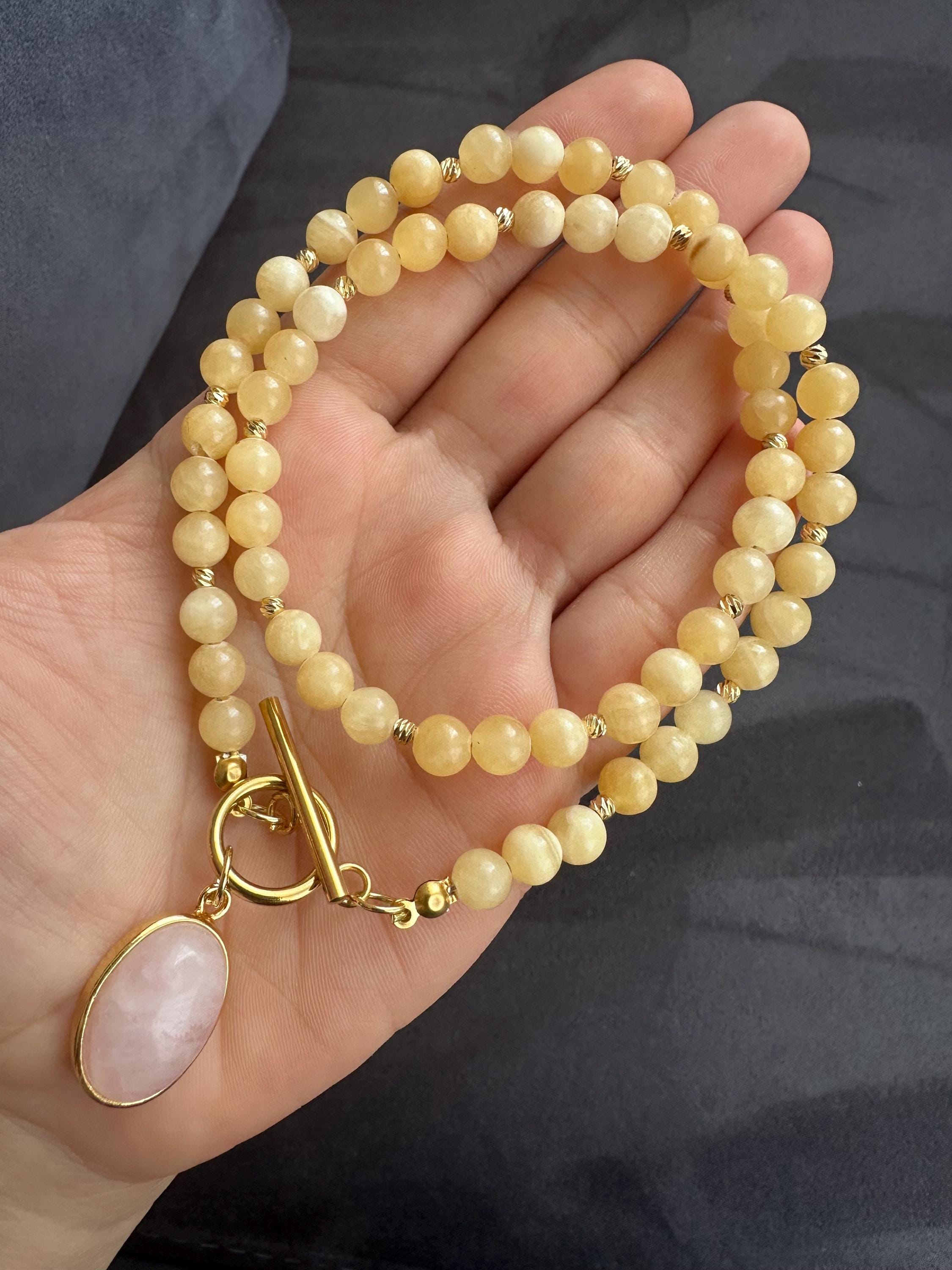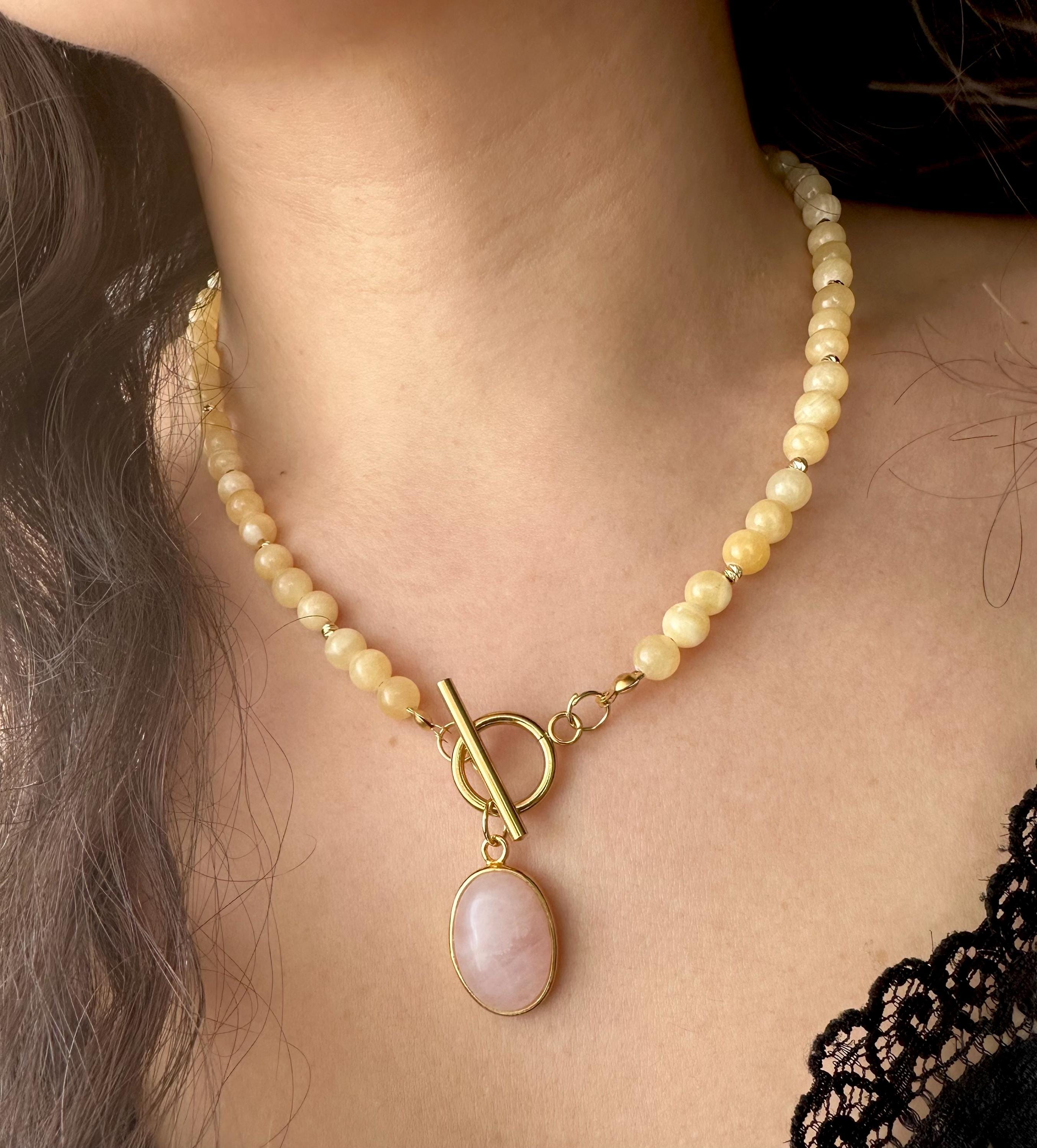 Bring a touch of sunshine to your style with this gold-plated minimalist necklace featuring smooth yellow calcite stones. At the center, a chic toggle clasp holds a delicate pink quartz pendant, adding a soft feminine contrast to the warm yellow tones.