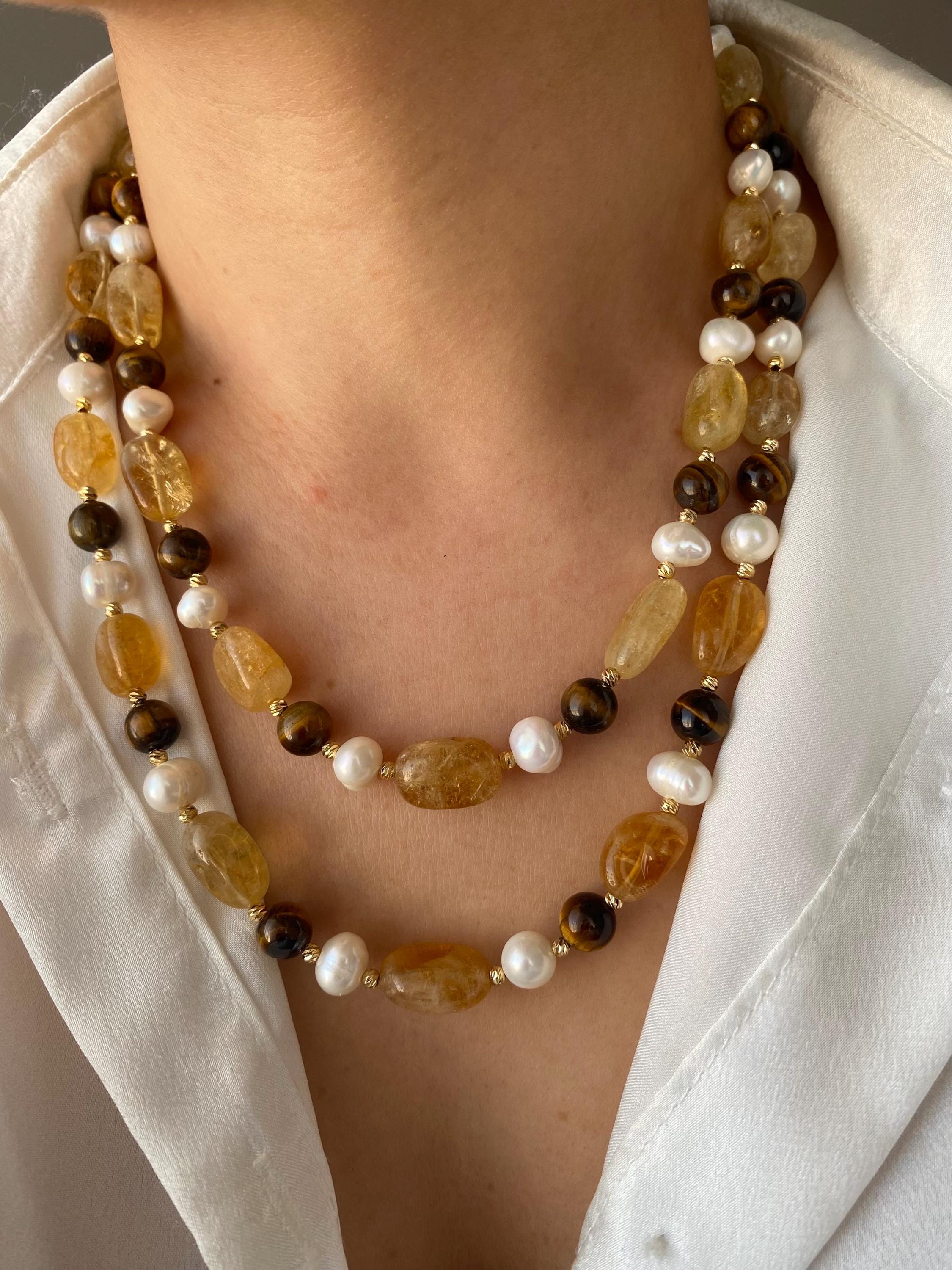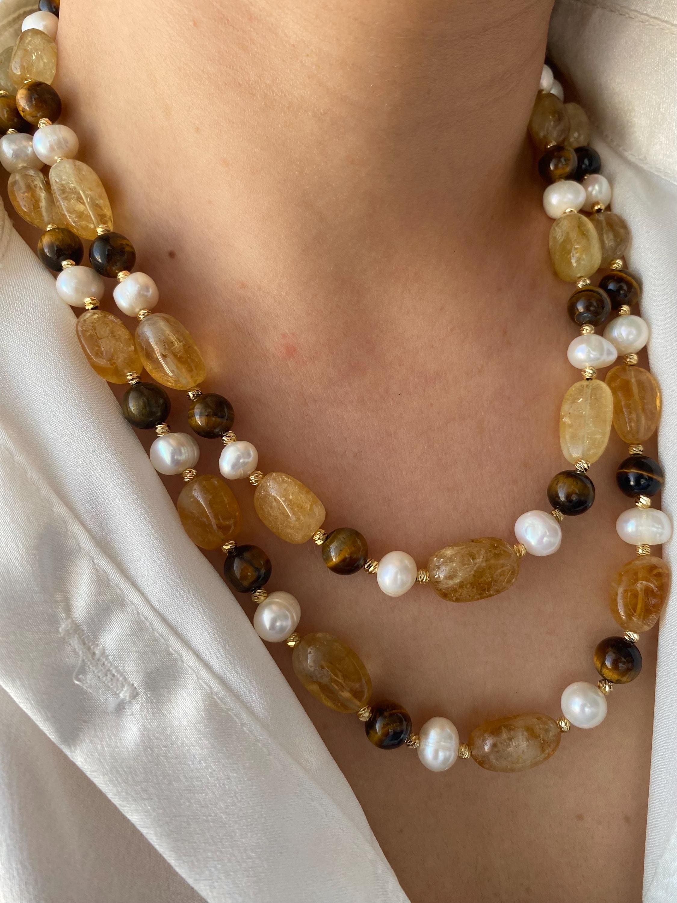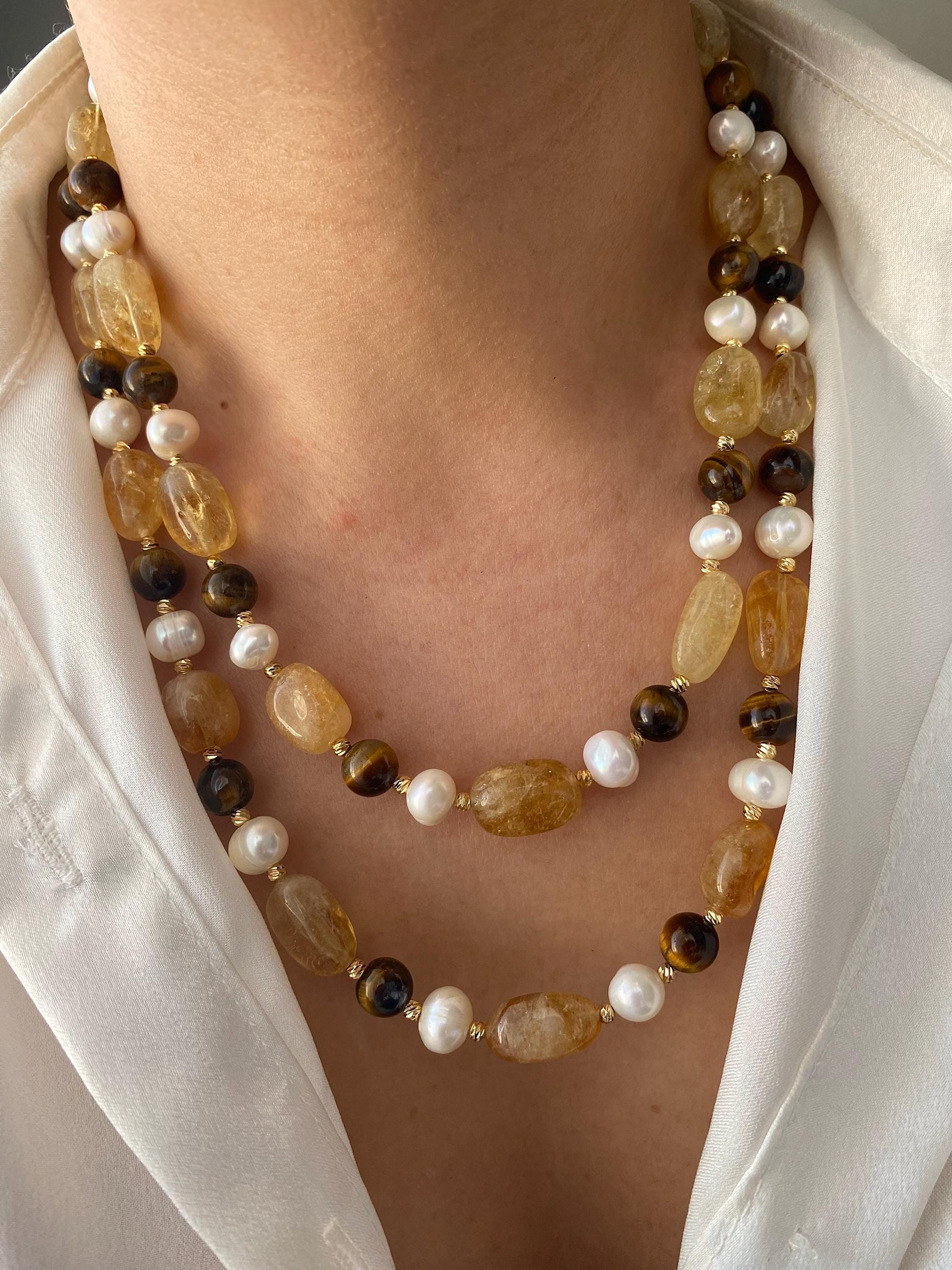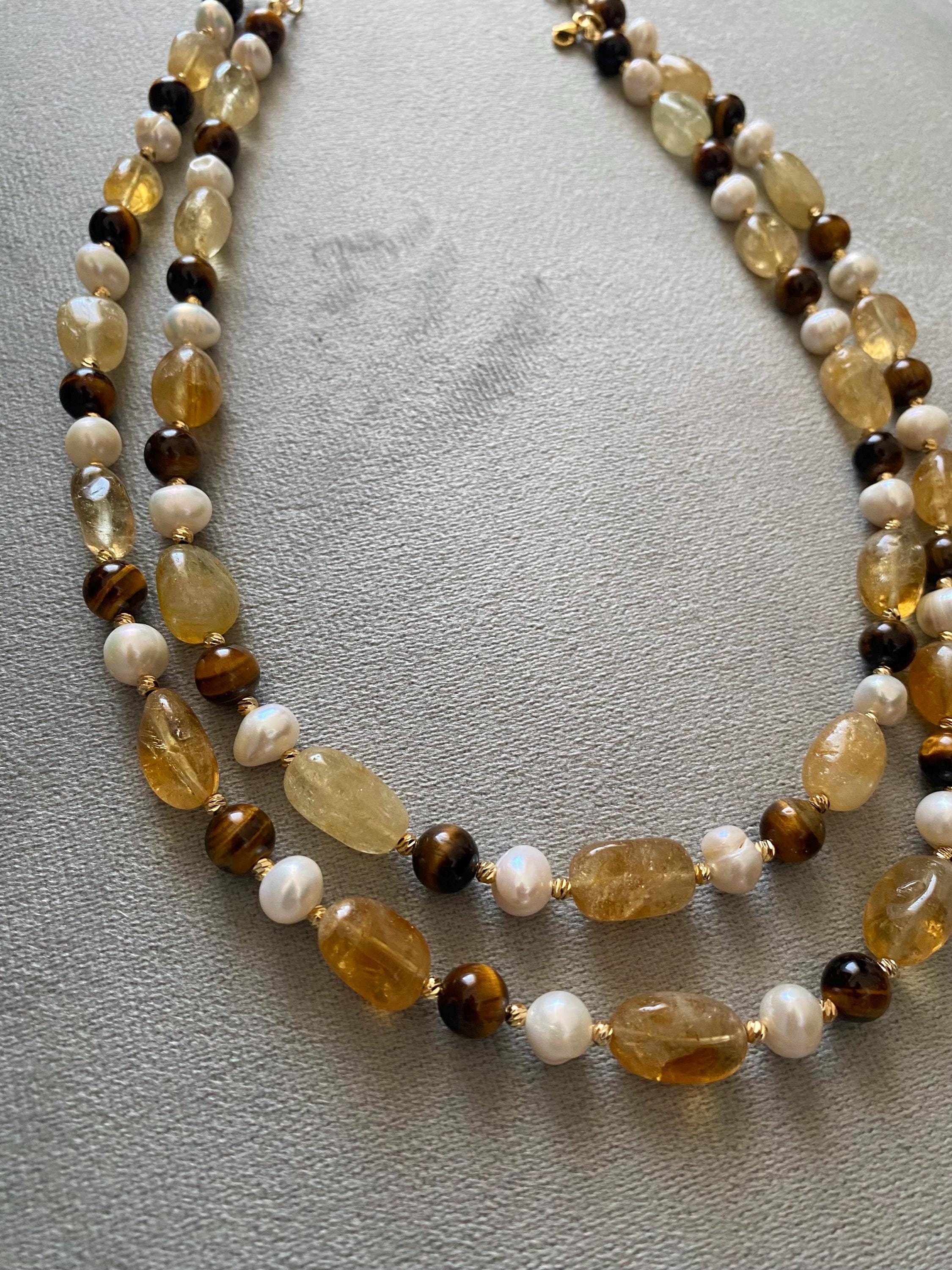 A bold yet elegant statement piece bringing together the warm golden glow of citrine, the earthy strength of tiger’s eye, and the timeless beauty of freshwater pearls. This gold-plated multistrand necklace embodies bohemian elegance while staying versatile for both everyday wear and special occasions.