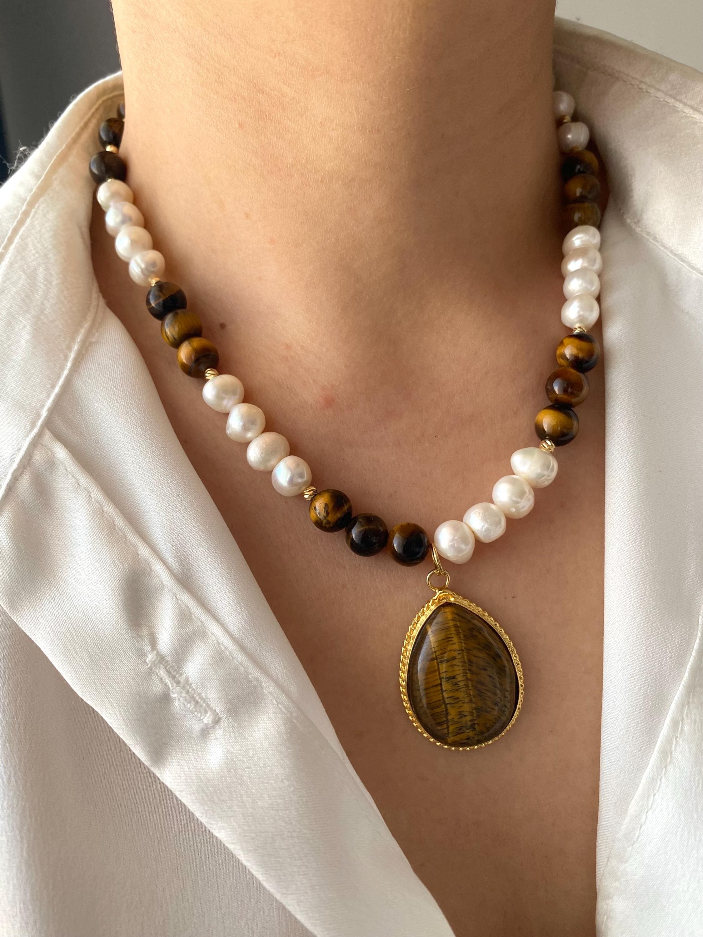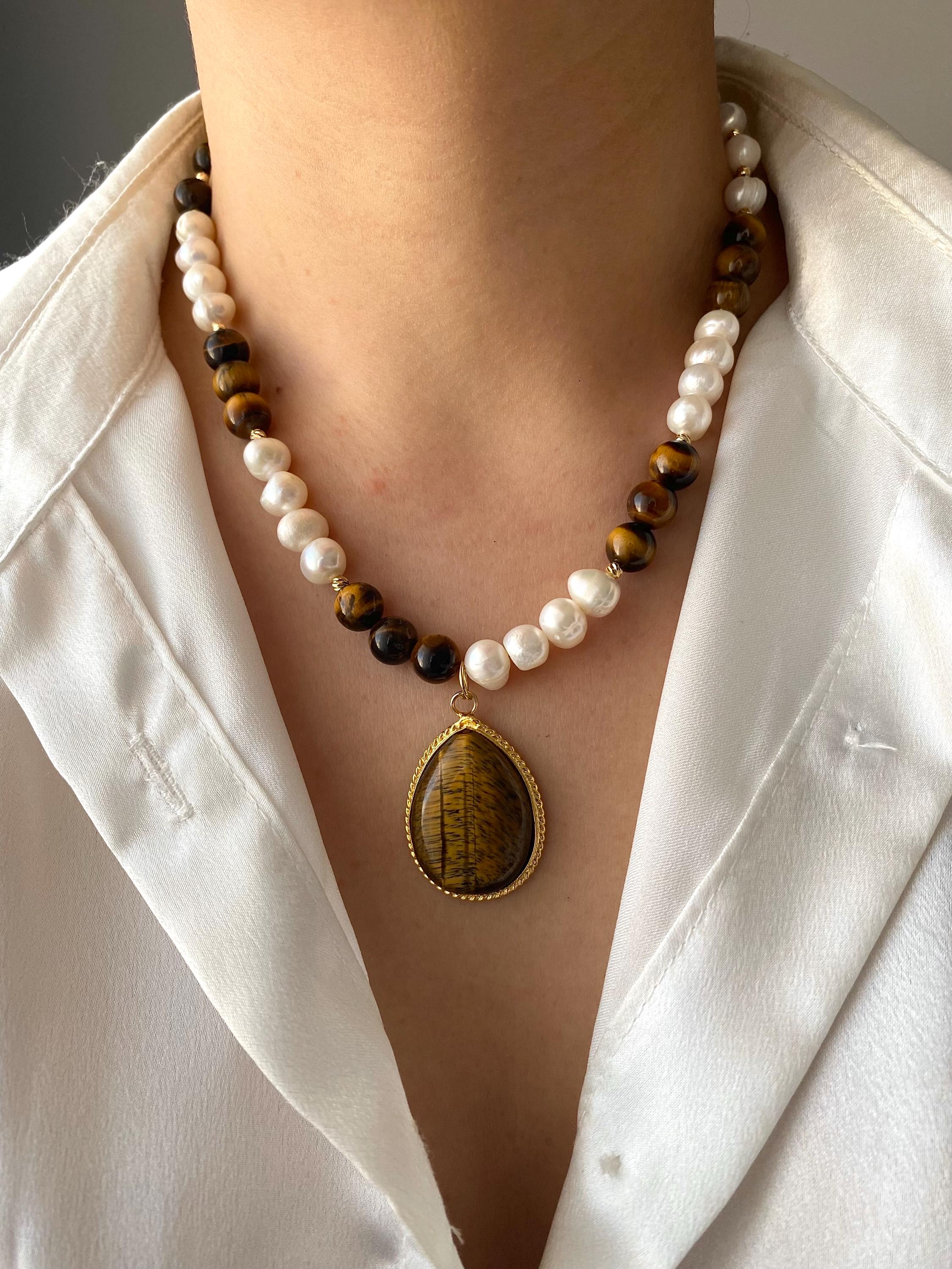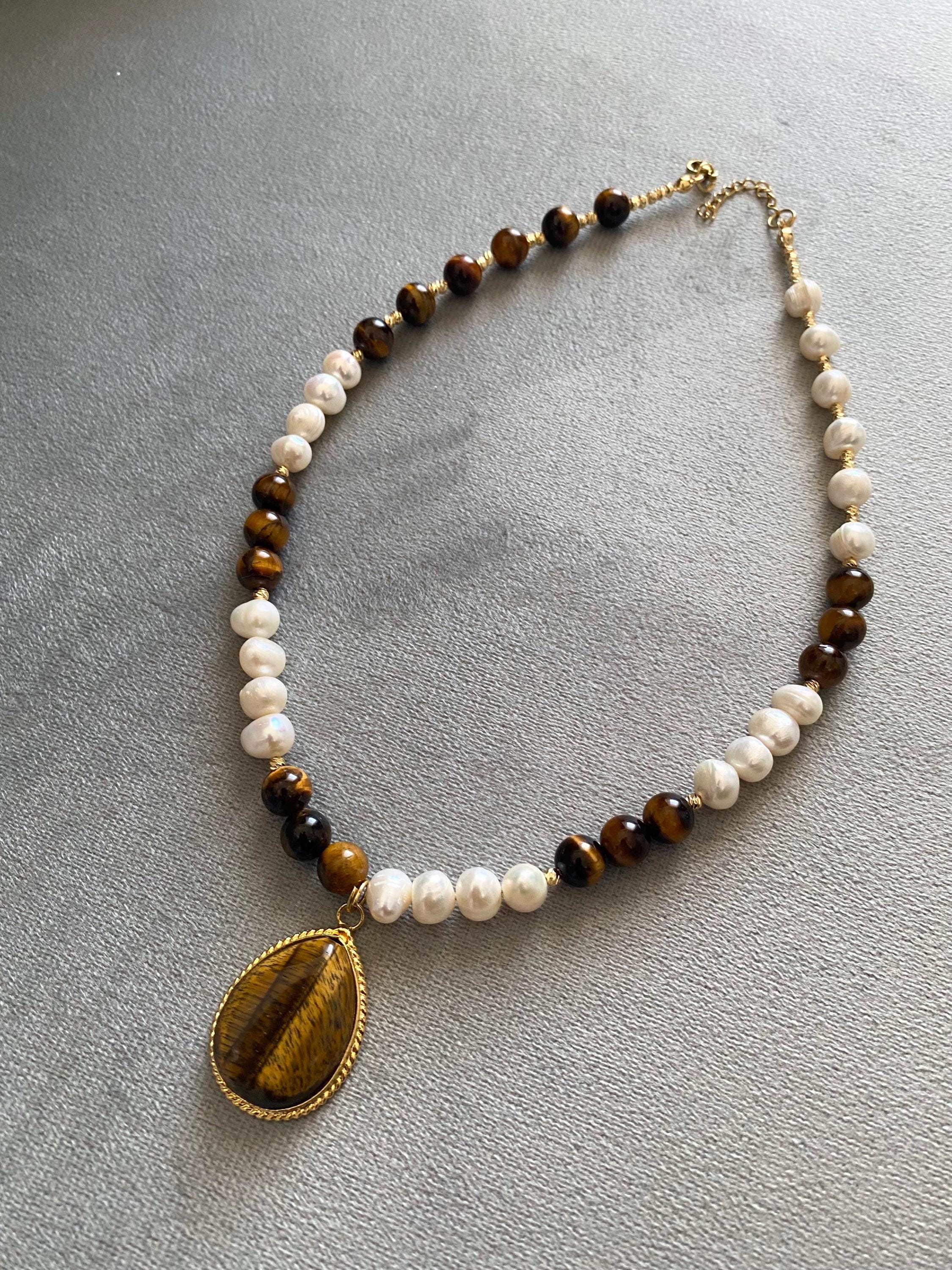 • 💎 Stones: Freshwater pearls, tiger’s eye (with tiger’s eye pendant drop)