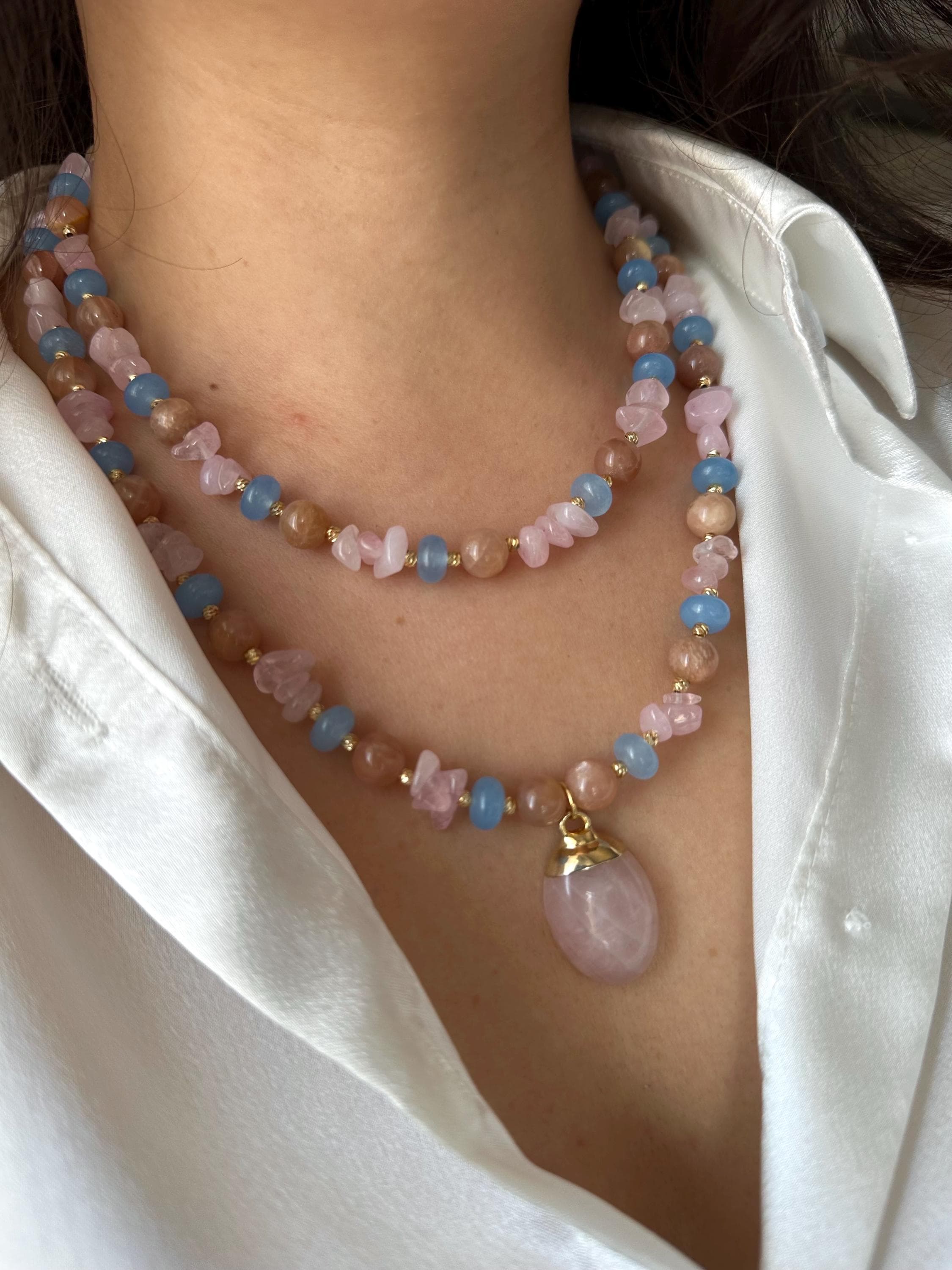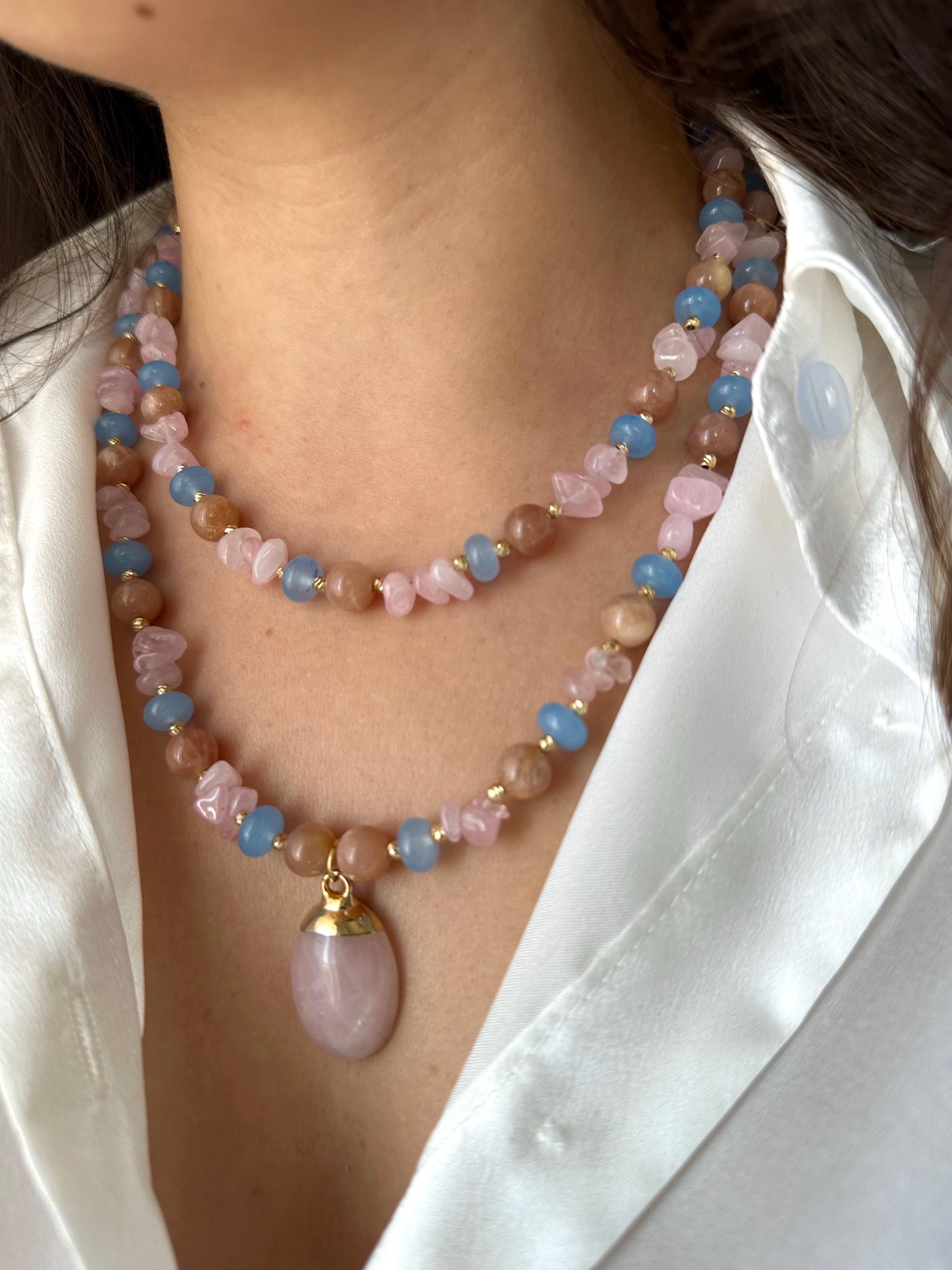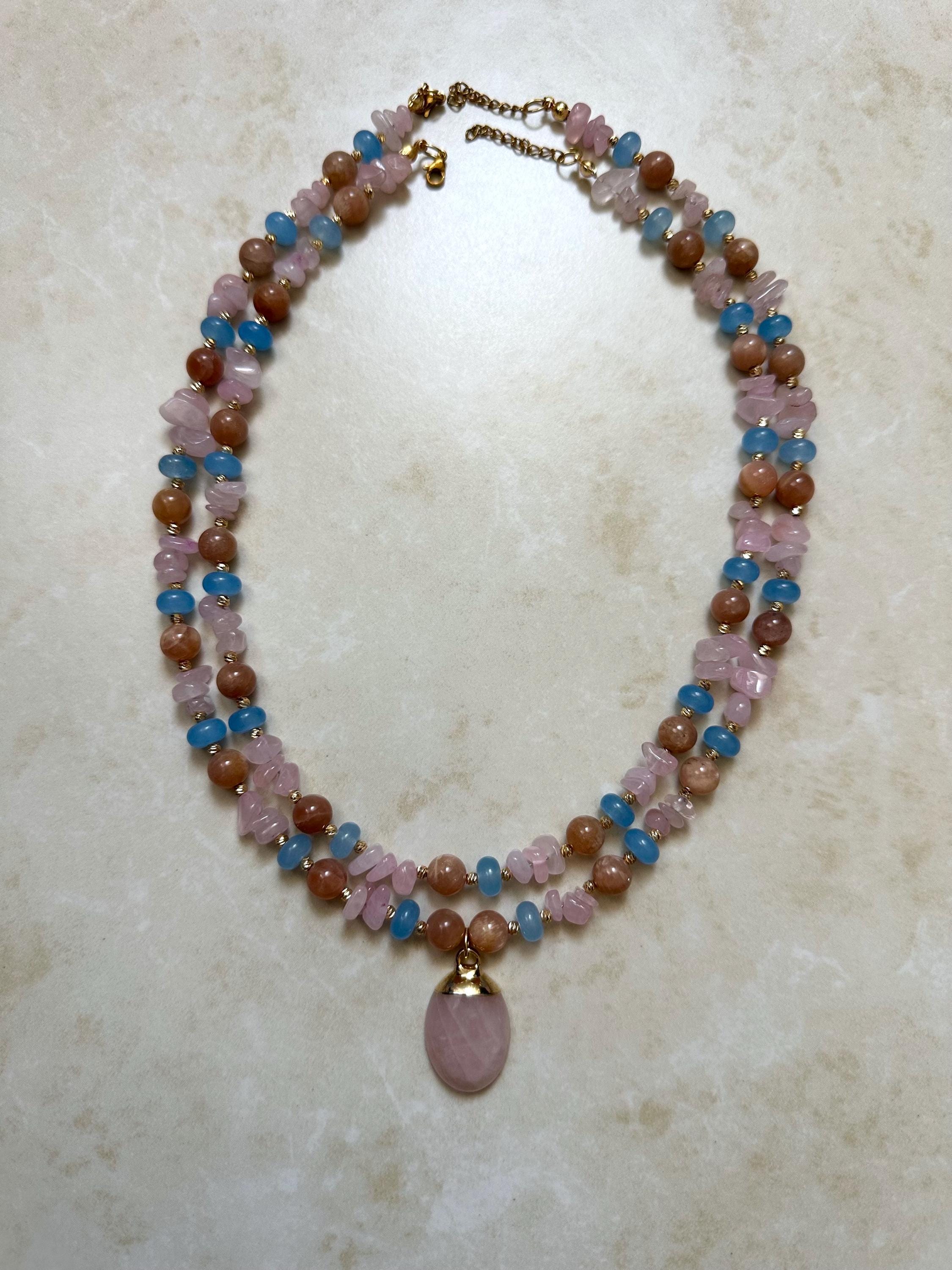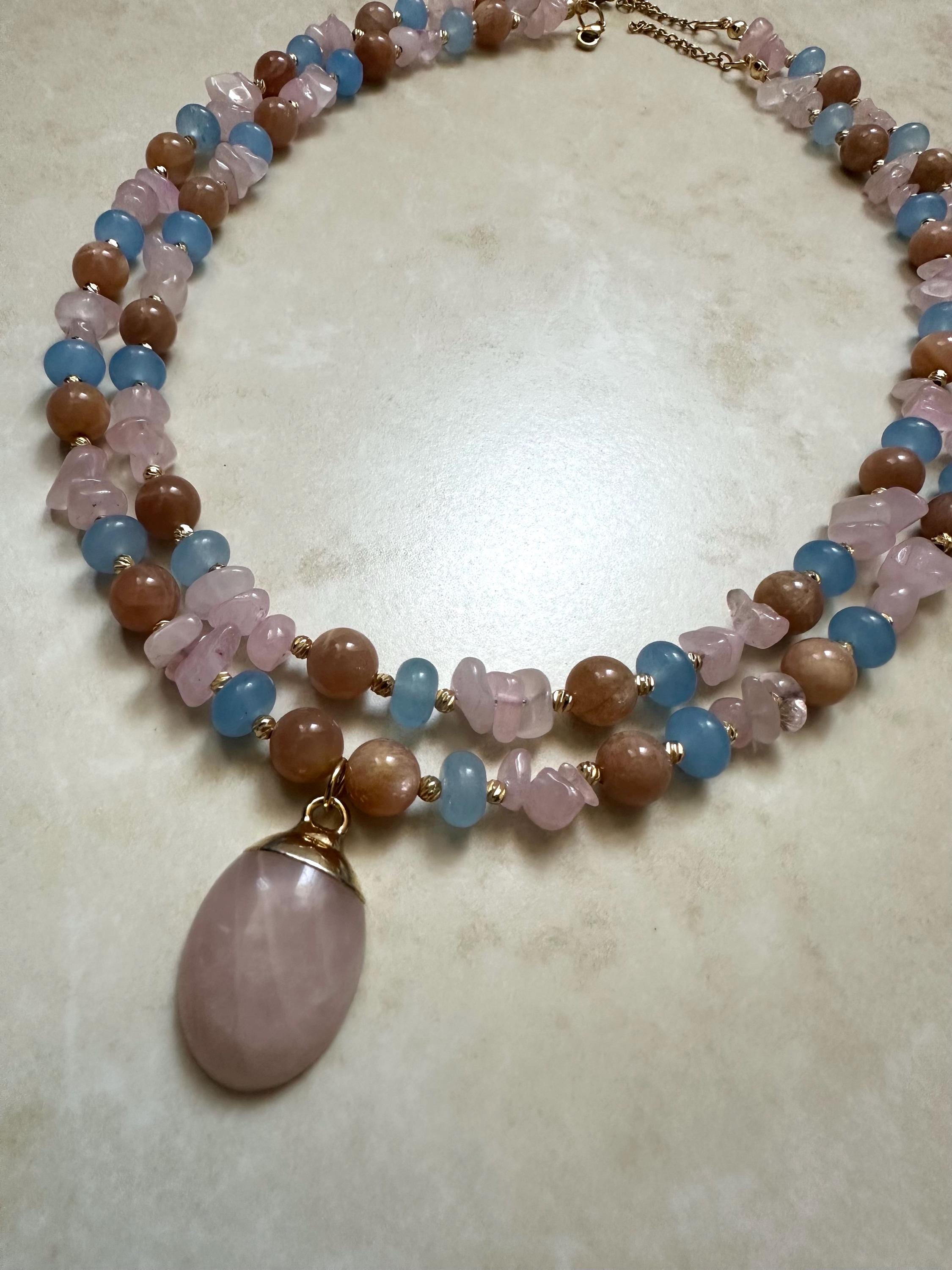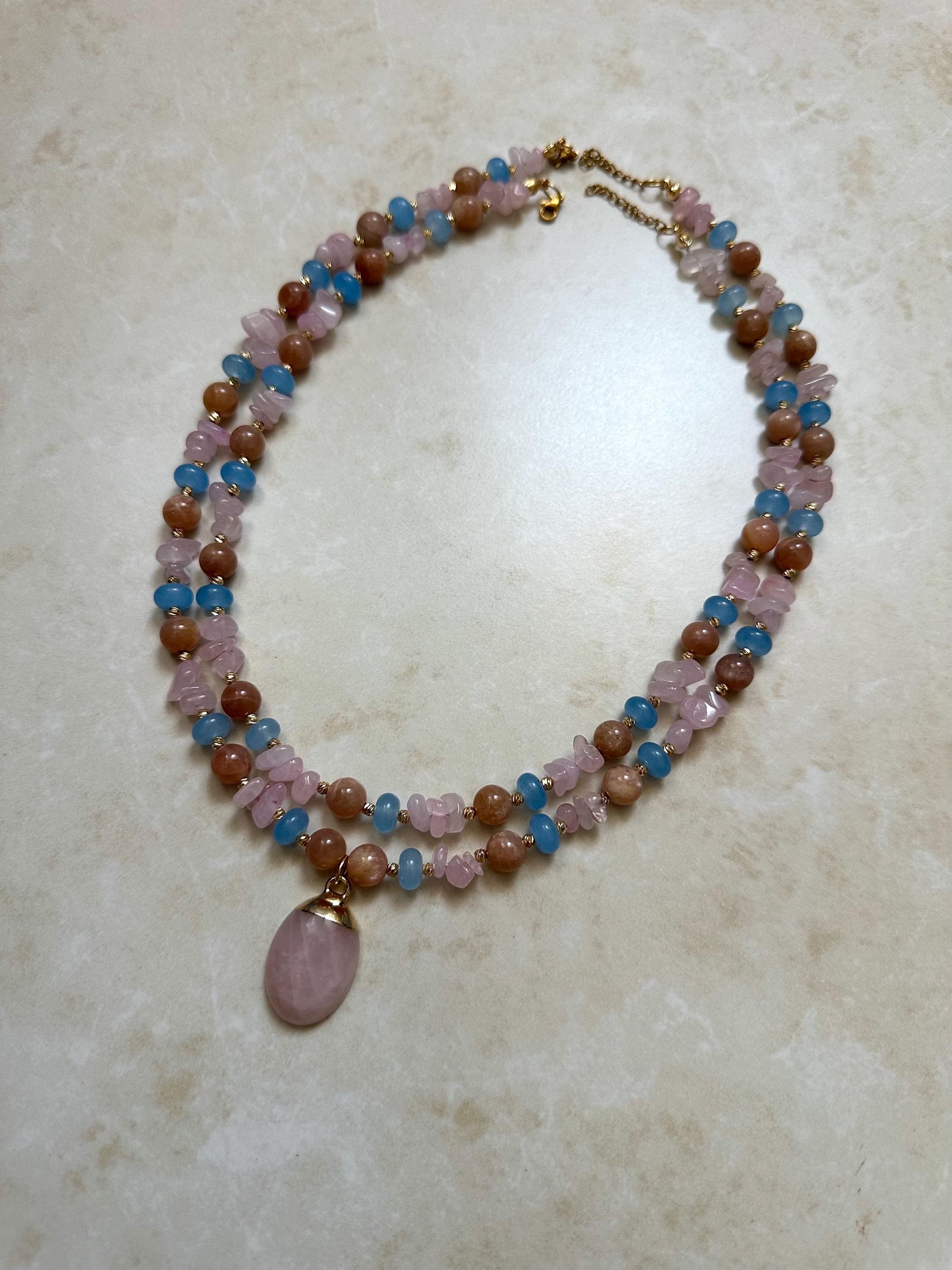 π Sunstone, Rose Quartz & Blue Agate Multistrand Necklace β Gold Plated π