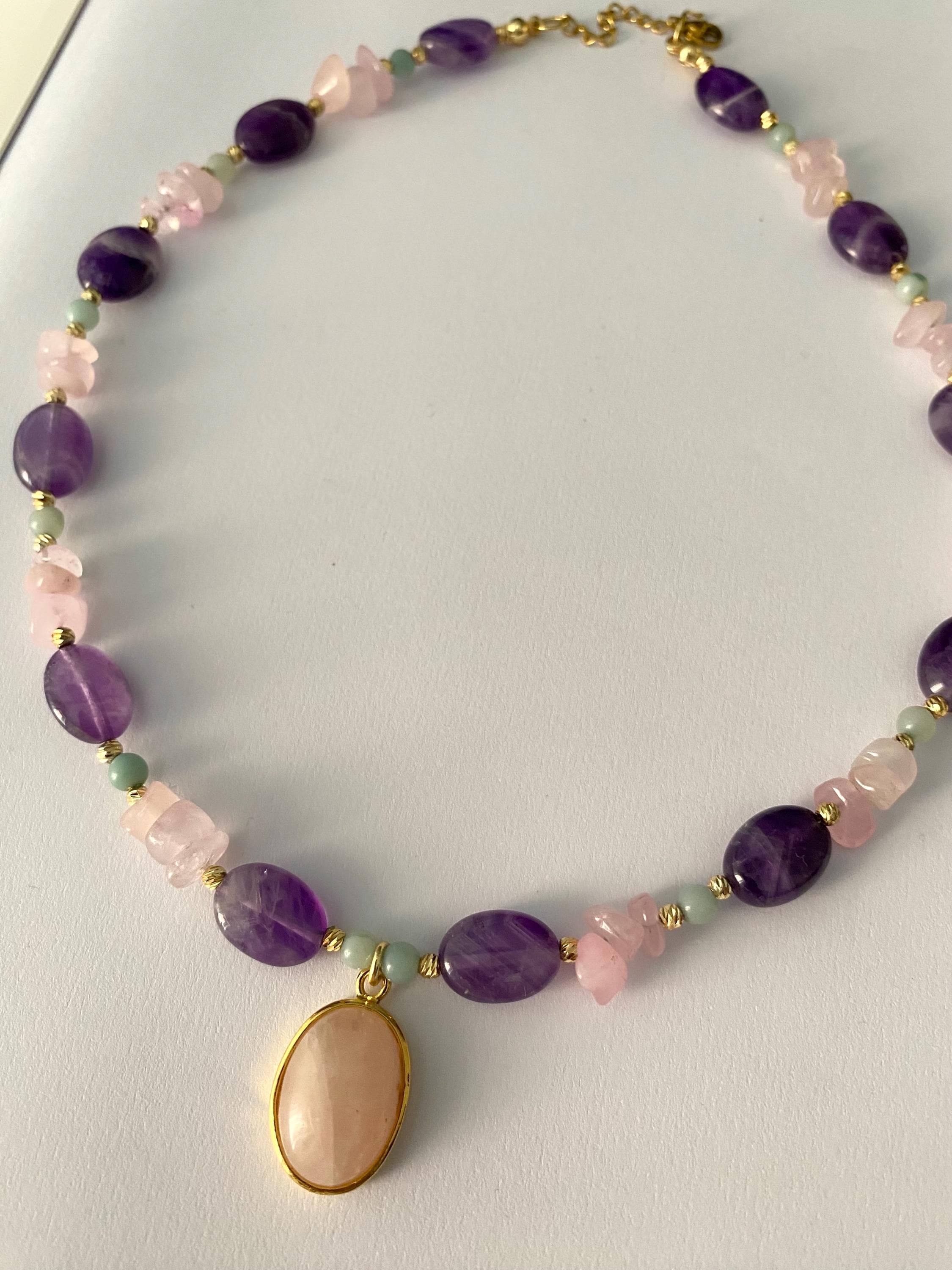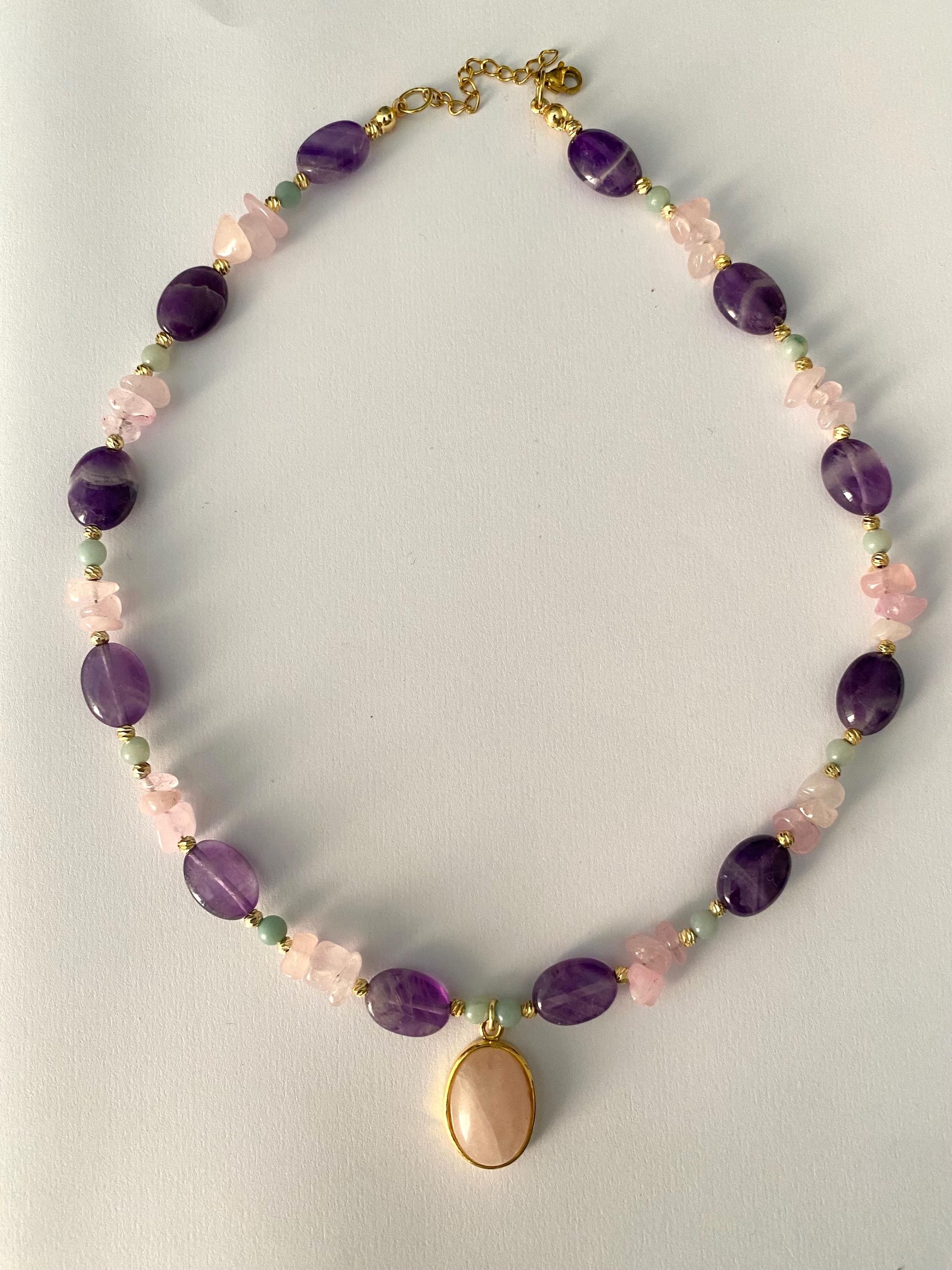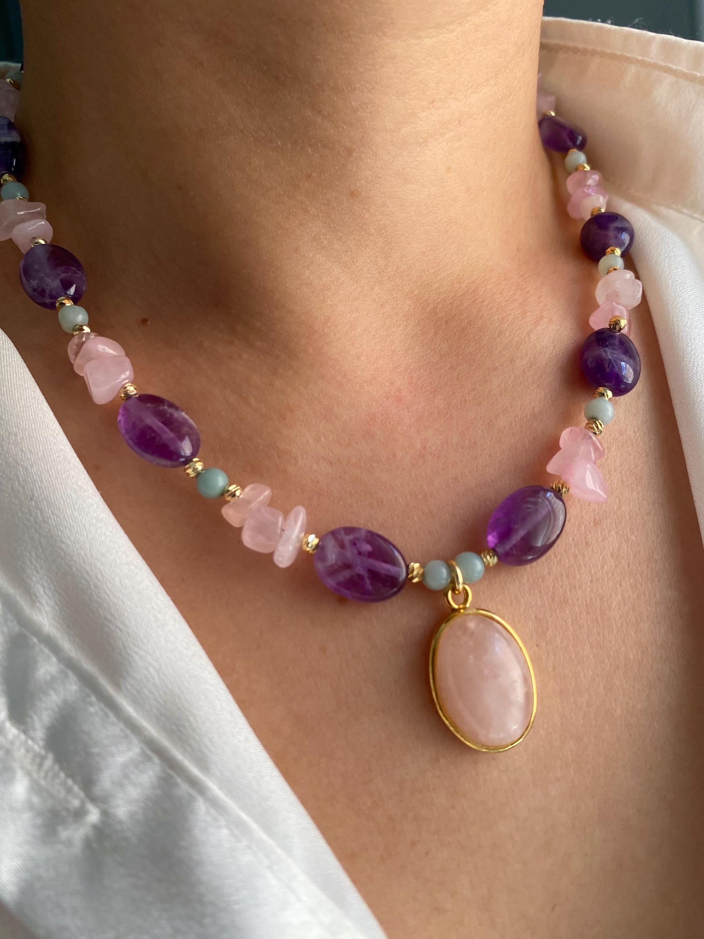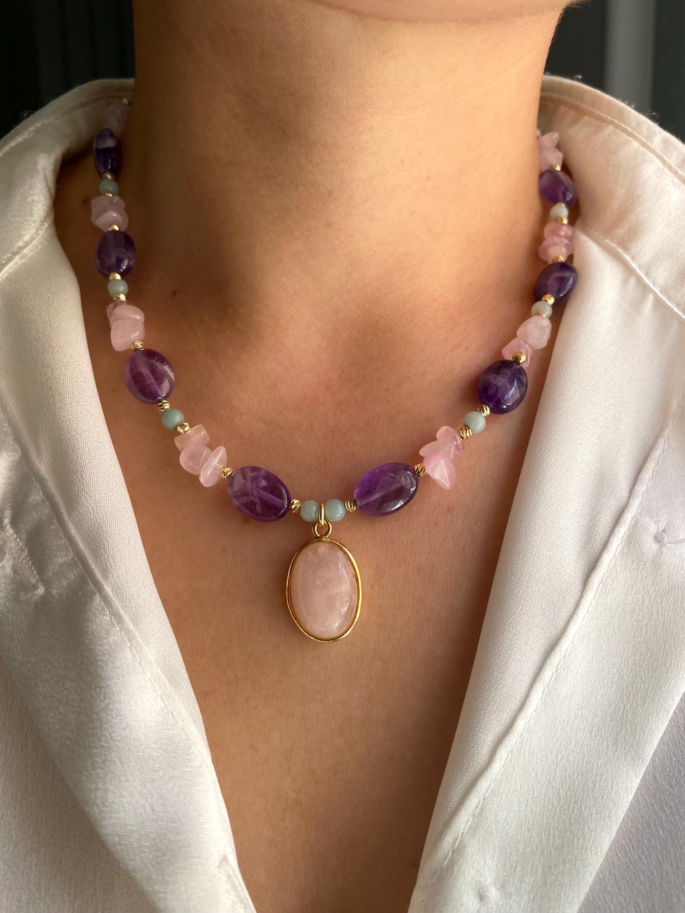 A piece that balances elegance and bohemian charm. This necklace combines the soothing energy of amethyst, rose quartz, and amazonite, with a delicate rose quartz pendant at the center for a soft, feminine touch.