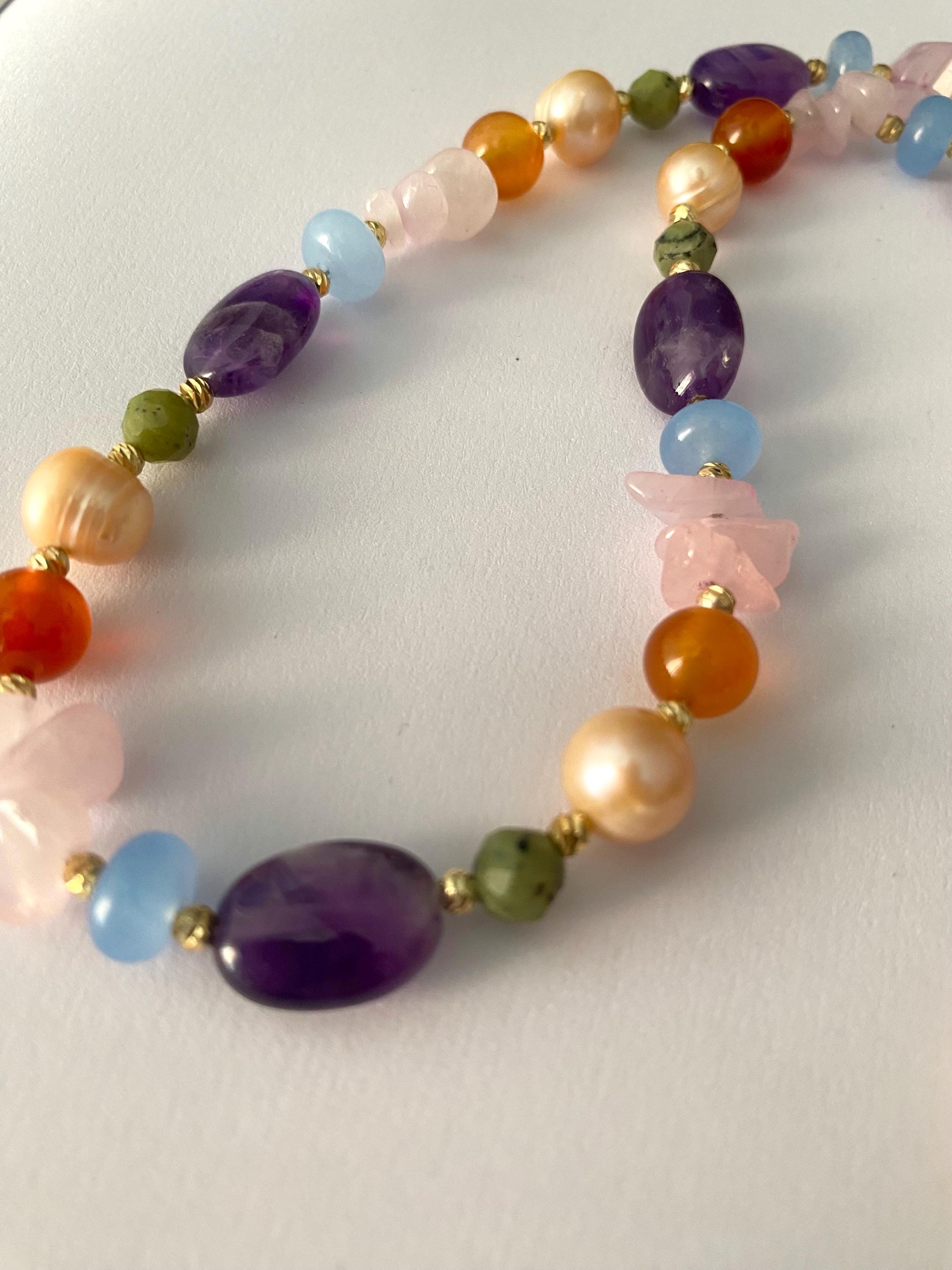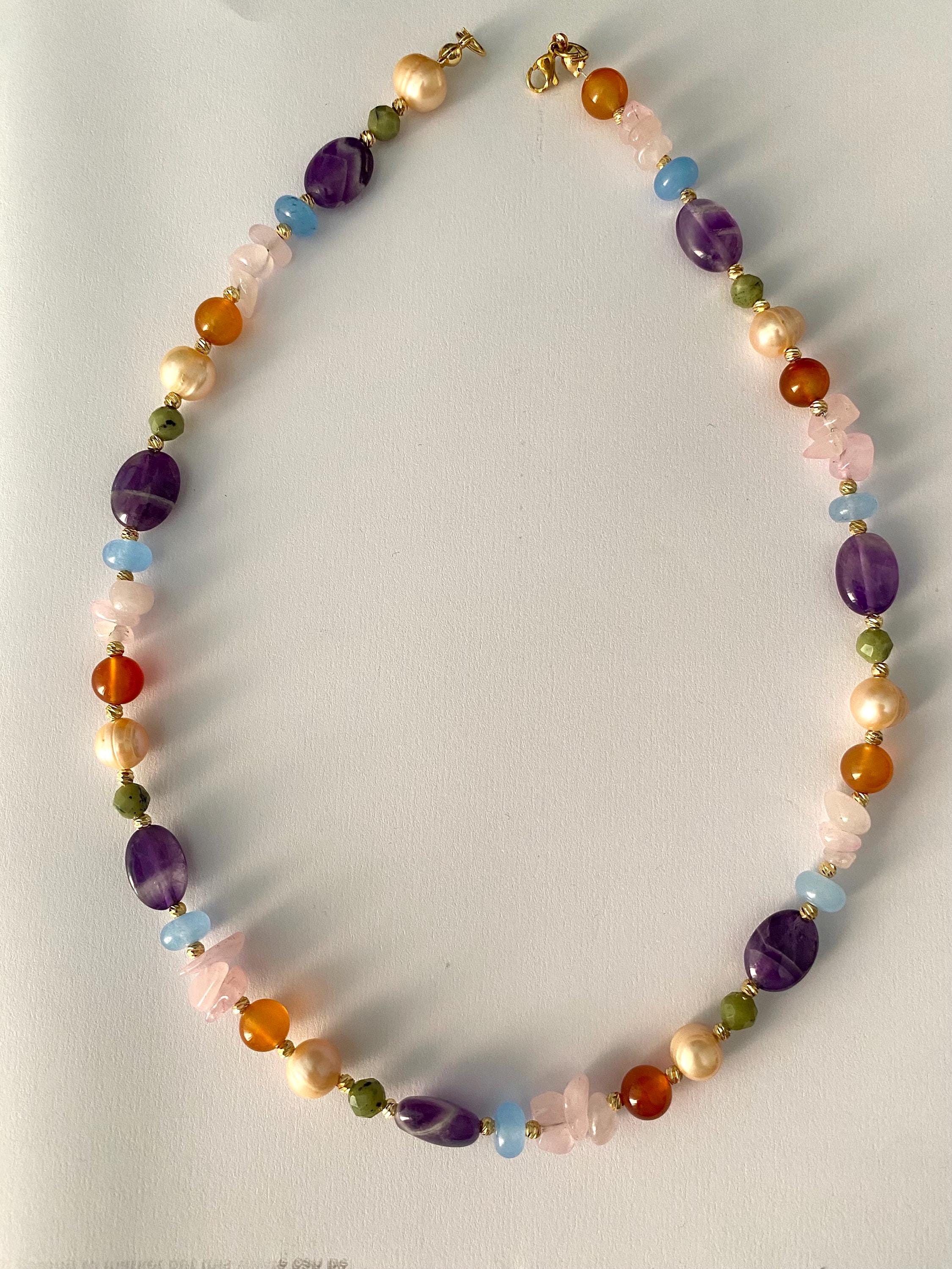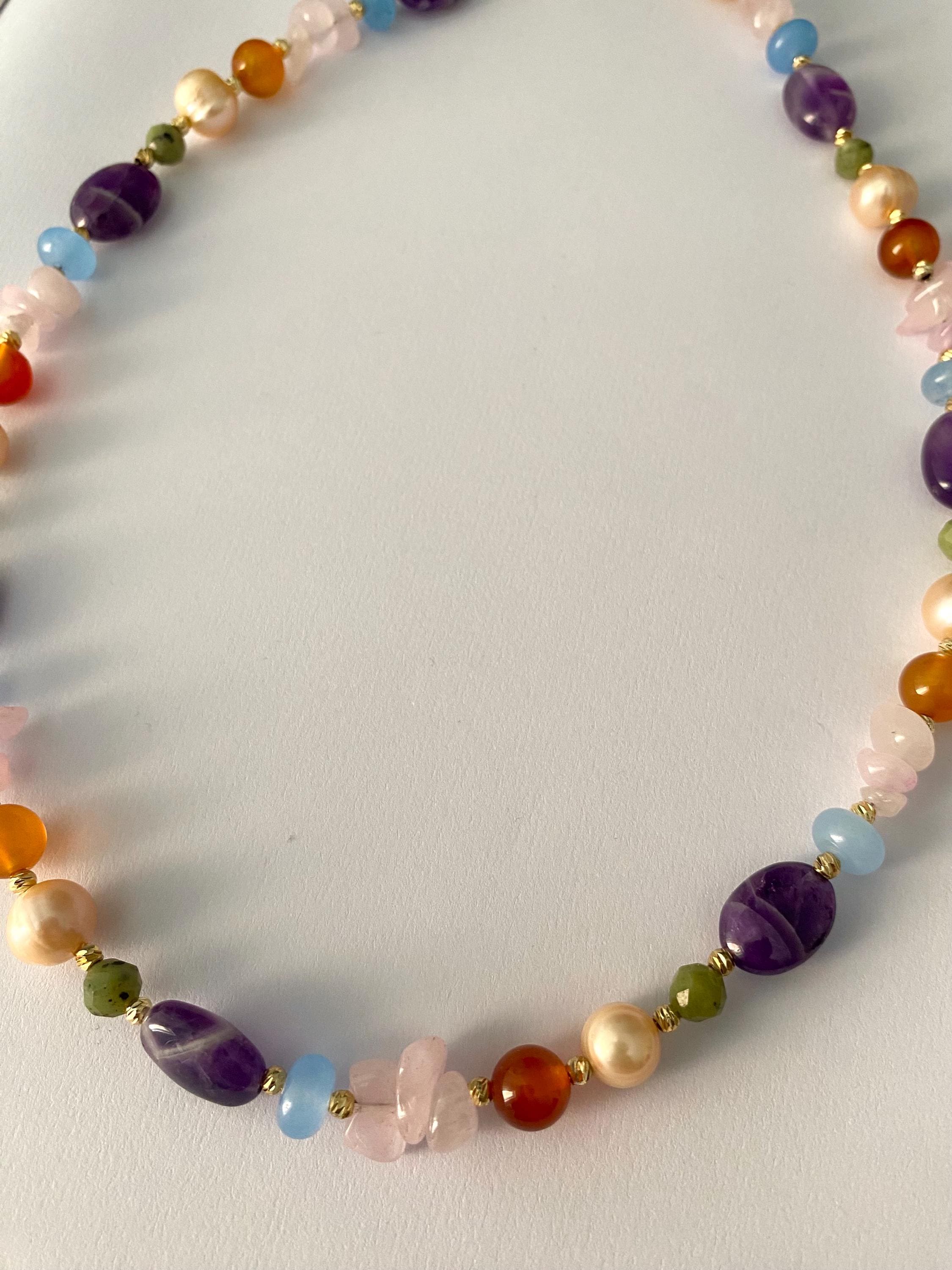 Bring natural elegance and bohemian charm into your style with this unique necklace. Designed with a harmonious mix of amethyst, green jade, orange and blue agate, rose quartz, and salmon-toned freshwater pearls, this piece is both colorful and sophisticated.