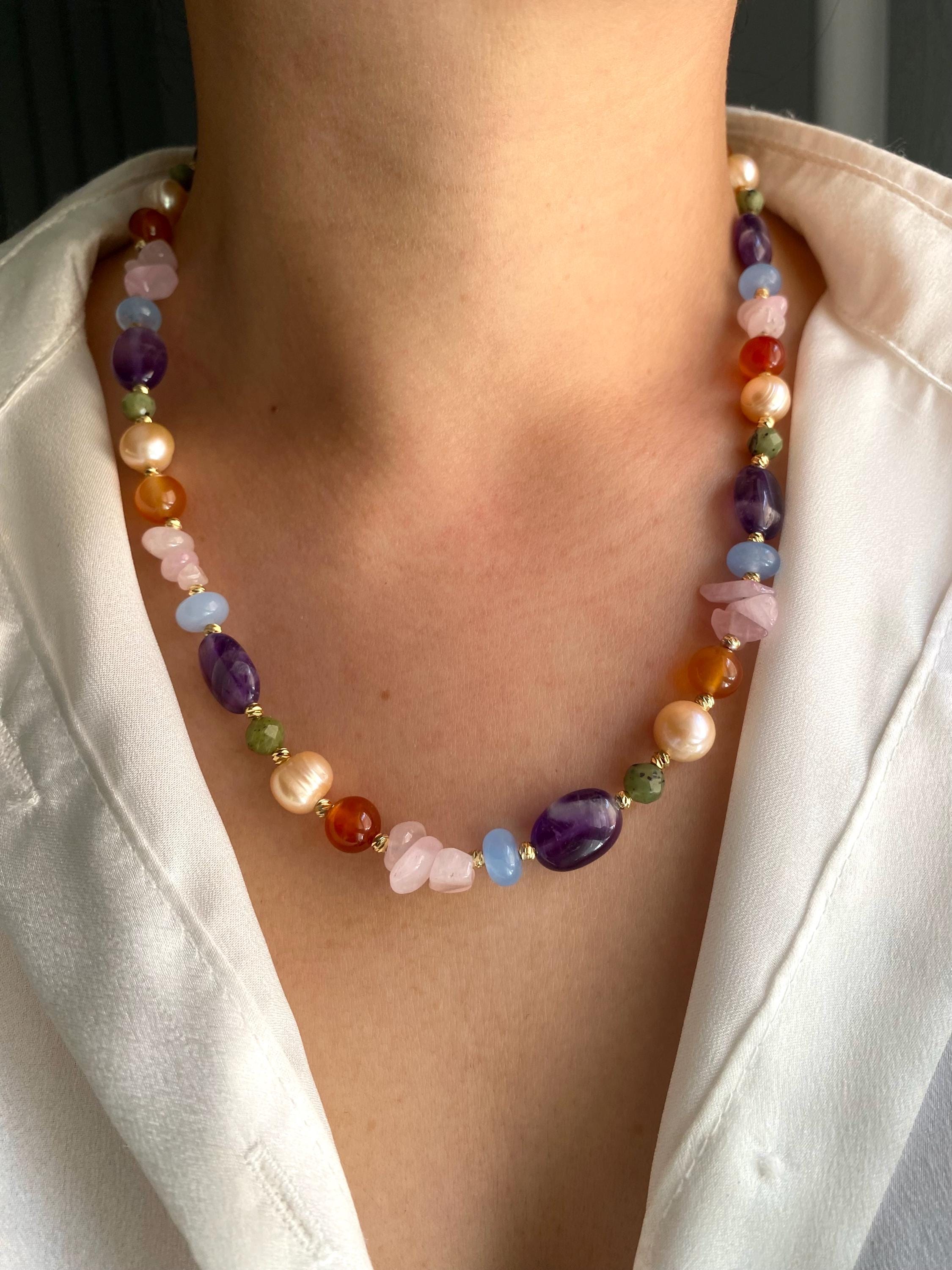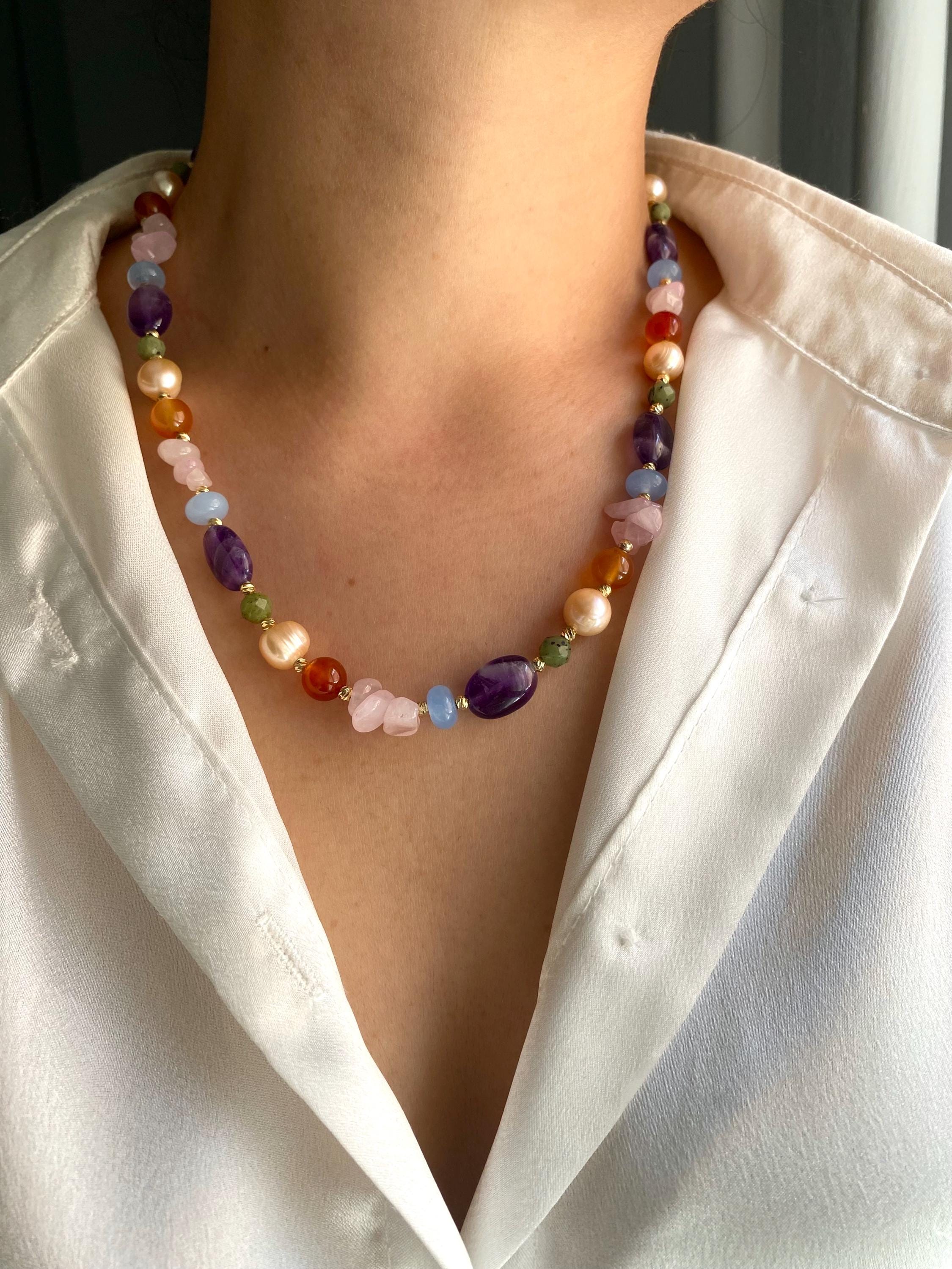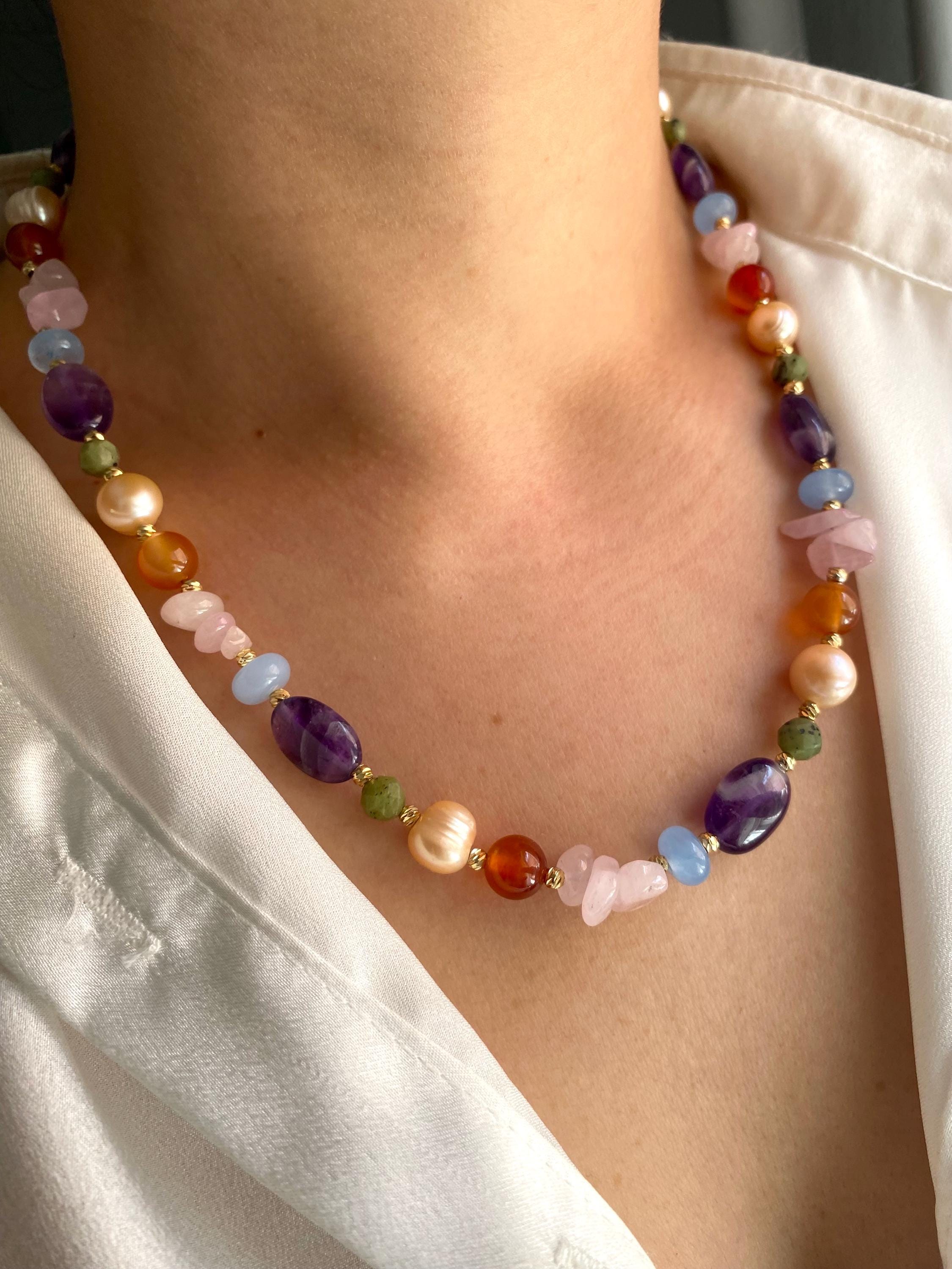 Bring natural elegance and bohemian charm into your style with this unique necklace. Designed with a harmonious mix of amethyst, green jade, orange and blue agate, rose quartz, and salmon-toned freshwater pearls, this piece is both colorful and sophisticated.
