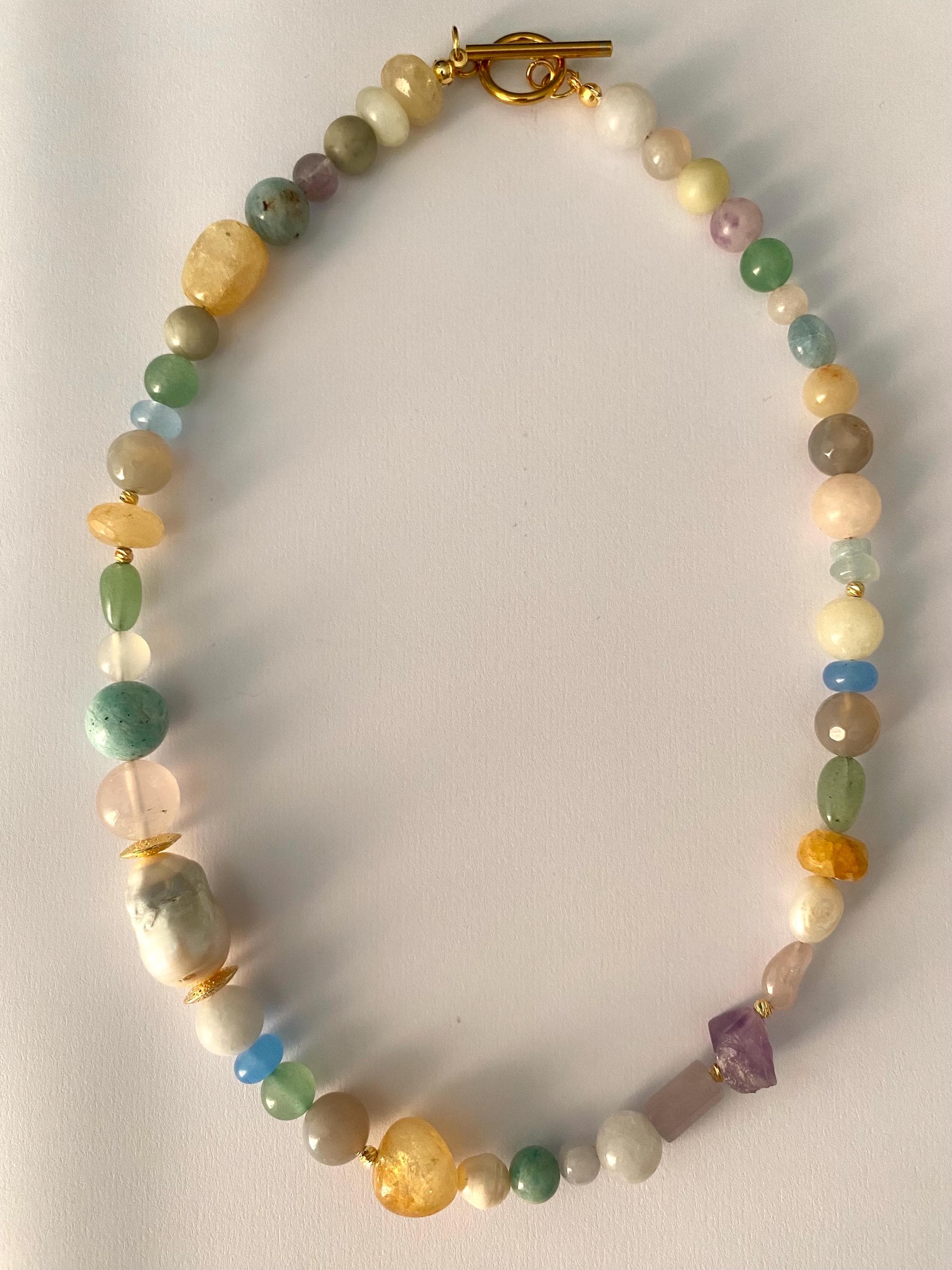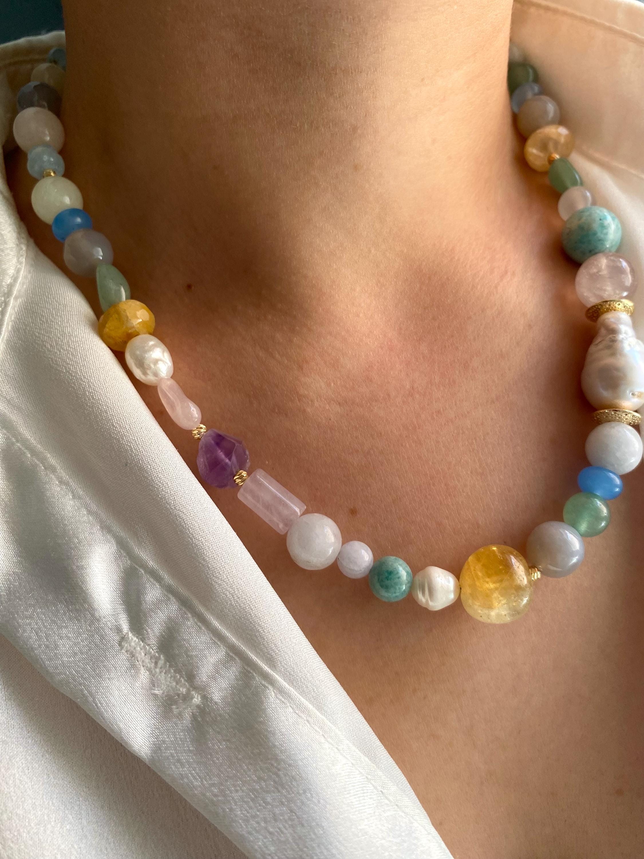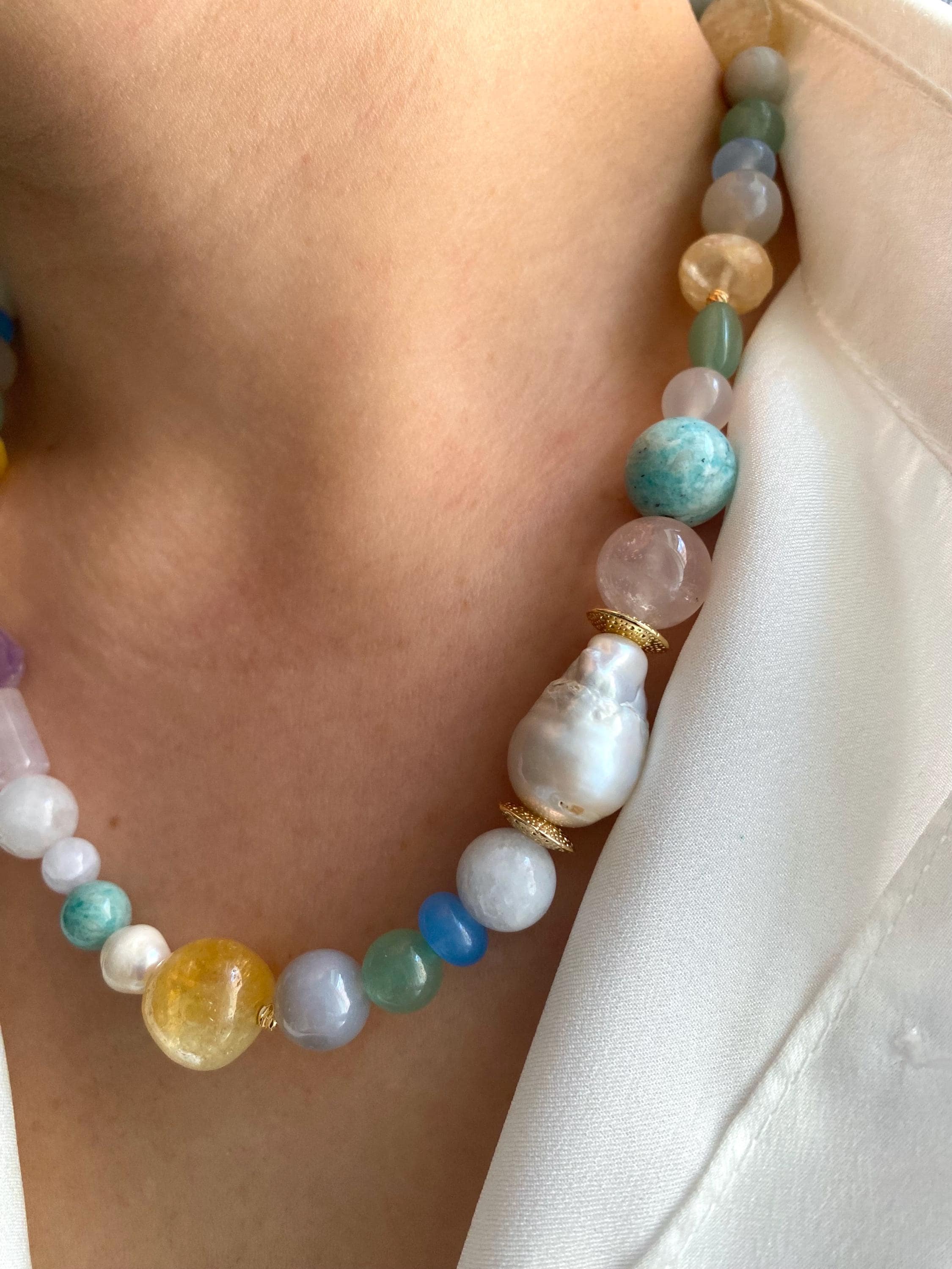 Bring soft elegance and bohemian charm into your style with this one-of-a-kind statement necklace. Featuring a harmonious mix of Aquamarine, Amethyst, Amazonite, Grey-Blue Agate, Citrine, Aragonite, Rose Quartz, Aventurine, Freshwater Pearl, and Morganite, this design is enriched with a bold large irregular baroque pearl on one side. The back is finished with a stylish toggle clasp for both security and flair.