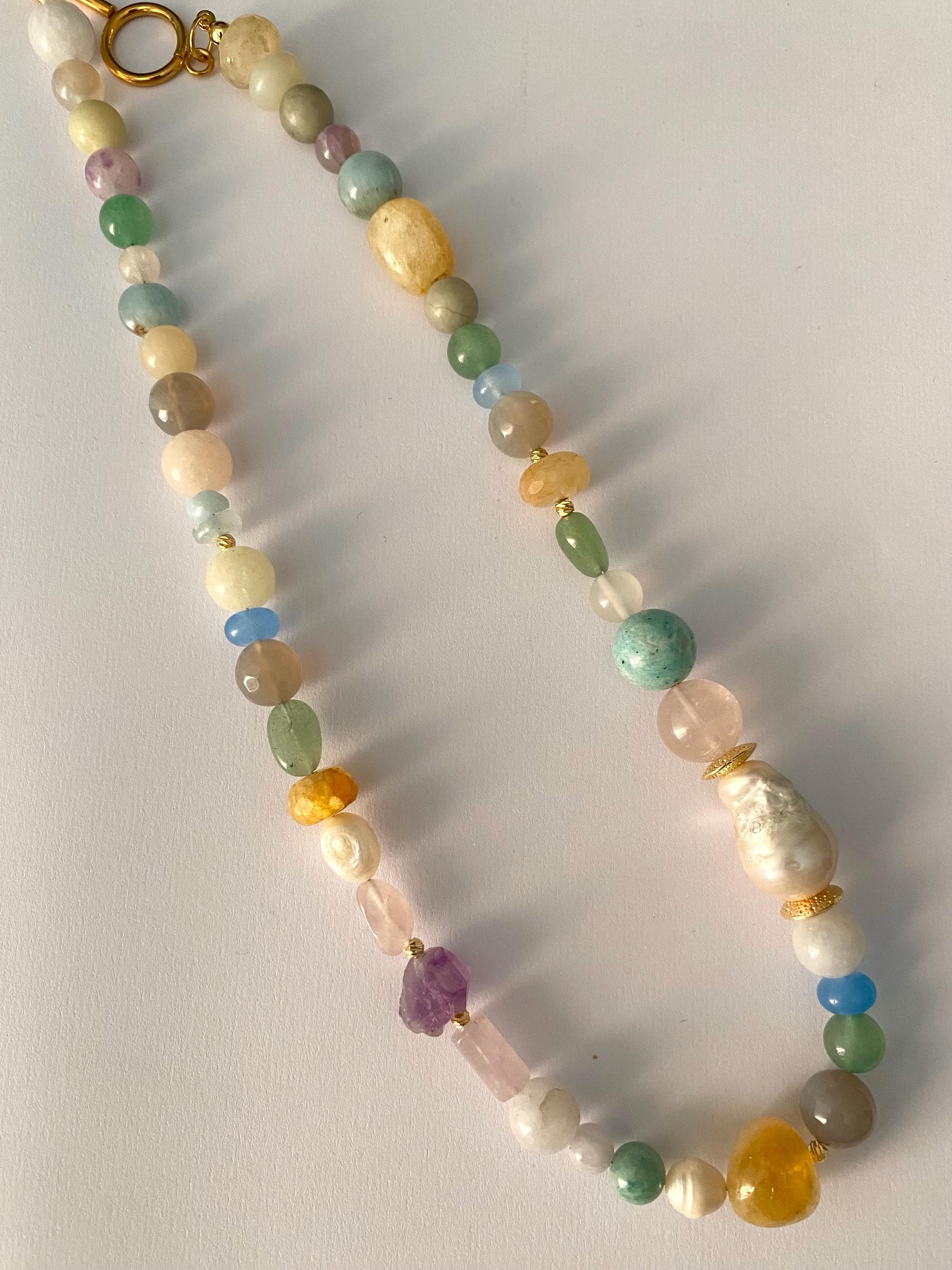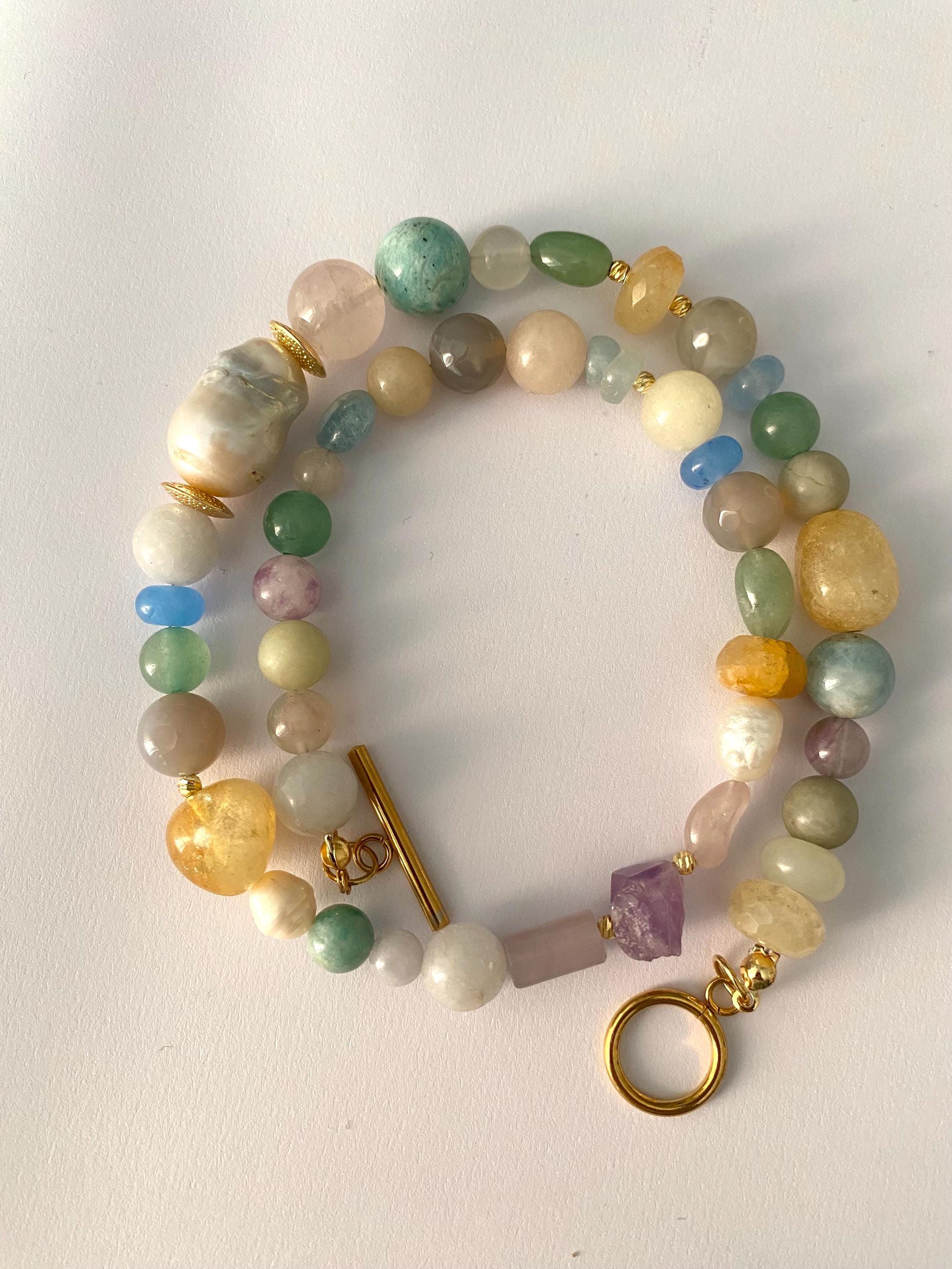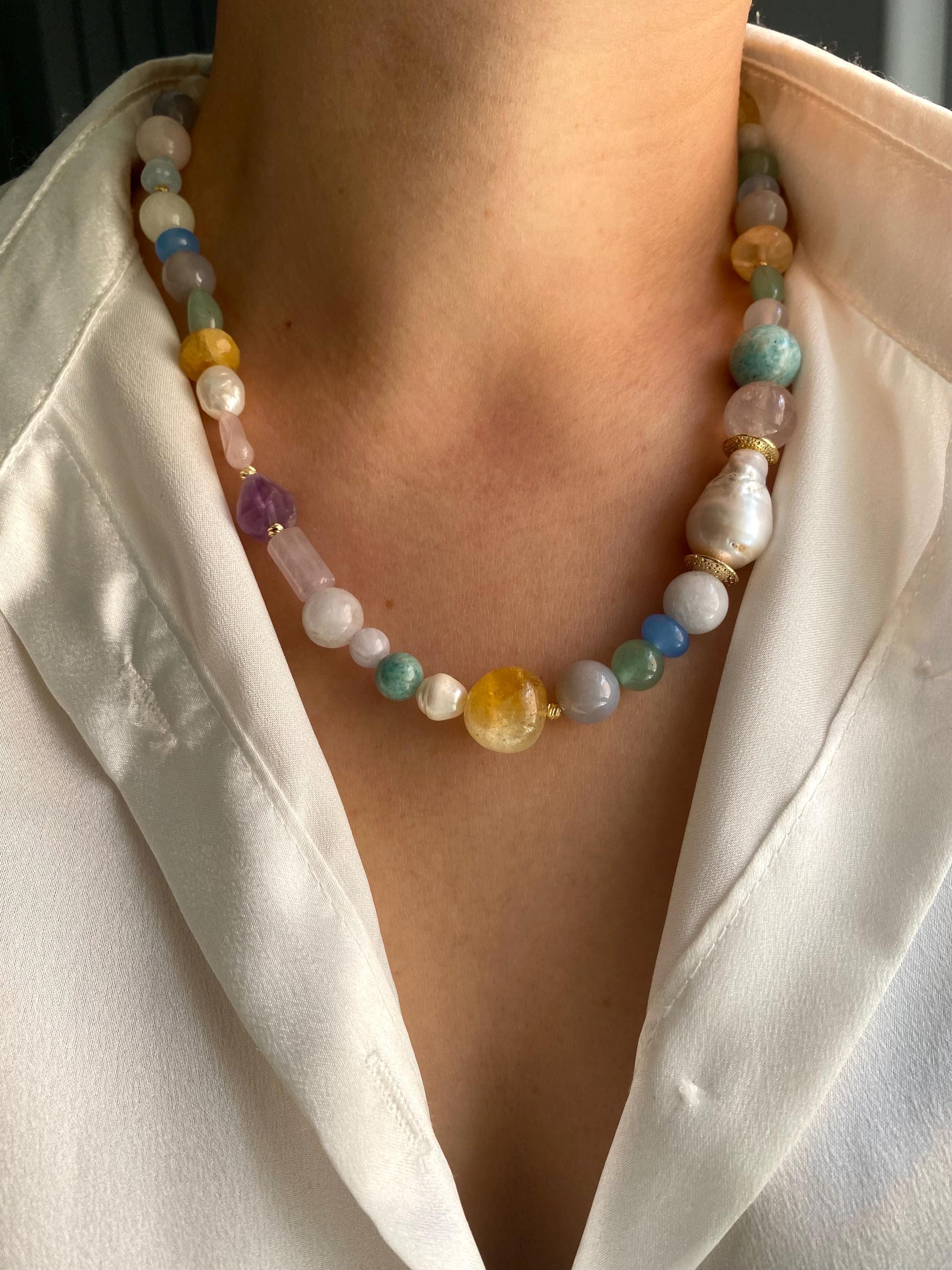 Bring soft elegance and bohemian charm into your style with this one-of-a-kind statement necklace. Featuring a harmonious mix of Aquamarine, Amethyst, Amazonite, Grey-Blue Agate, Citrine, Aragonite, Rose Quartz, Aventurine, Freshwater Pearl, and Morganite, this design is enriched with a bold large irregular baroque pearl on one side. The back is finished with a stylish toggle clasp for both security and flair.