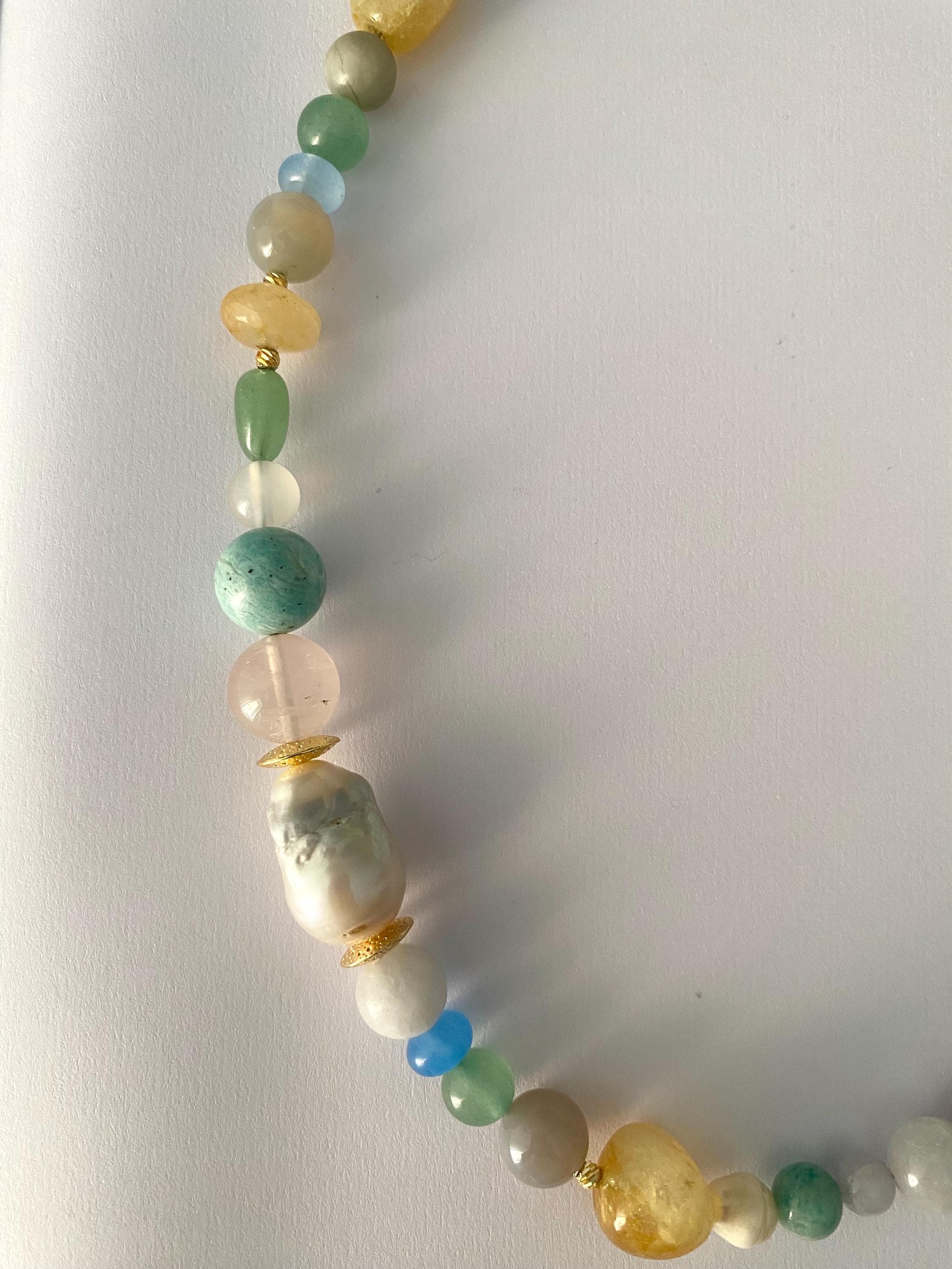 🌸 Pastel Gemstone & Baroque Pearl Necklace – Gold Plated 🌸