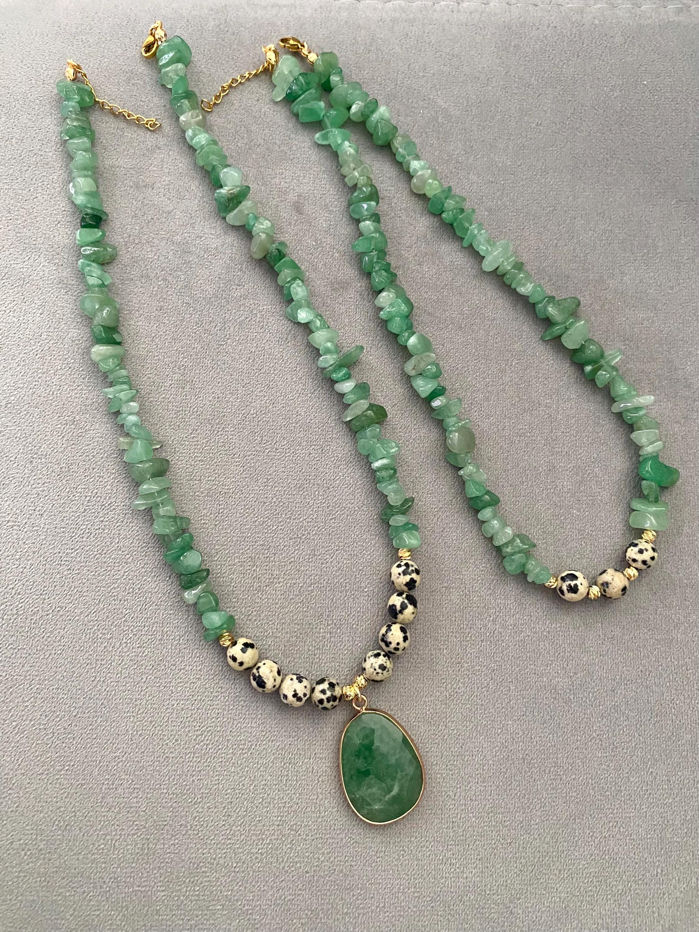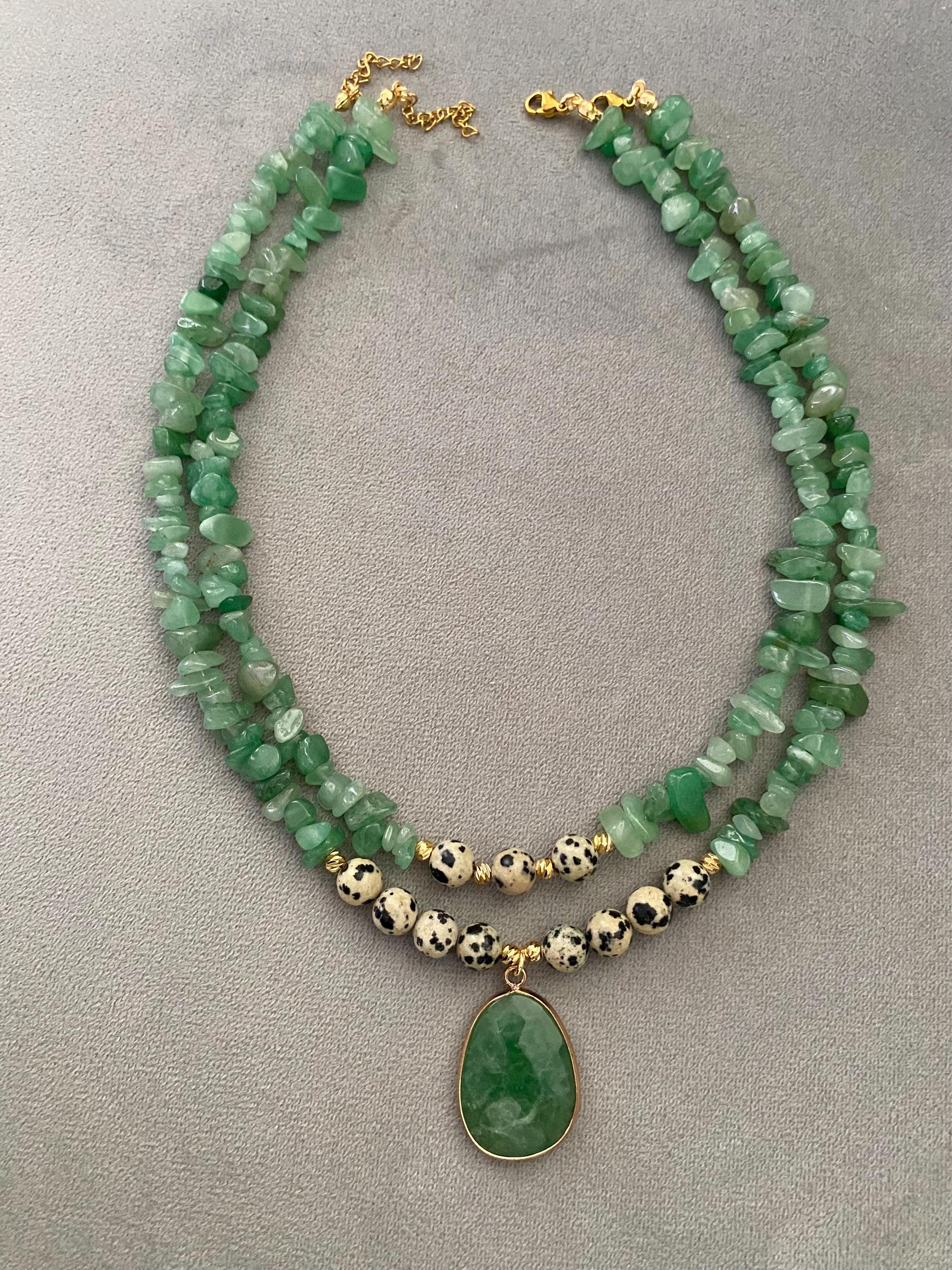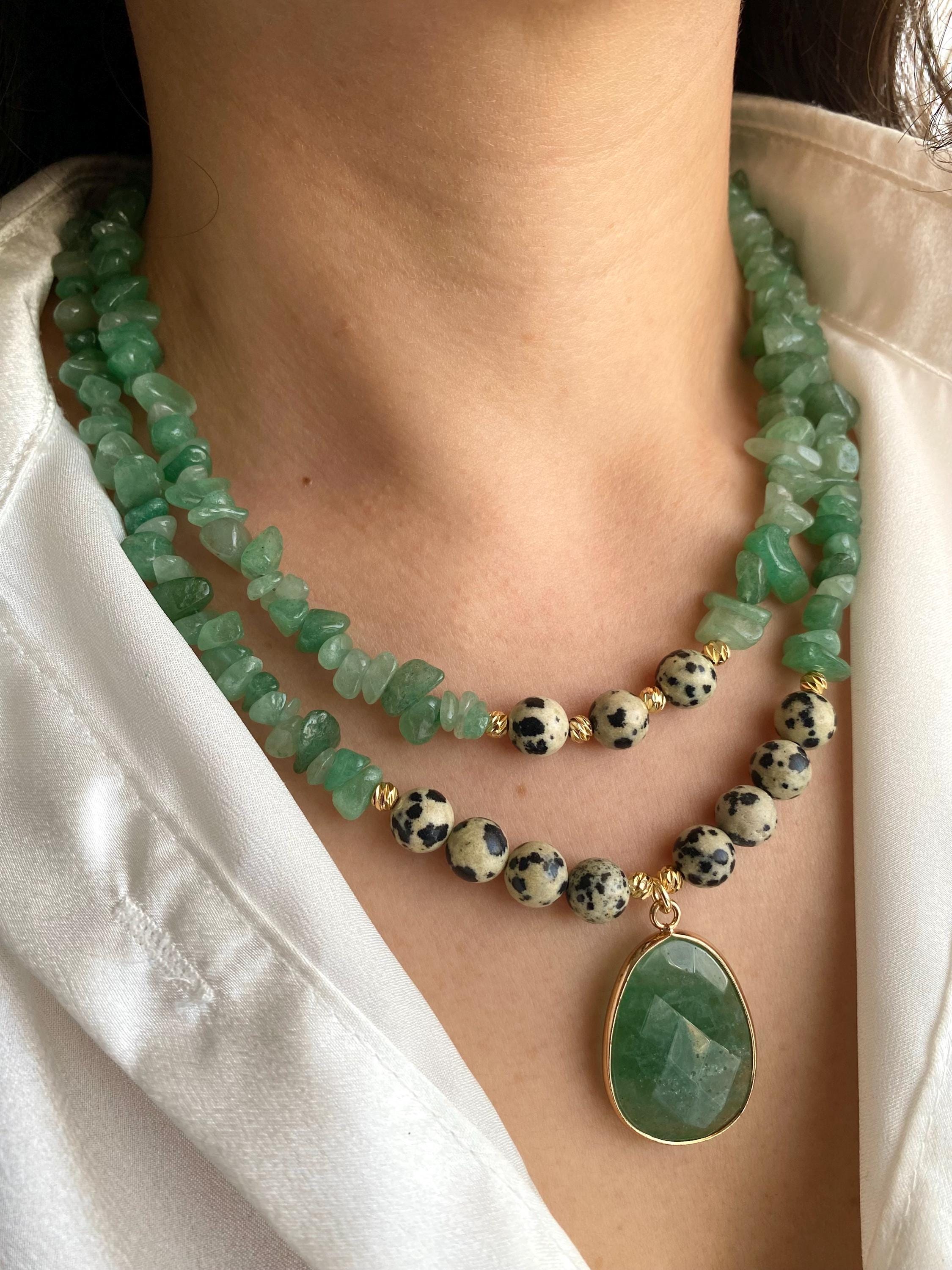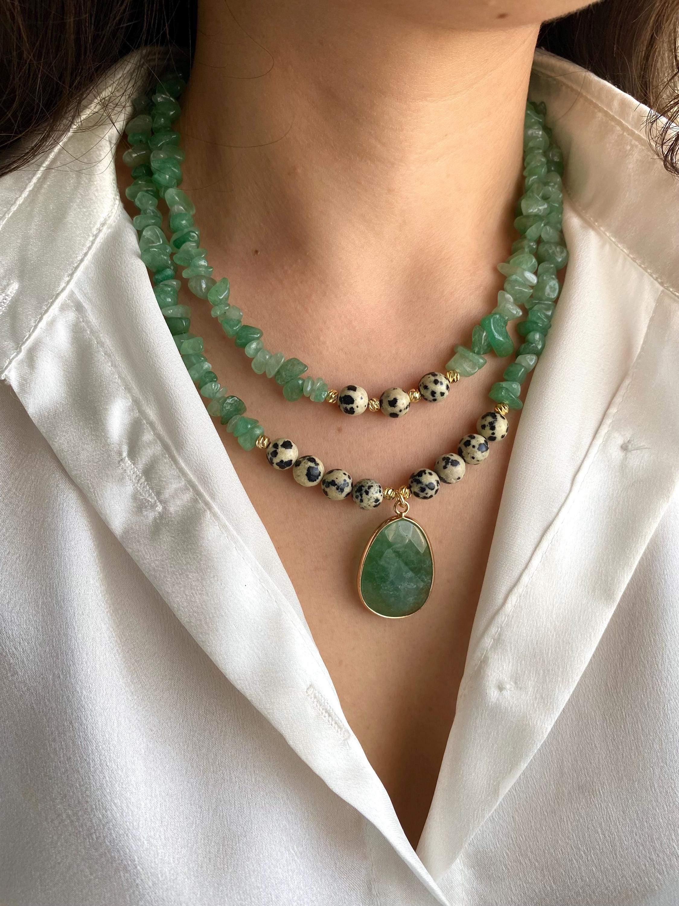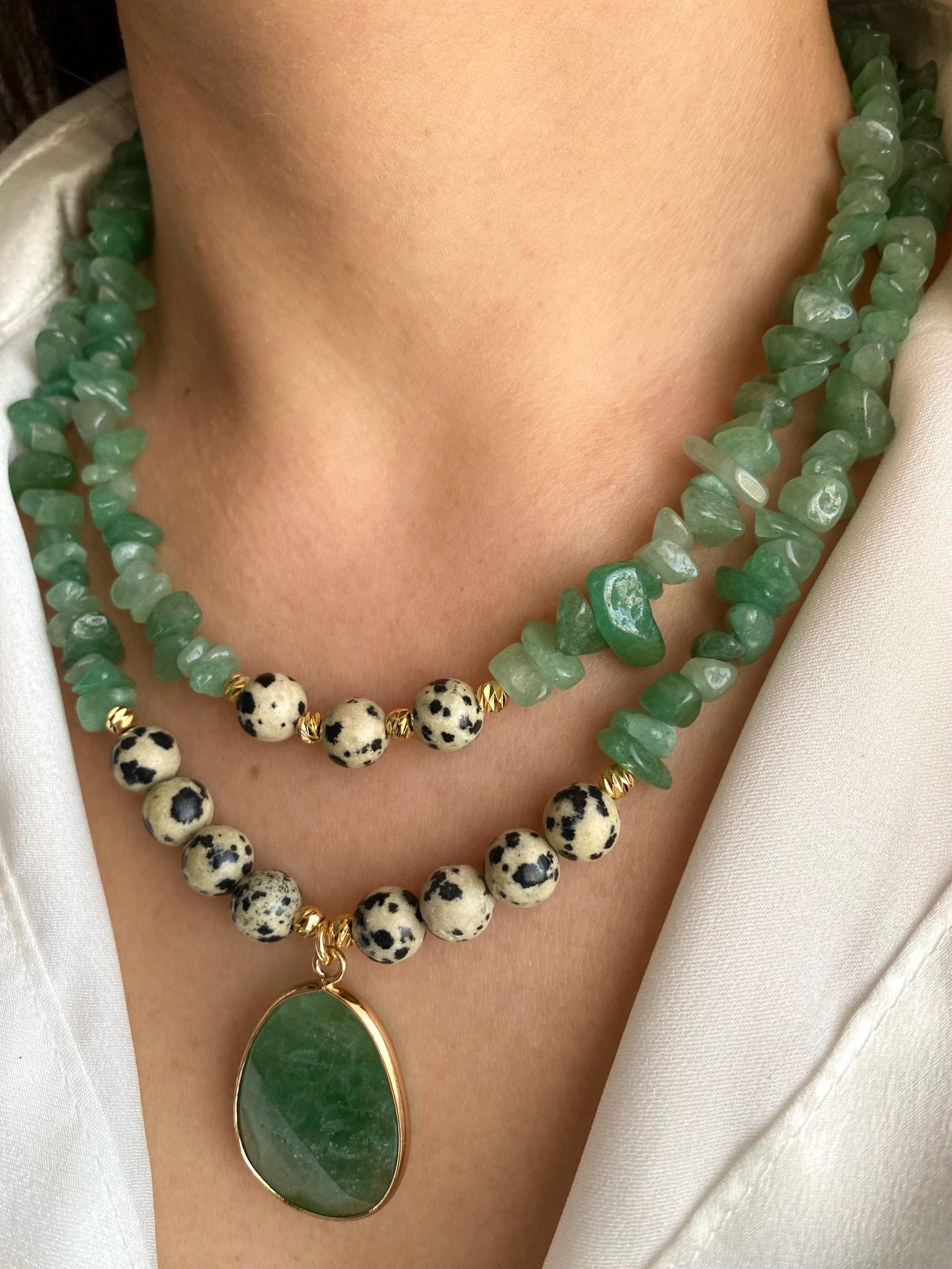 Bring the grounding beauty of nature into your style with this bohemian statement necklace, combining the calming energy of green aventurine with the unique spotted patterns of Dalmatian Jasper. A striking aventurine pendant completes the design, adding harmony and natural elegance.
