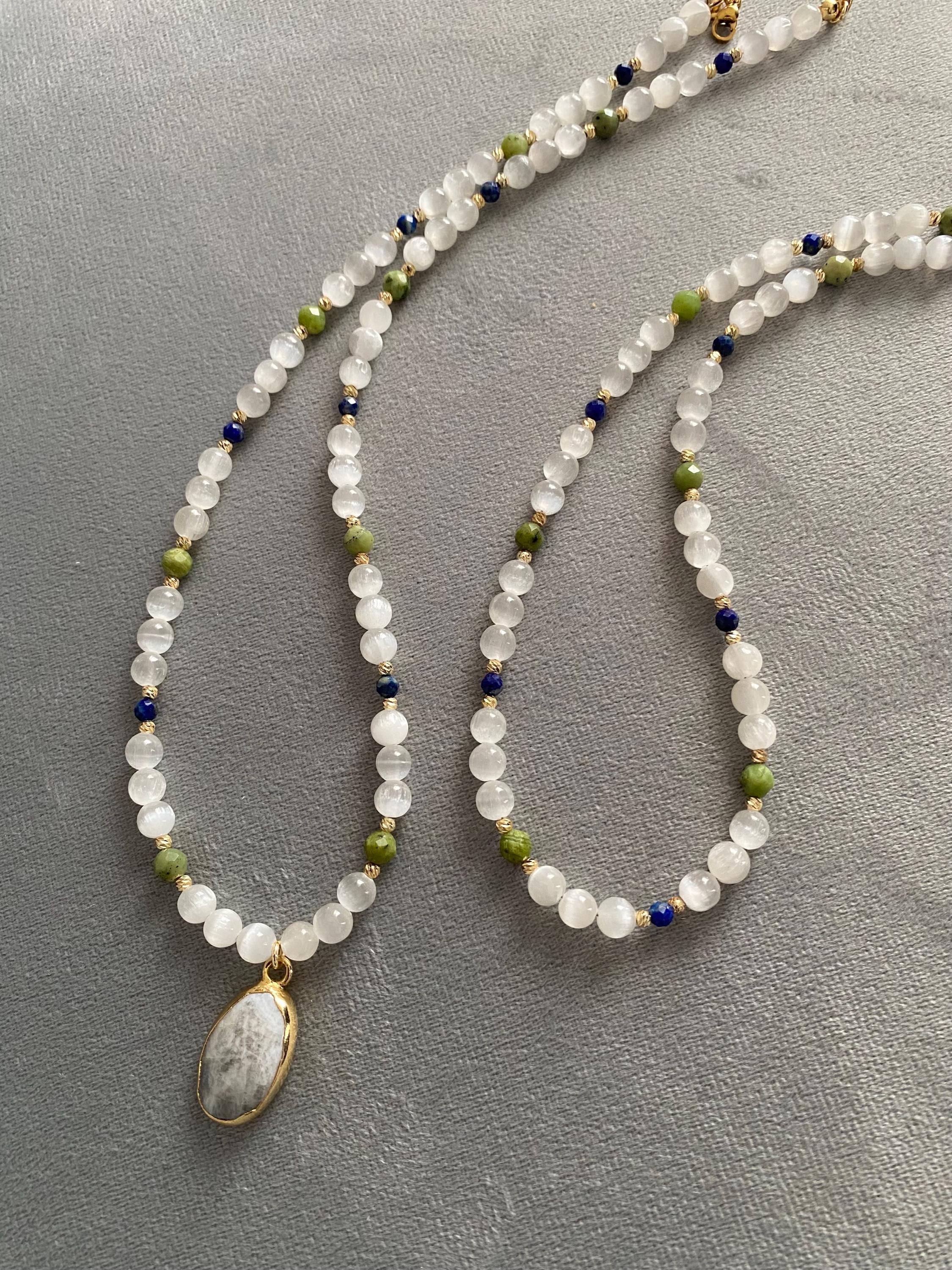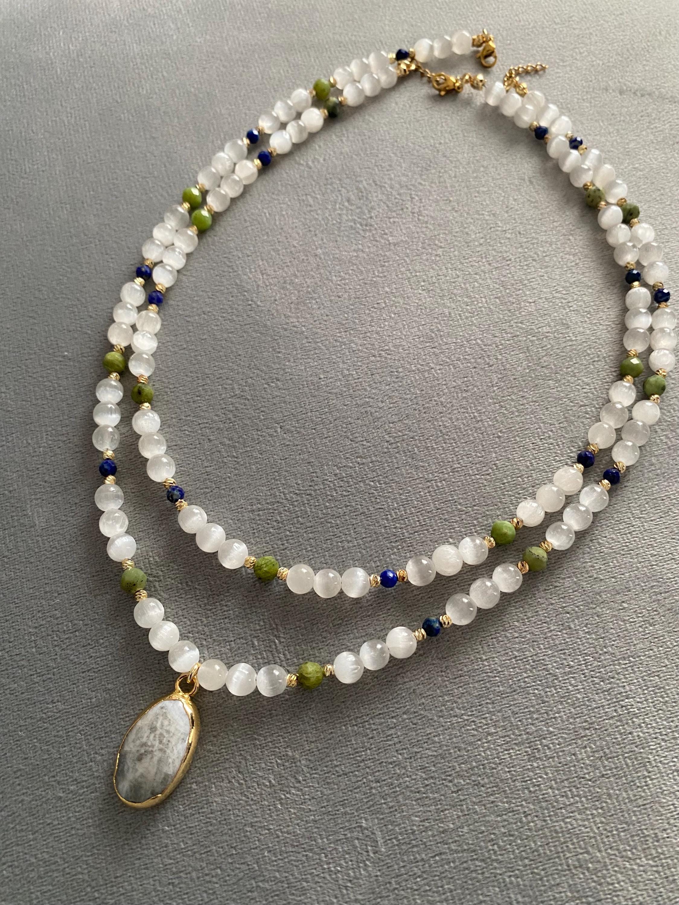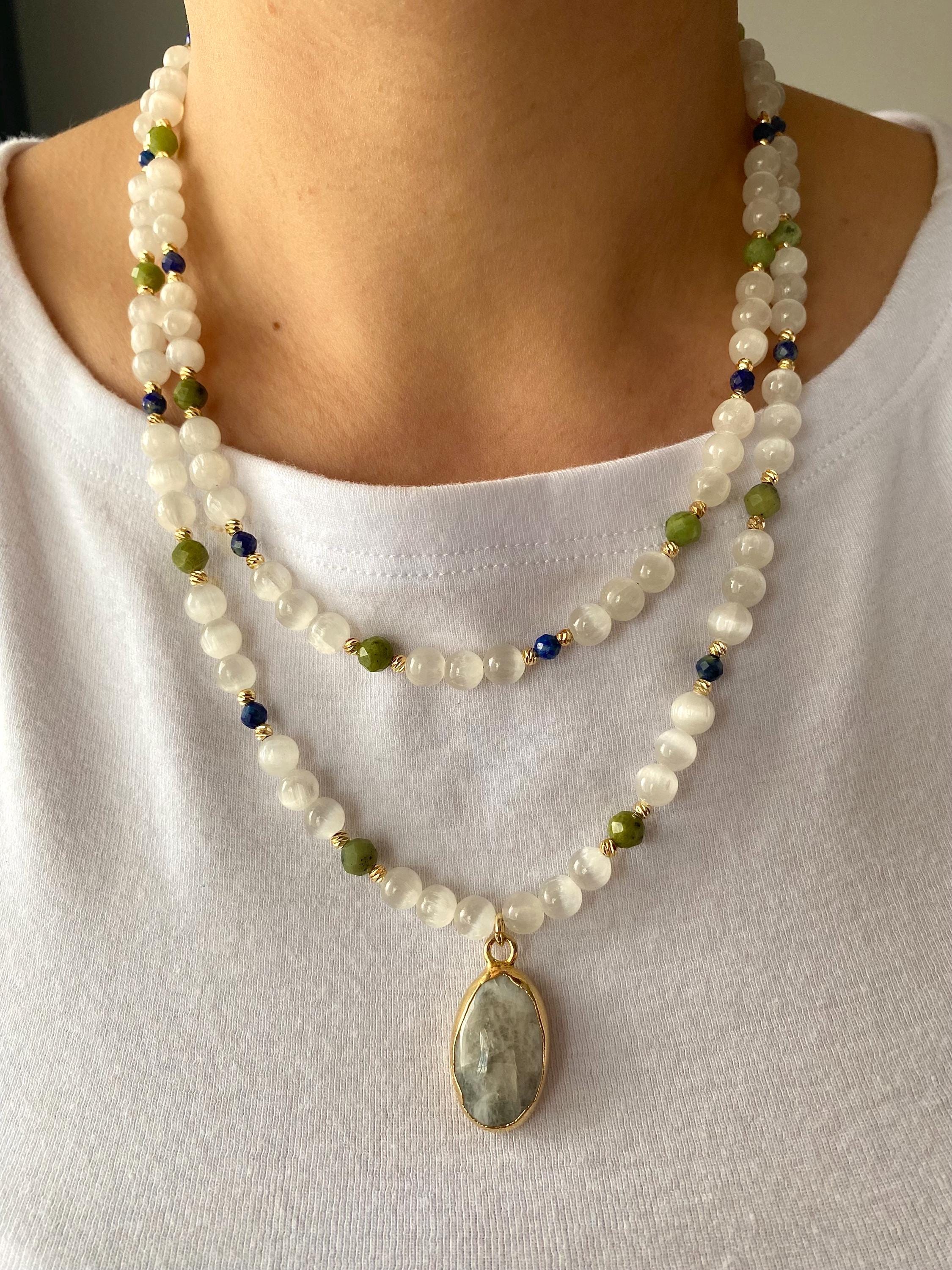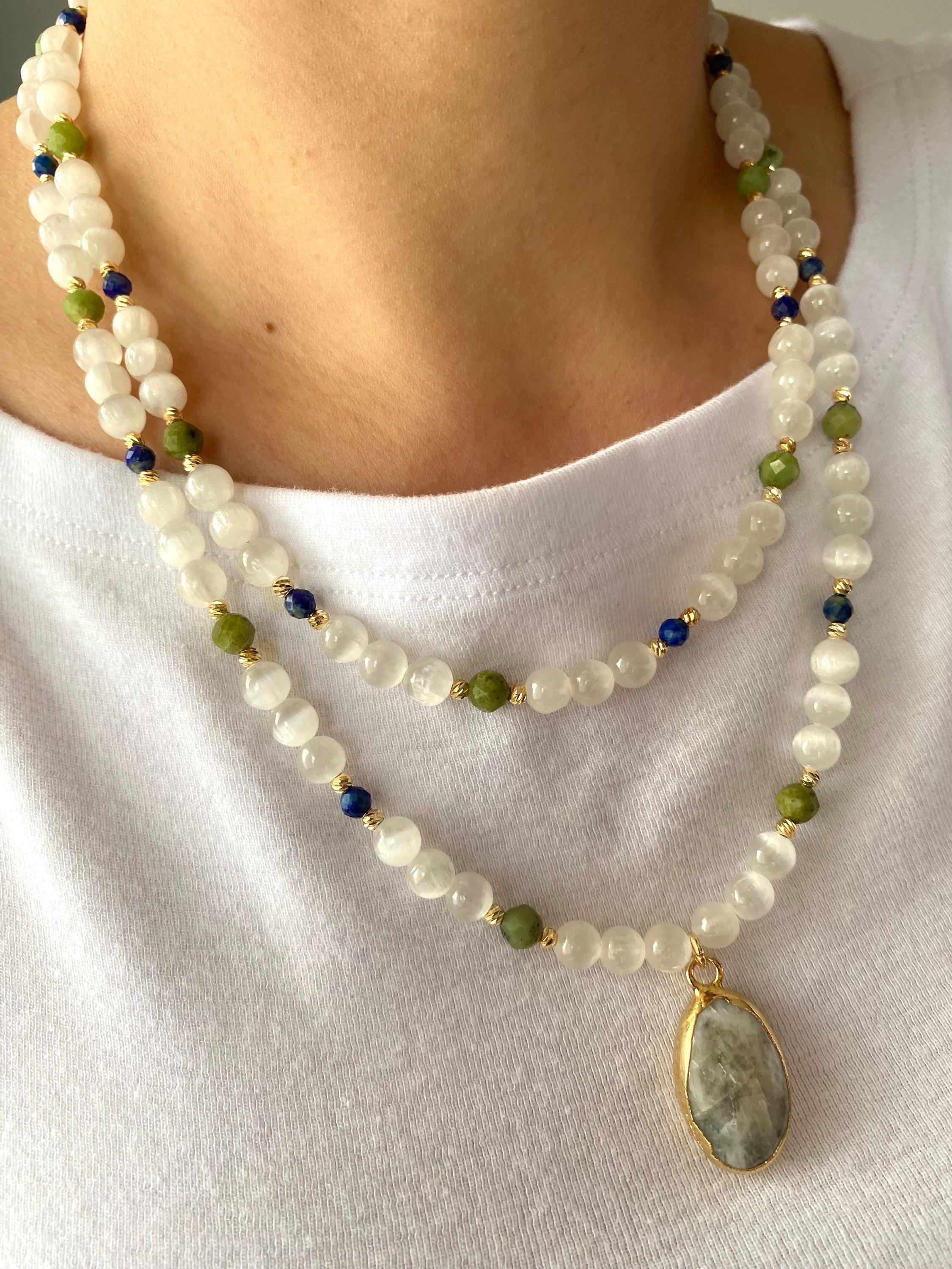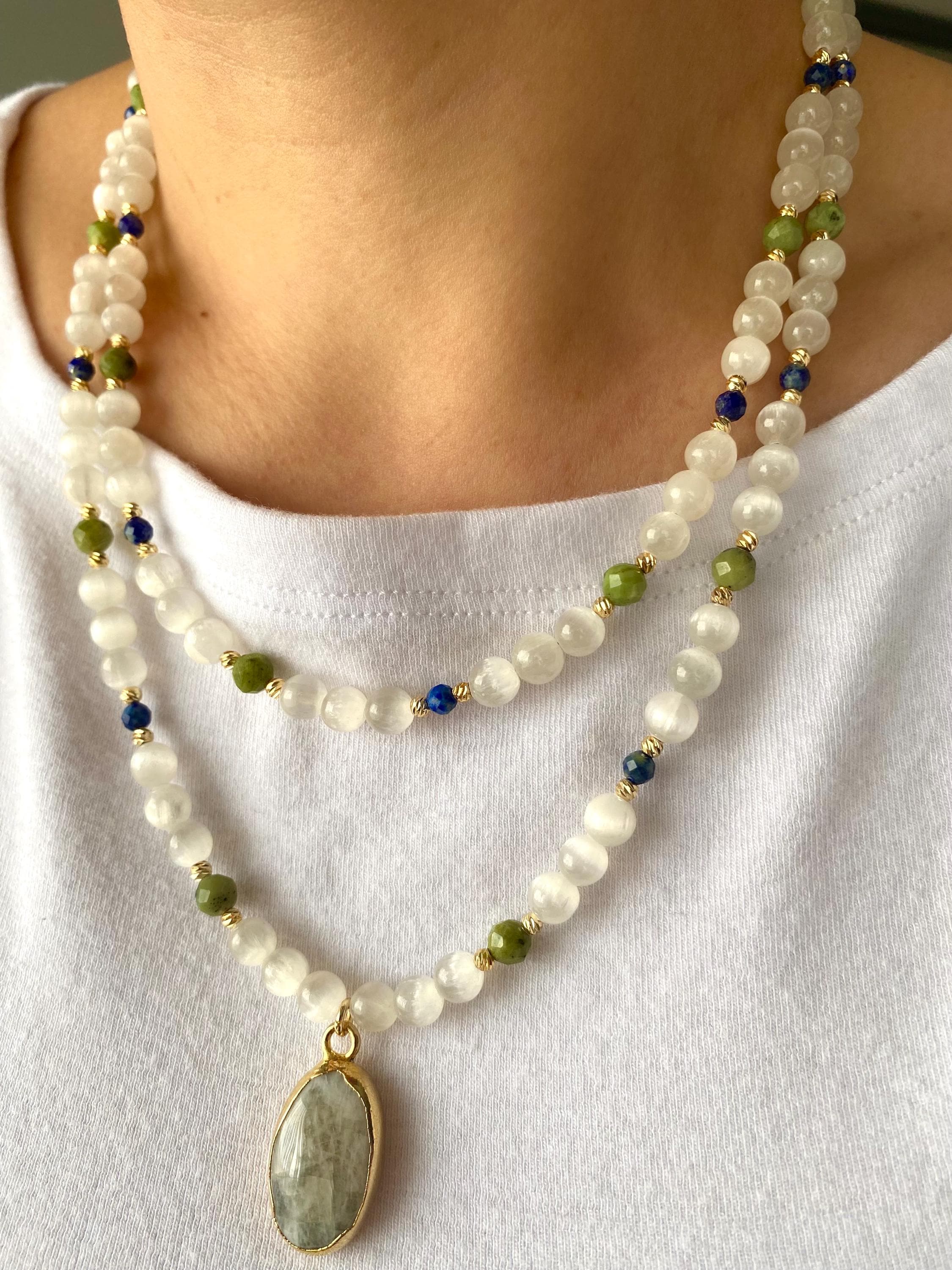 ✨ Gold-Plated Multistrand Necklace with Selenite, Lapis Lazuli & Jade ✨