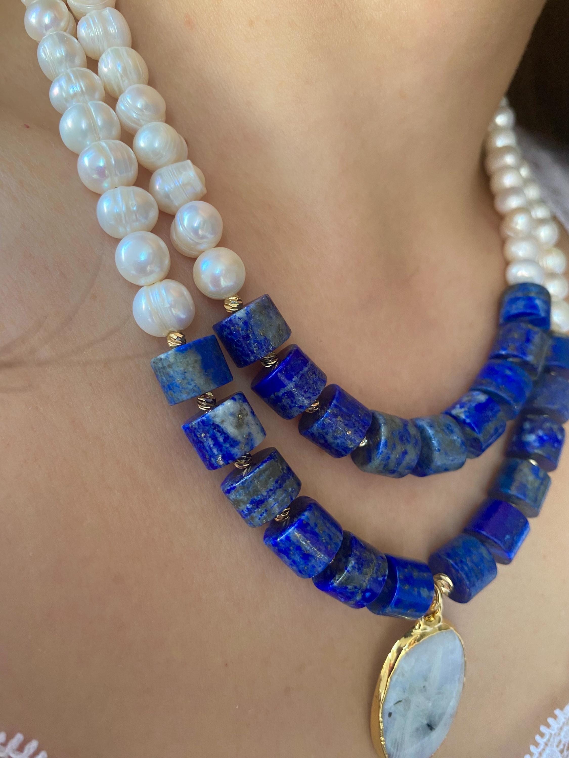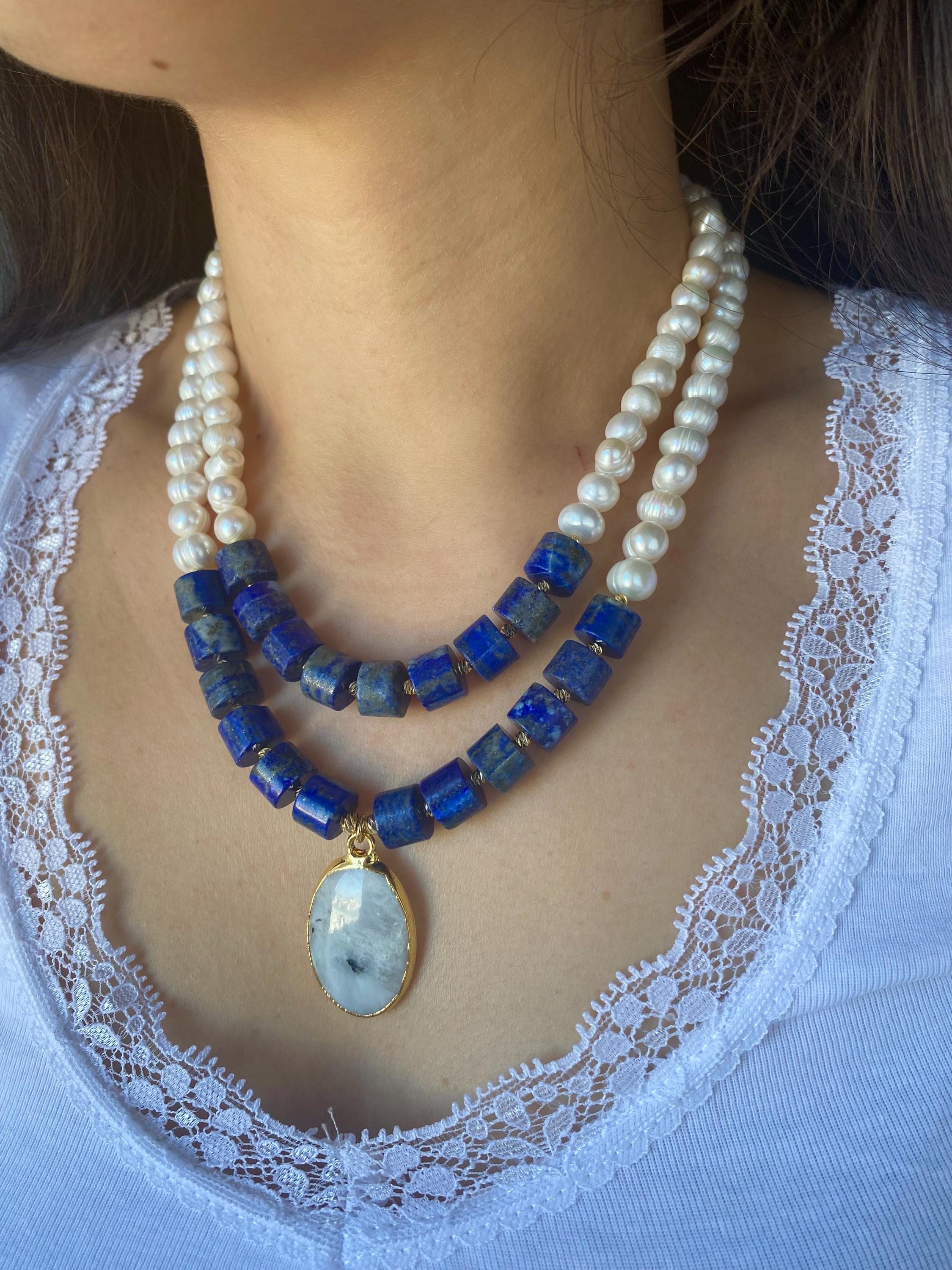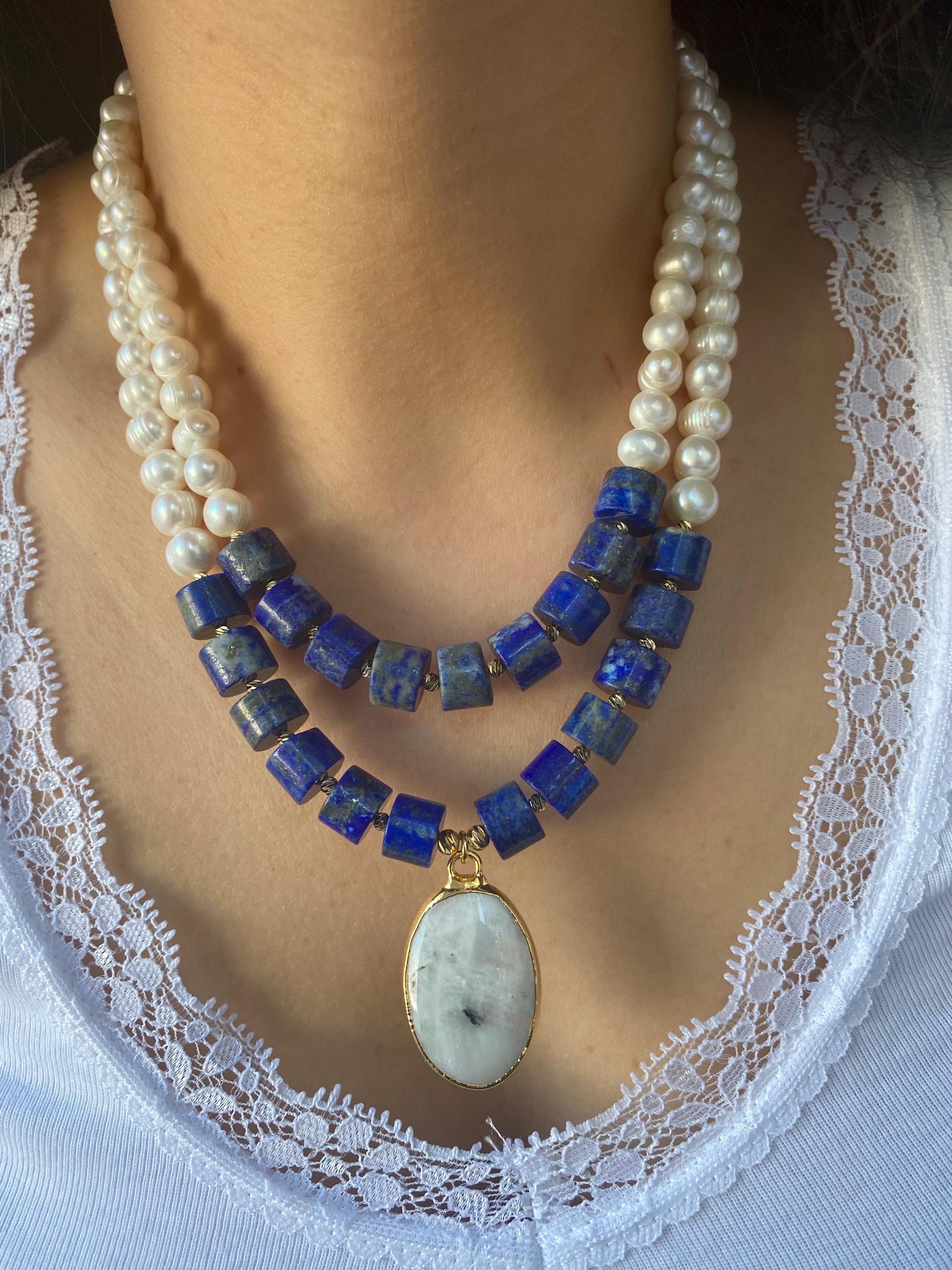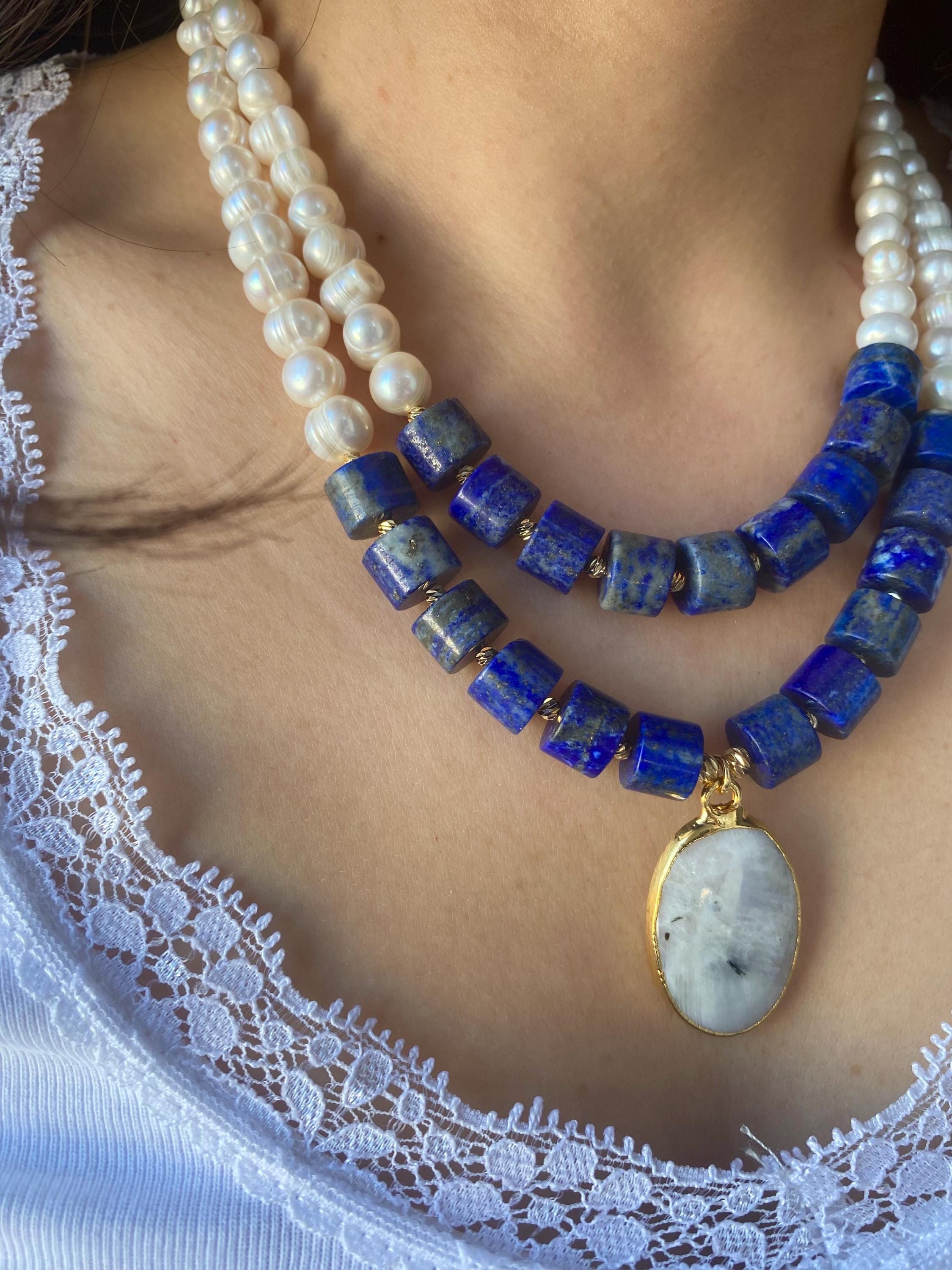 A stunning blend of deep blue Lapis Lazuli discs in the front and lustrous freshwater pearls along the sides and back, creating a beautiful contrast of color and texture. Finished with a Moonstone pendant, this design embodies both bohemian spirit and timeless elegance.