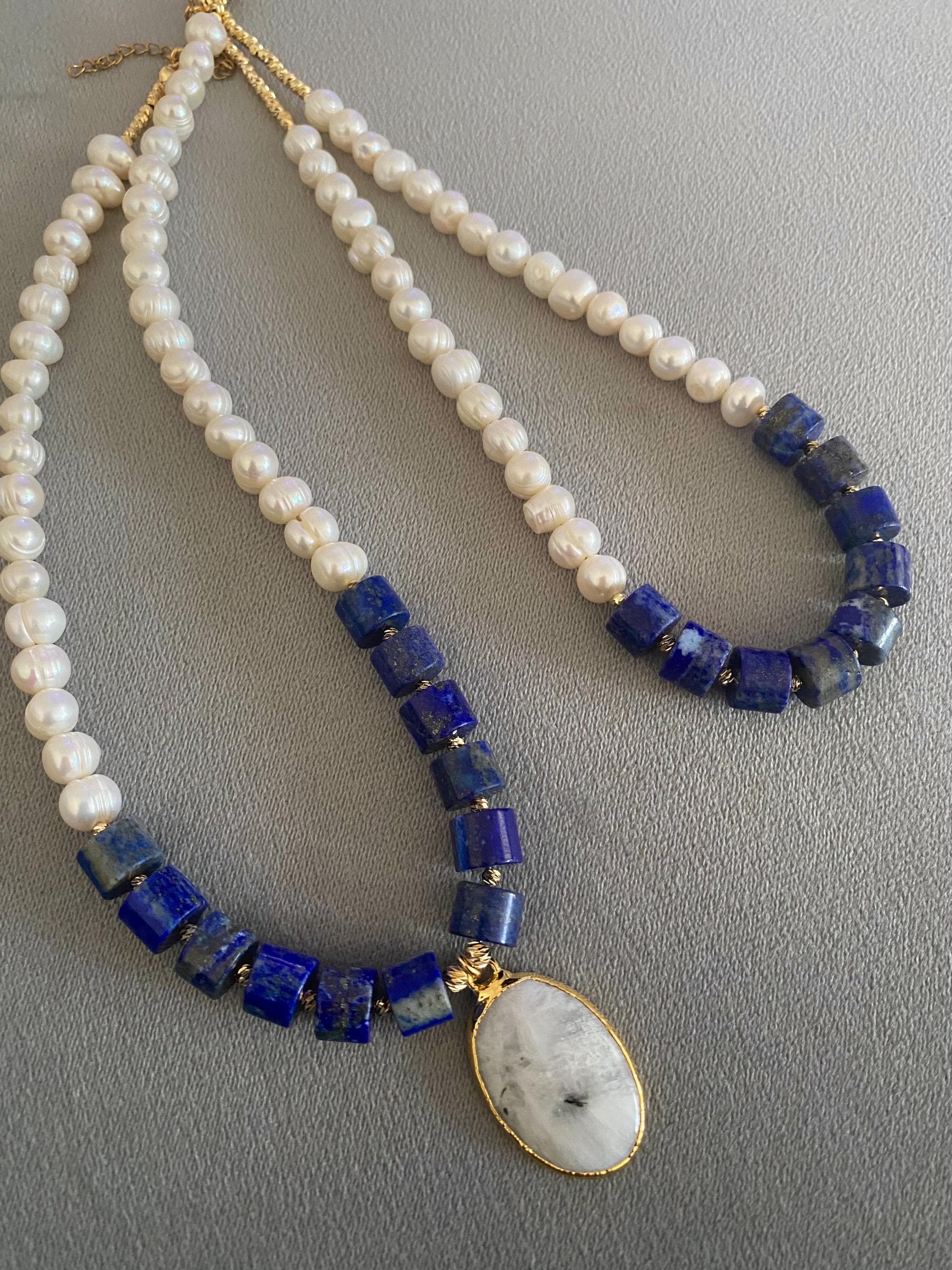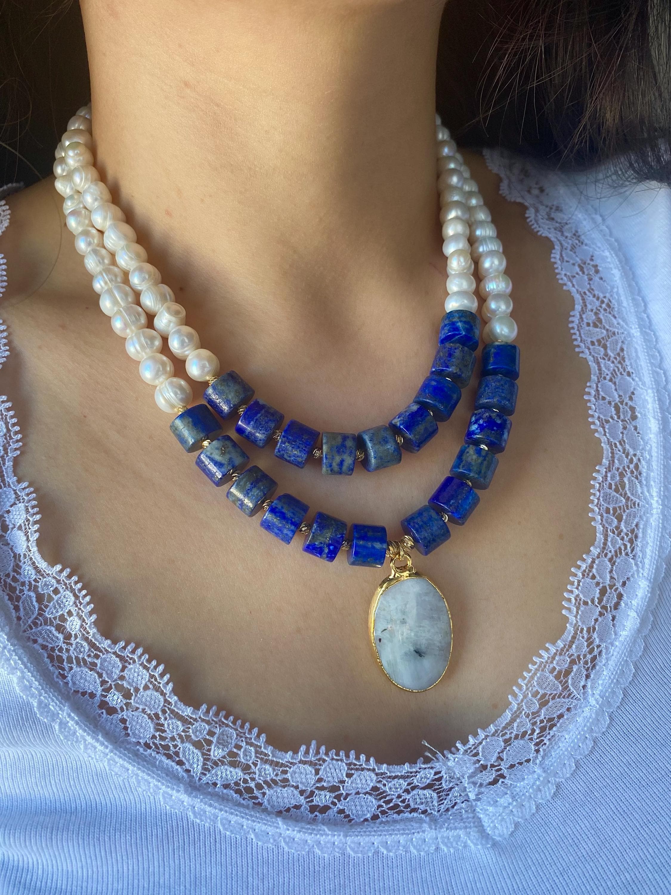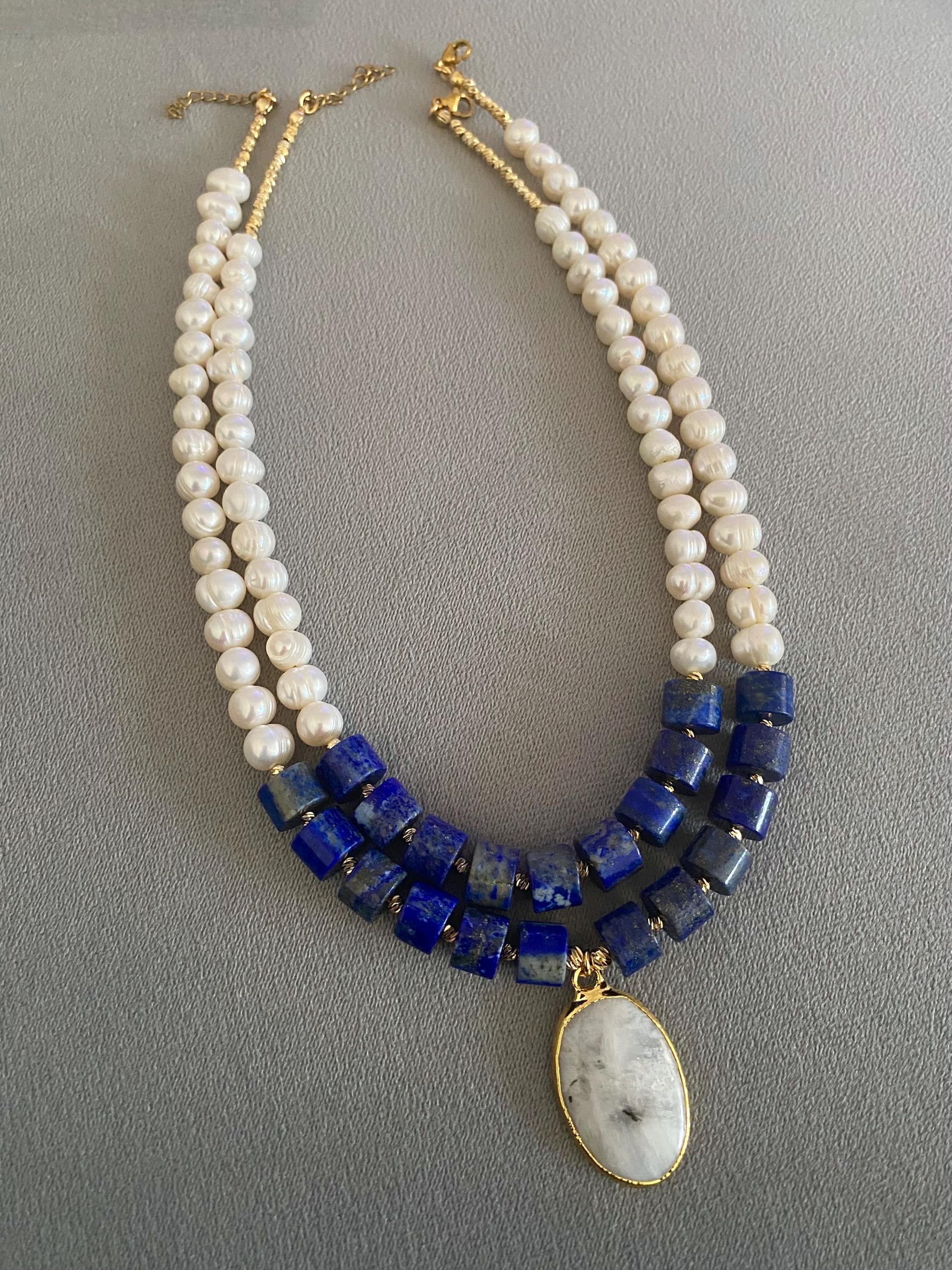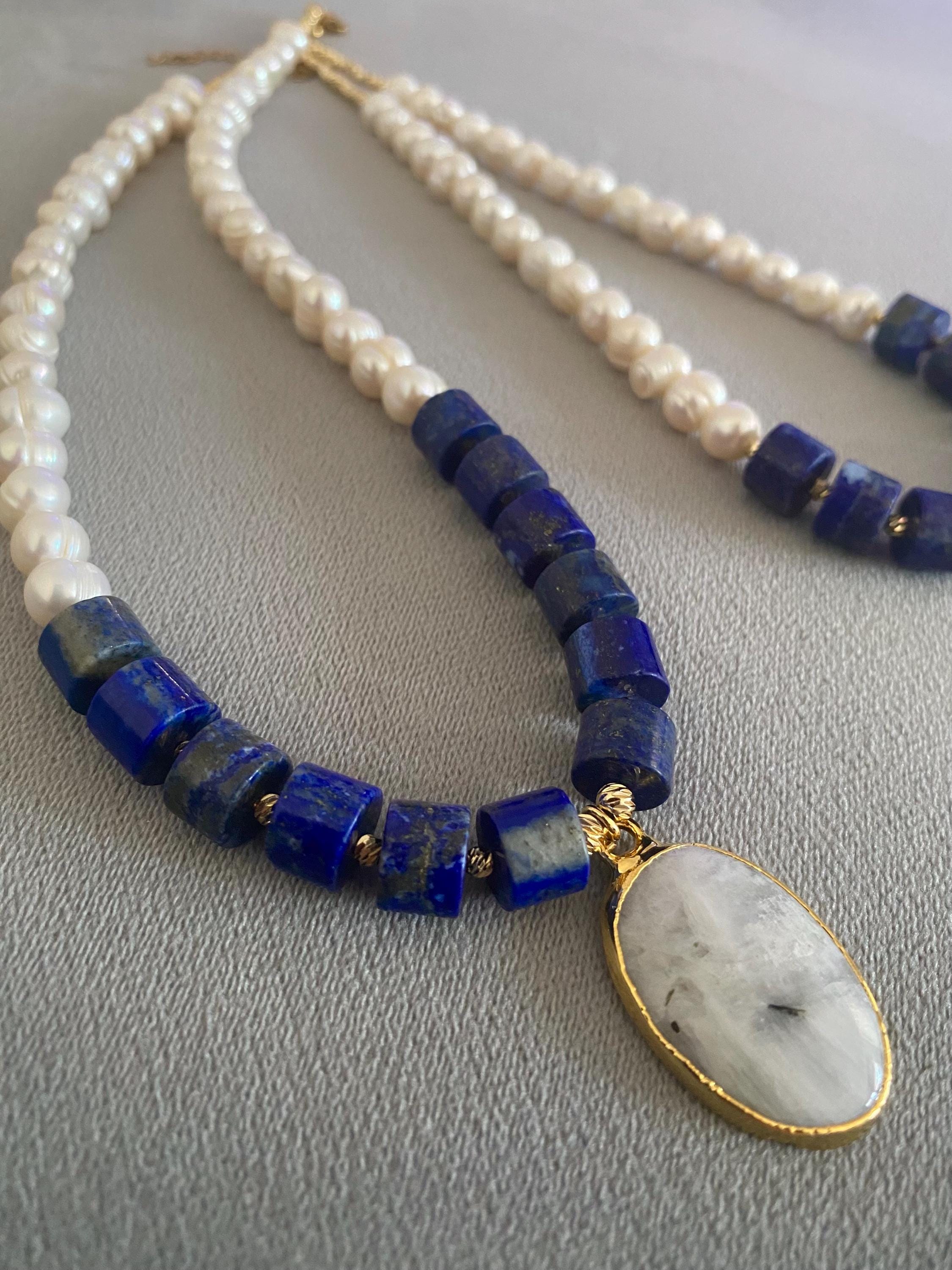 A stunning blend of deep blue Lapis Lazuli discs in the front and lustrous freshwater pearls along the sides and back, creating a beautiful contrast of color and texture. Finished with a Moonstone pendant, this design embodies both bohemian spirit and timeless elegance.