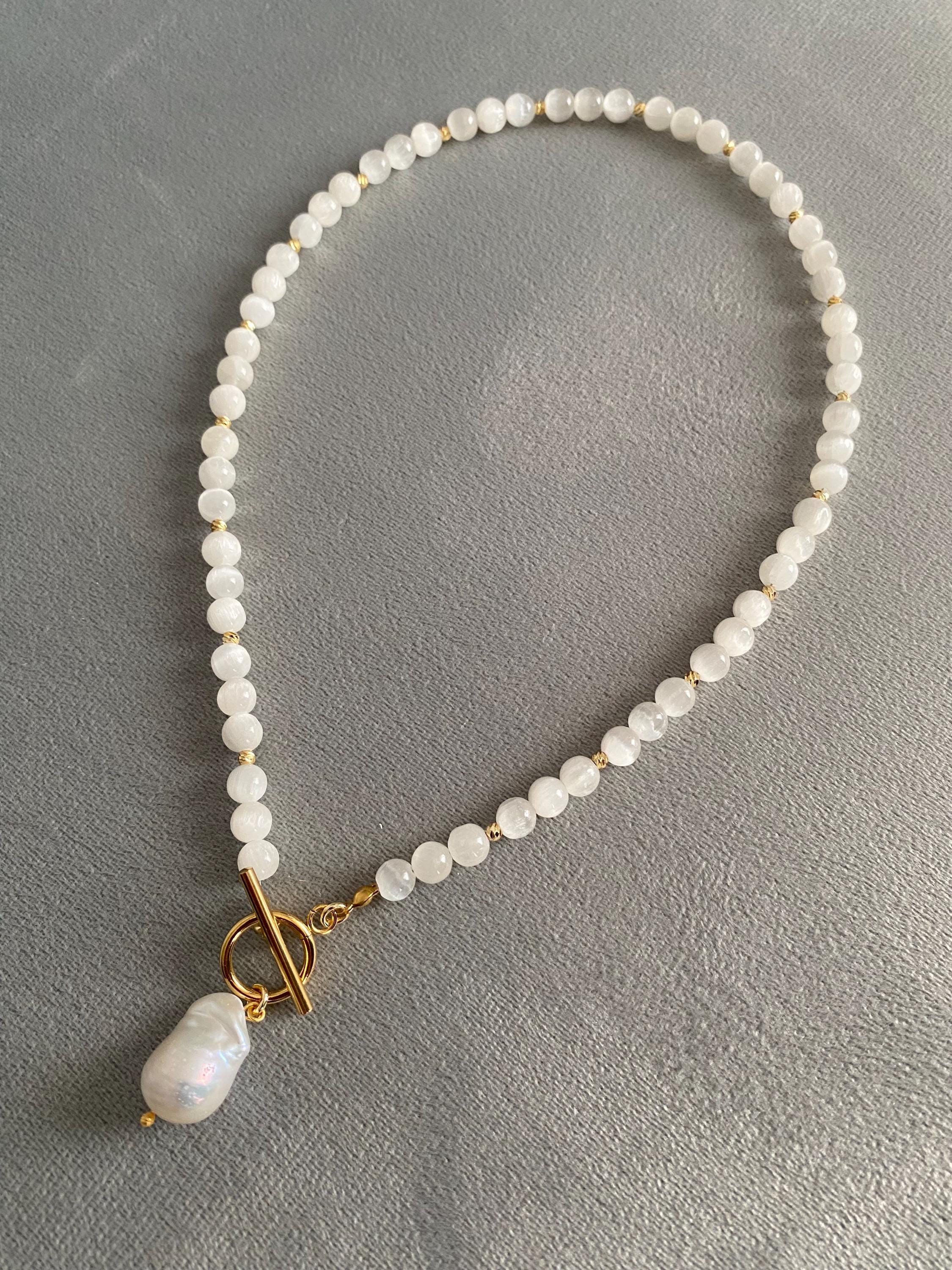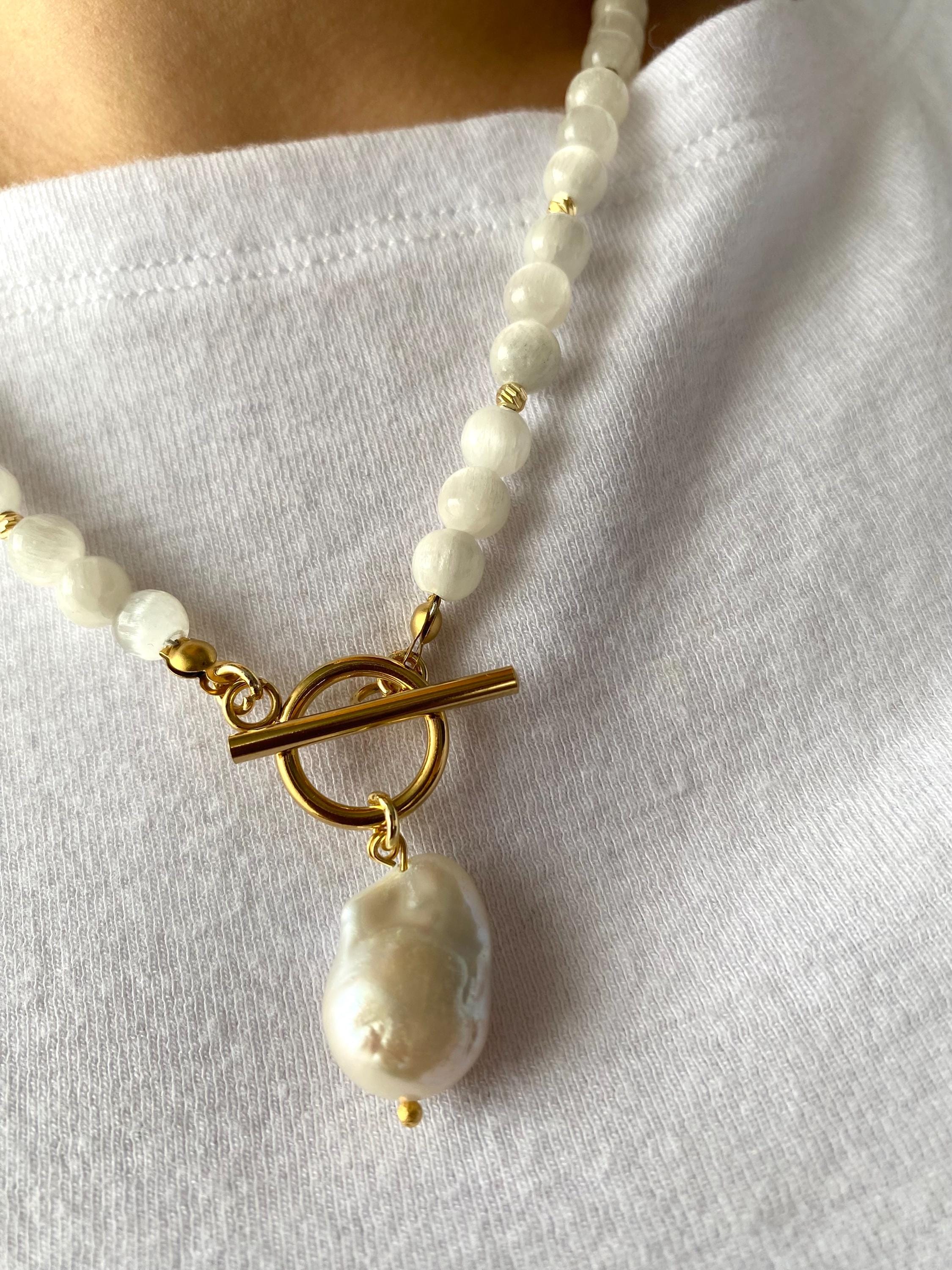 Radiate calm and effortless elegance with this minimalist yet bohemian gold-plated necklace, featuring luminous Selenite stones and a striking large irregular Baroque Pearl as the focal charm. The toggle clasp at the center adds a unique and modern touch to the design.