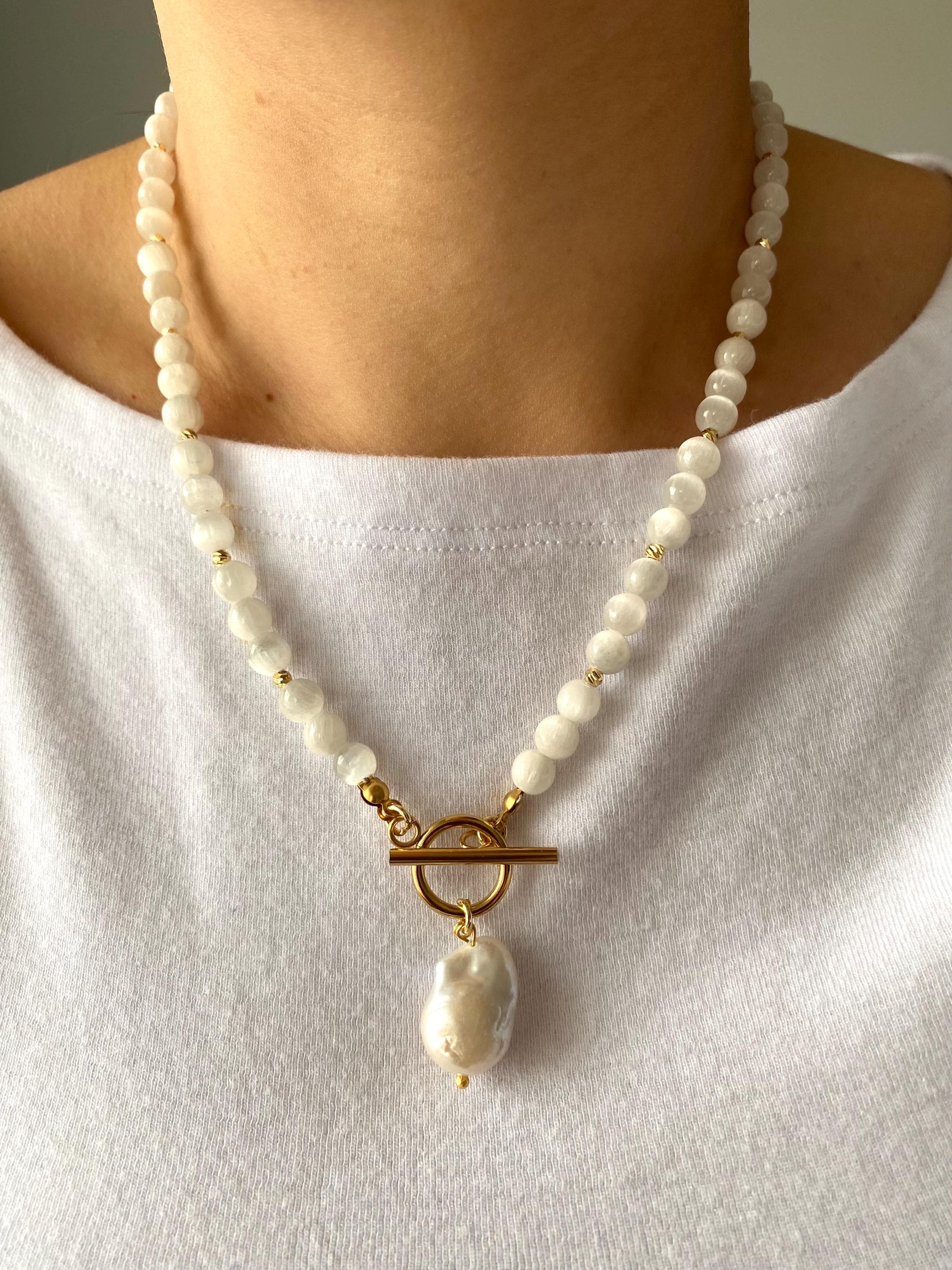 ✨ Gold-Plated Selenite Necklace with Large Baroque Pearl ✨