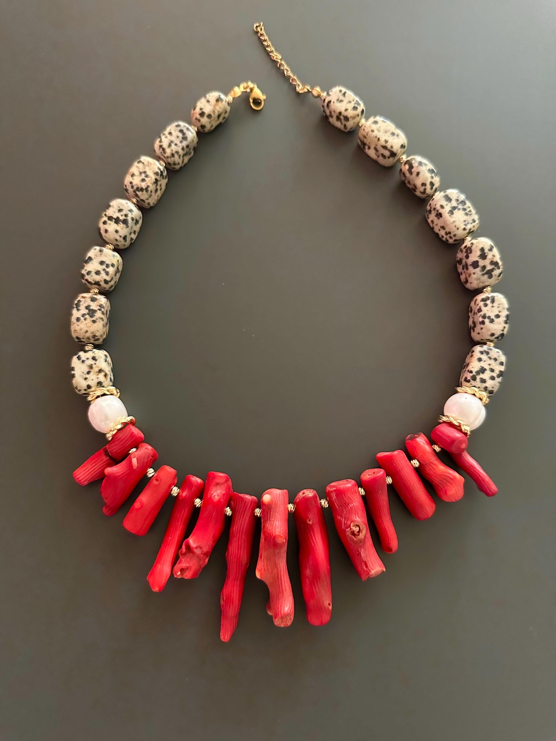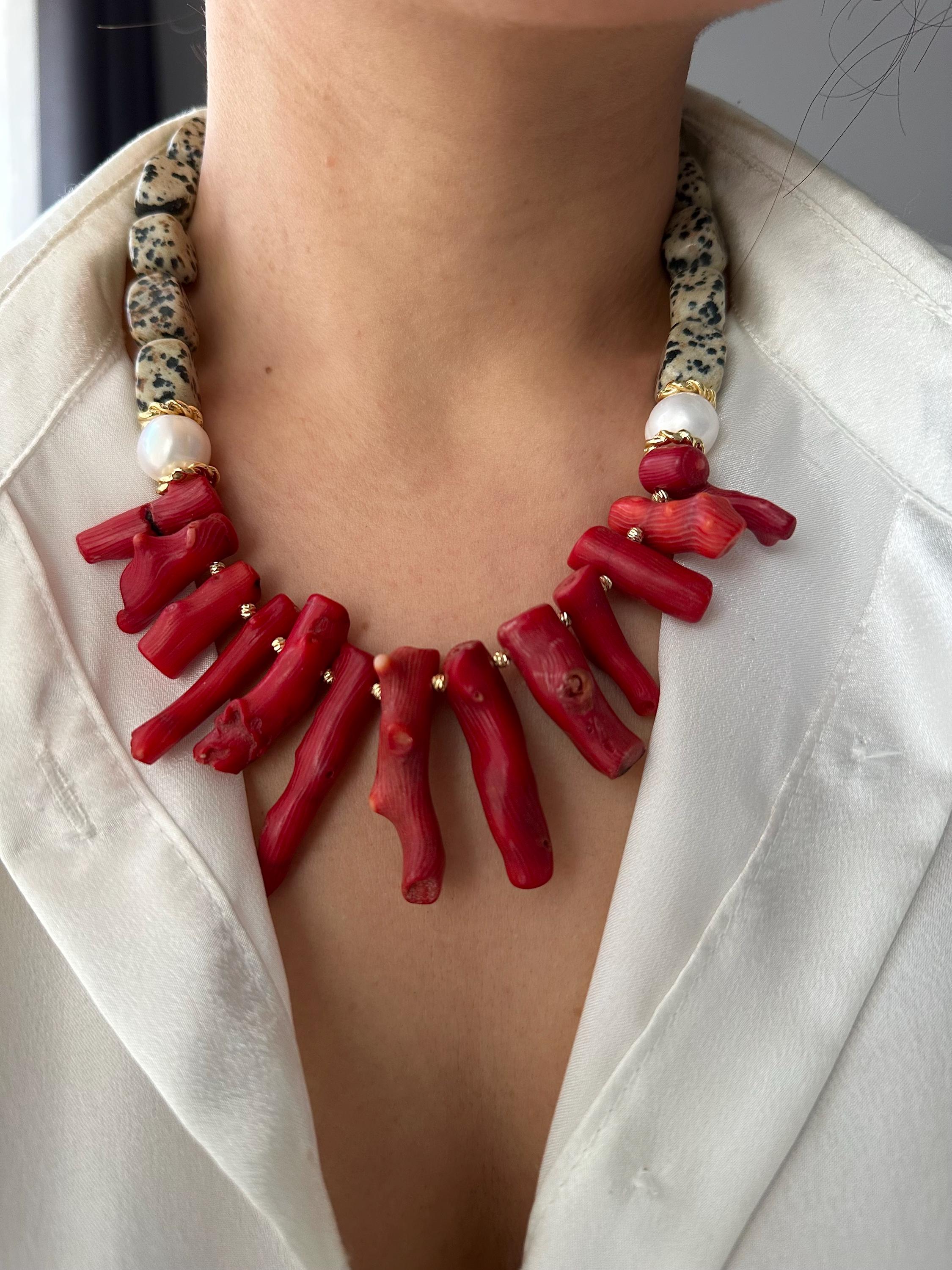 A bold and artistic boho statement necklace that combines natural red branch coral with Dalmatian jasper and genuine baroque pearls. The front features striking coral branches, while each side is adorned with a large, irregular baroque pearl, adding texture and elegance. The back and sides are detailed with earthy Dalmatian jasper beads, balancing the vivid coral tones with natural harmony.