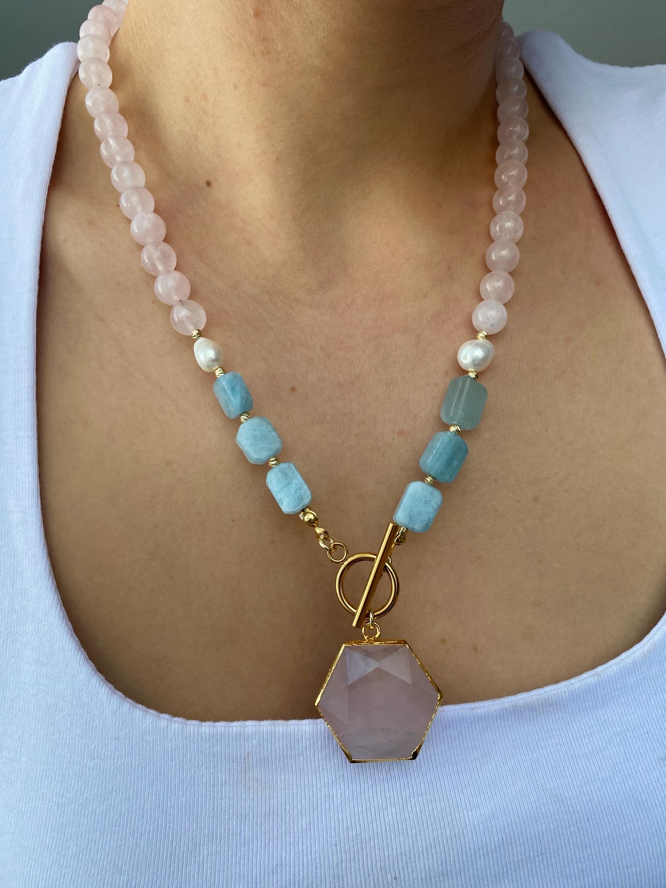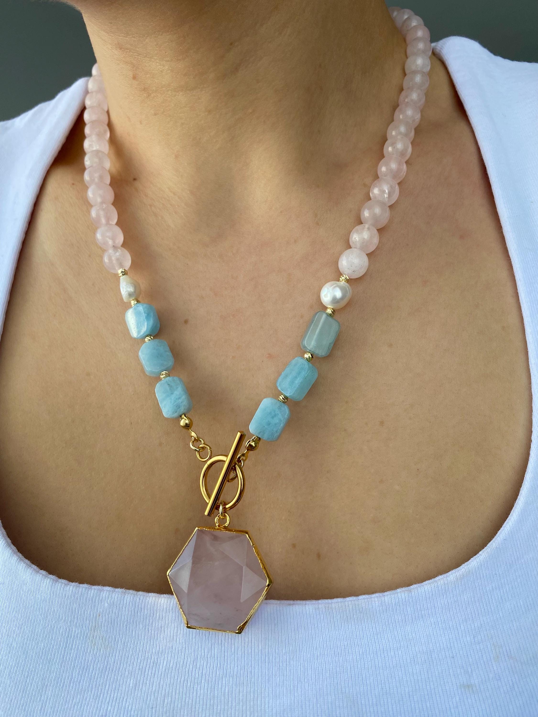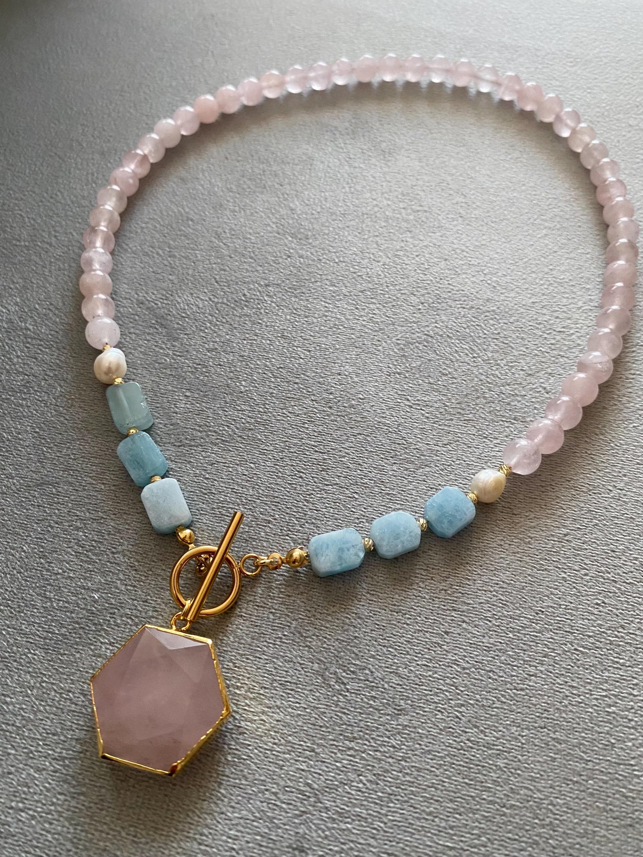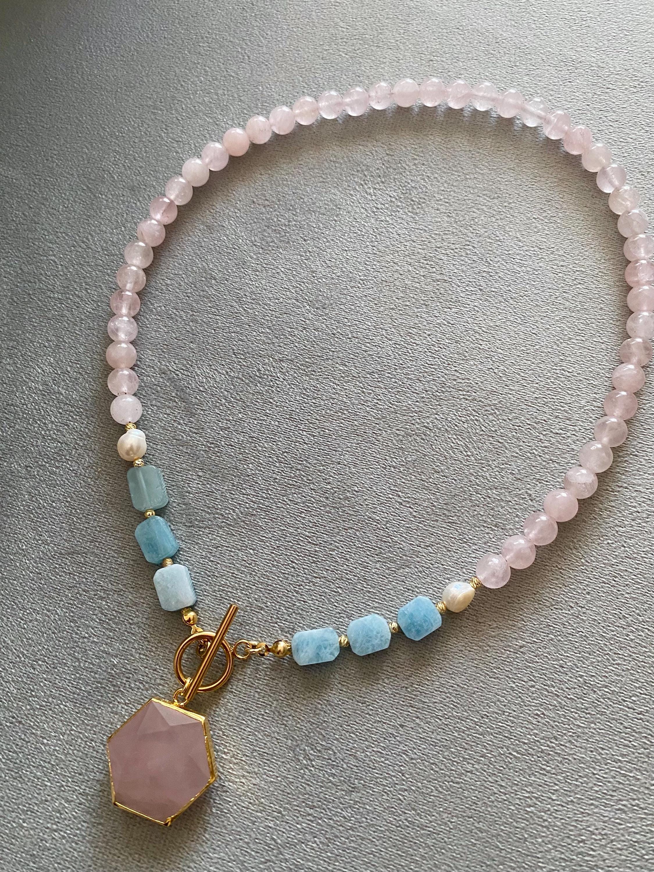 A beautifully balanced bohemian statement necklace featuring the soft, feminine energy of Rose Quartz paired with the tranquil blue tones of Aquamarine. The design is completed with a rose quartz pendant, adding an elegant focal point to this refined piece.