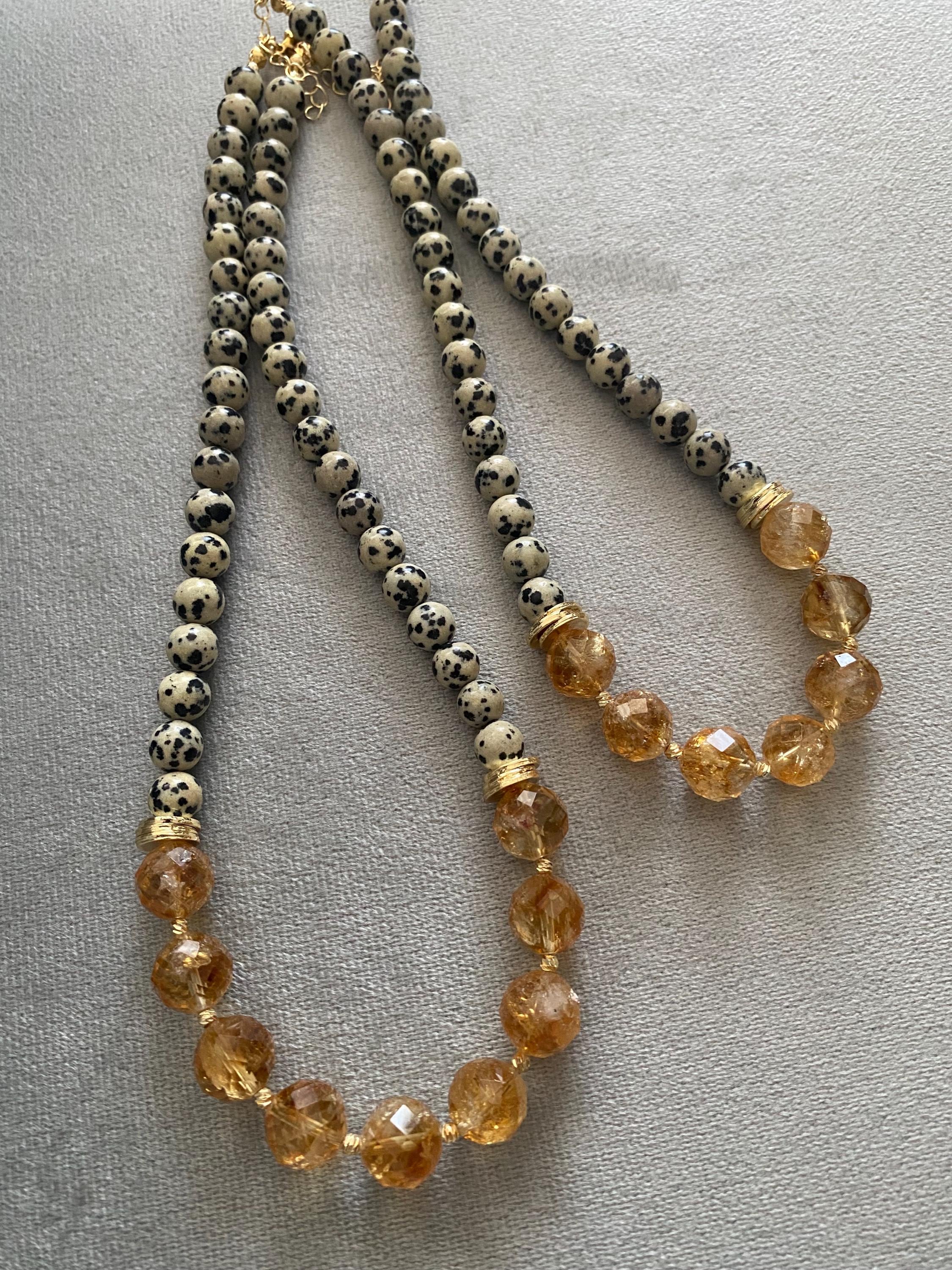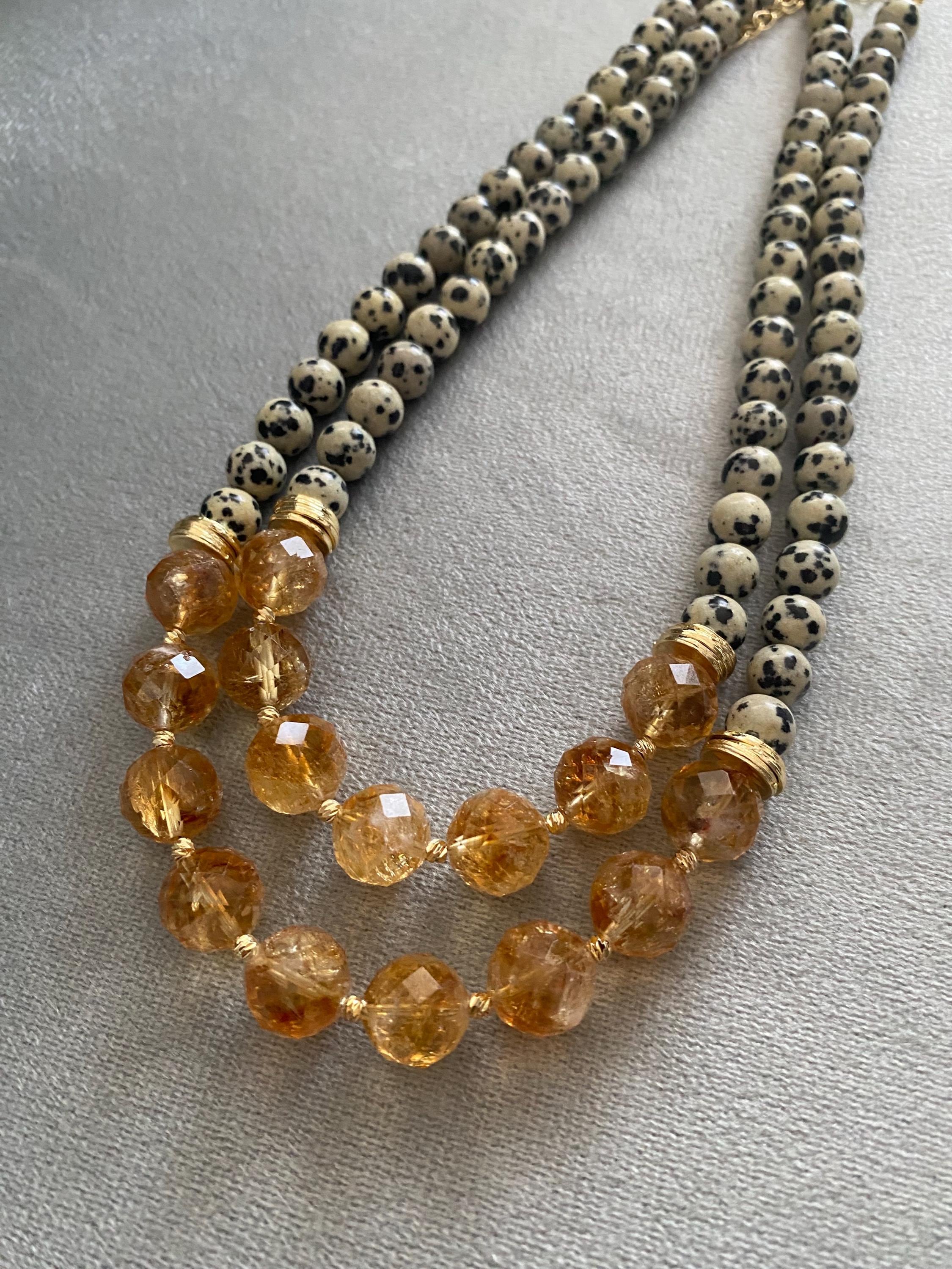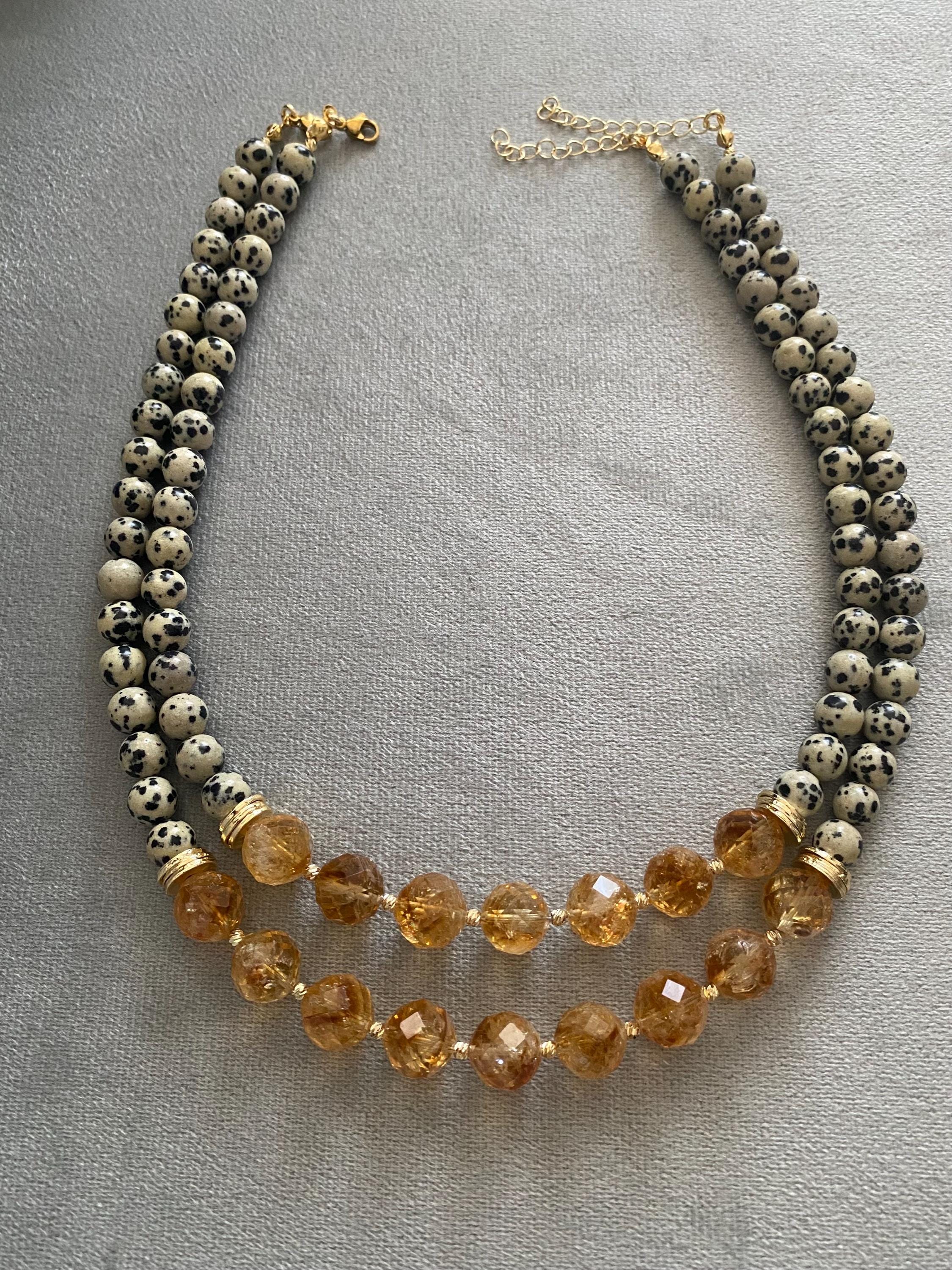 🌼 Gold-Plated Multistrand Necklace with Citrine & Dalmatian Jasper 🌼