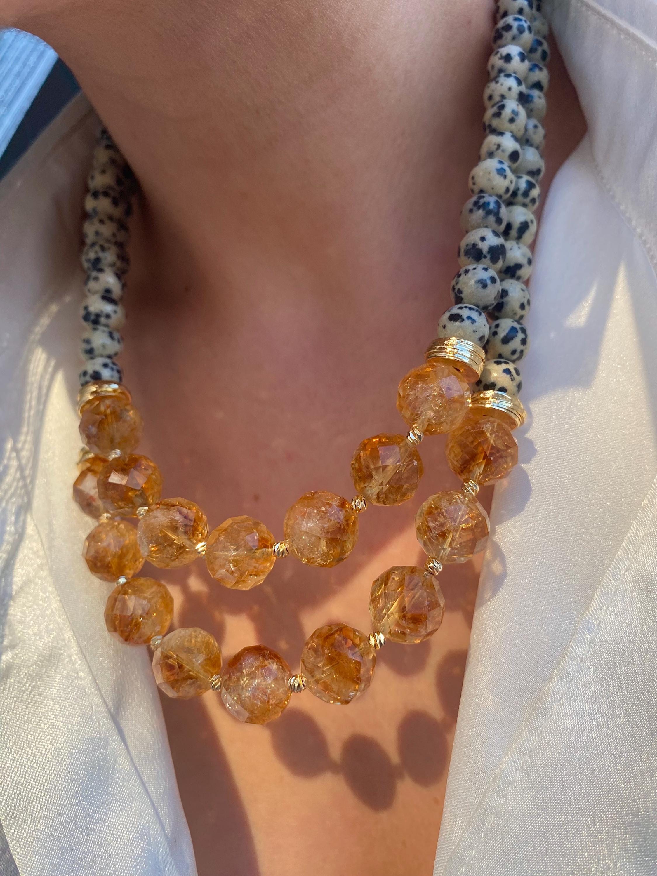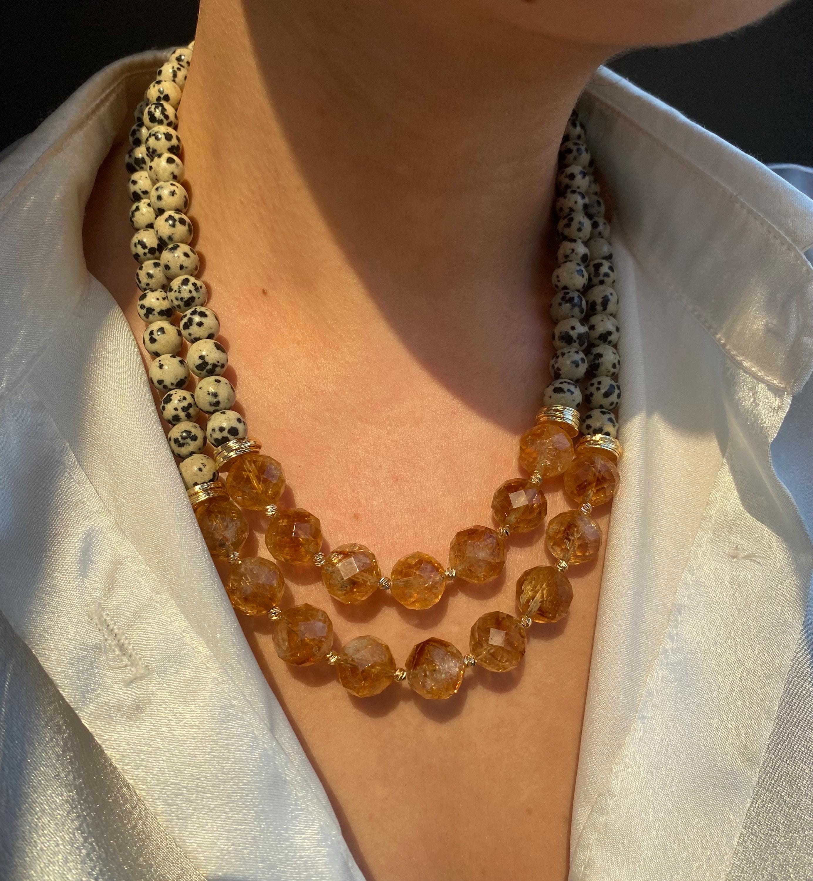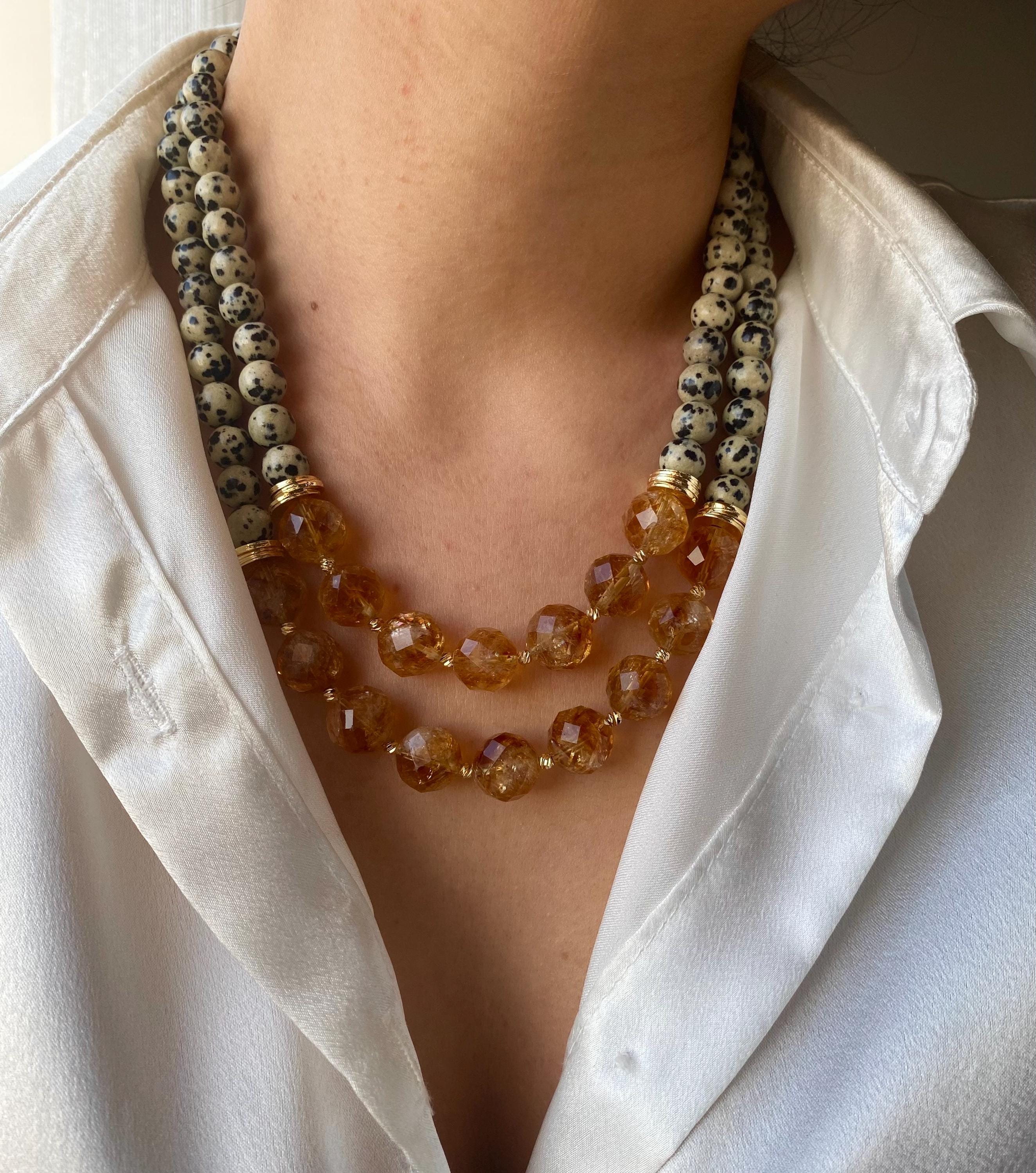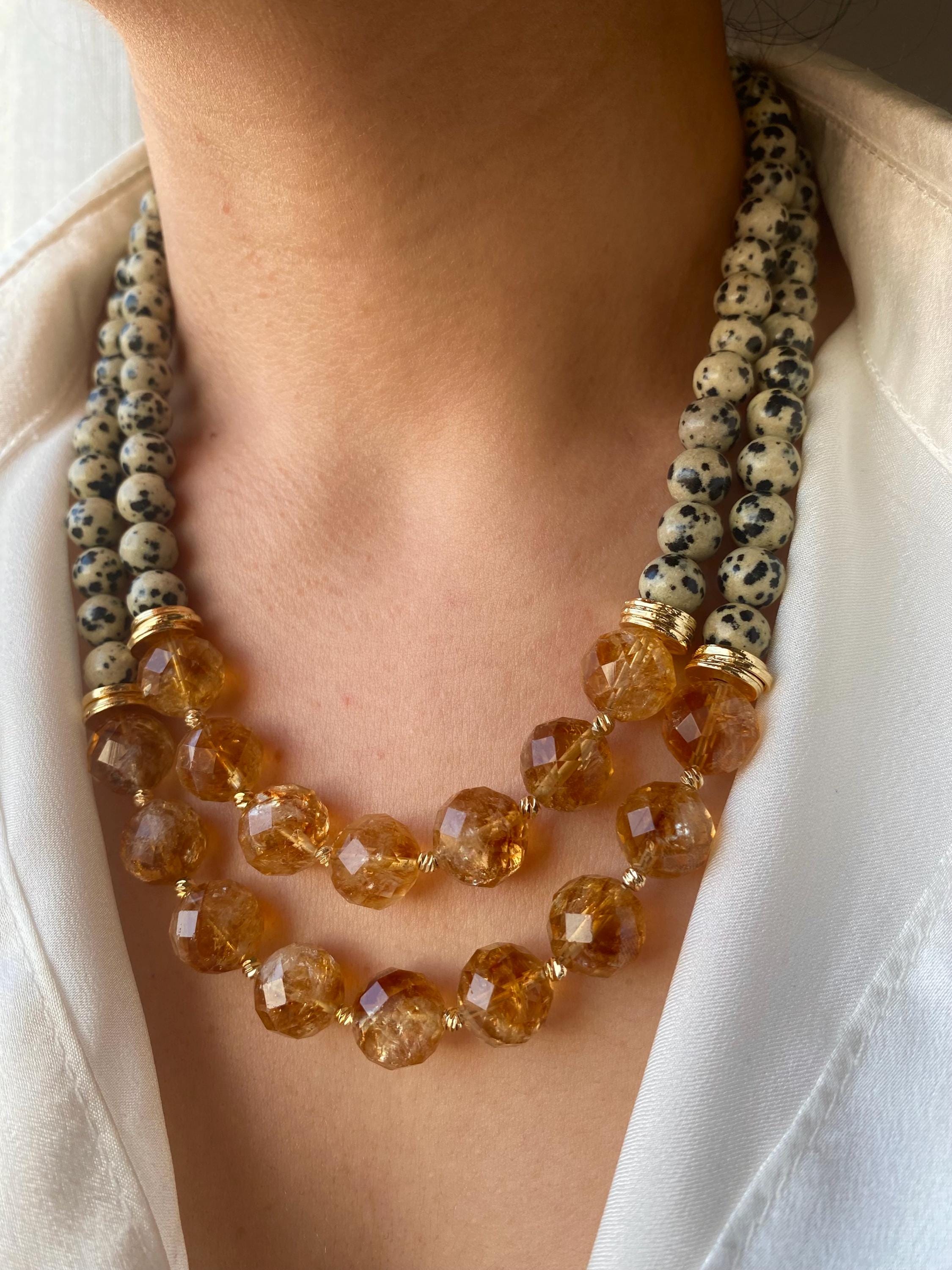 🌼 Gold-Plated Multistrand Necklace with Citrine & Dalmatian Jasper 🌼