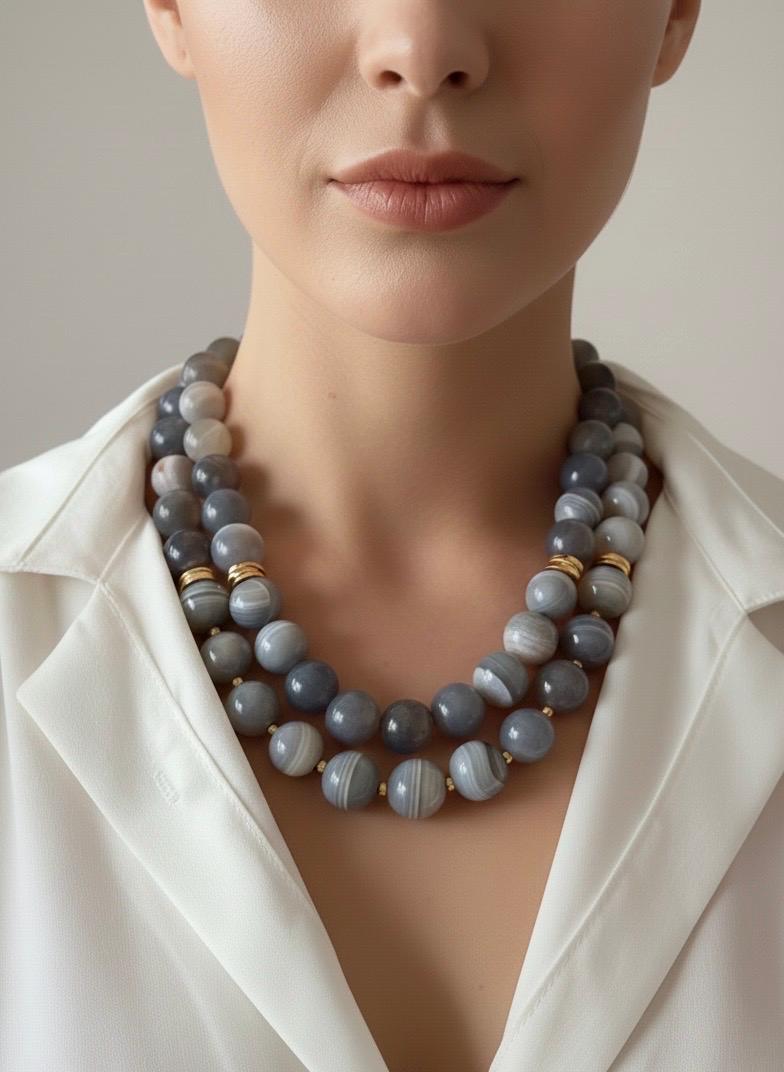 This Chunky Moss Agate Multistrand Necklace is crafted with genuine Moss Agate beads featuring soft gray and white natural patterns. The stones display cloud-like veining and organic inclusions, creating a serene, minimalist aesthetic. Paired with high-quality gold-plated accents, this necklace balances earthy character with refined sophistication.