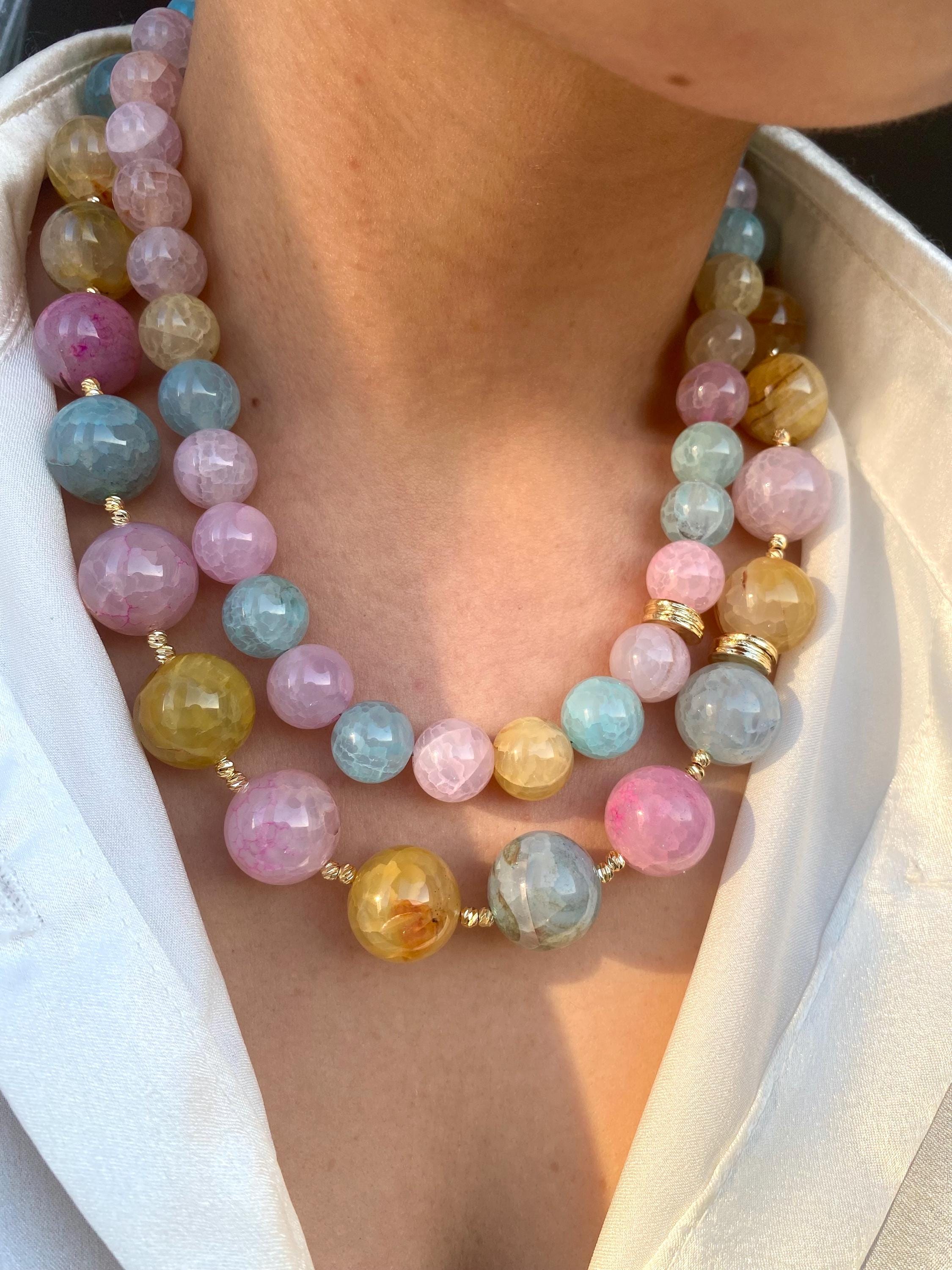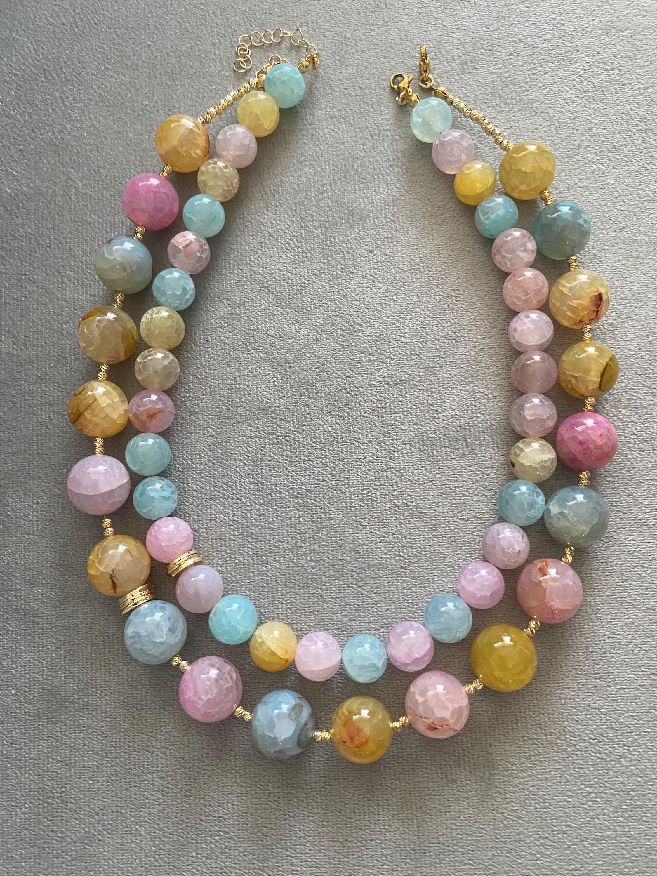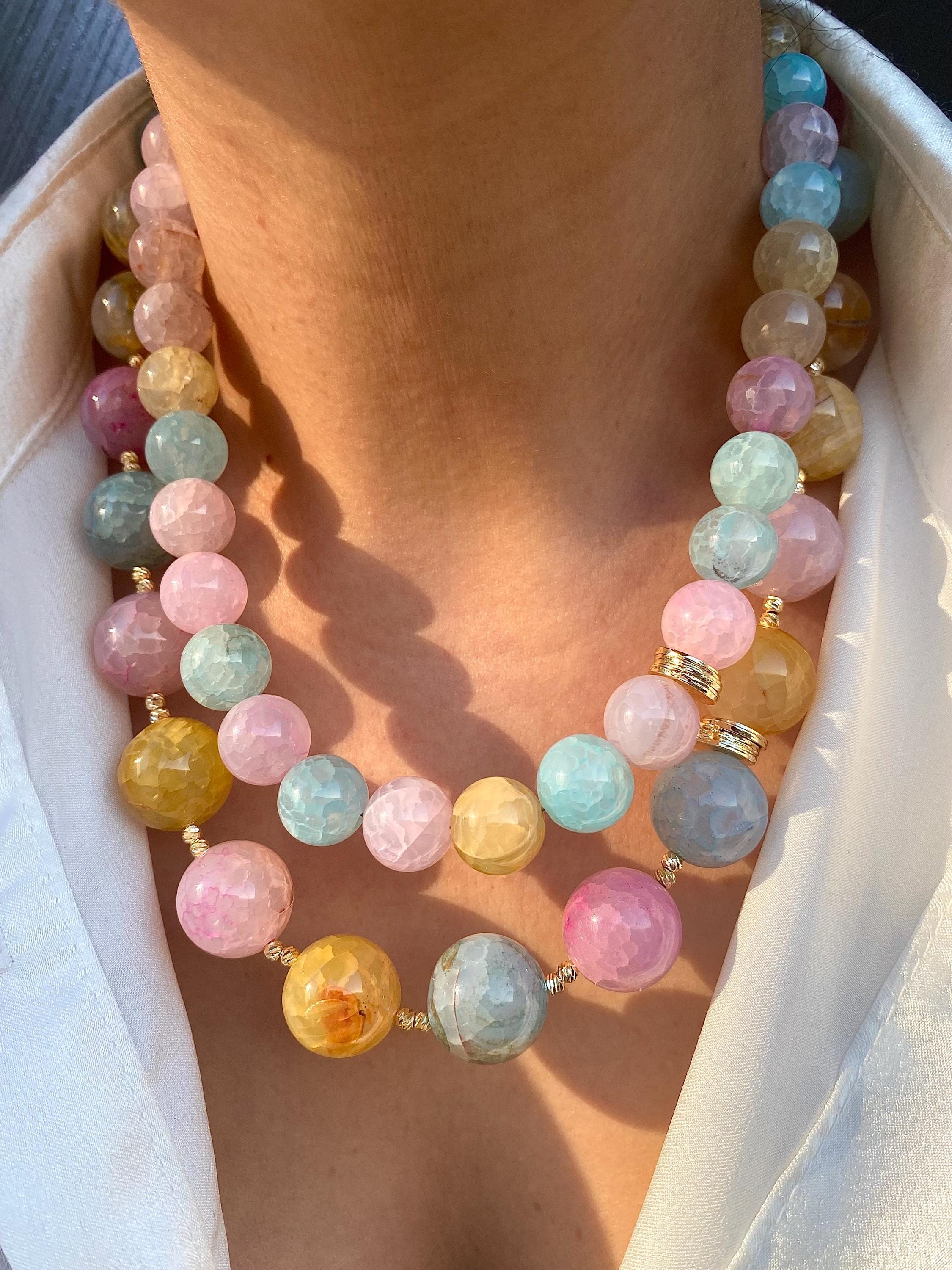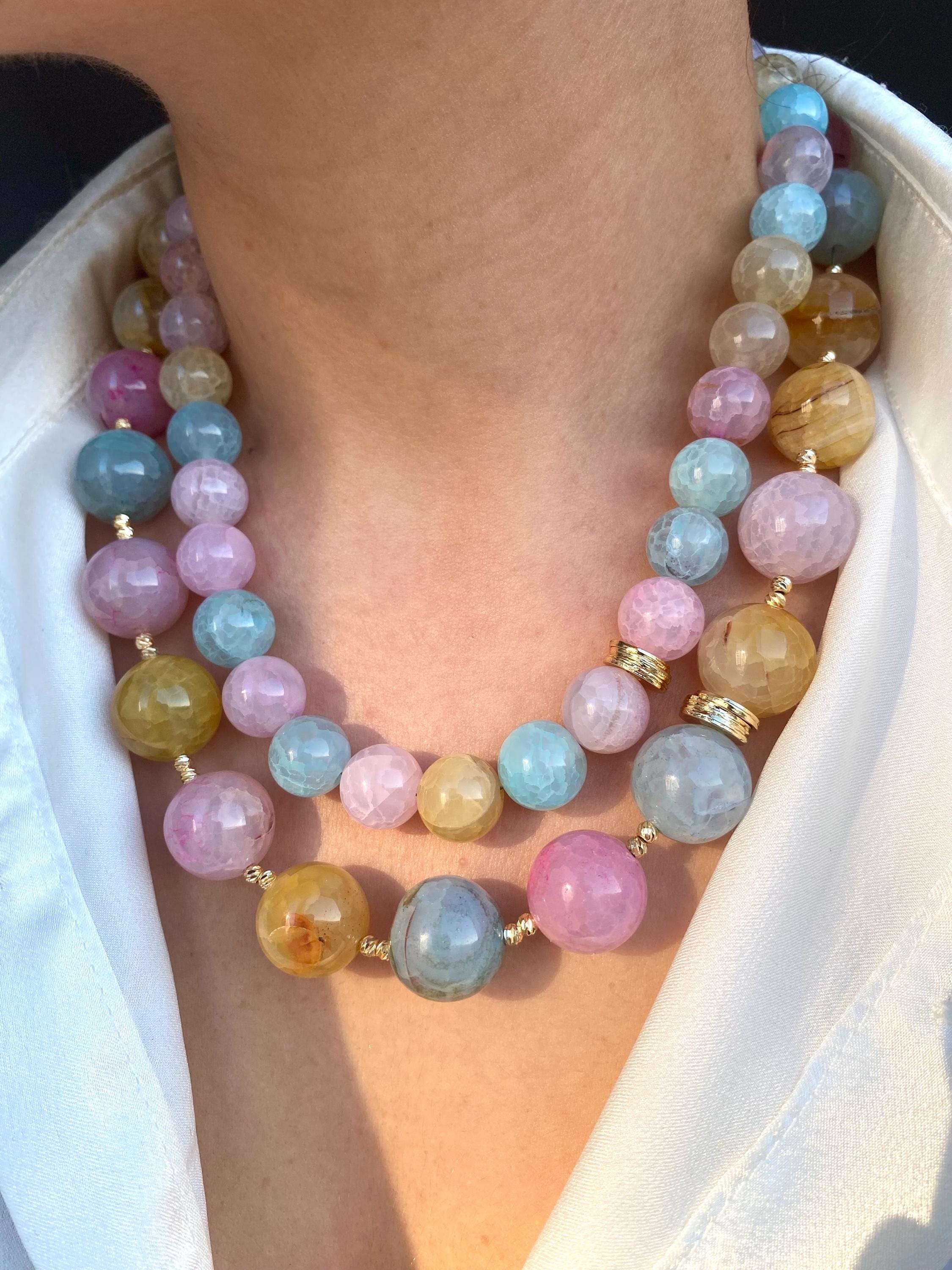 Elevate your style with this dreamy boho statement necklace featuring pastel-toned pink, blue, and yellow large agate stones. Designed in a gold-plated multistrand style, this piece brings both color and elegance to your everyday look.