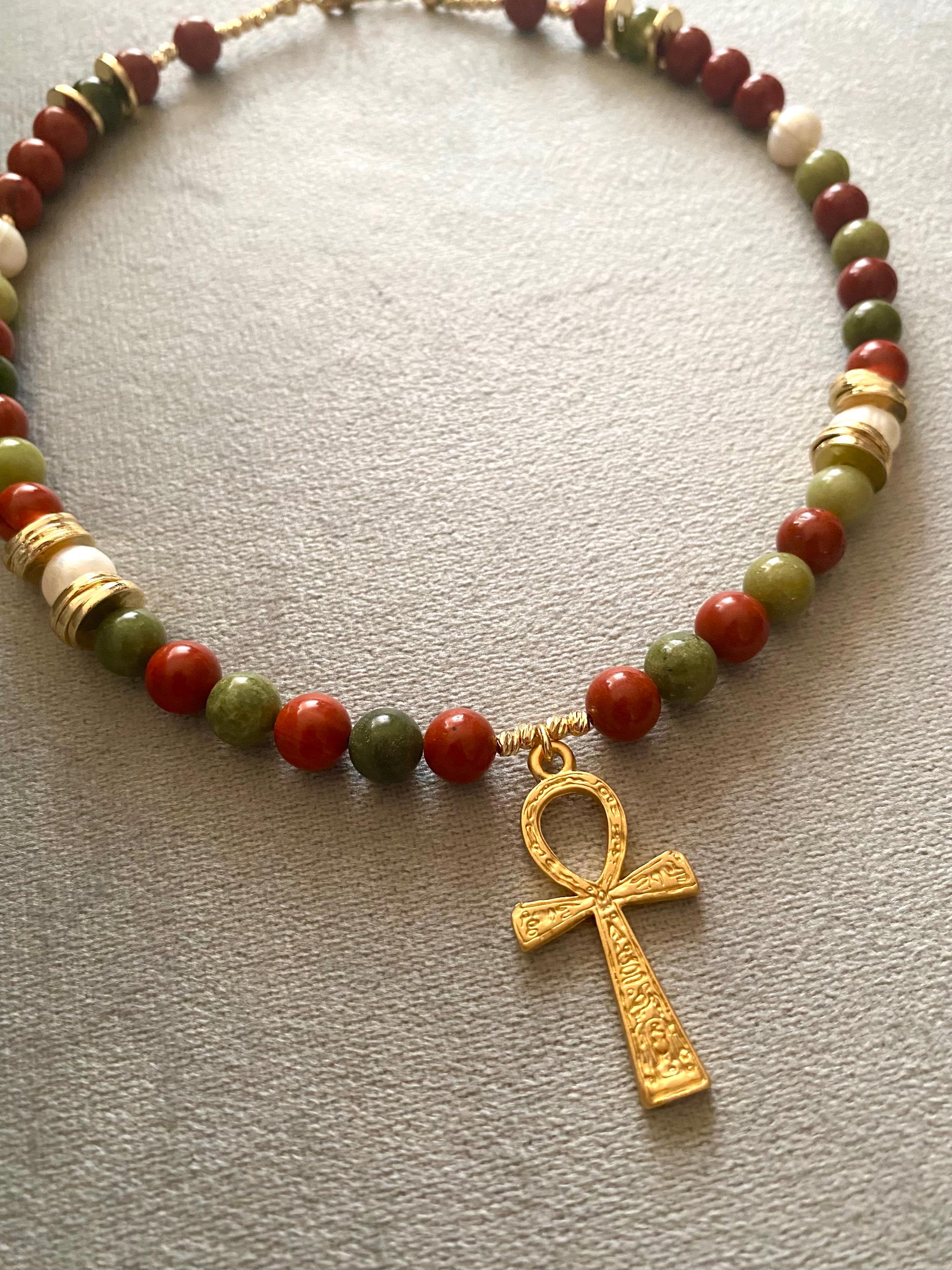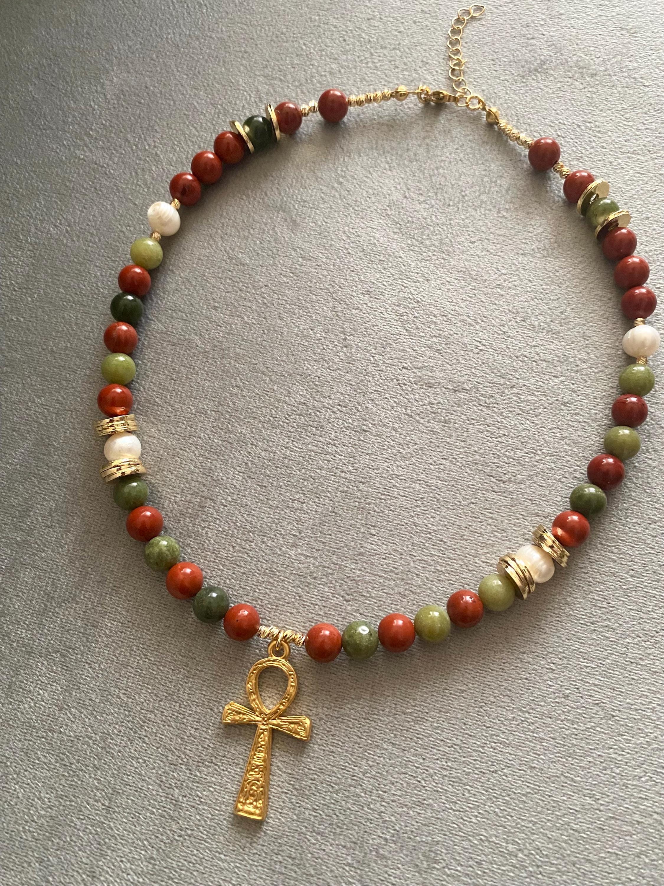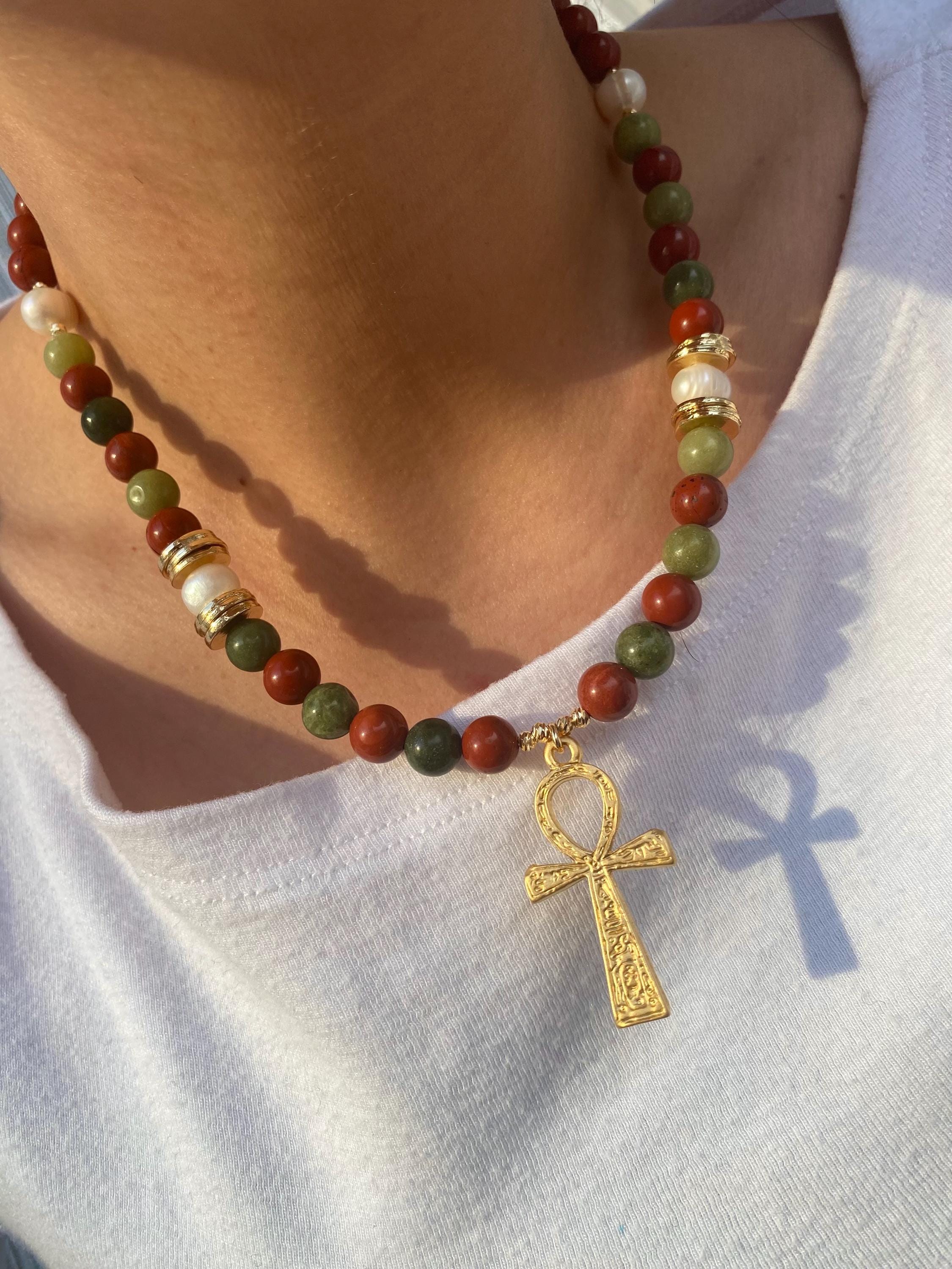 Why This Talisman is Essential: The Red Jasper is celebrated as the stone of protection, courage, and motivation. The Jade attracts good luck and harmony. Together with the Ankh symbol (Key of Life), this necklace serves as a potent, meaningful talisman and a striking piece of statement jewelry rooted in ancient wisdom.